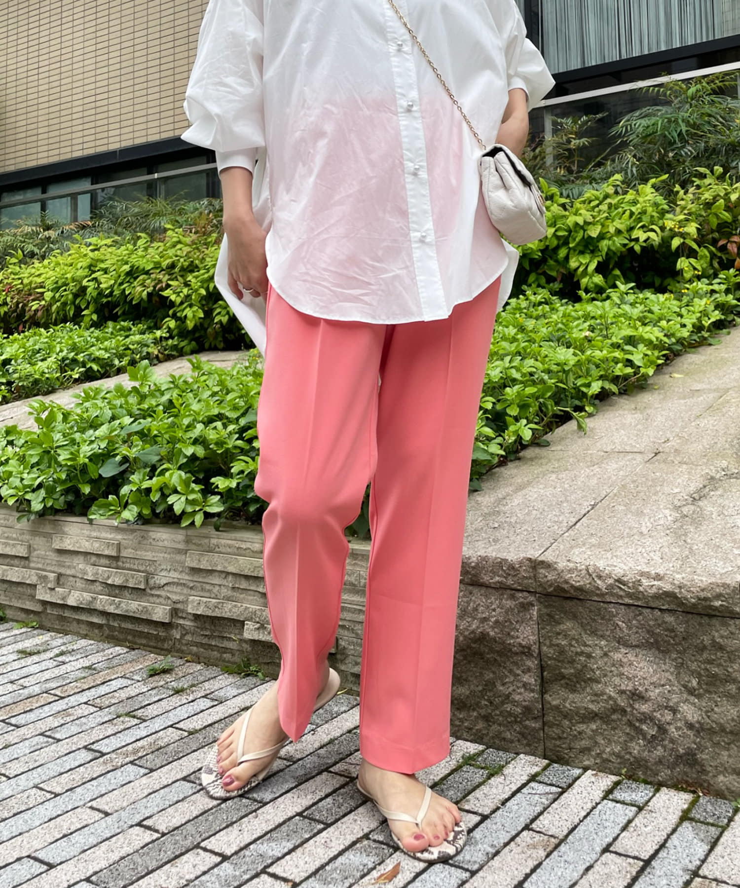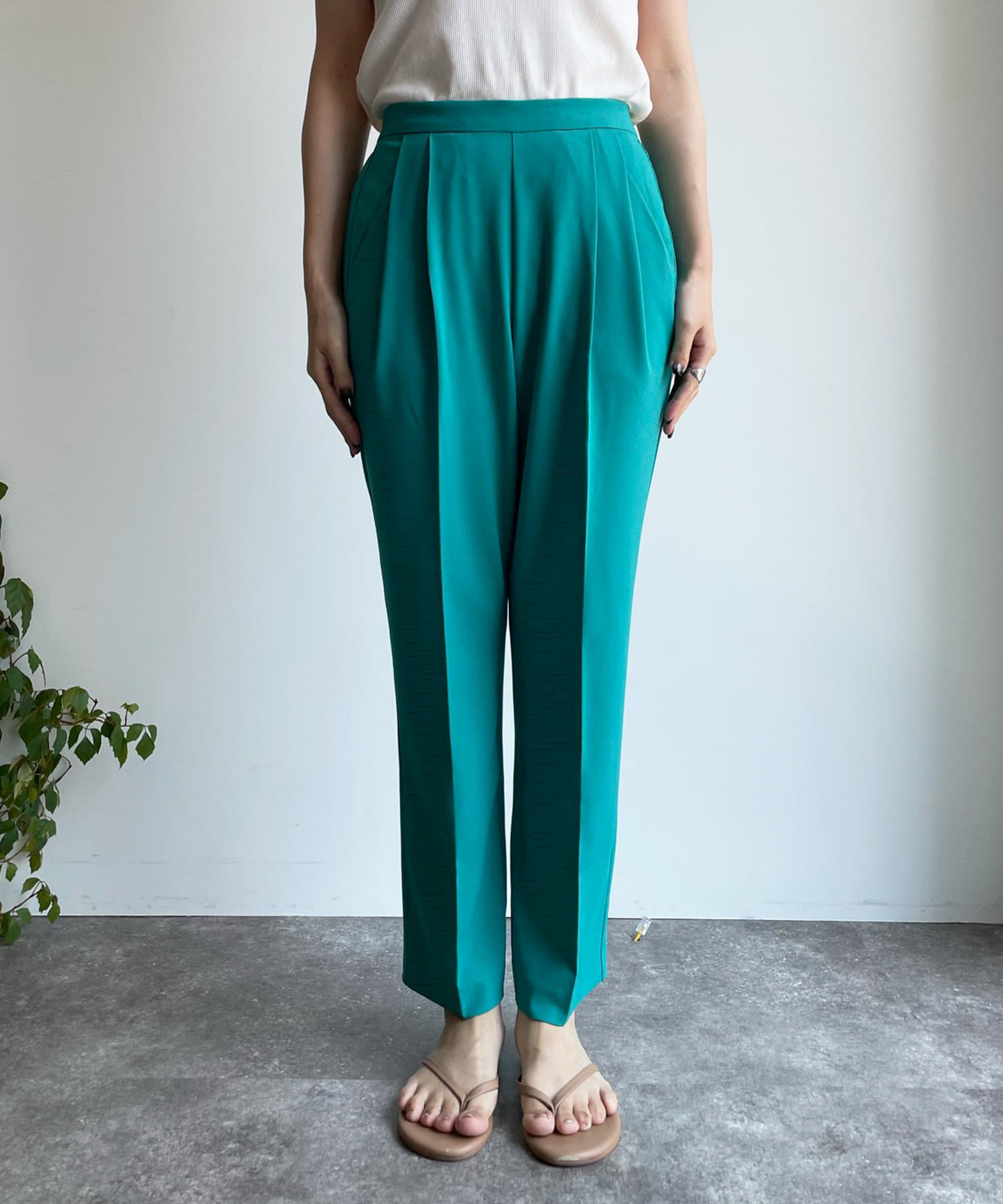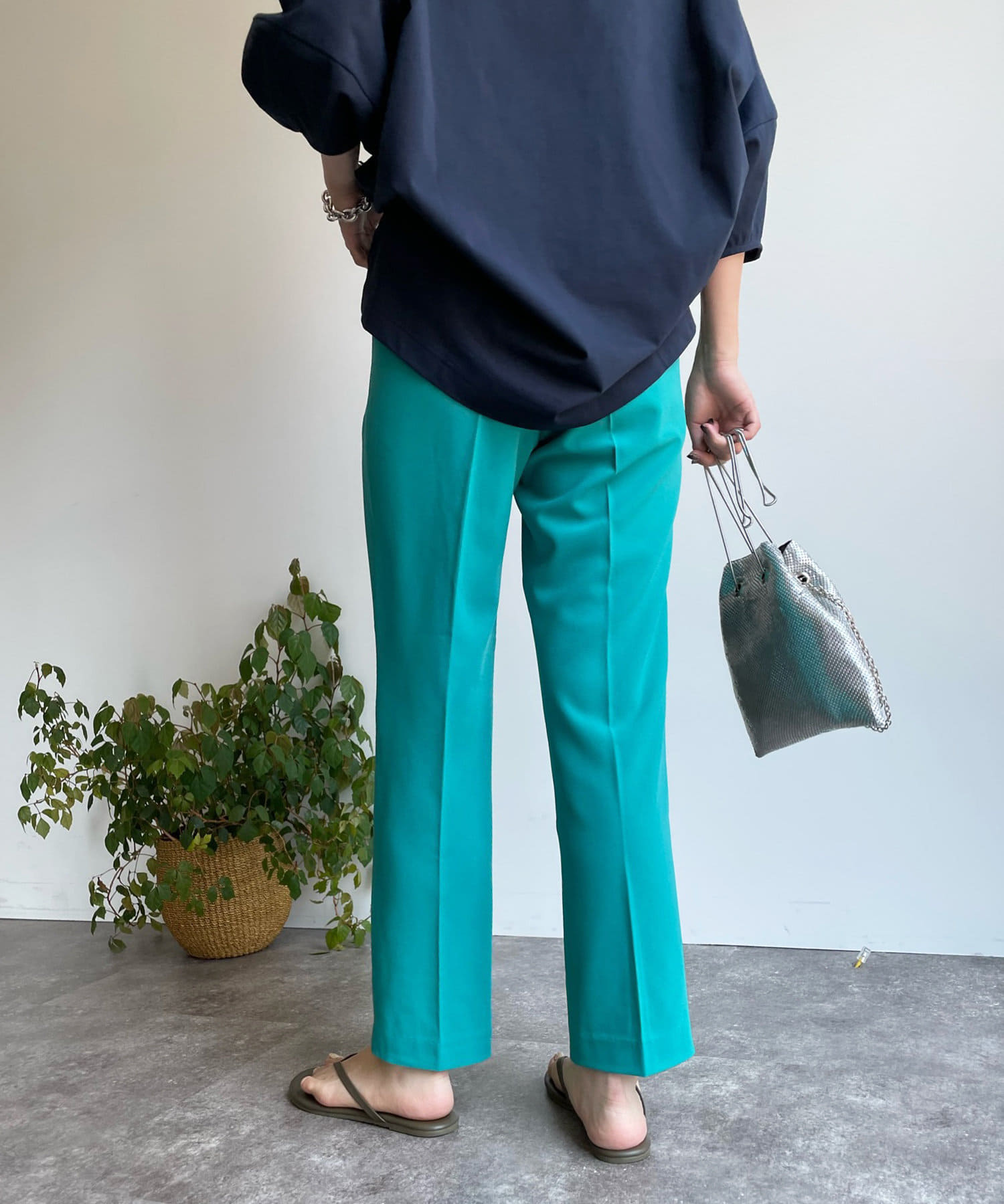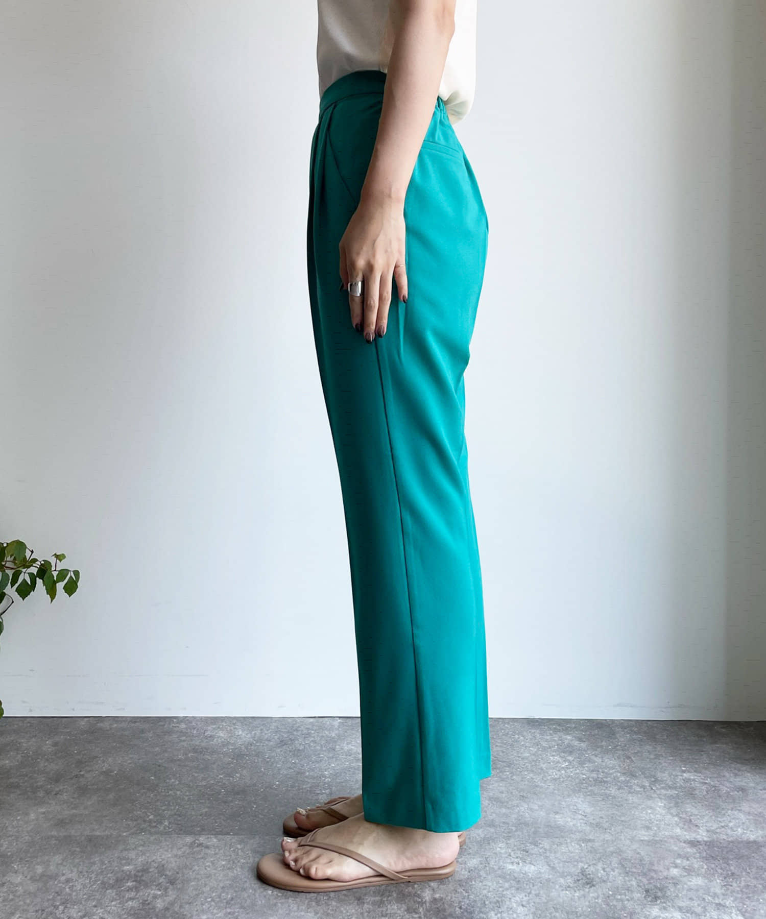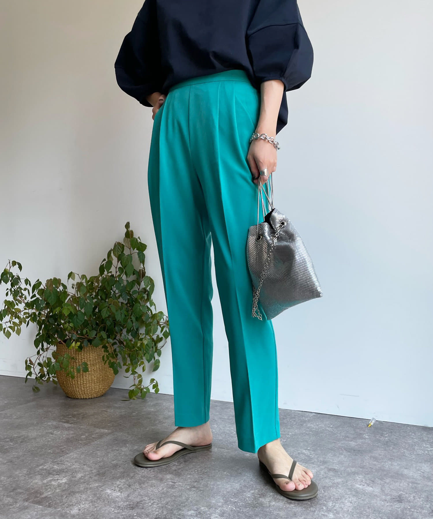 美脚の秘訣は、お腹周りをスッキリと見せるタック使いと縦ラインを強調するセンタープレス。