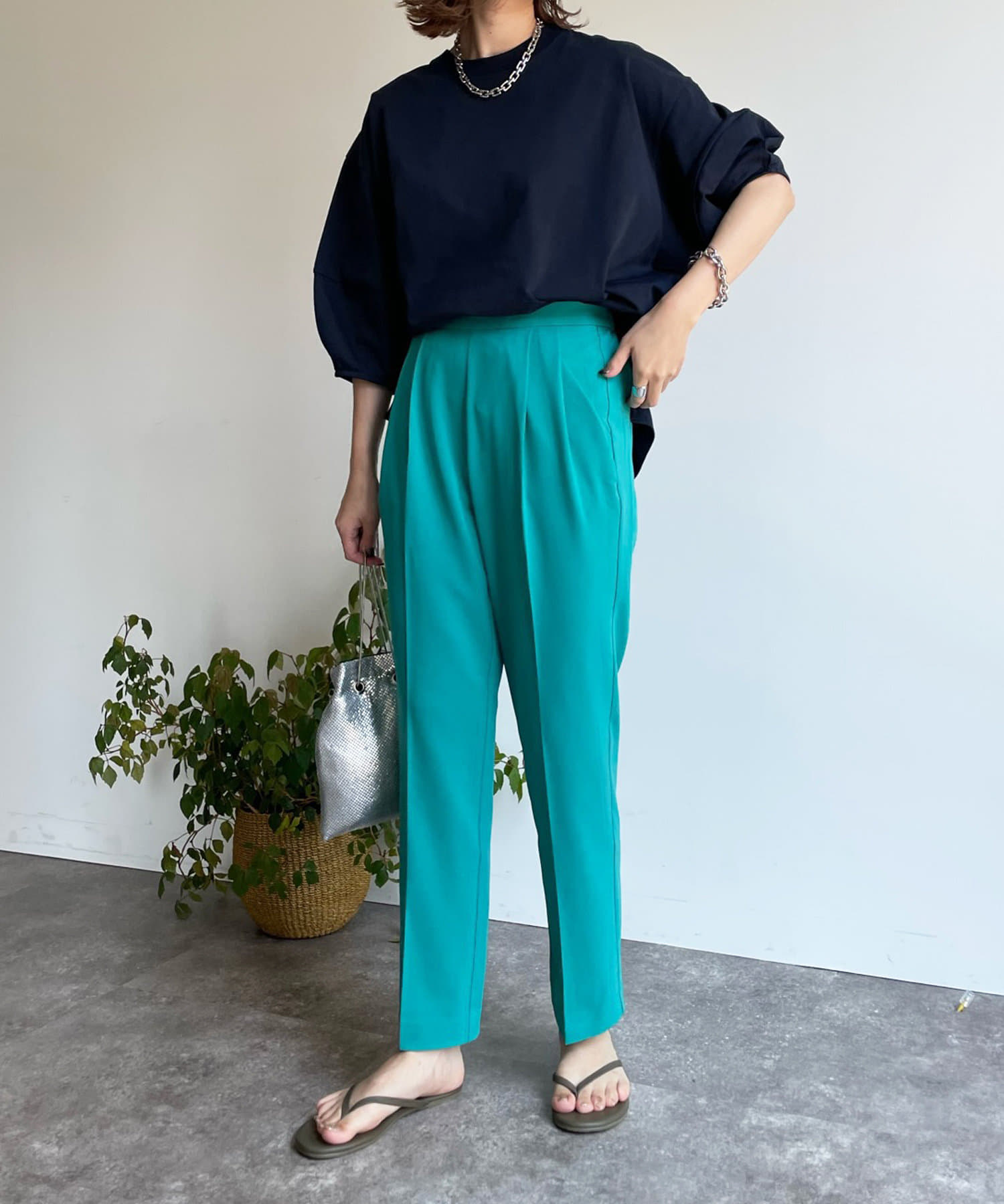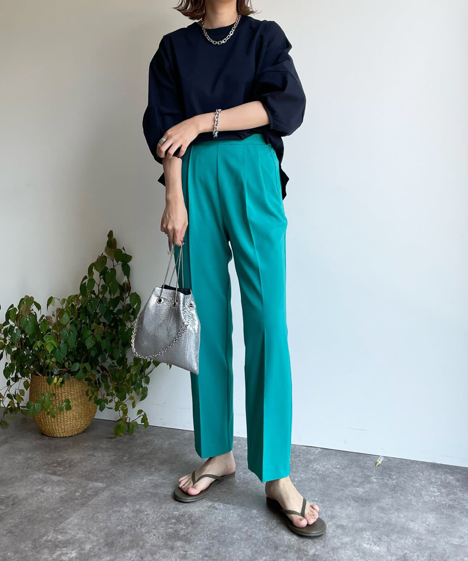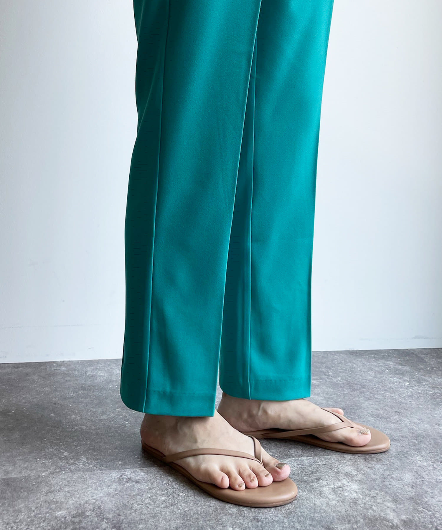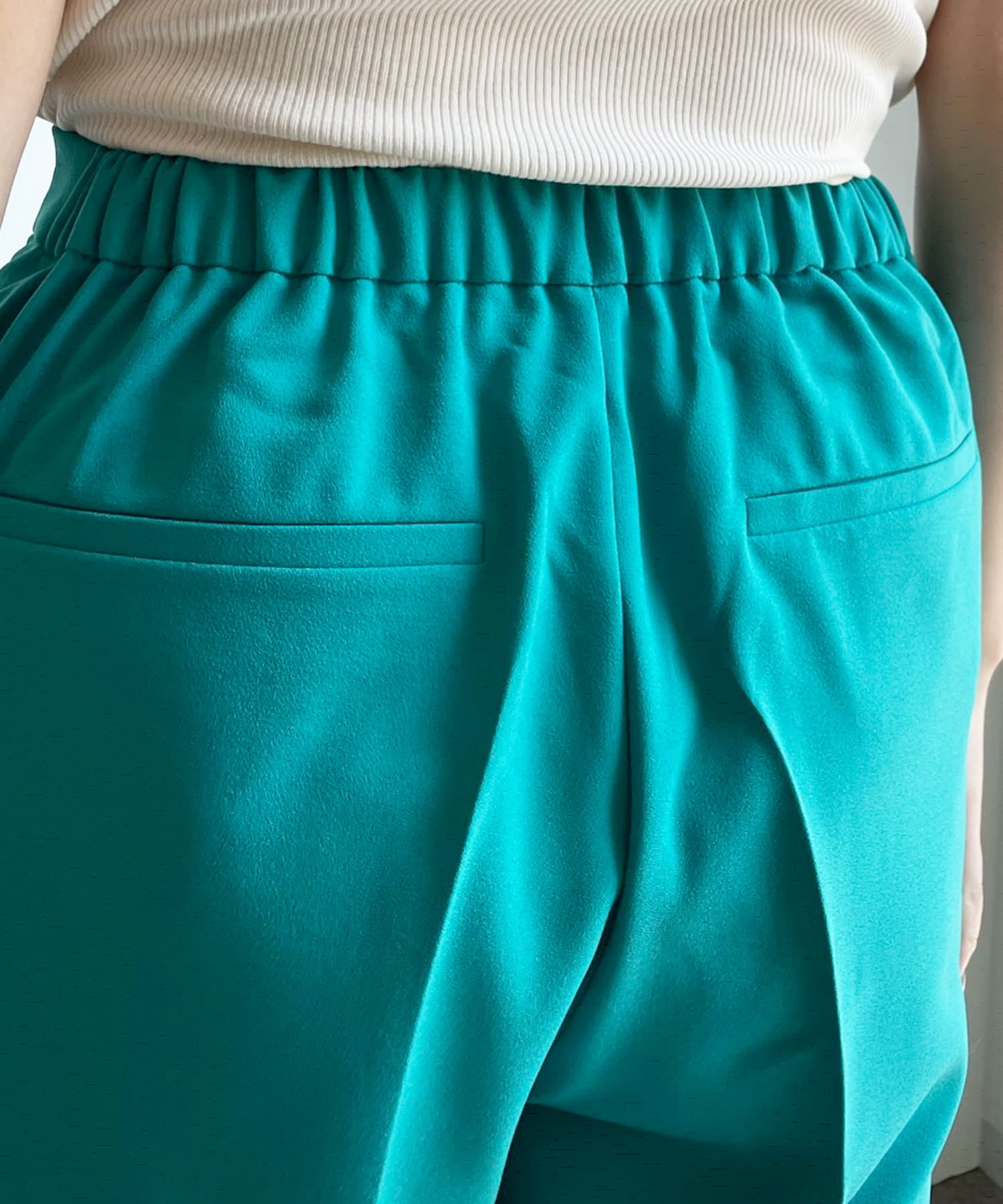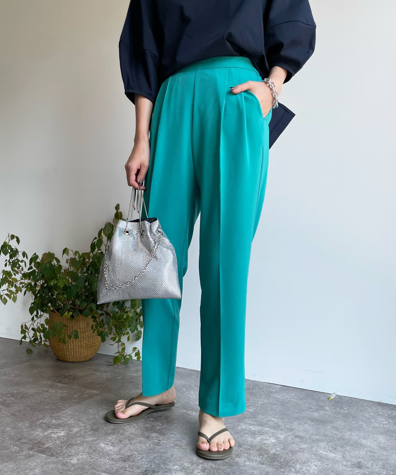 美脚の秘訣は、お腹周りをスッキリと見せるタック使いと縦ラインを強調するセンタープレス。