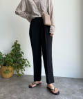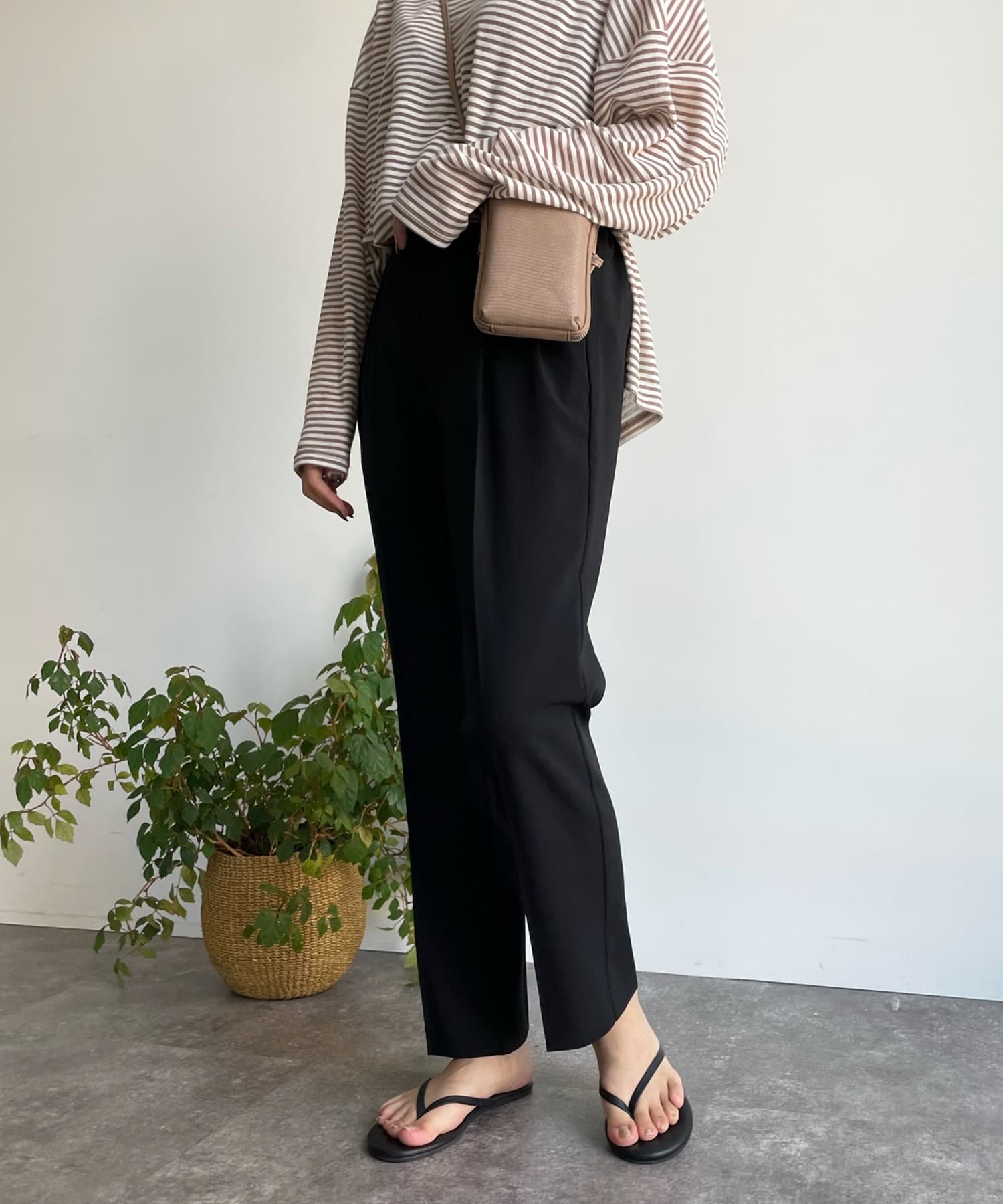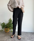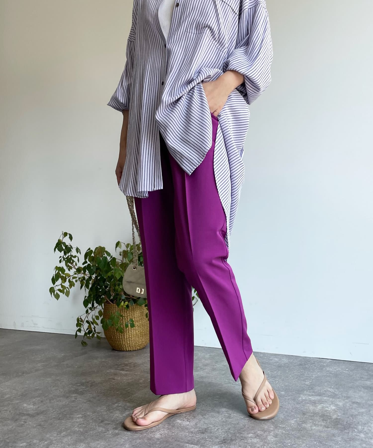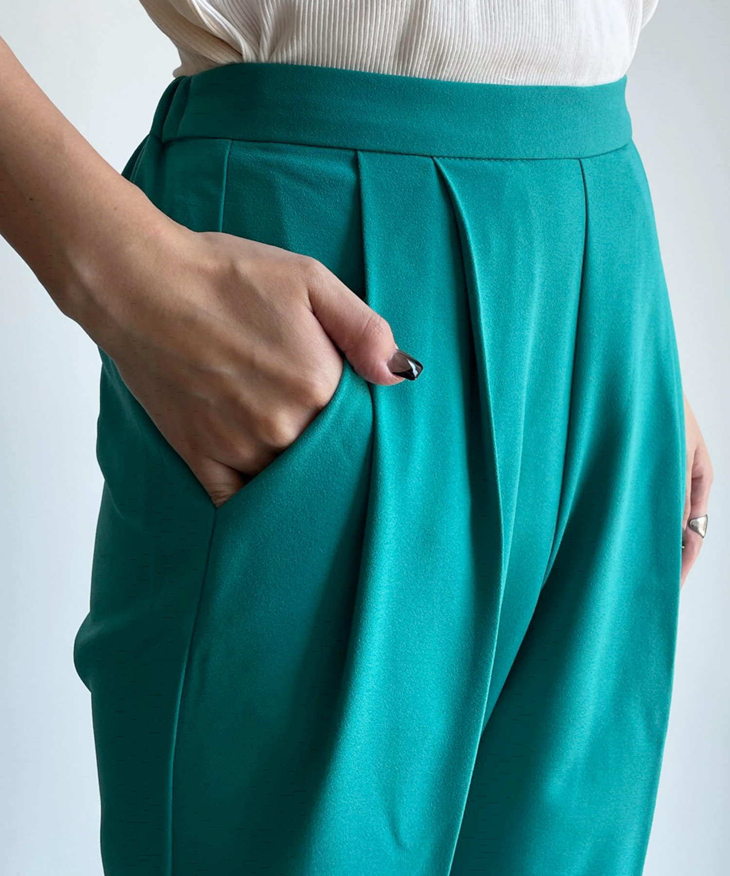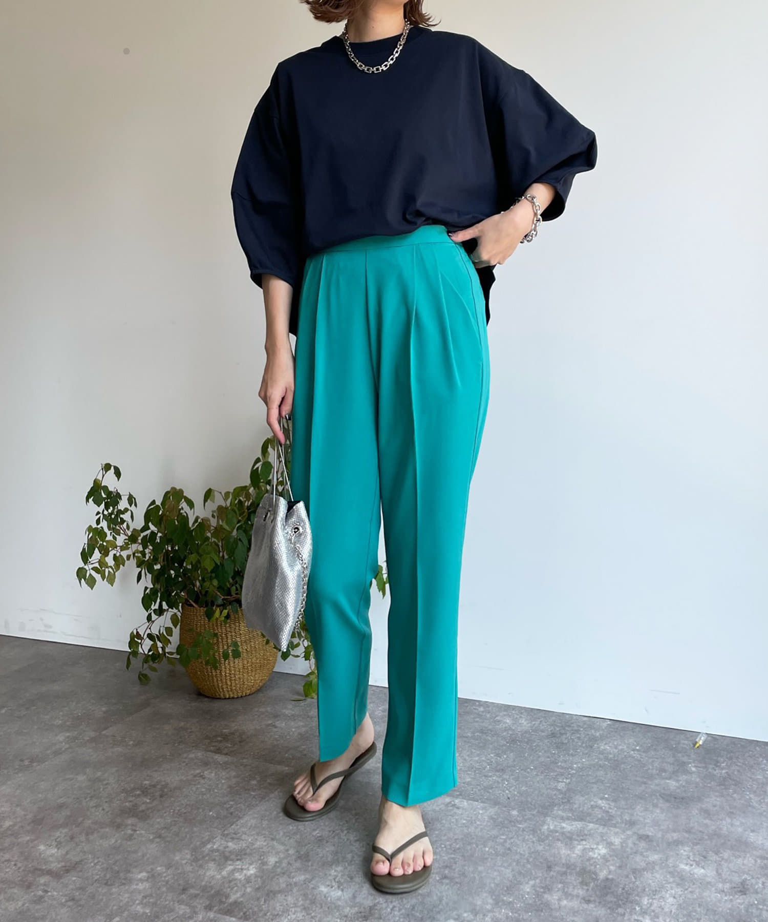 美脚の秘訣は、お腹周りをスッキリと見せるタック使いと縦ラインを強調するセンタープレス。