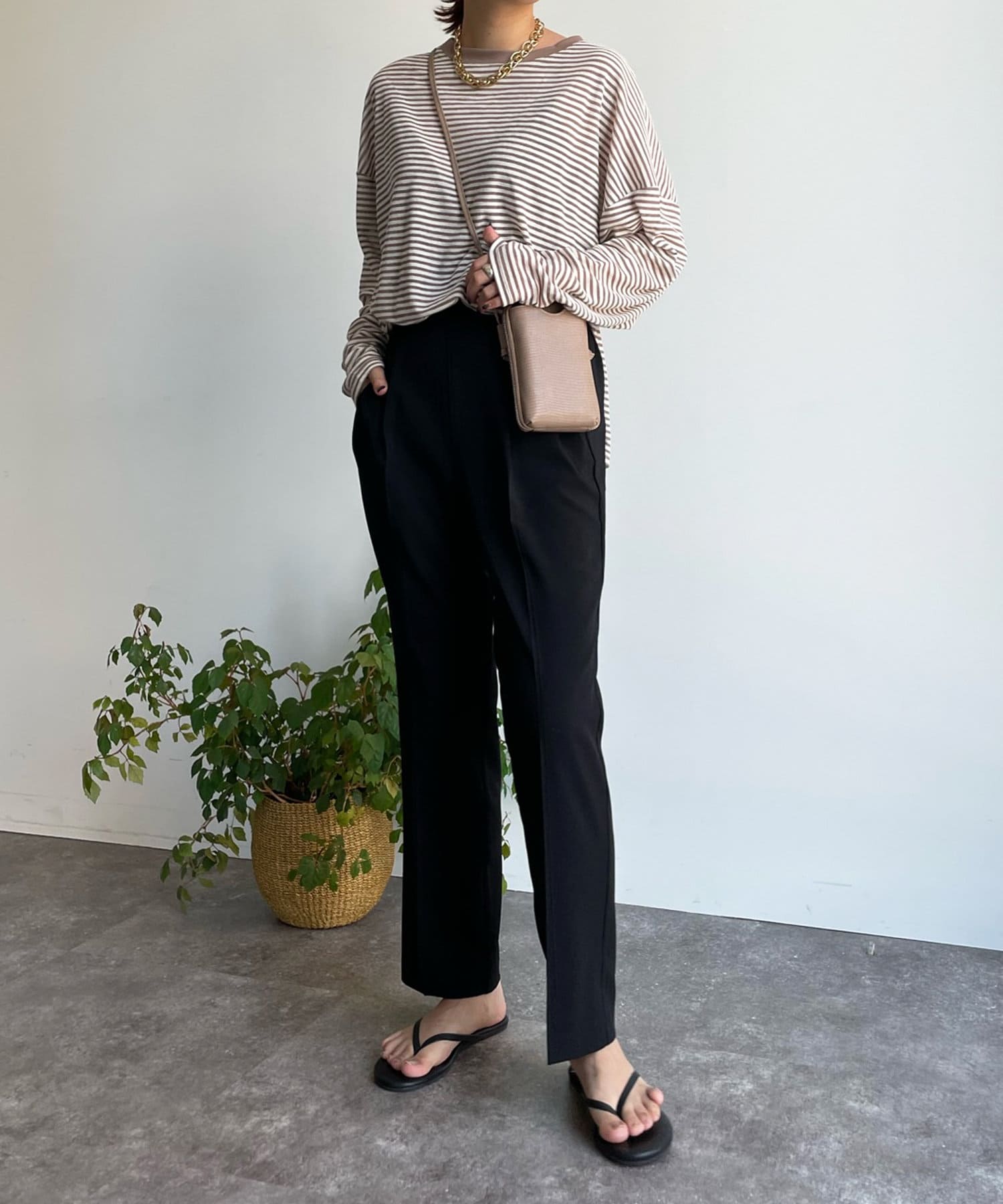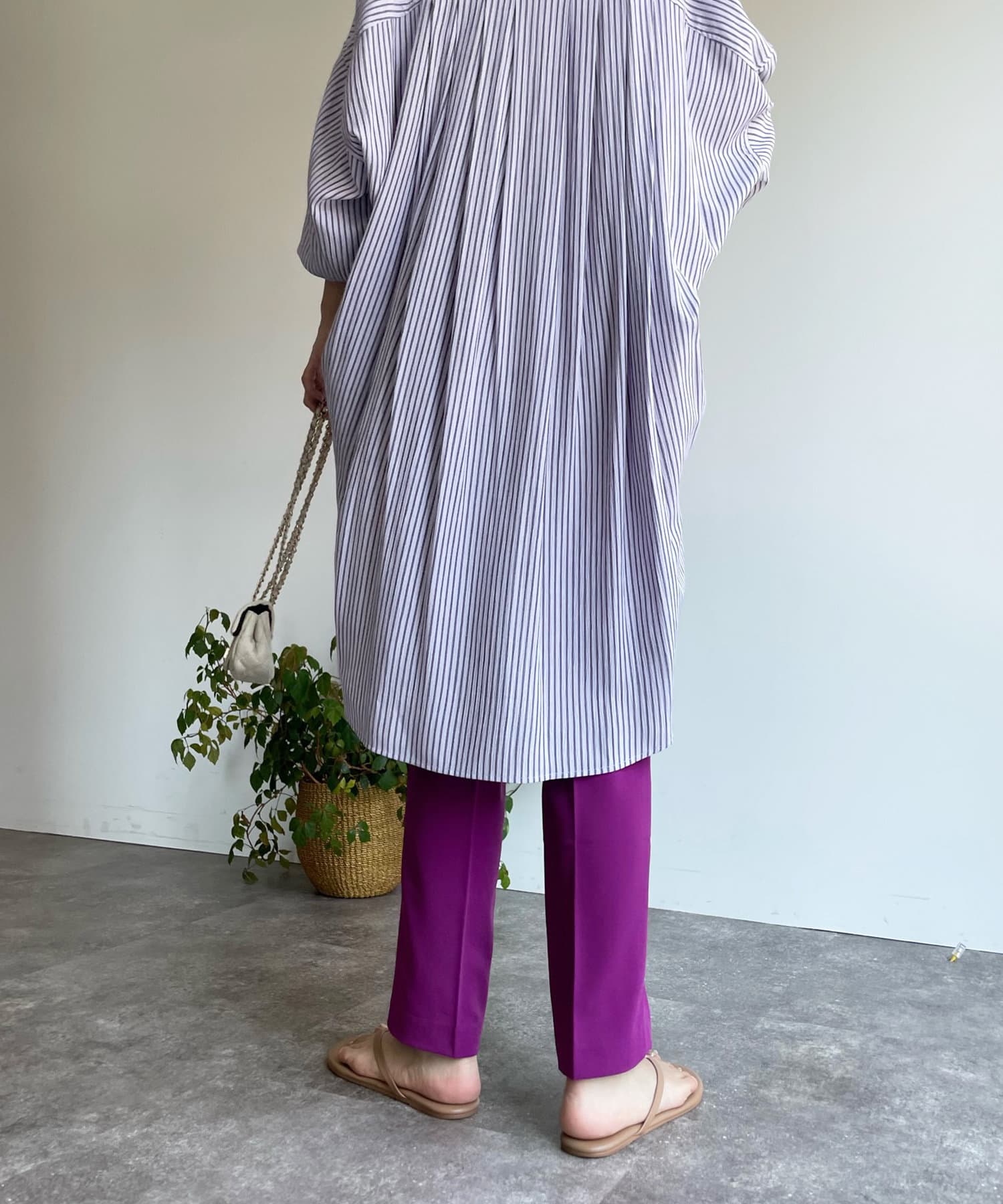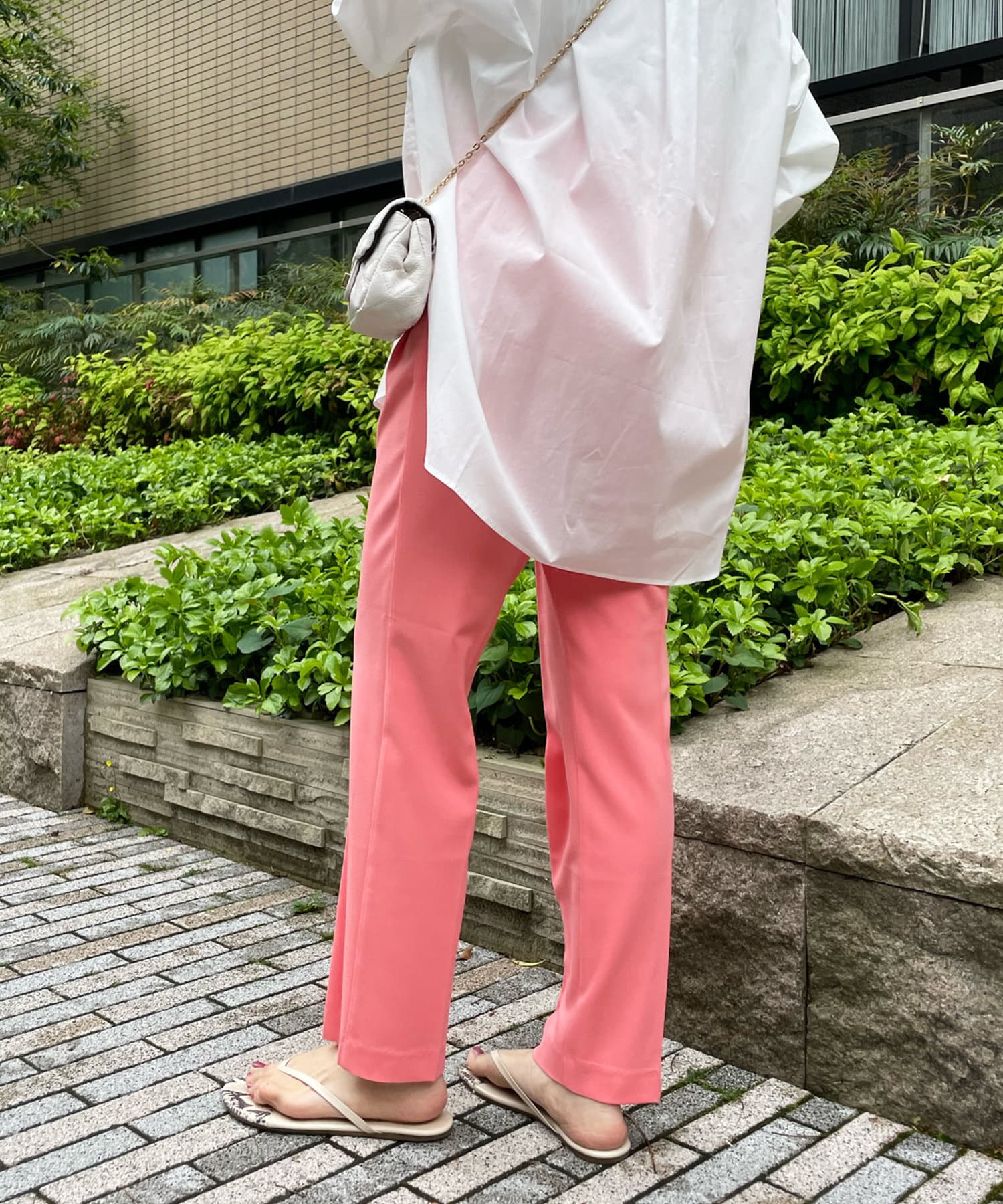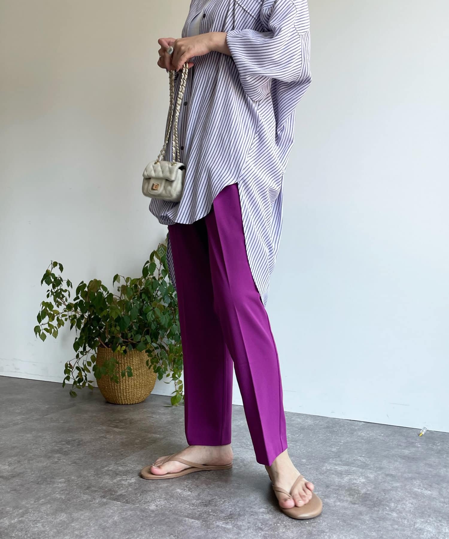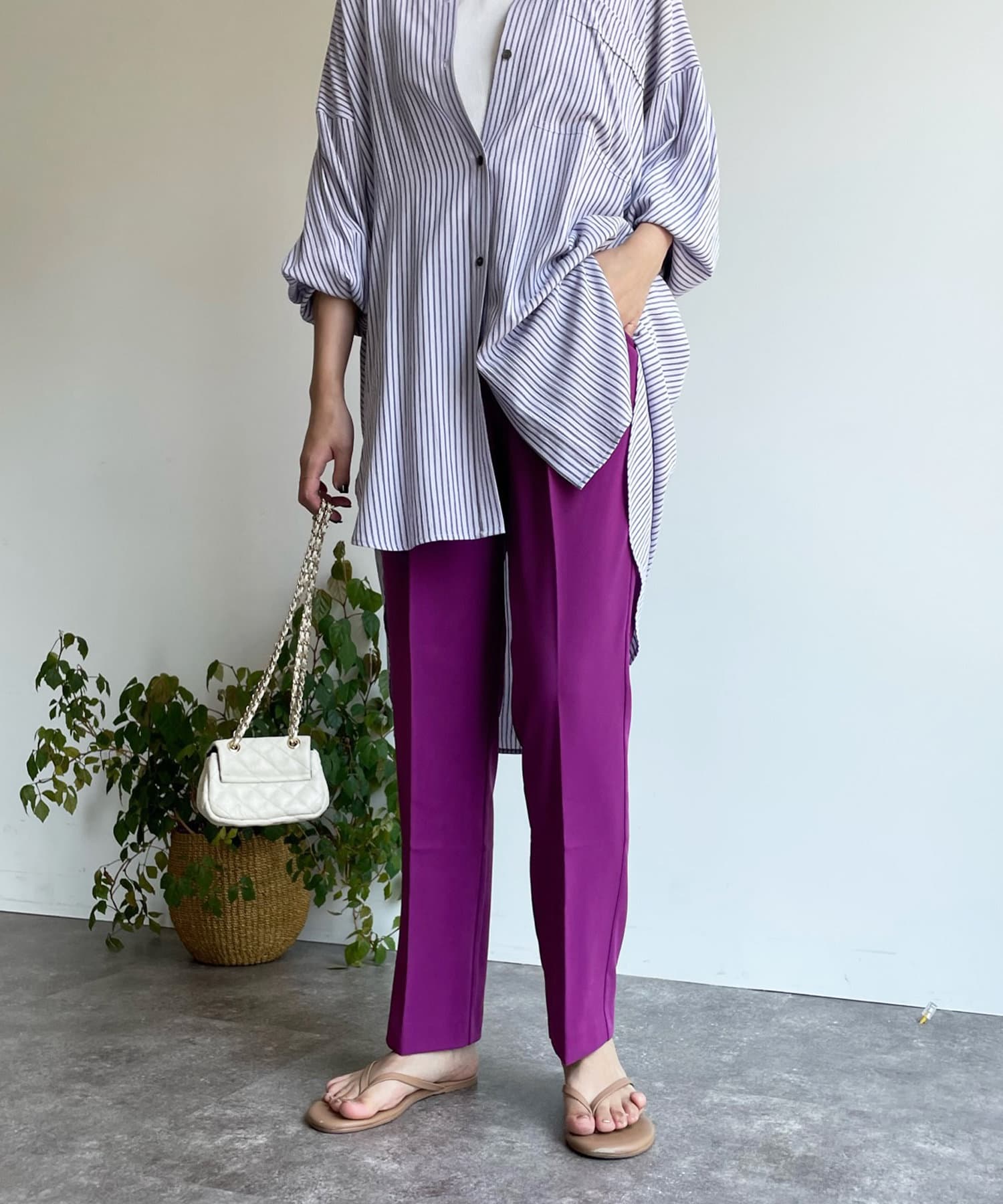 美脚の秘訣は、お腹周りをスッキリと見せるタック使いと縦ラインを強調するセンタープレス。