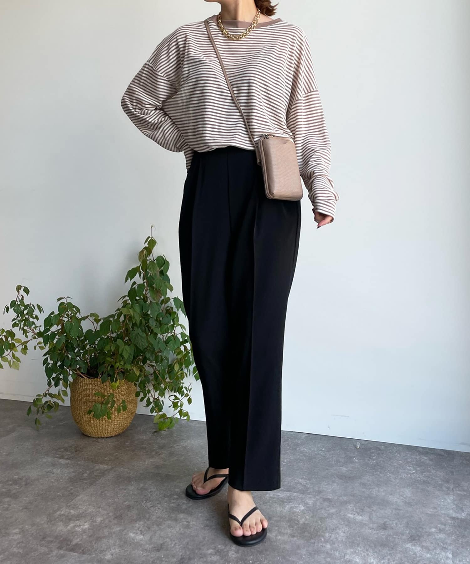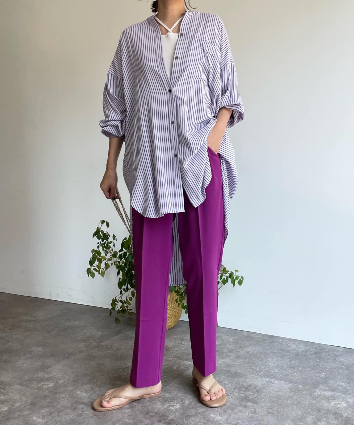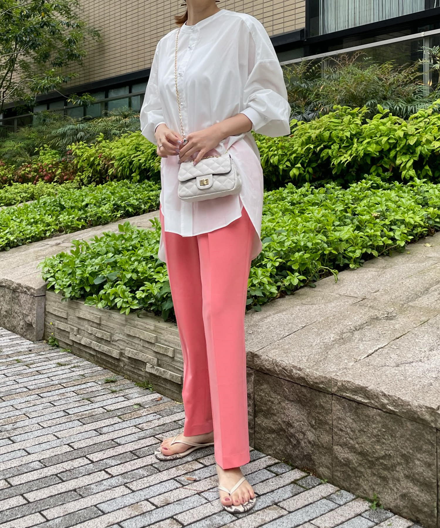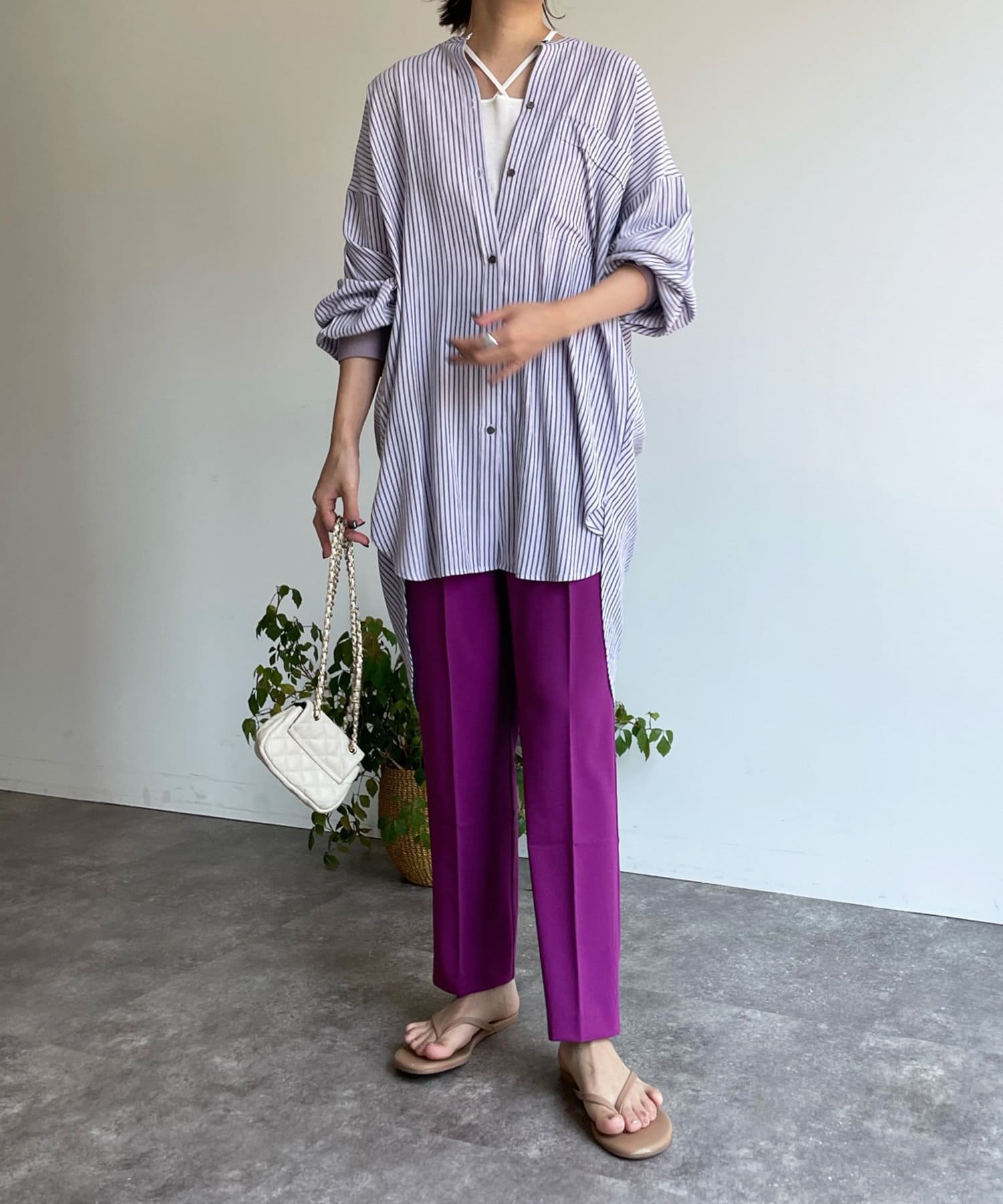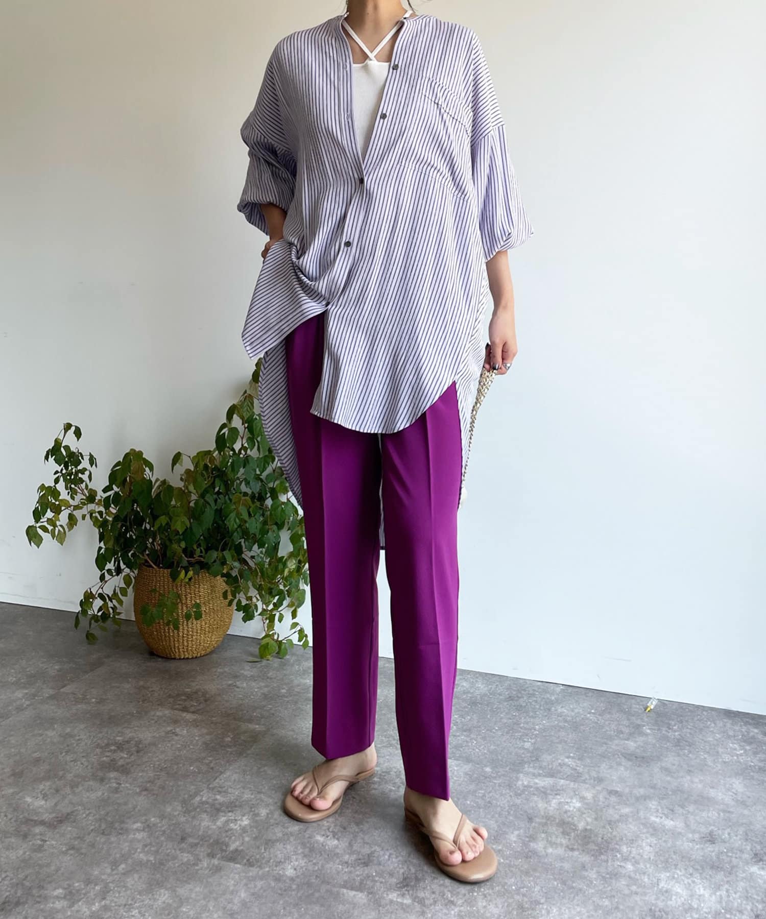 美脚の秘訣は、お腹周りをスッキリと見せるタック使いと縦ラインを強調するセンタープレス。