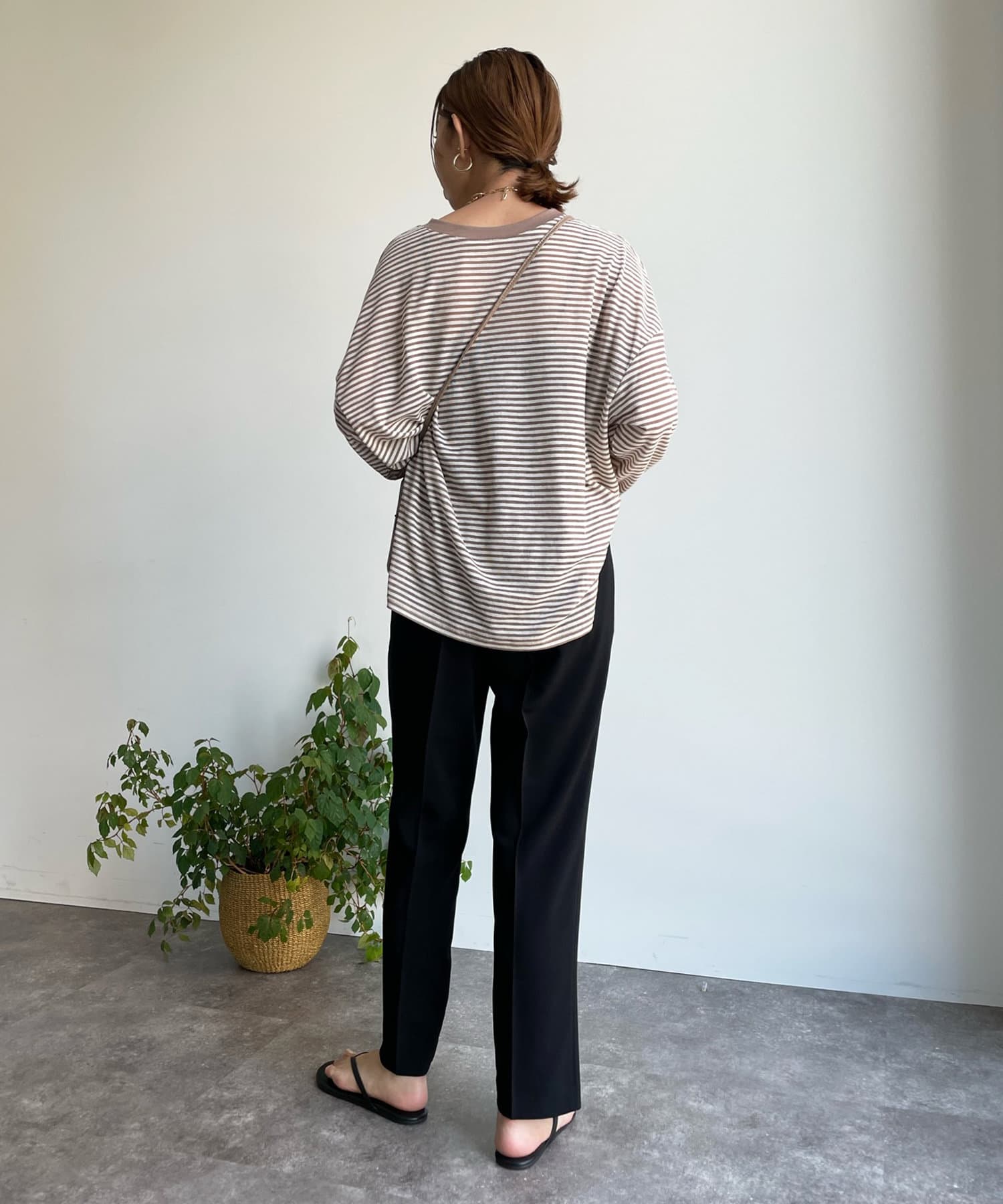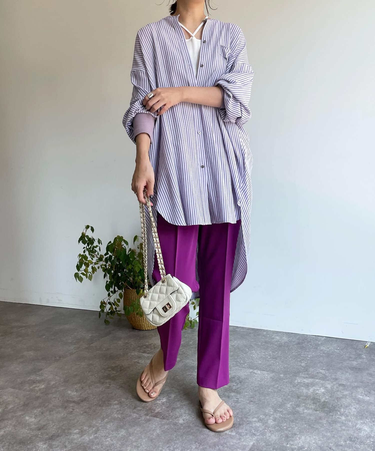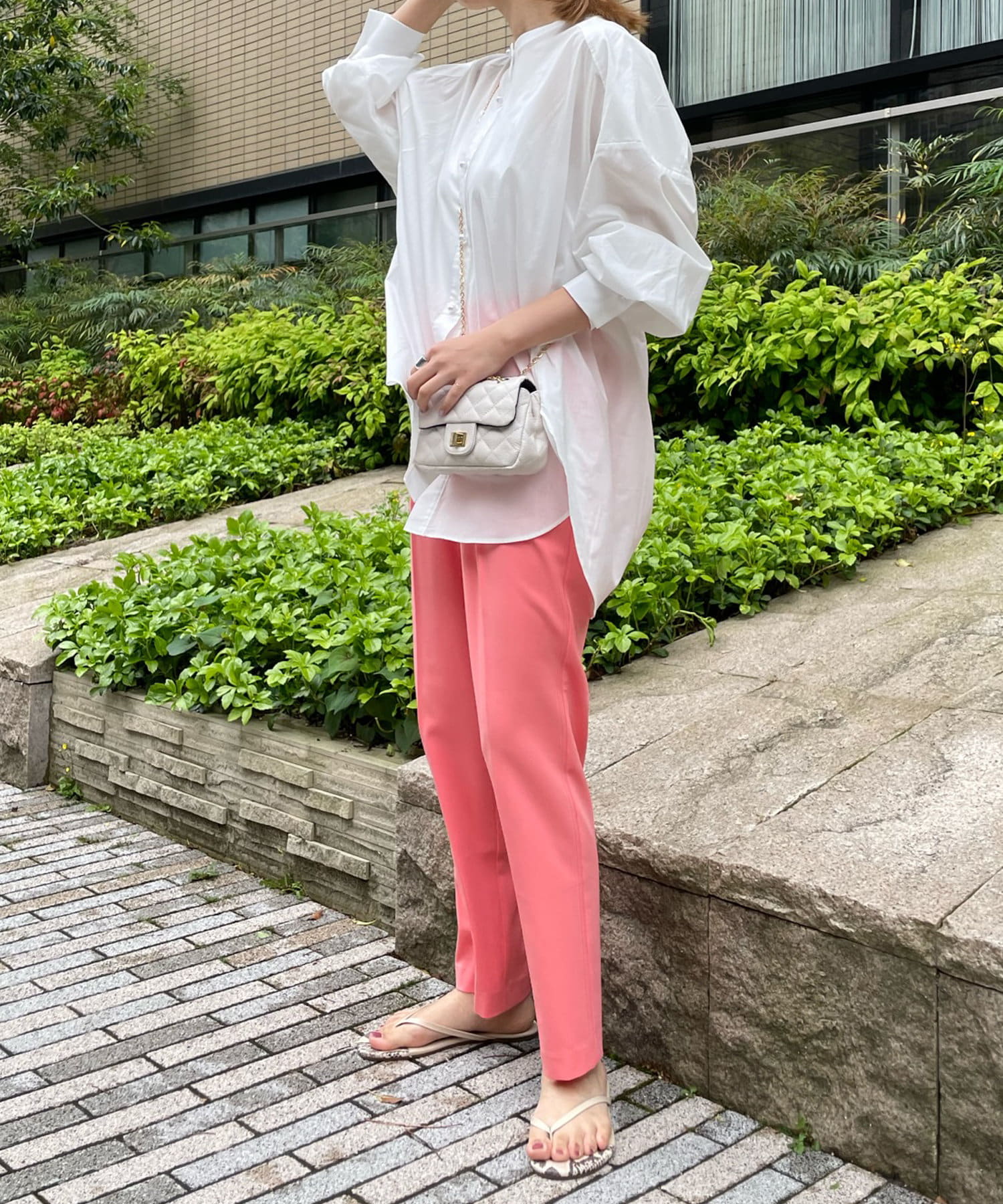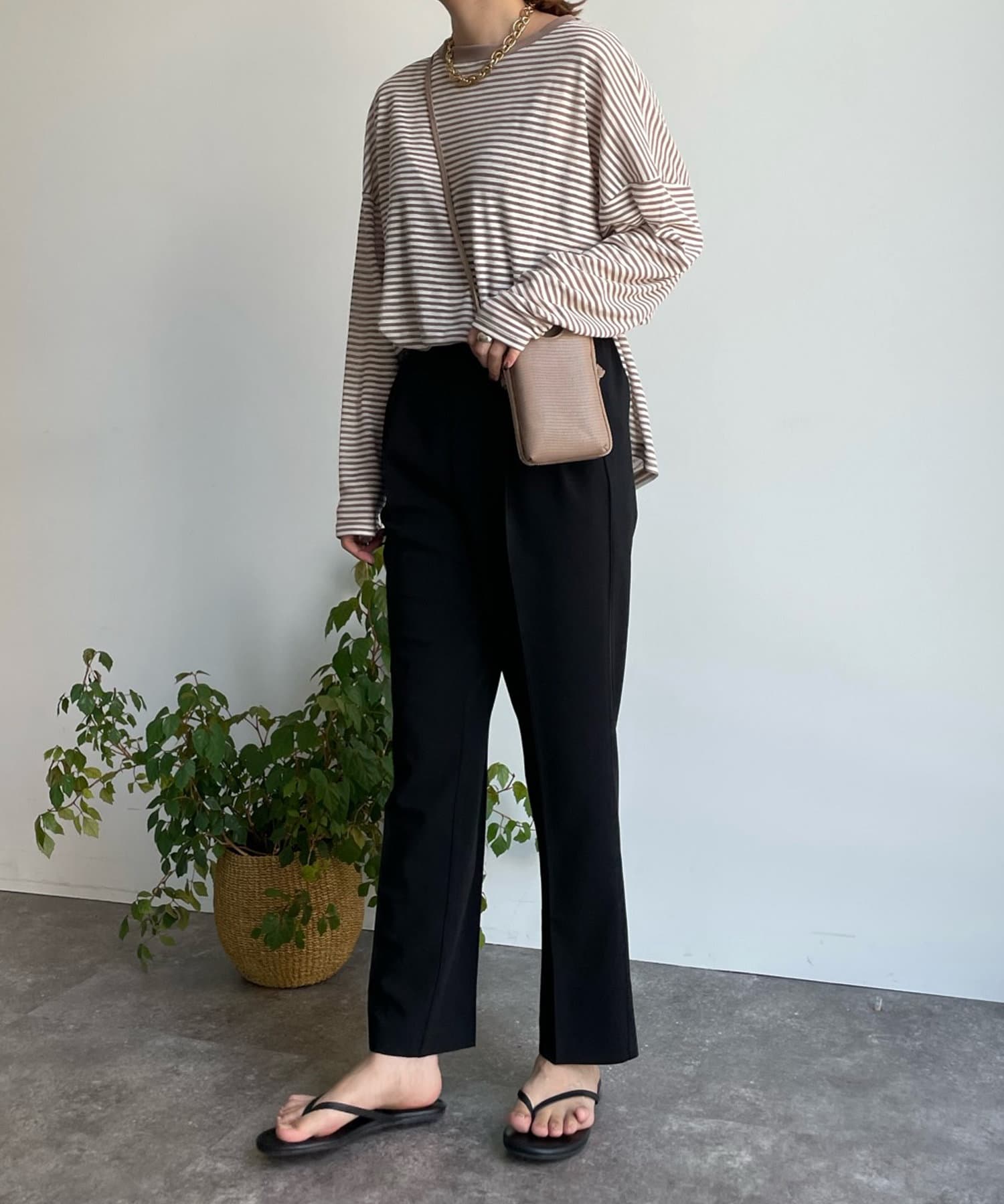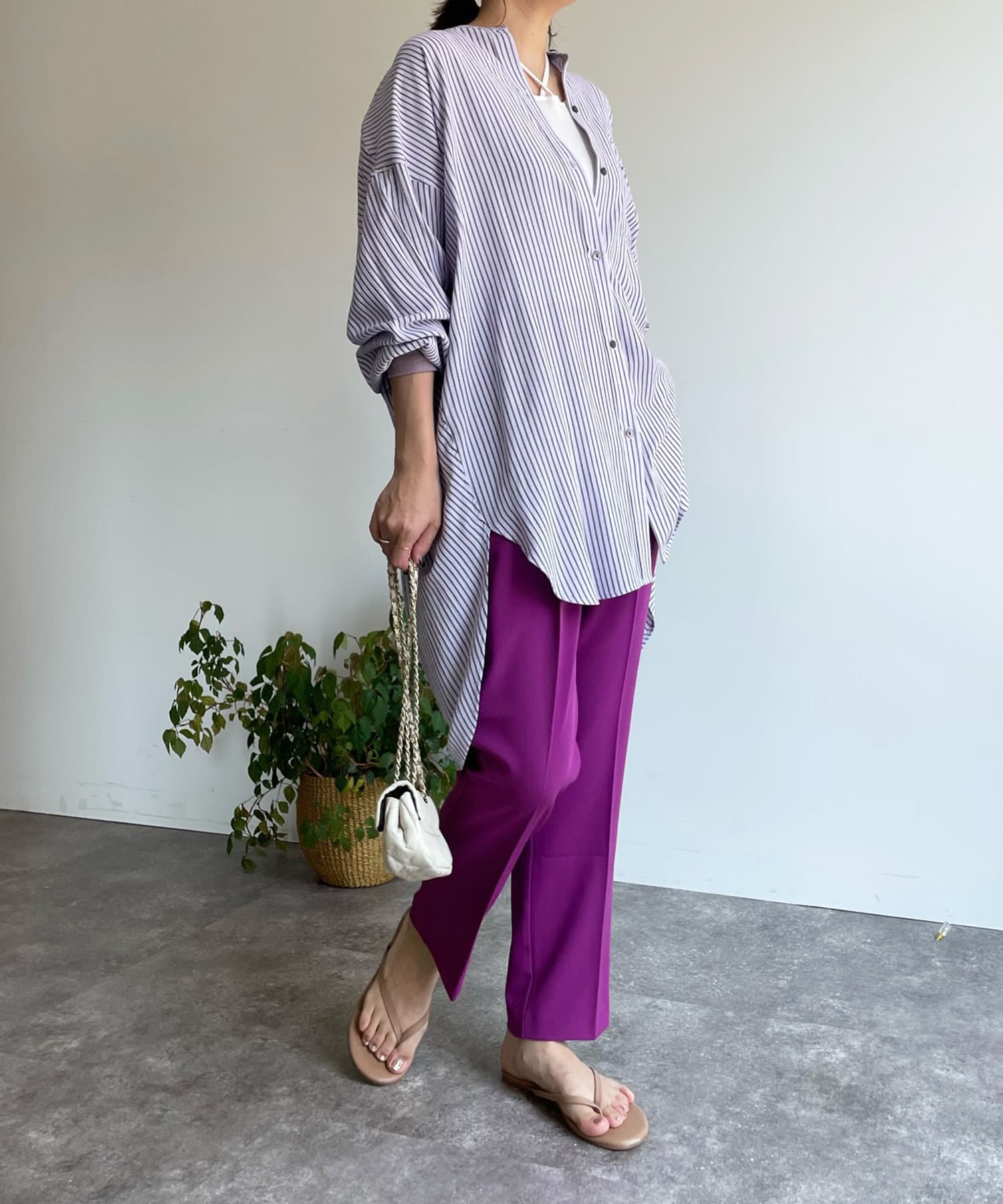 美脚の秘訣は、お腹周りをスッキリと見せるタック使いと縦ラインを強調するセンタープレス。