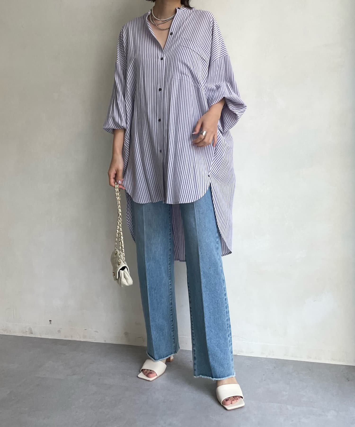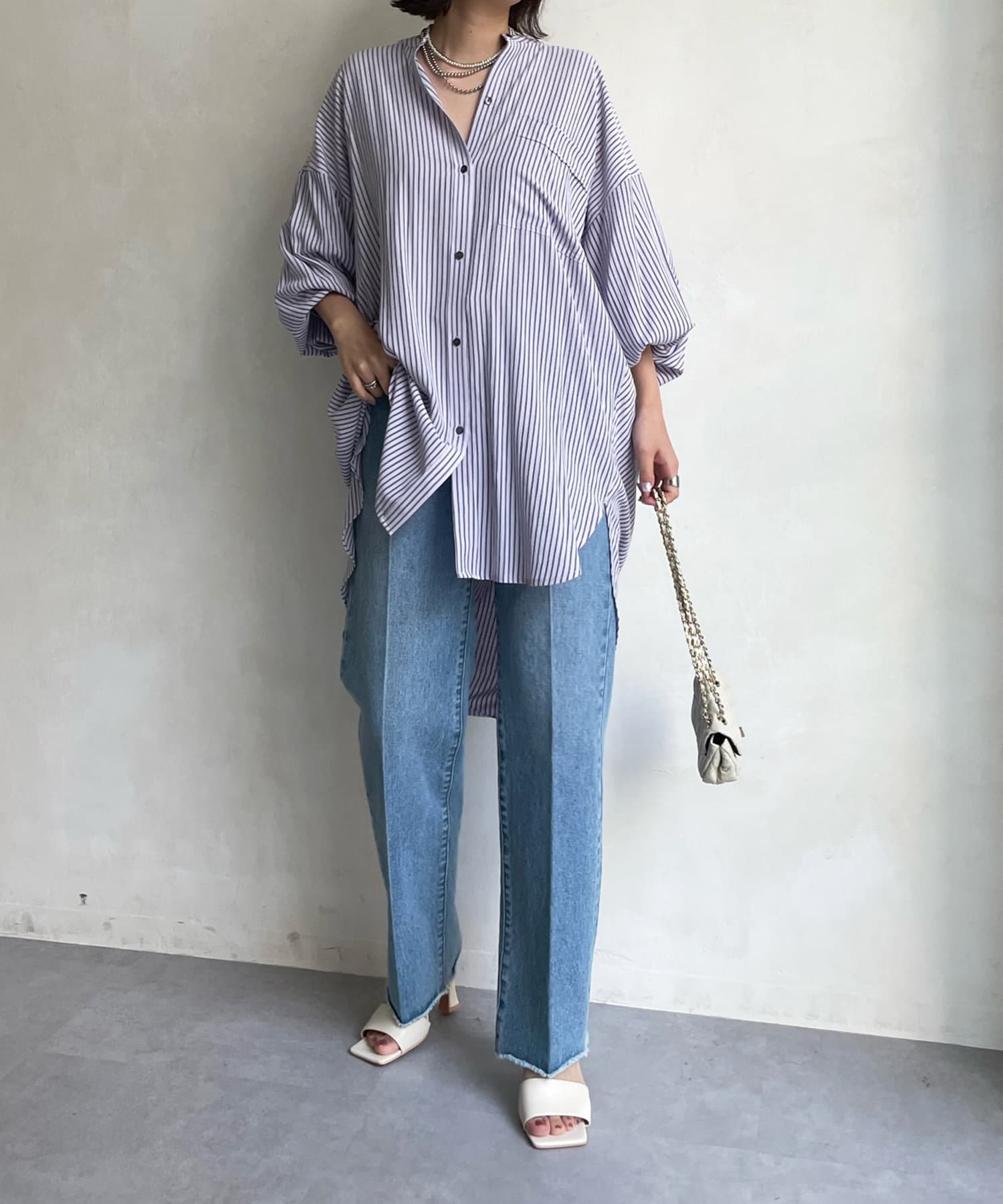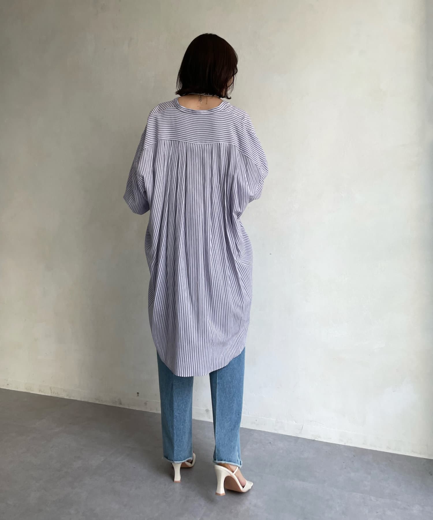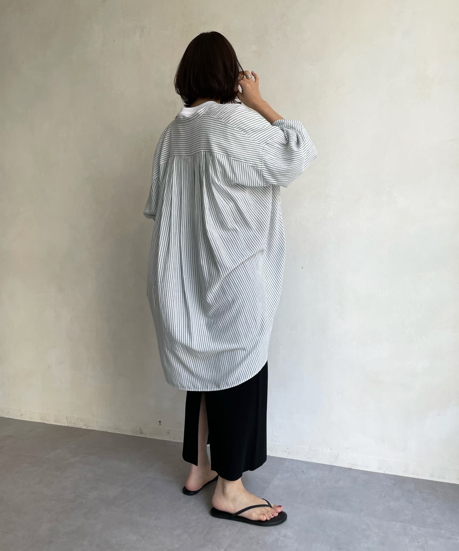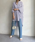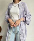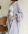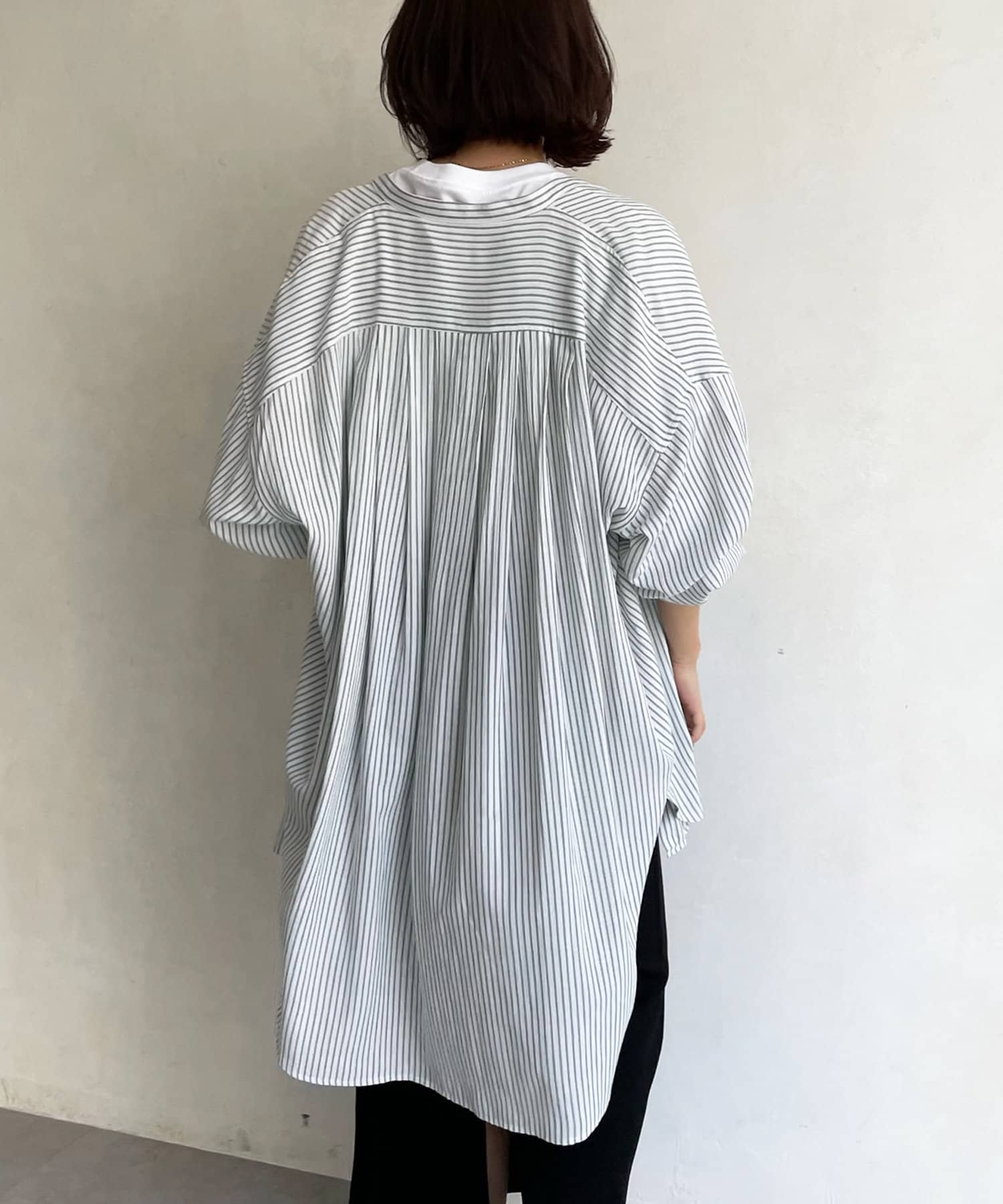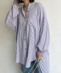 たっぷりとしたシルエットとストライプ柄で、爽やかな1着。