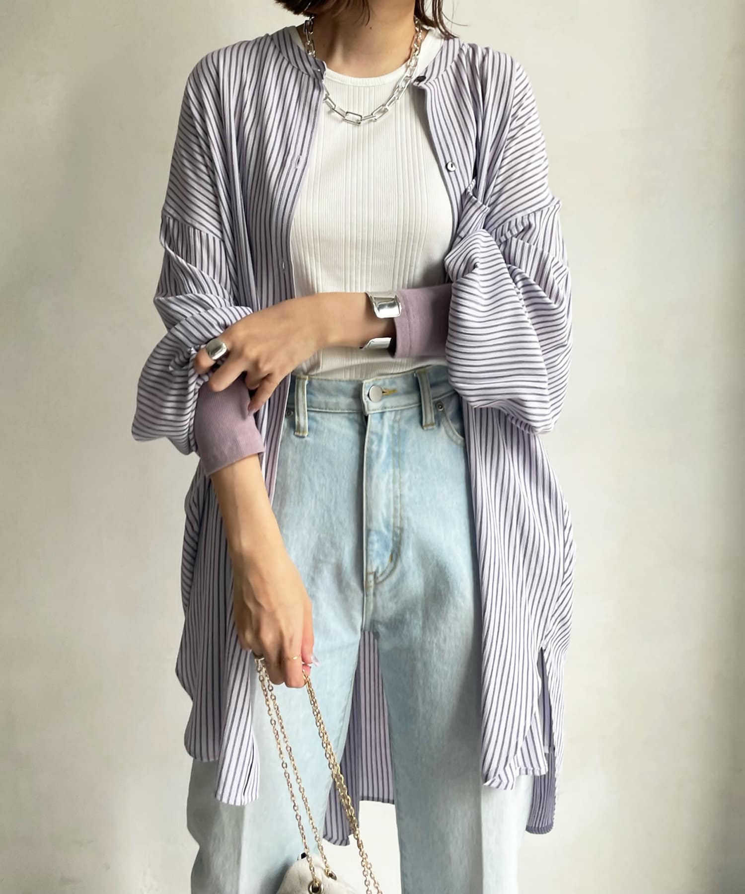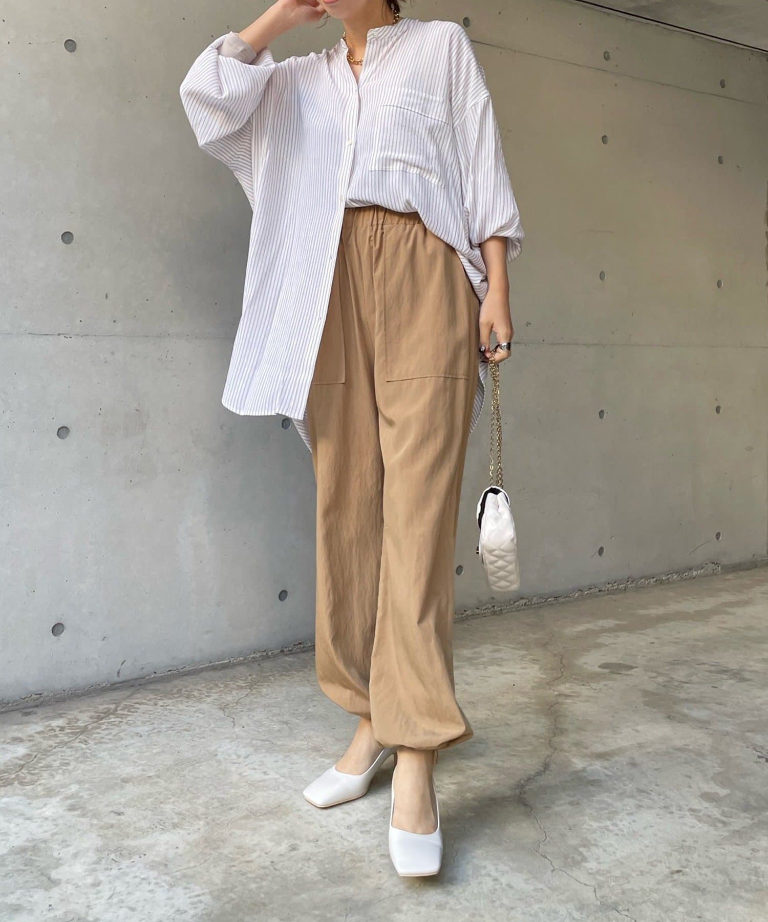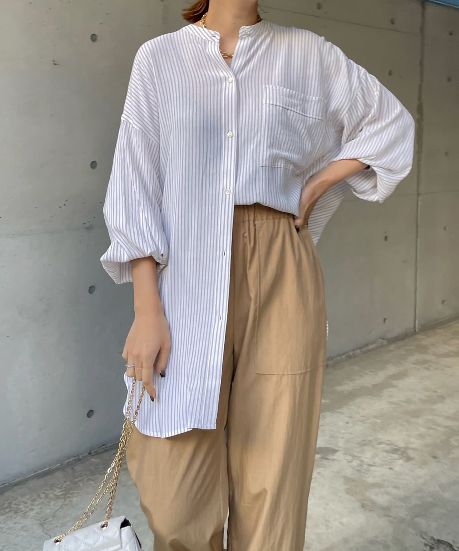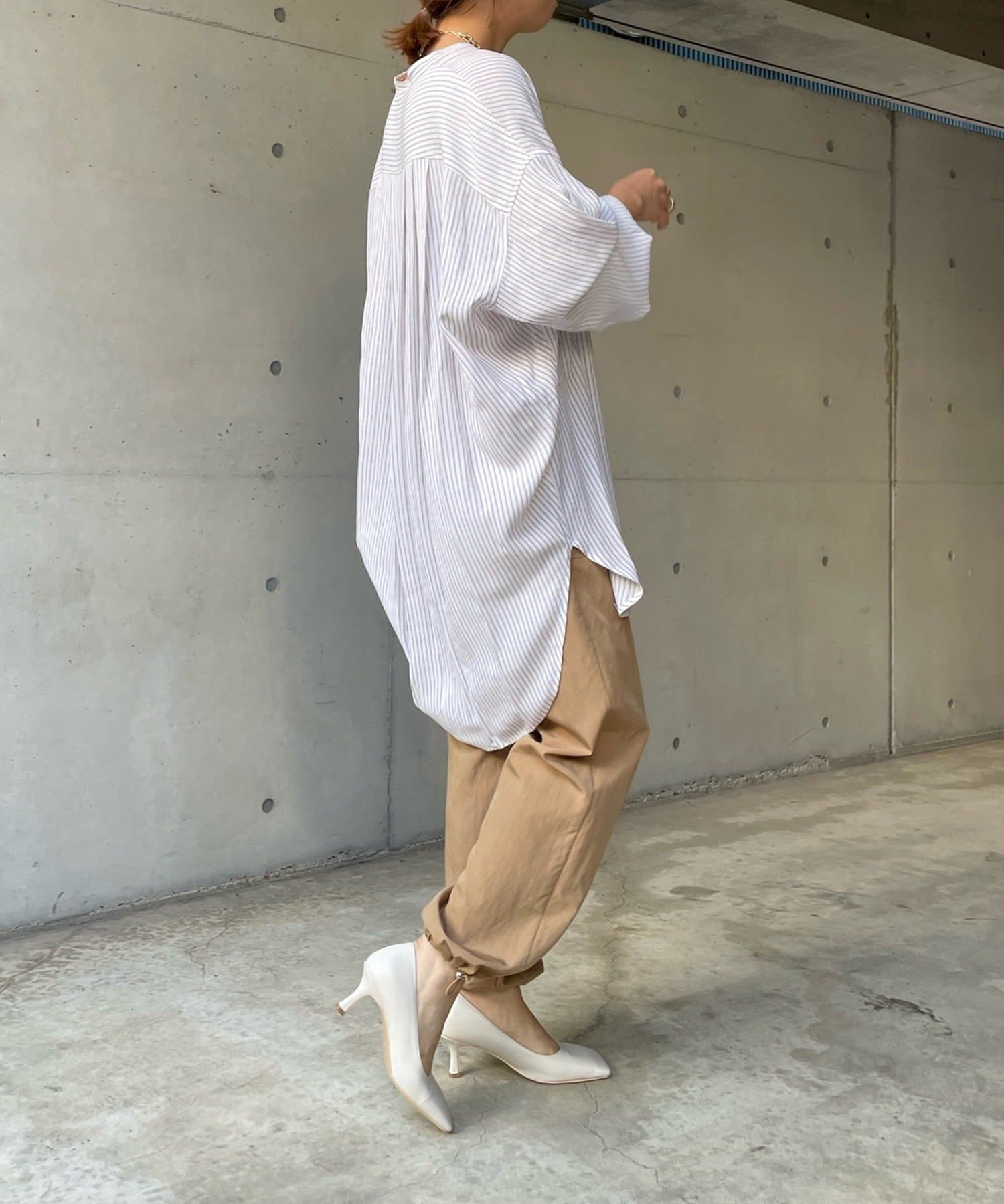 たっぷりとしたシルエットとストライプ柄で、爽やかな1着。