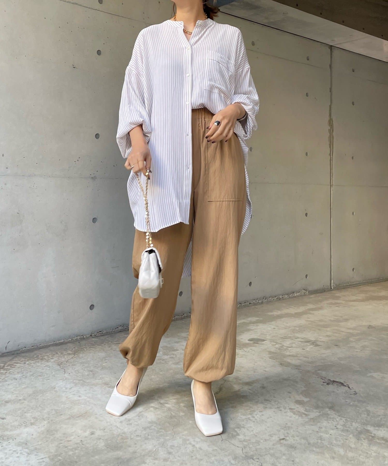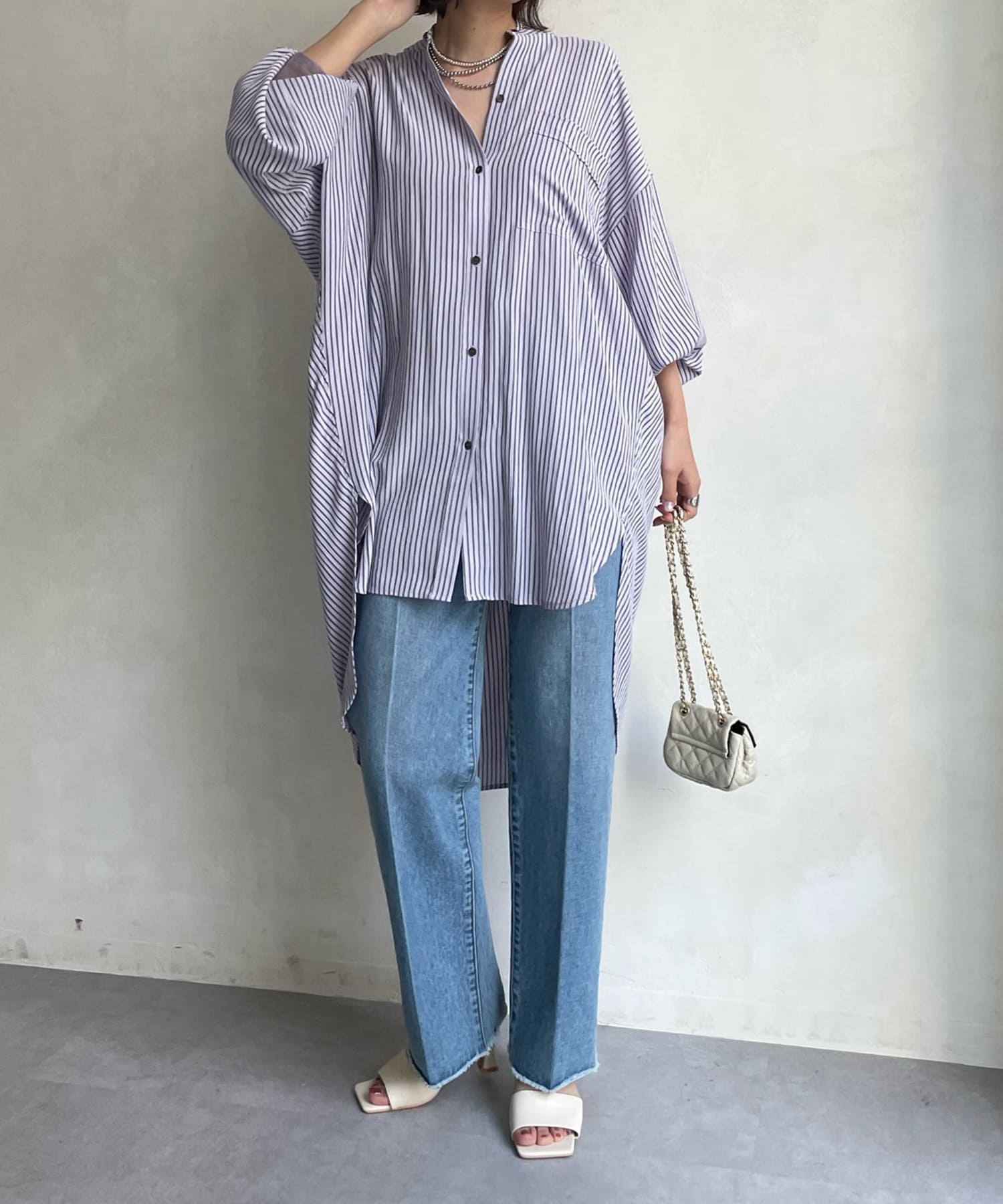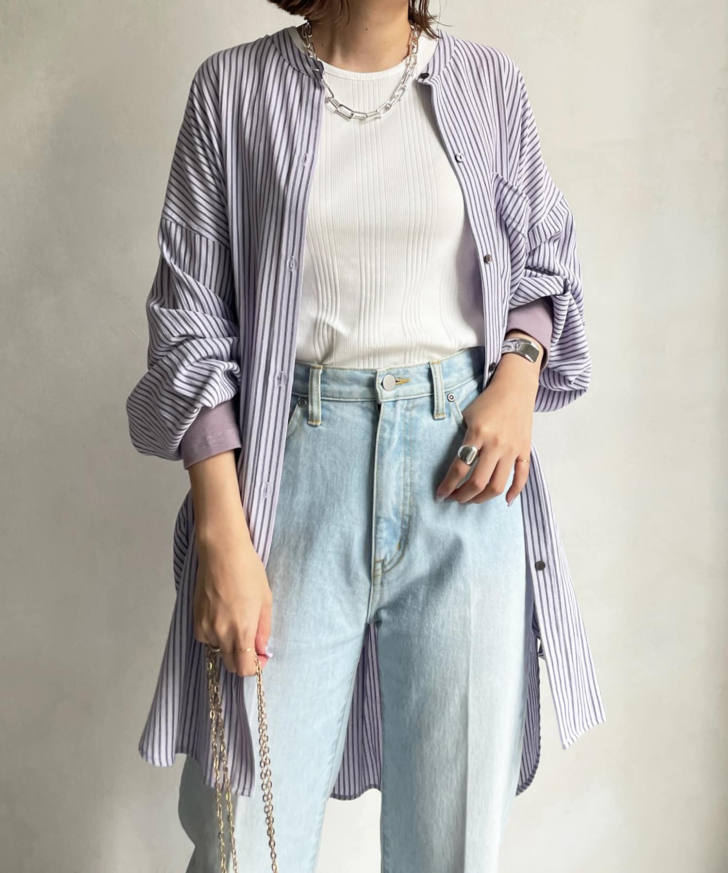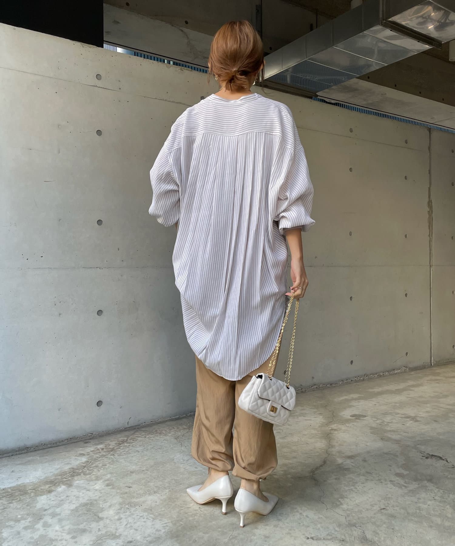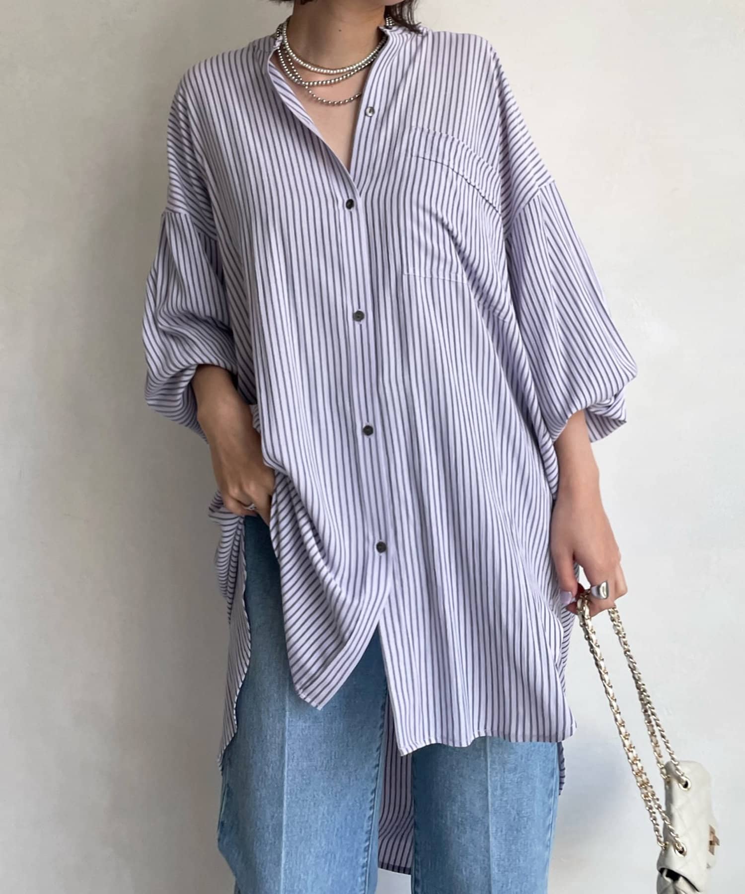 たっぷりとしたシルエットとストライプ柄で、爽やかな1着。
