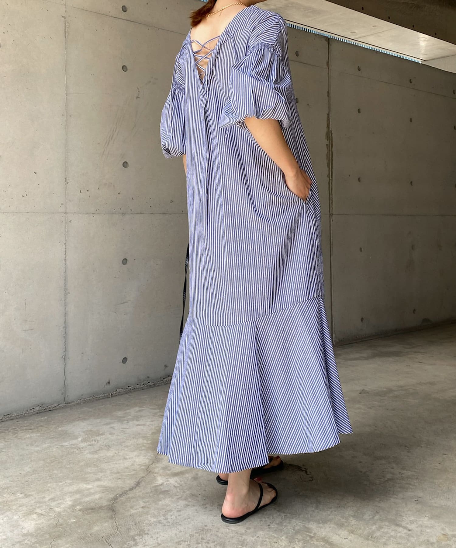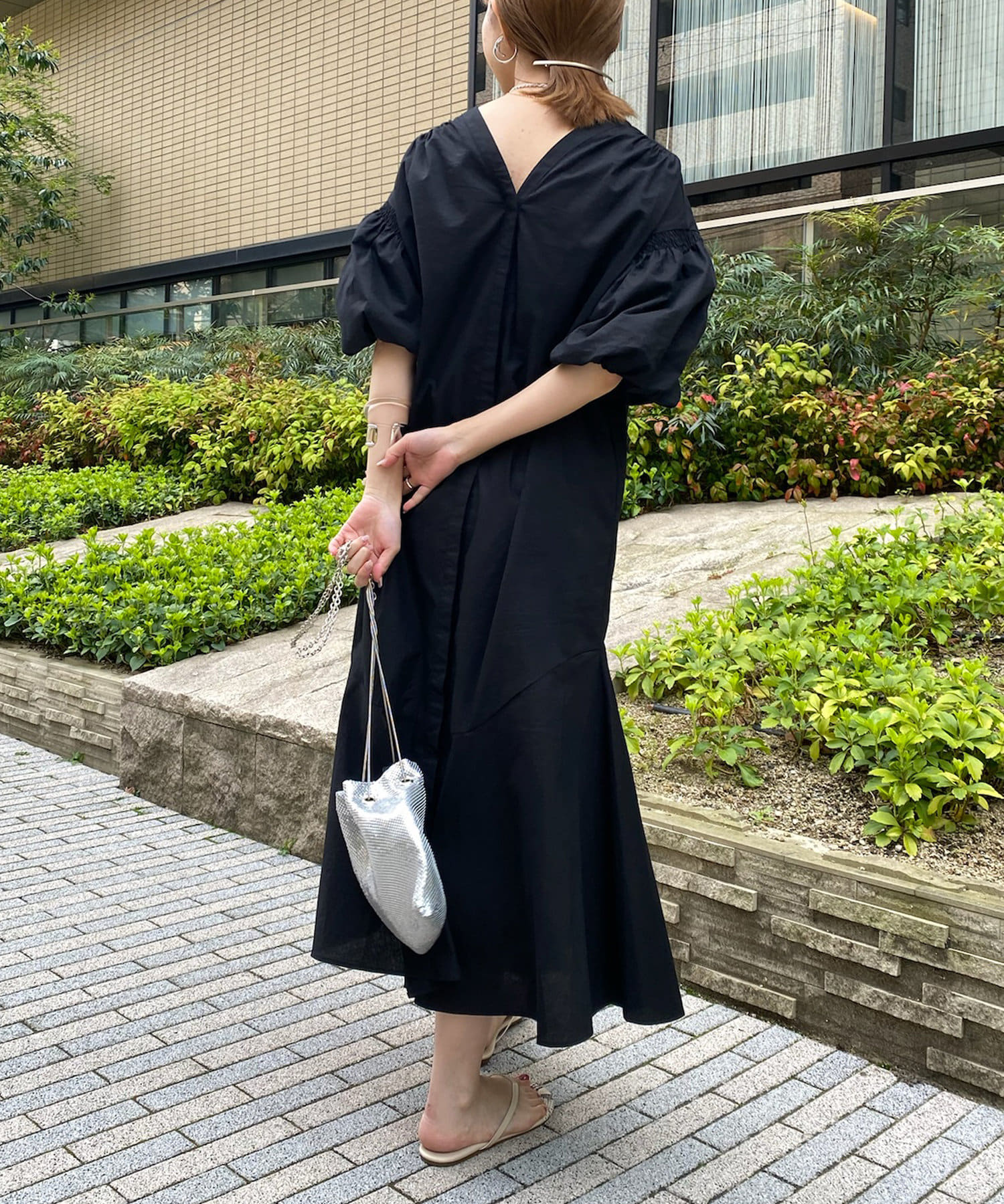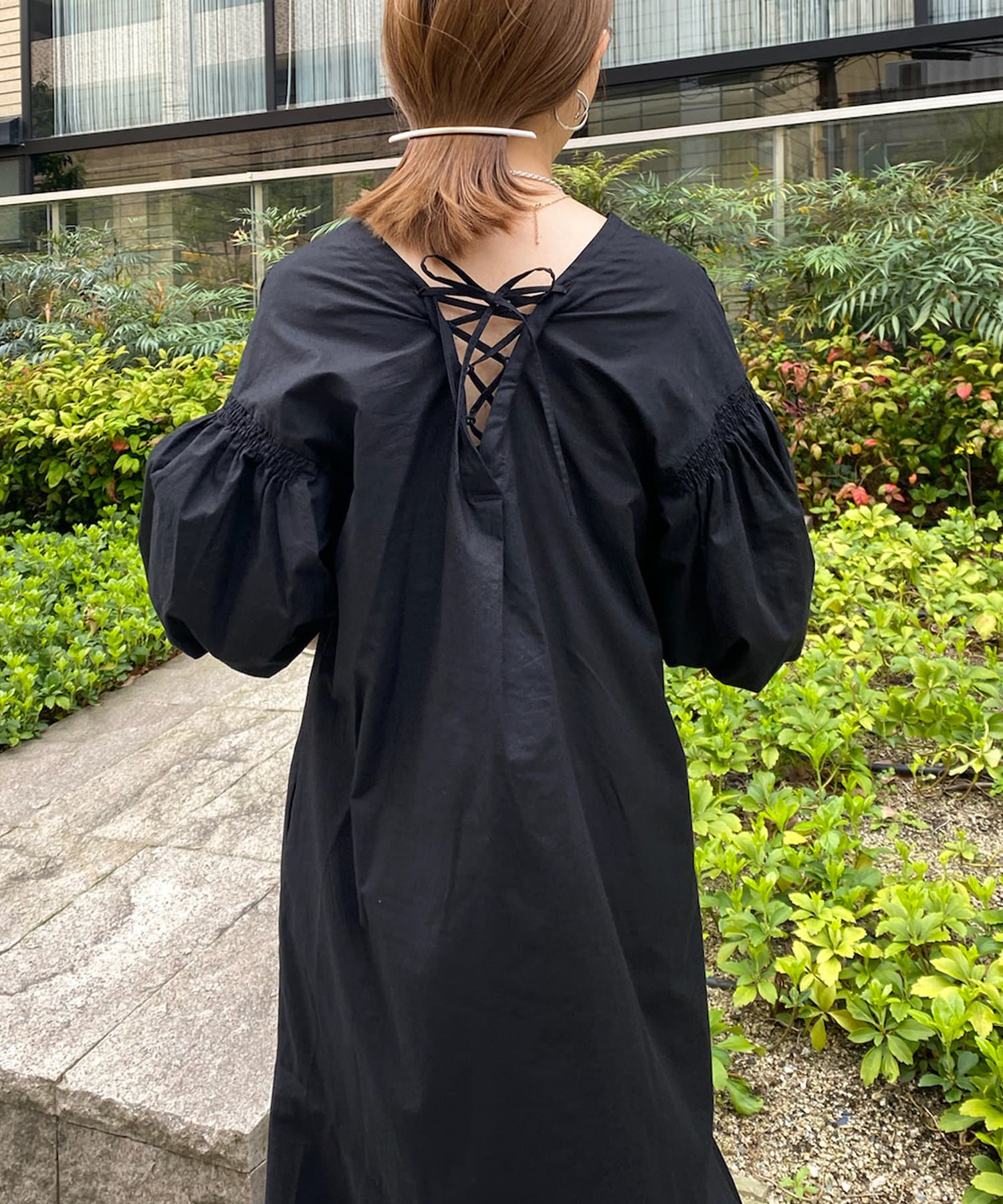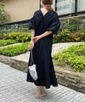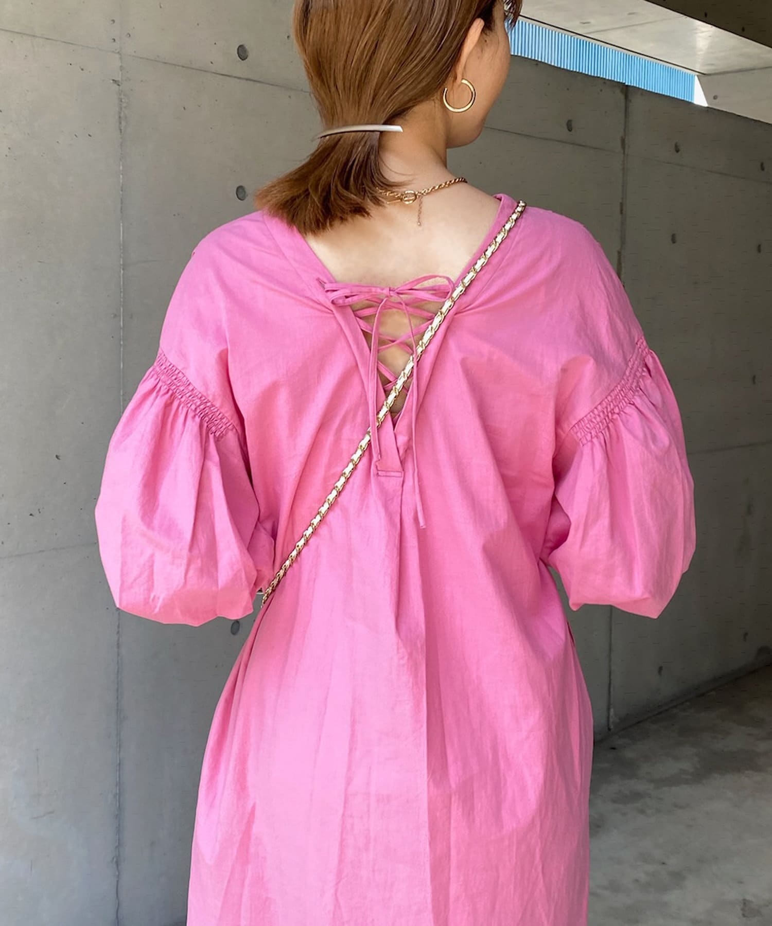 スピンドルデザインの部分を前後どちらにも着られる2way仕様のワンピース。