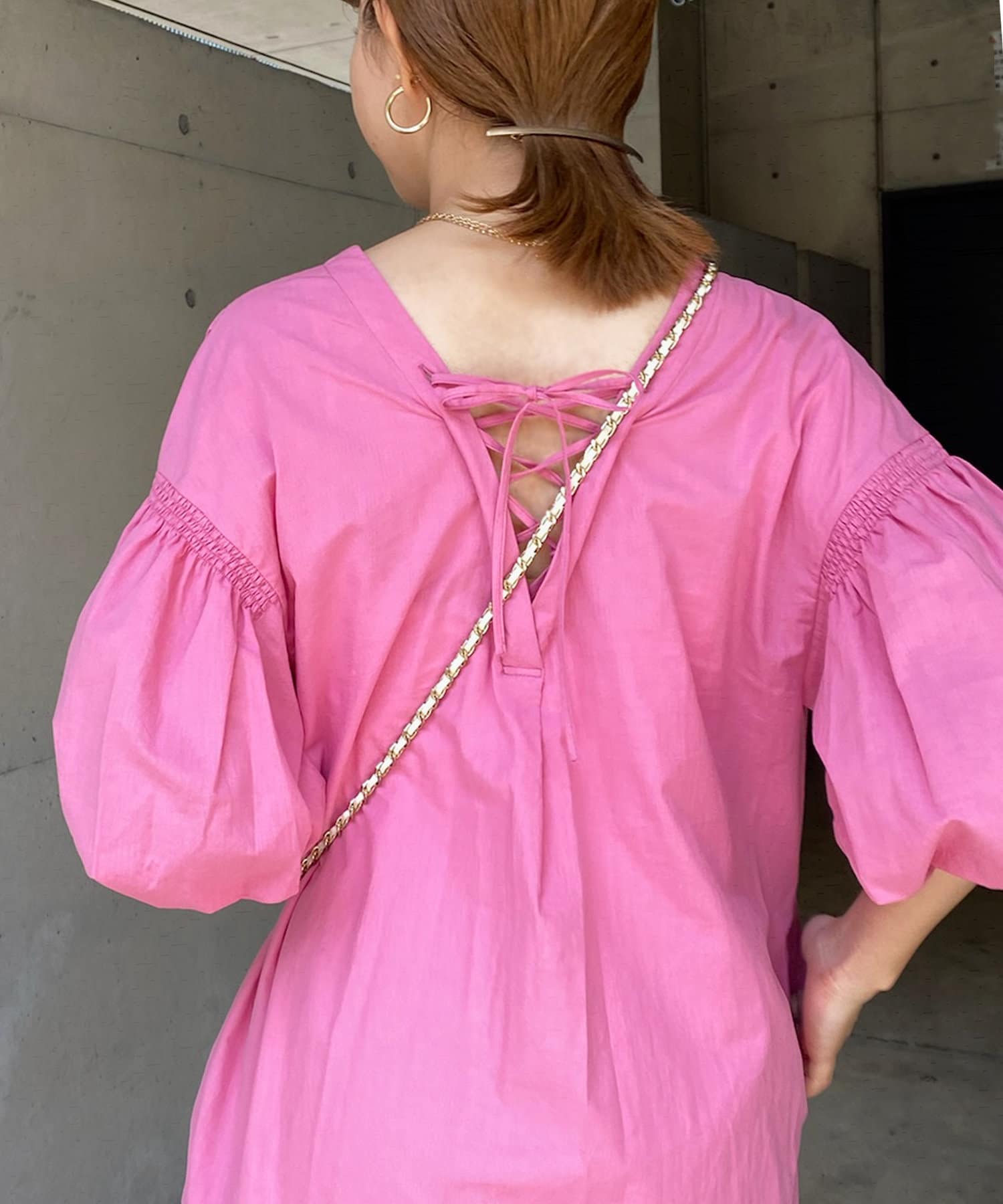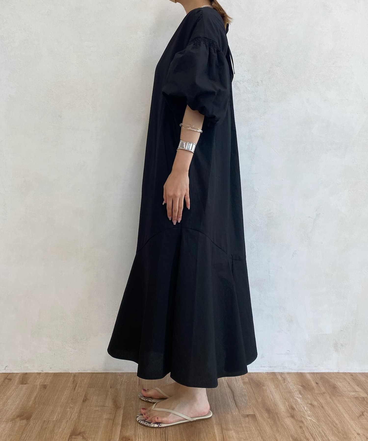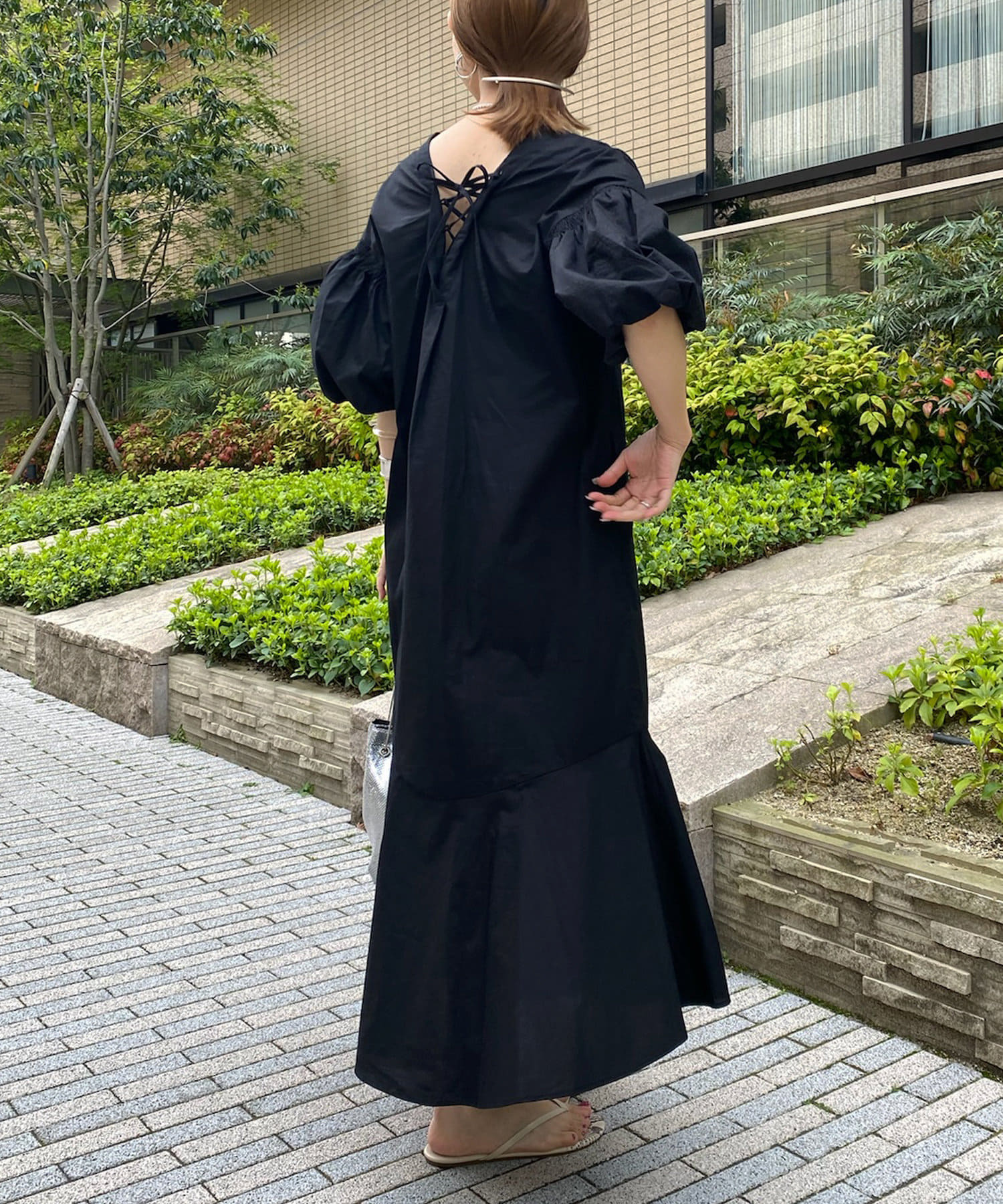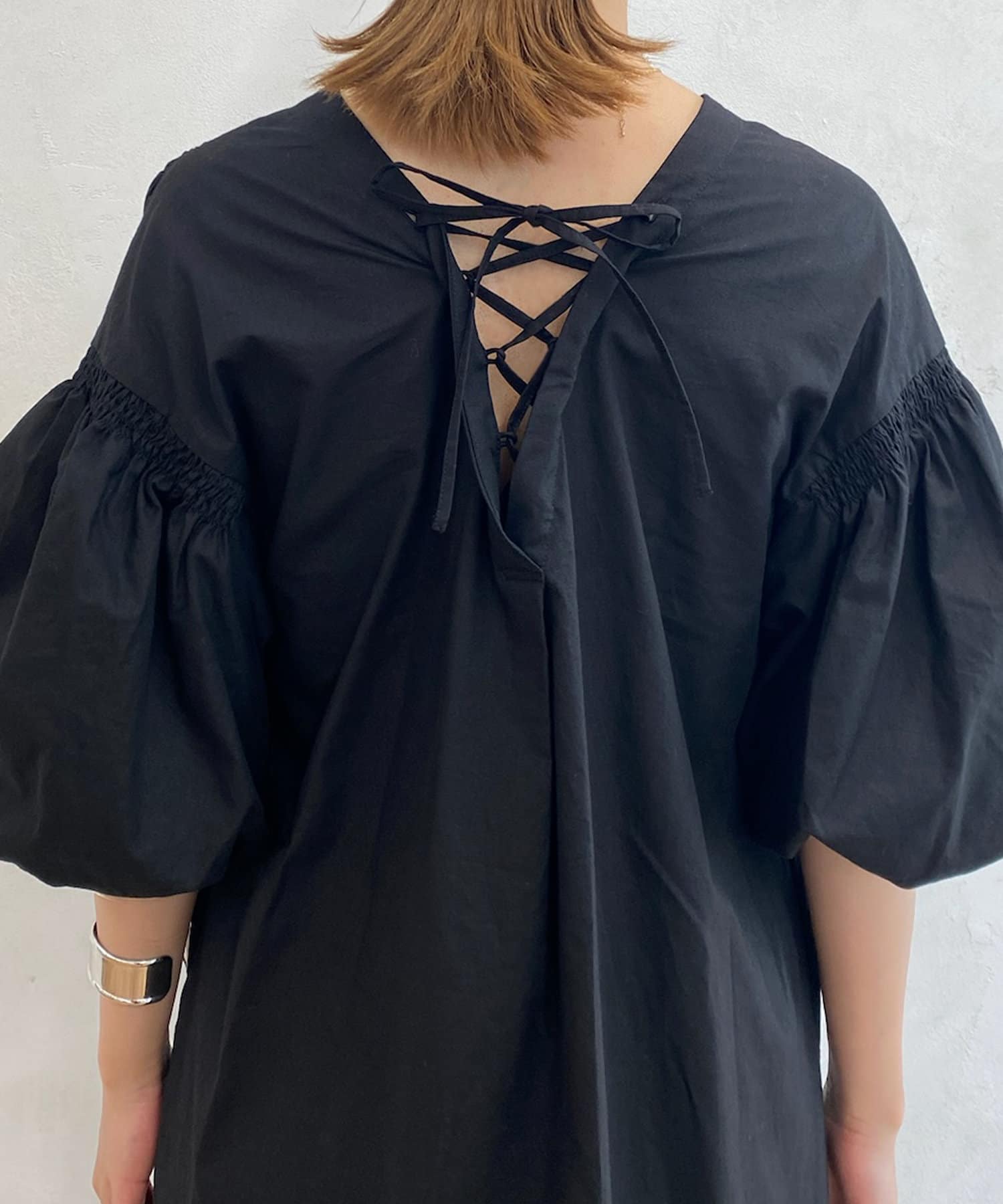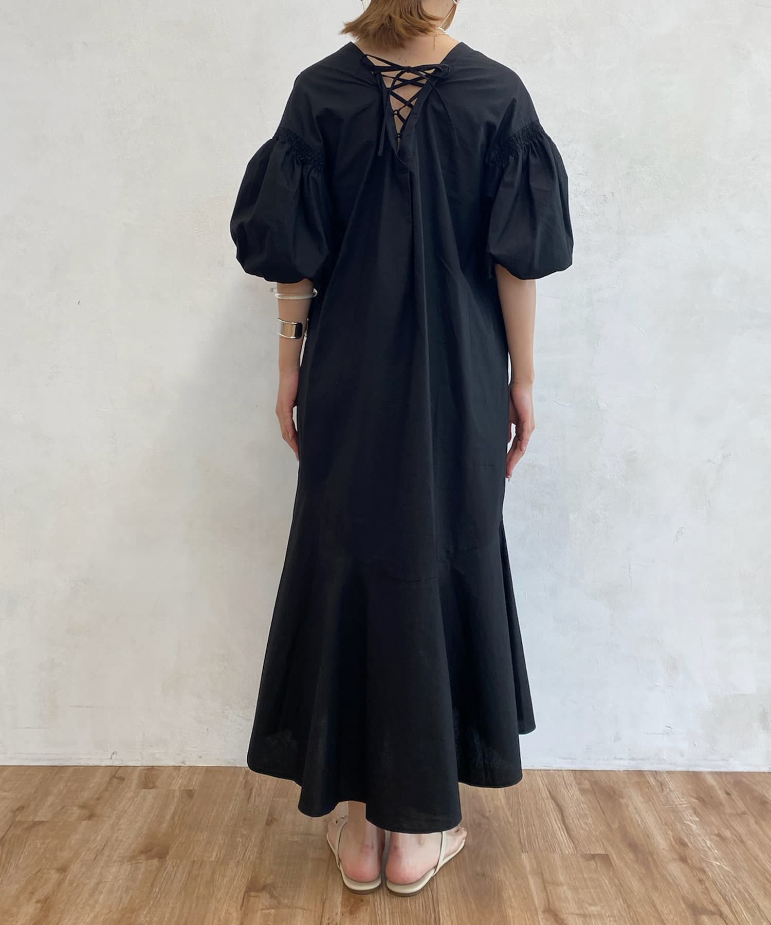 スピンドルデザインの部分を前後どちらにも着られる2way仕様のワンピース。