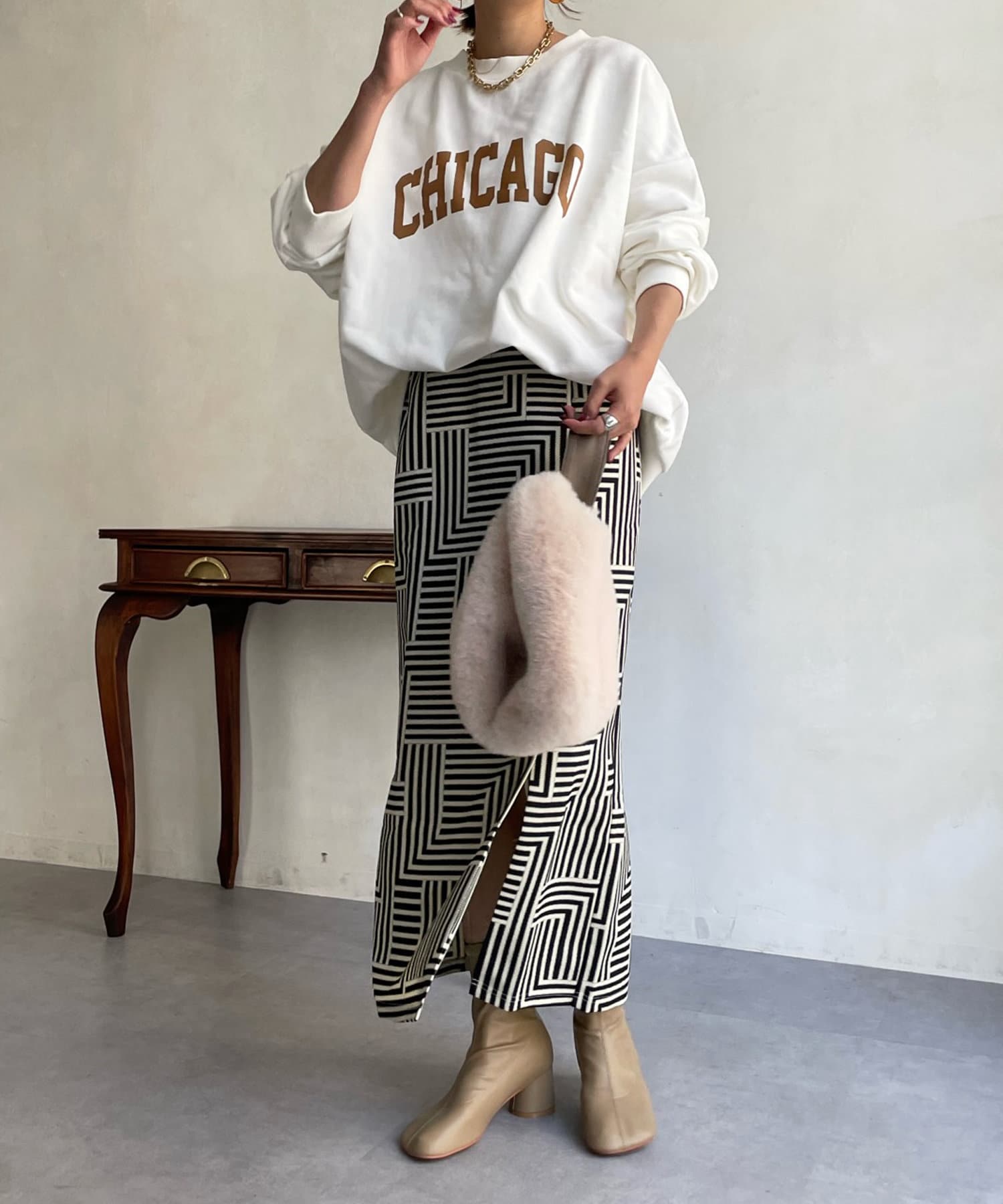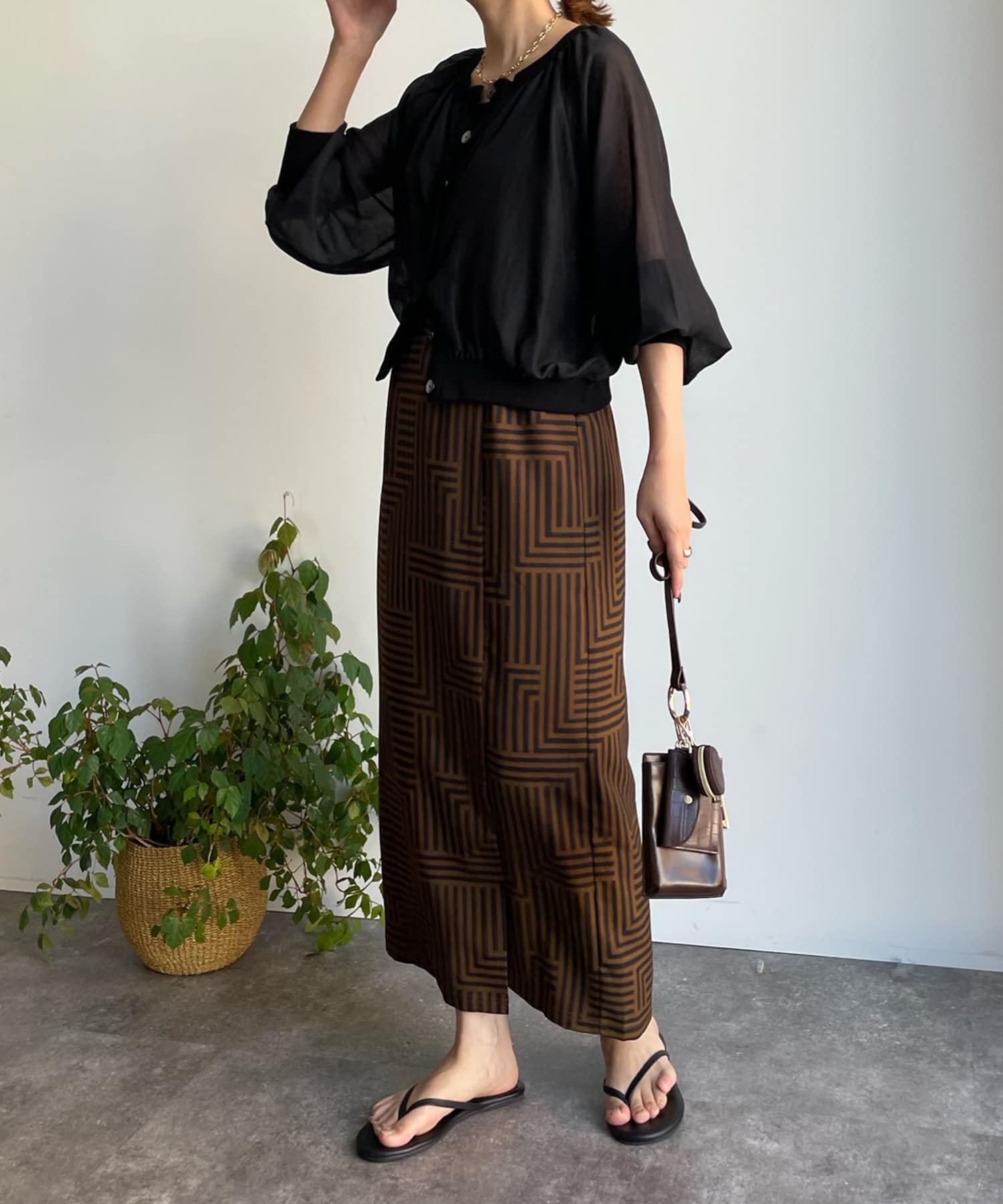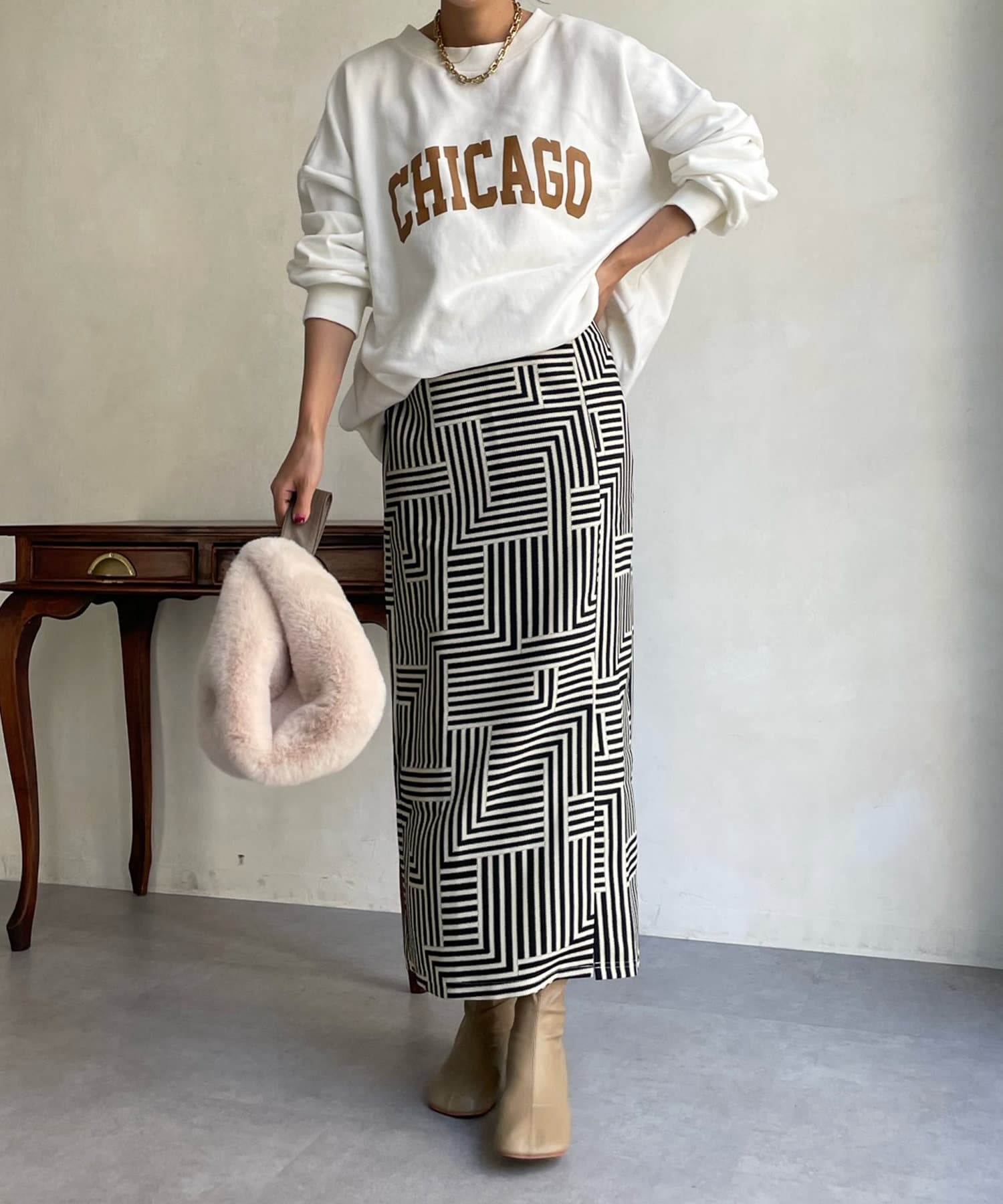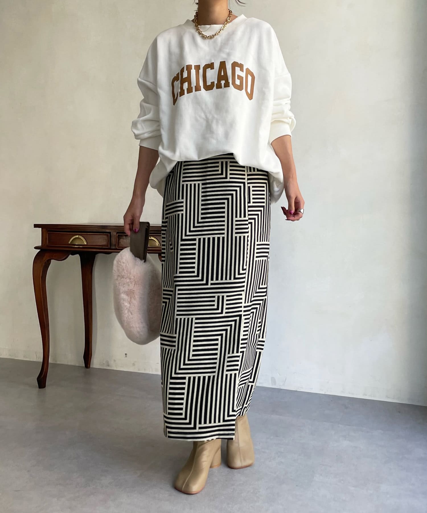 大人らしく仕上げてくれる幾何柄は、いつものトップスに合わせるだけでスカートスタイルを新鮮に見せてくれる1着です。