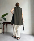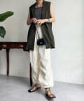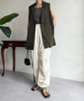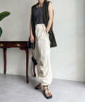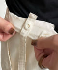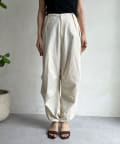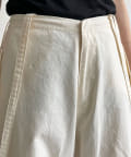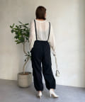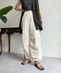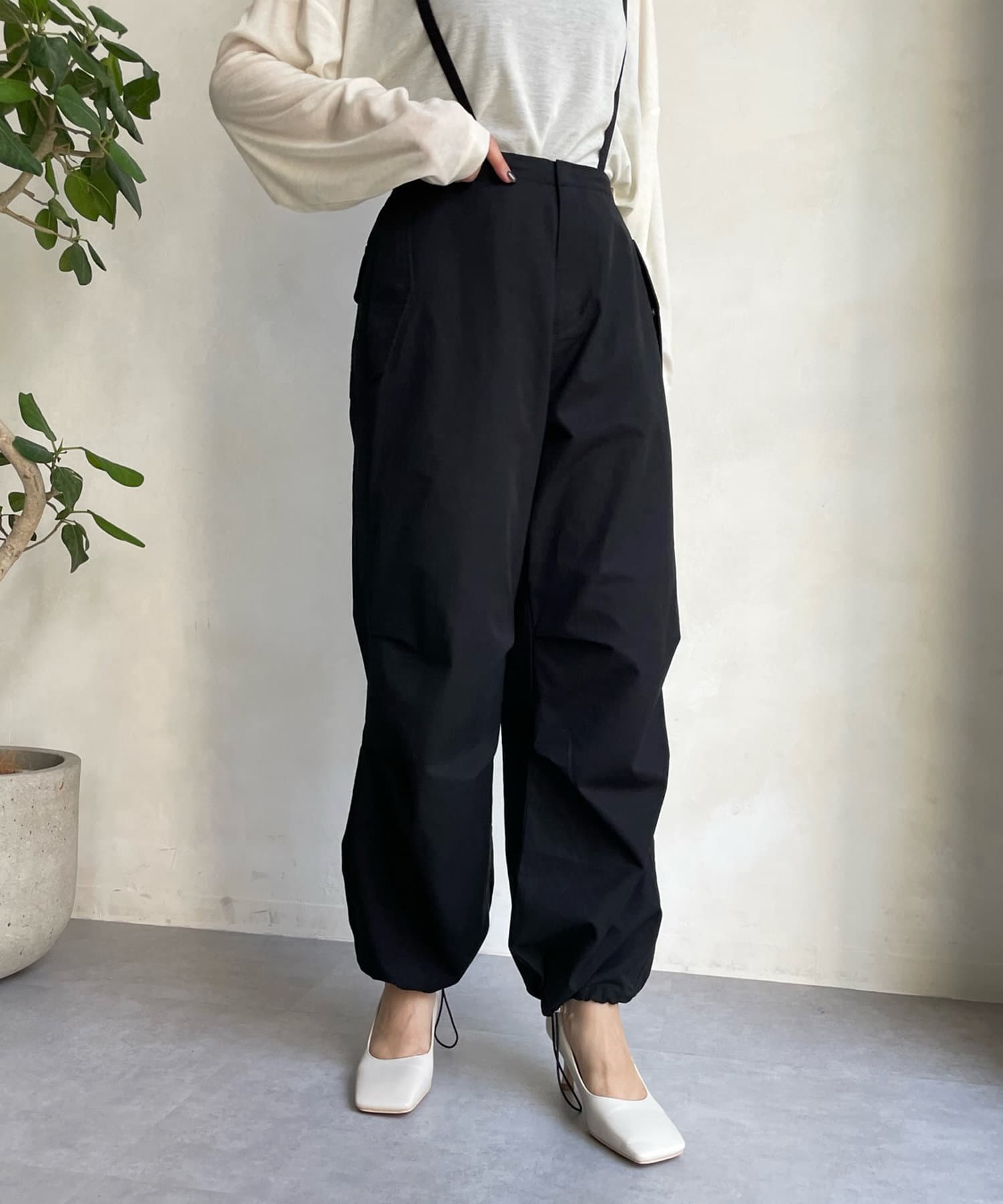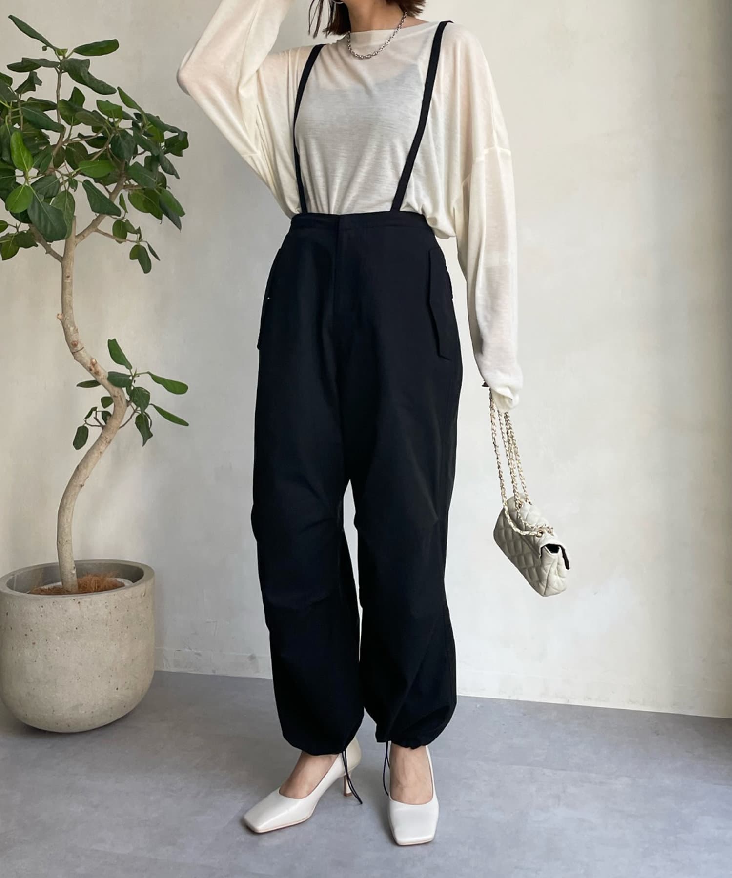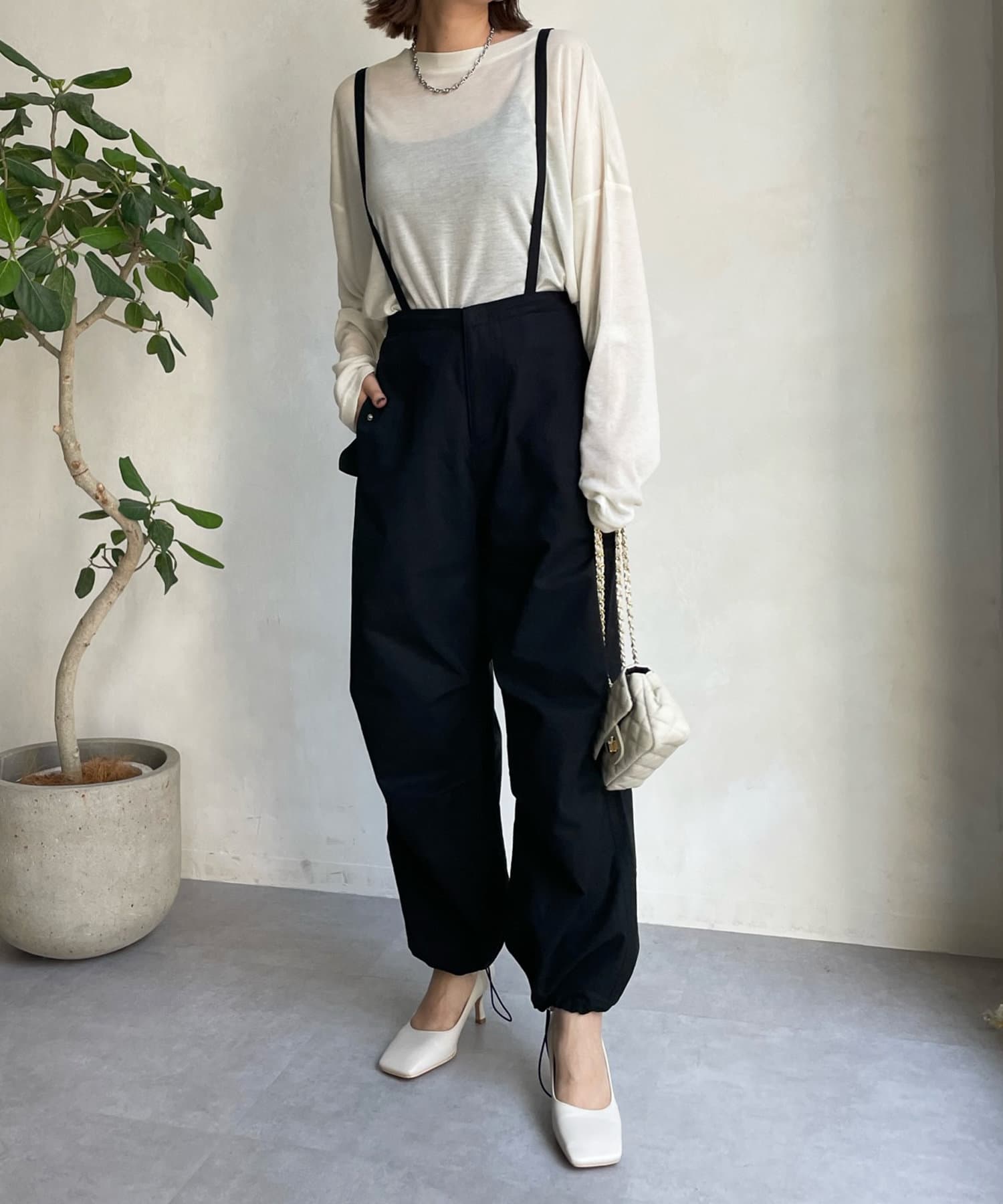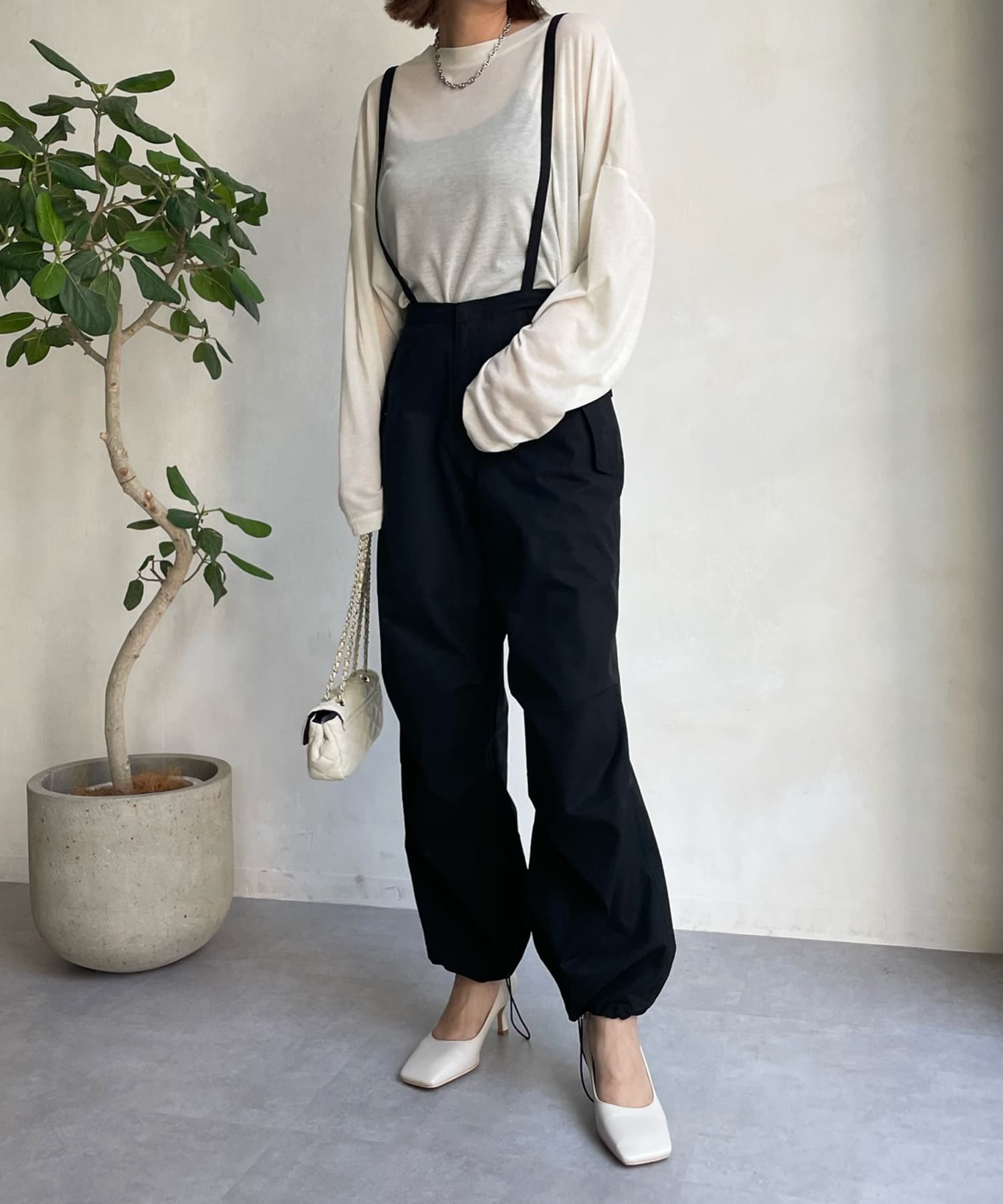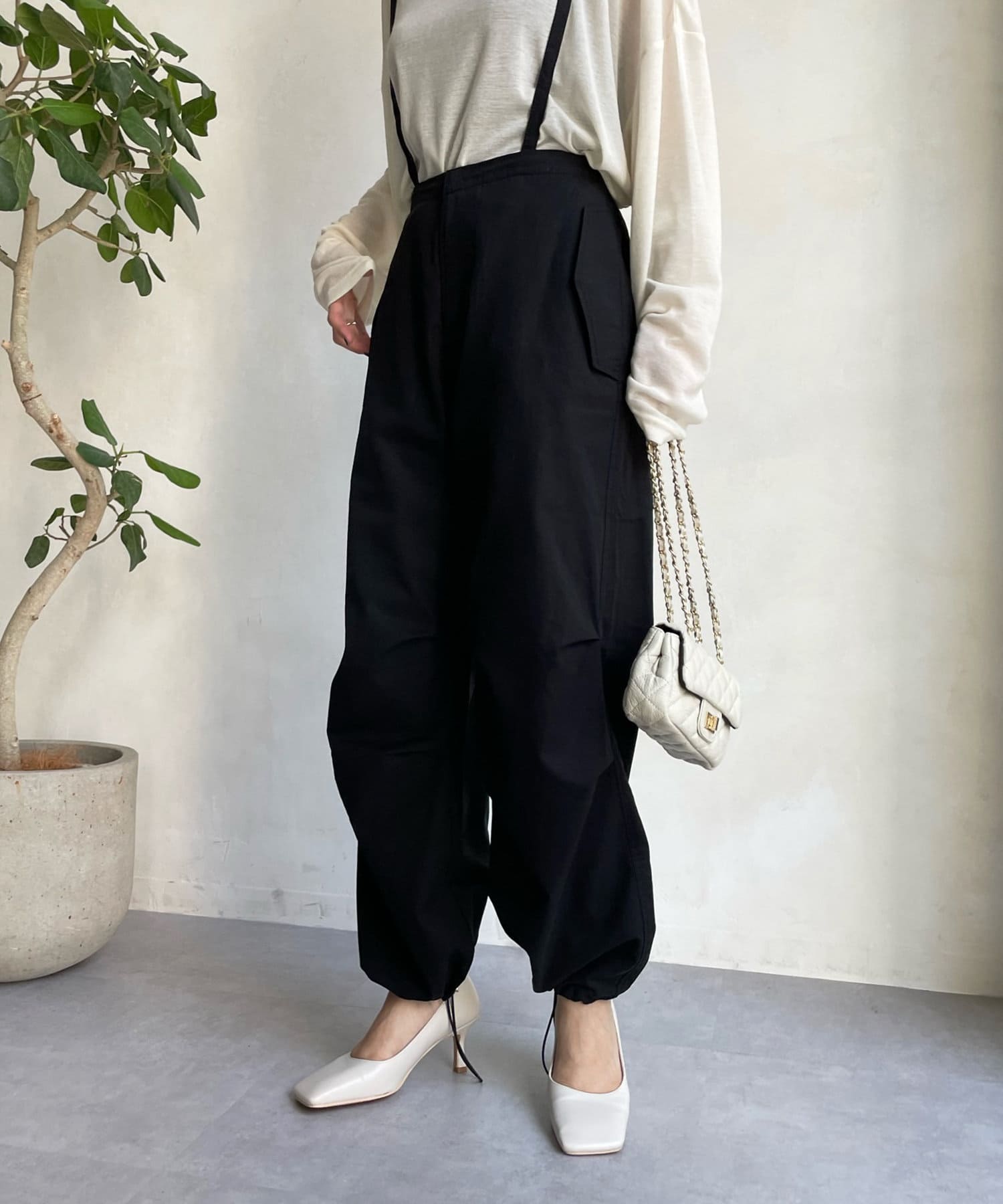 膝部分に施したタックがボリューム感を作るポイント。思いっきりワイドなシルエットでスポーティーなムードながらも、少しマットな素材感やサスペンダーを付けたデザインでおしゃれさを演出する1着です。