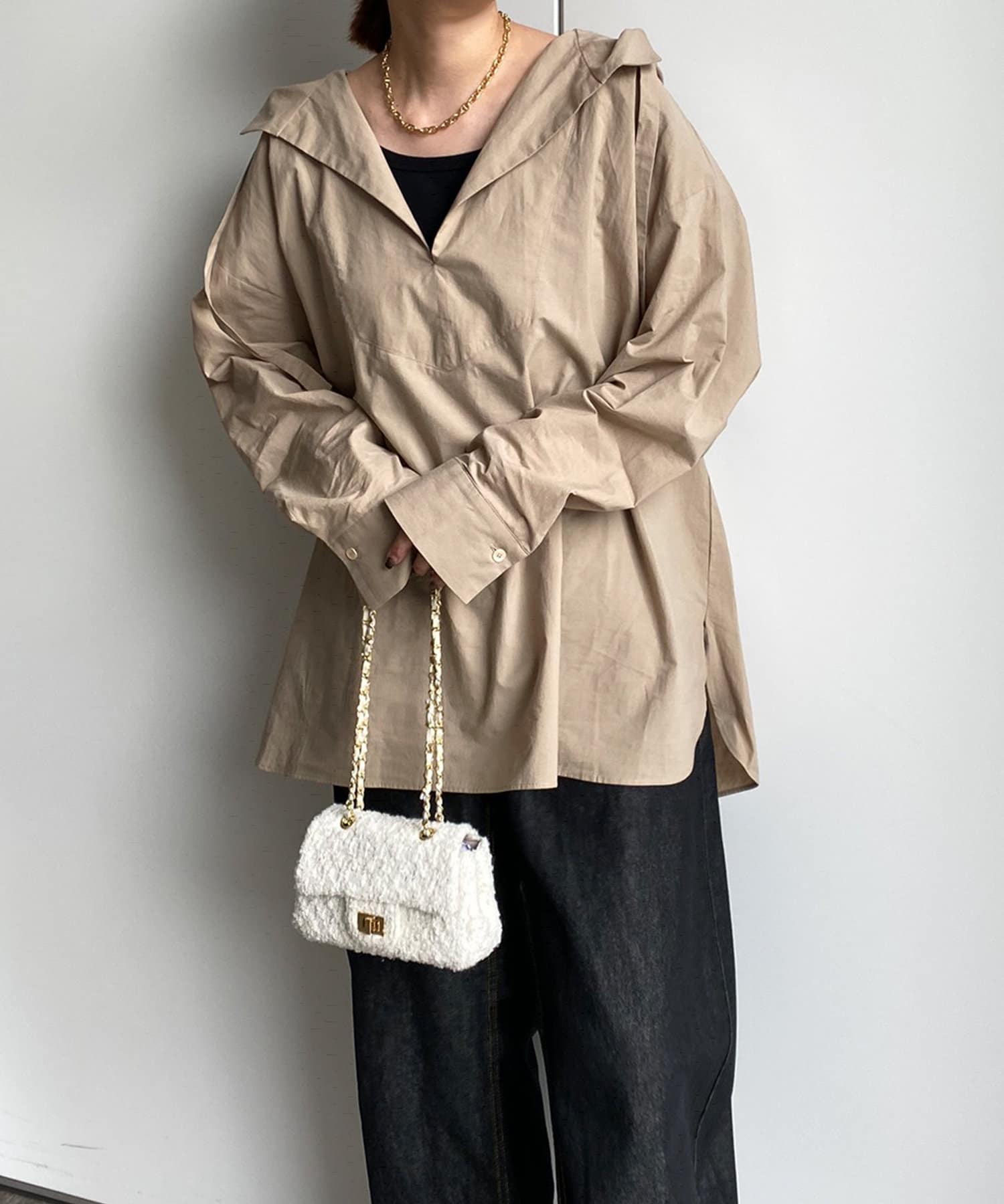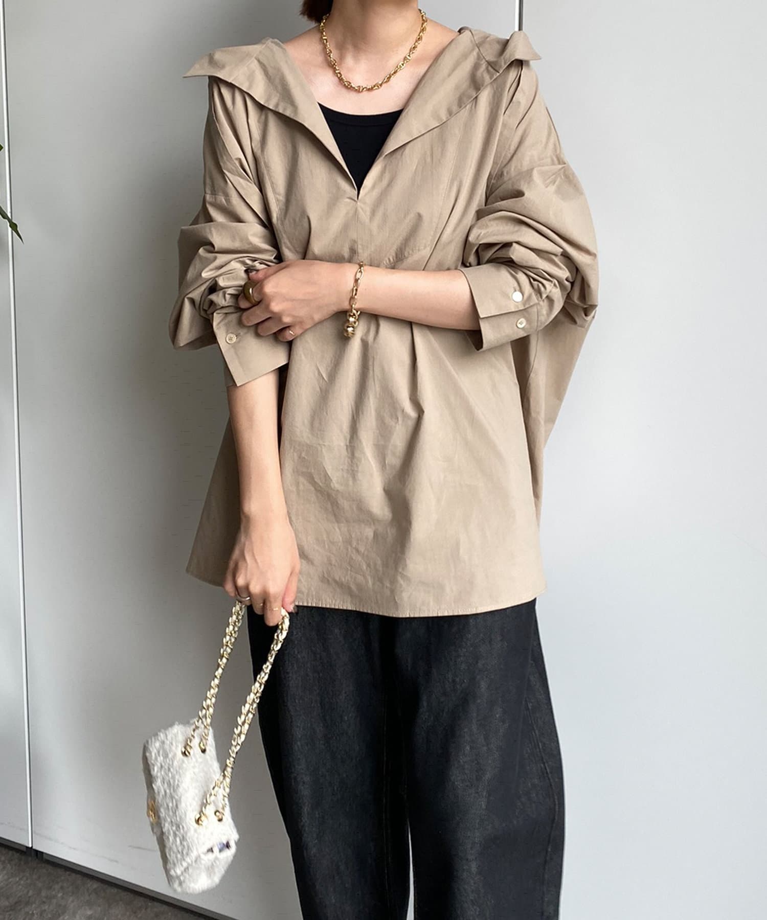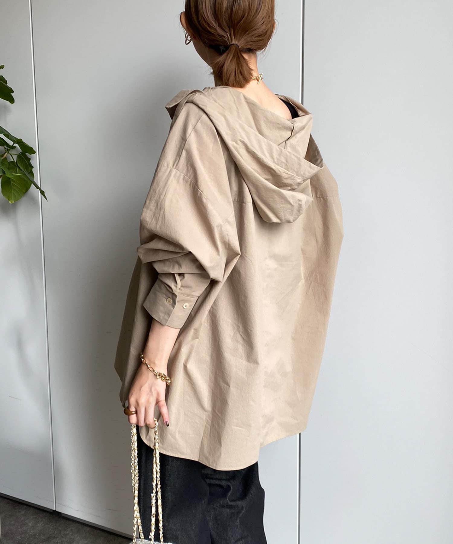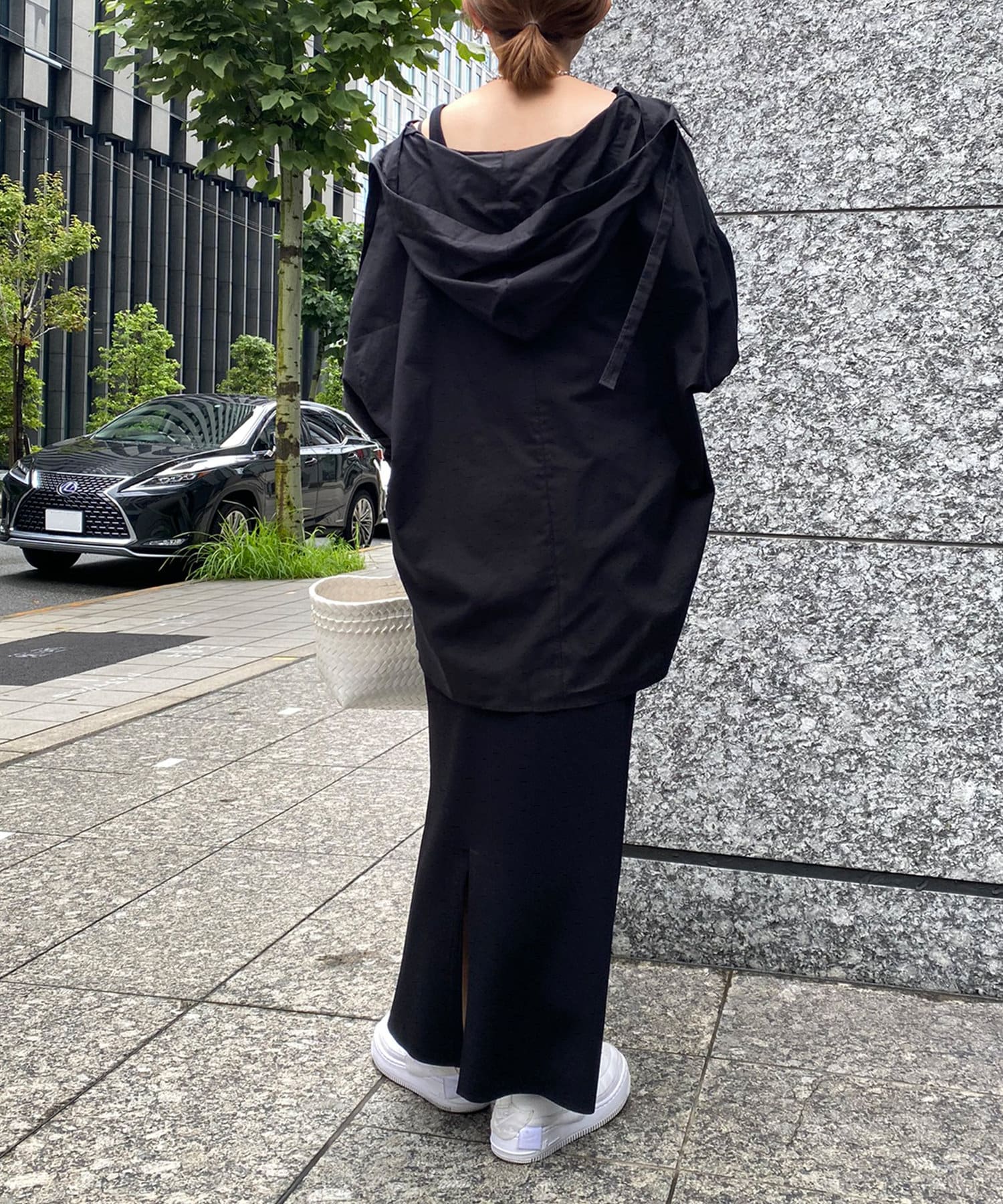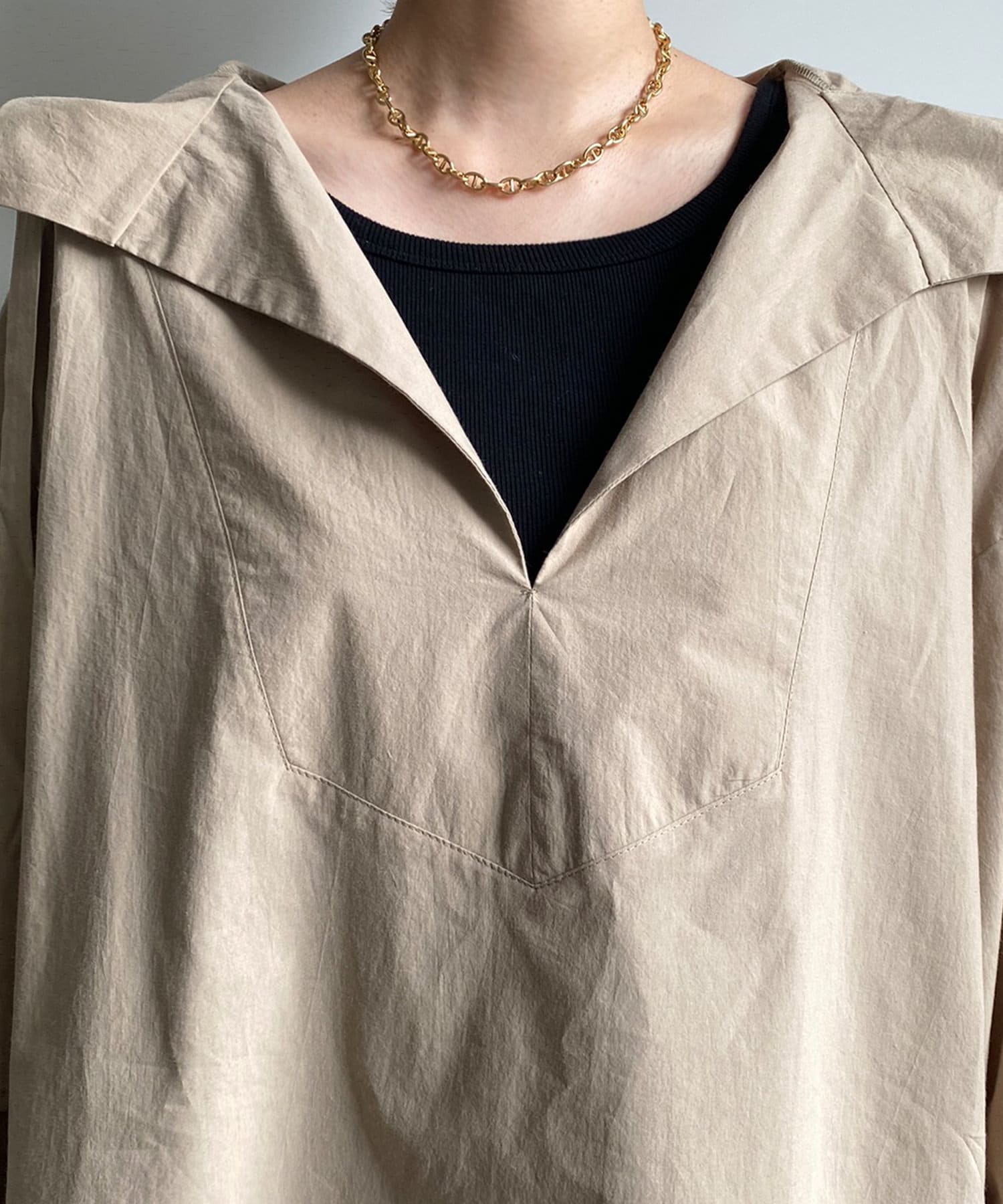 フロントはメキシカンパーカーのようなデザインになっており、ざっくりとVにカットした首元のデザインがお顔周りをすっきりと見せてくれるポイントに。