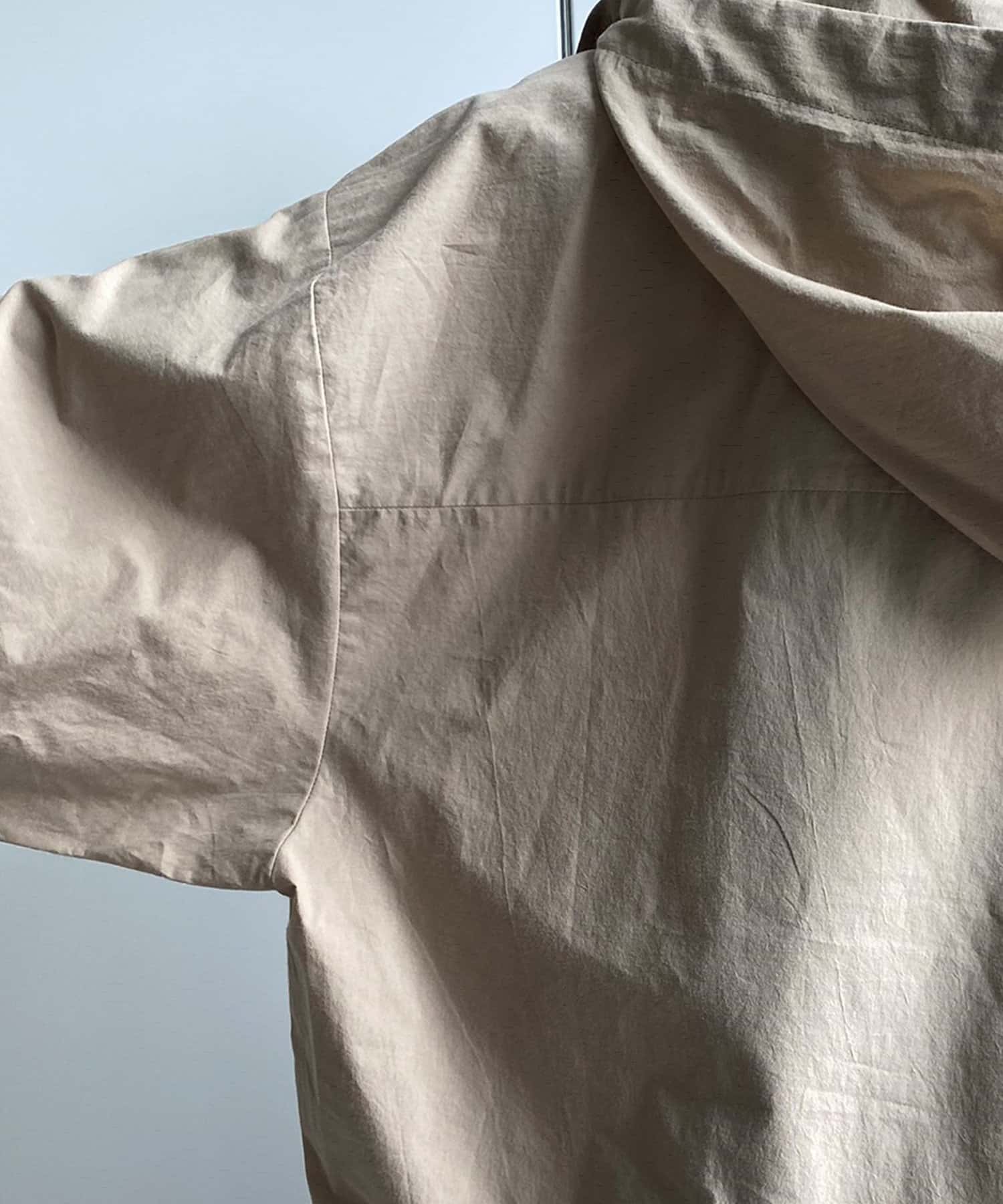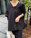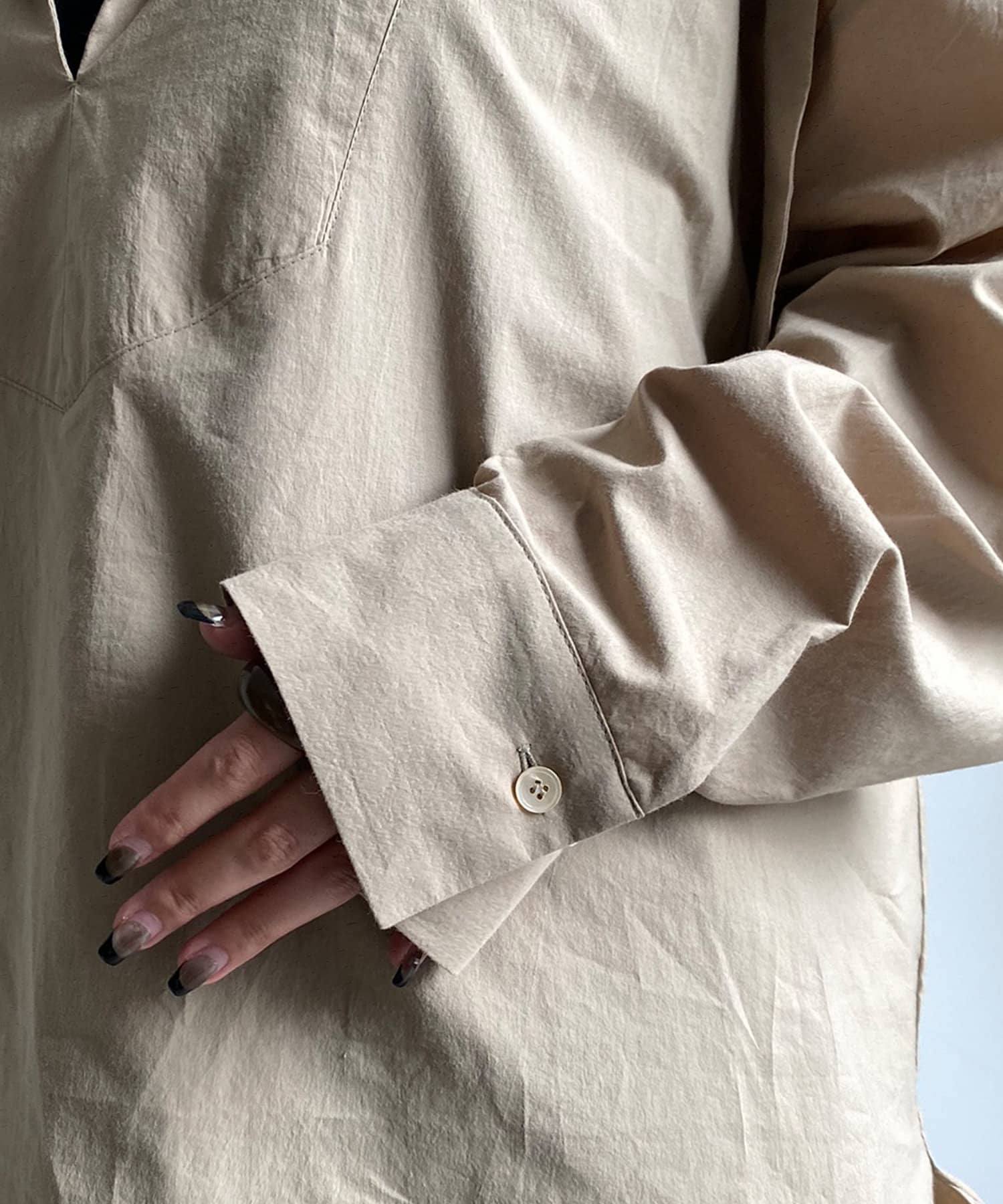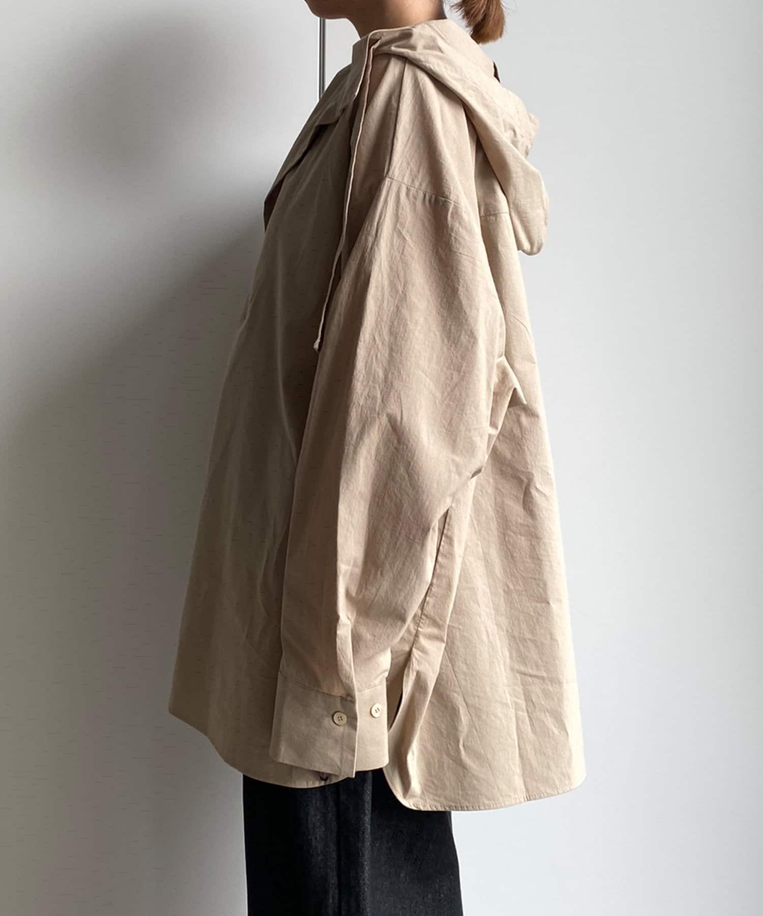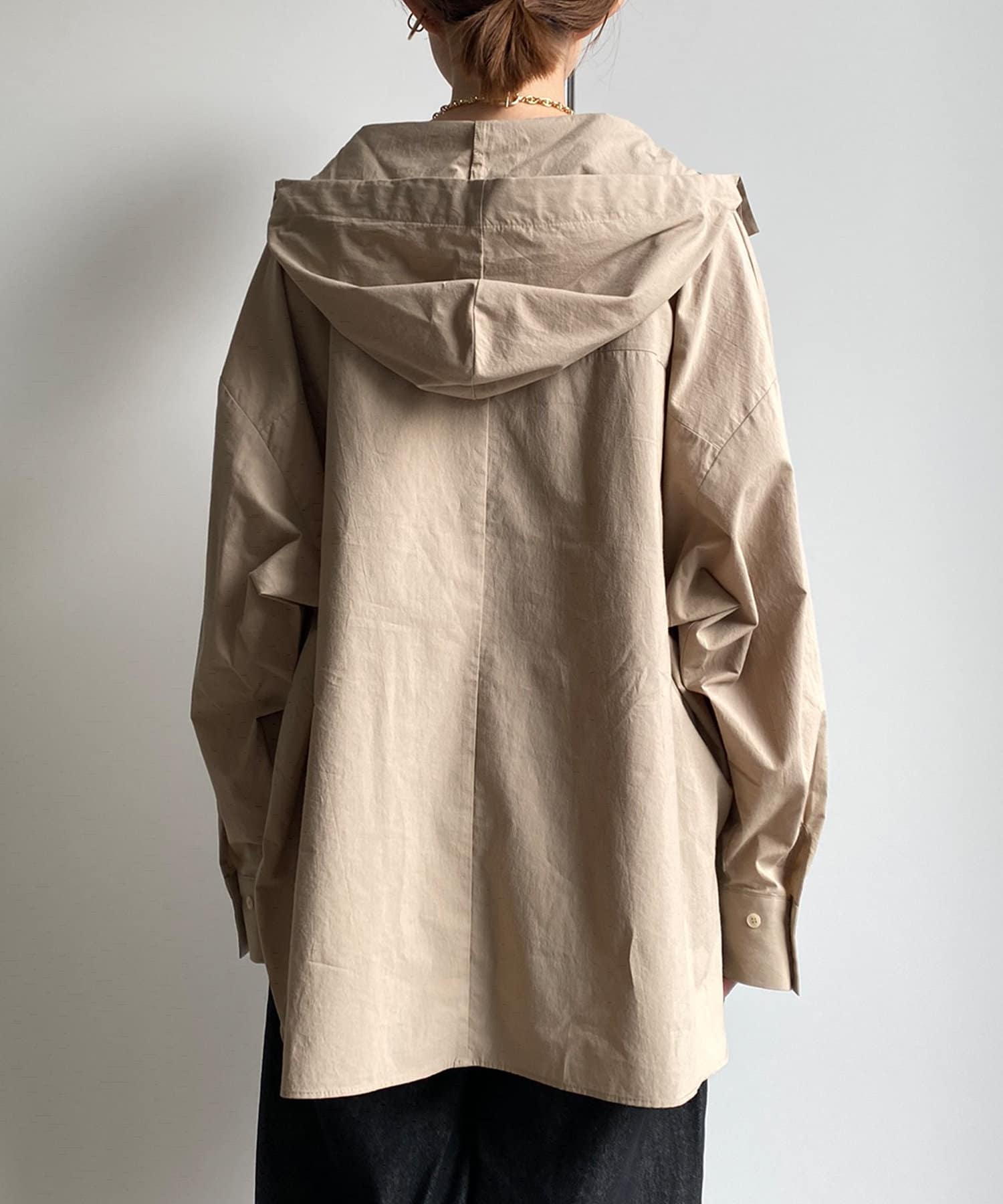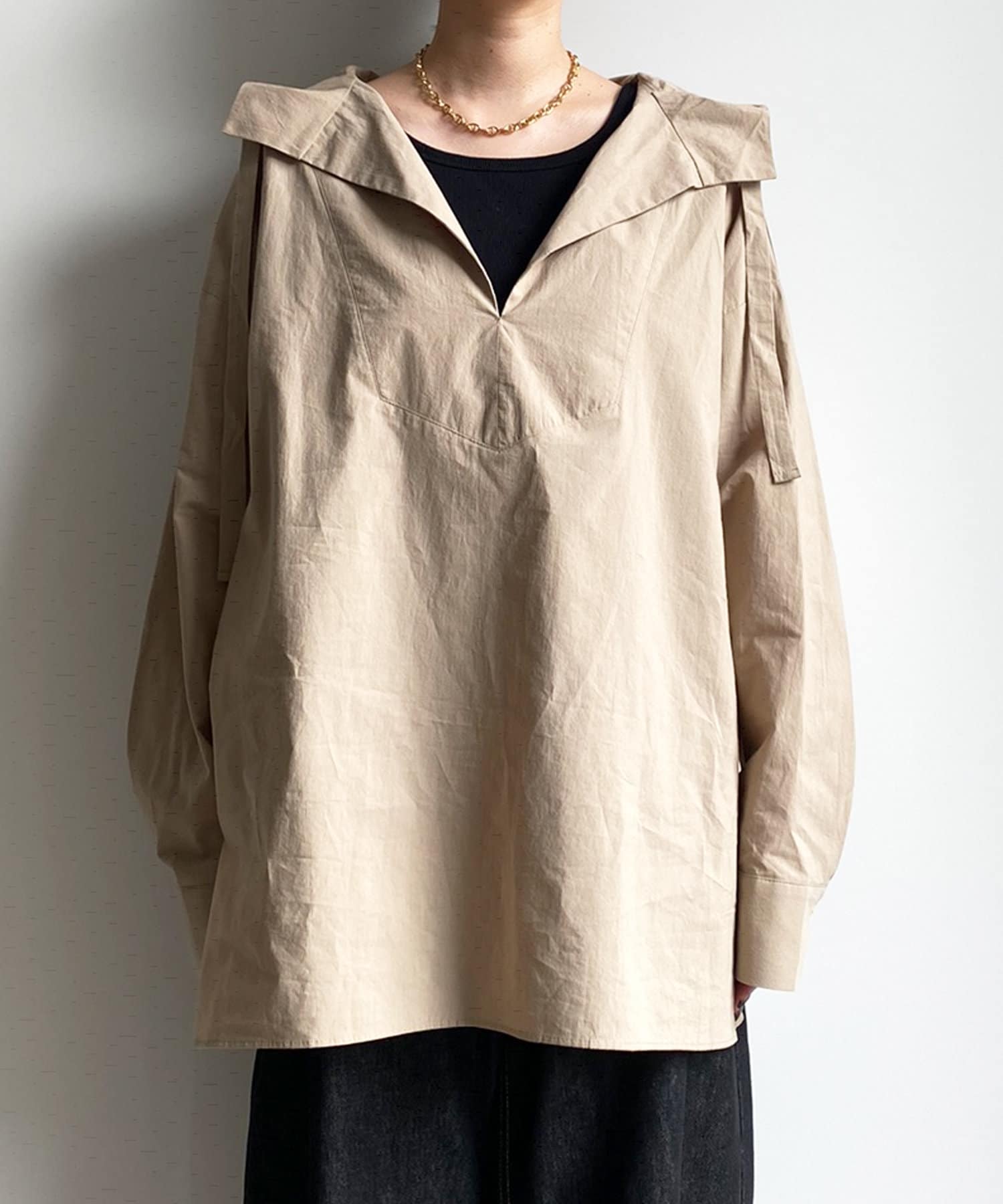 フロントはメキシカンパーカーのようなデザインになっており、ざっくりとVにカットした首元のデザインがお顔周りをすっきりと見せてくれるポイントに。