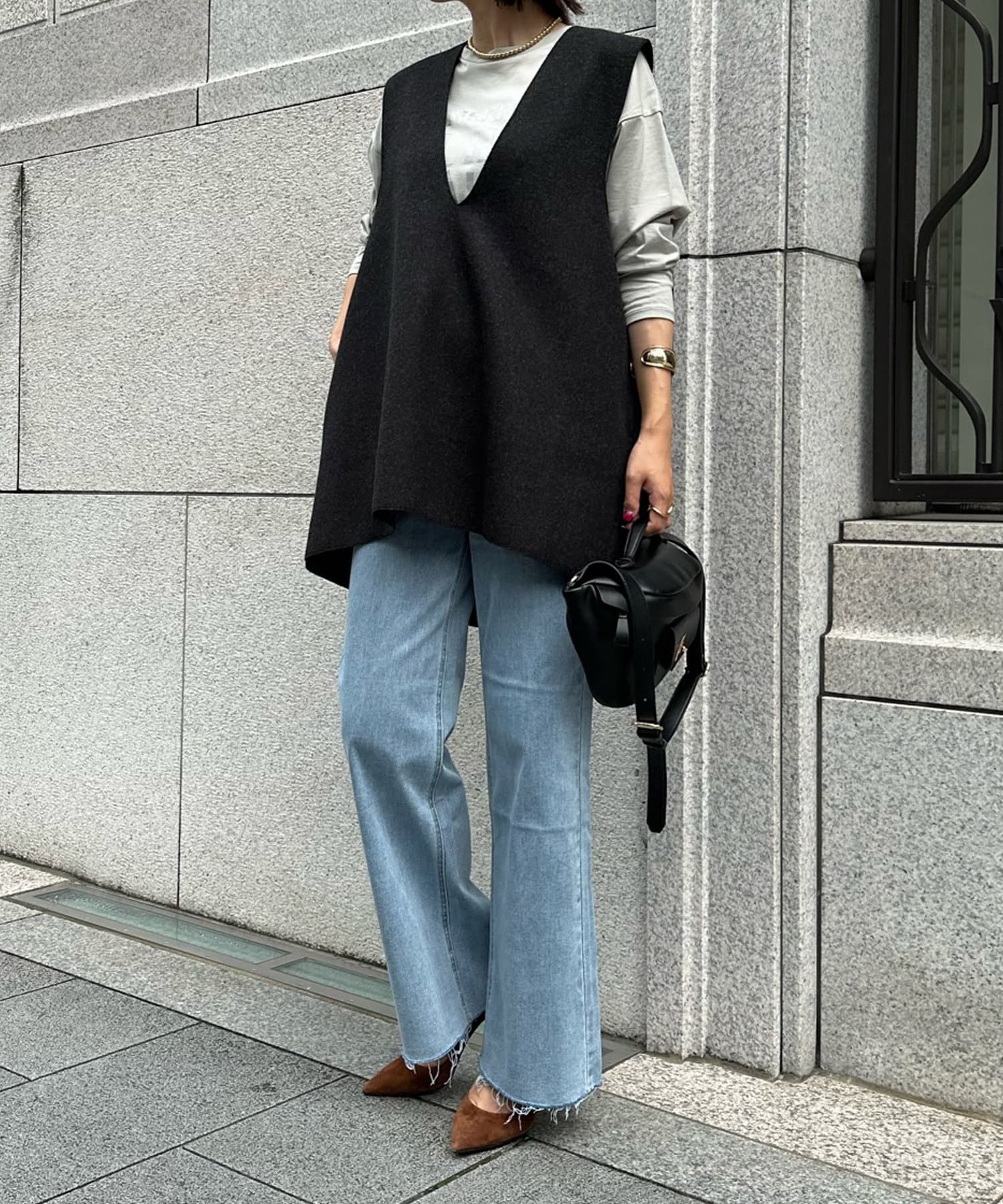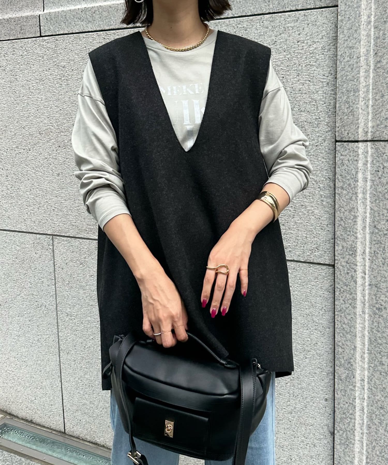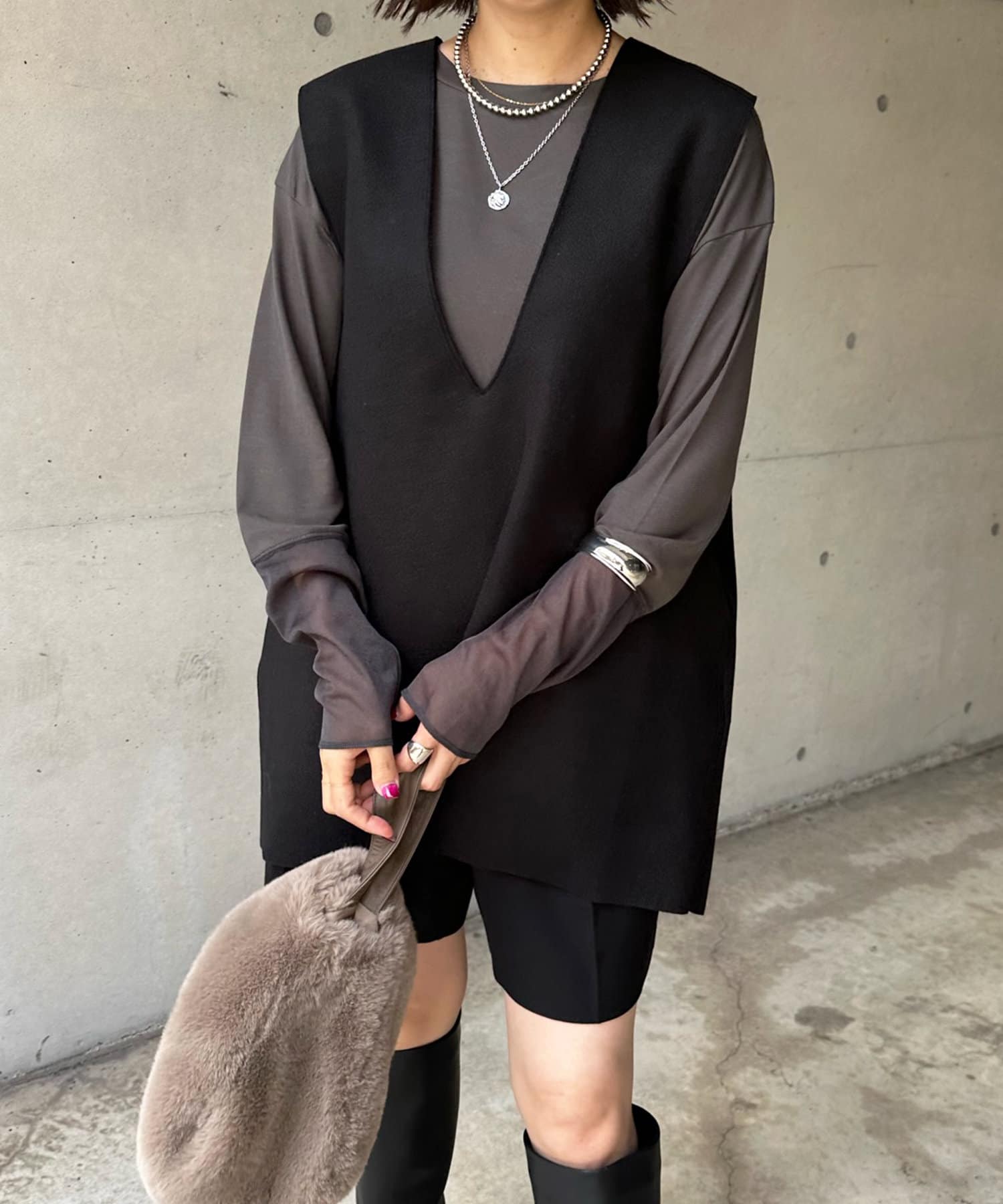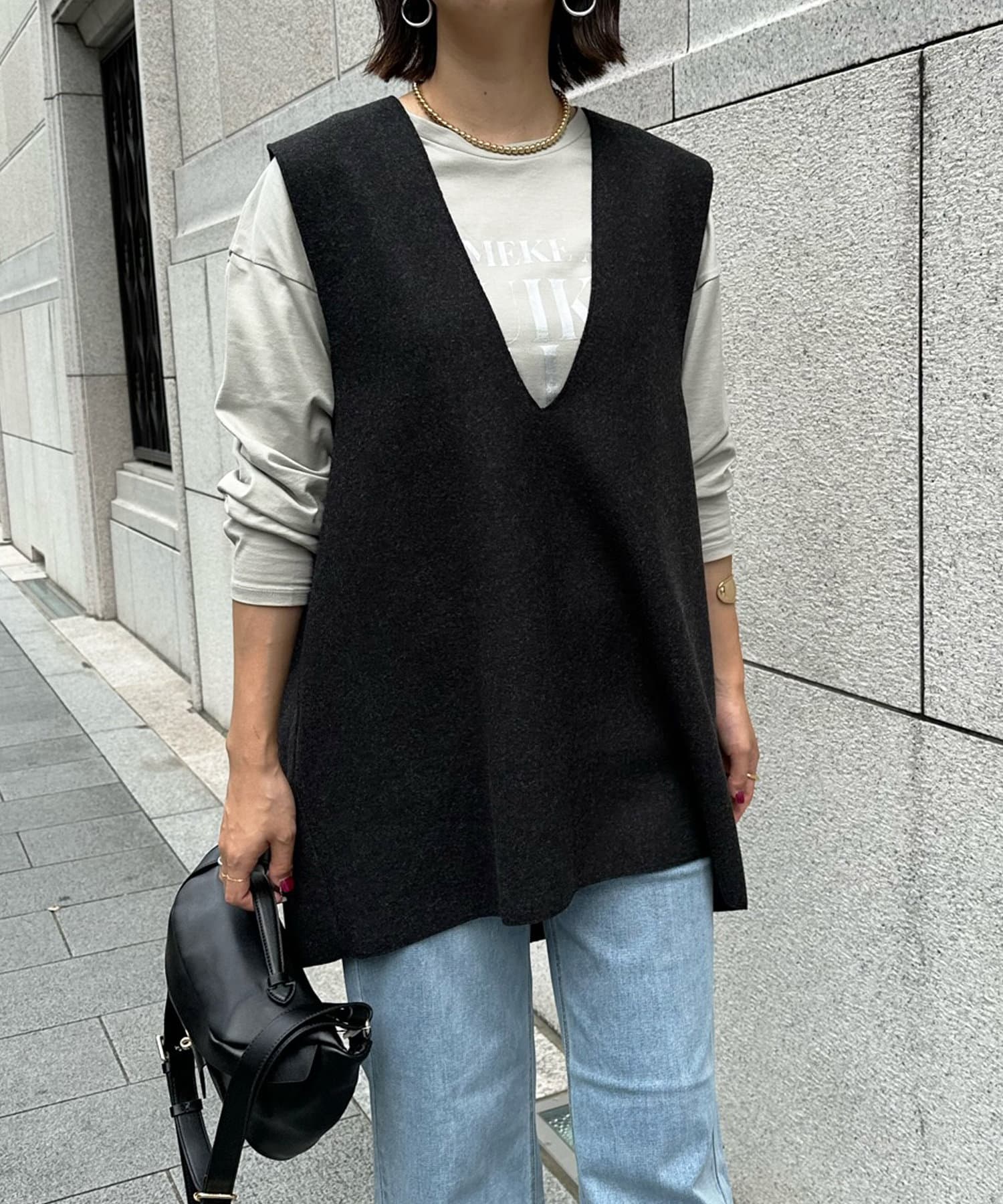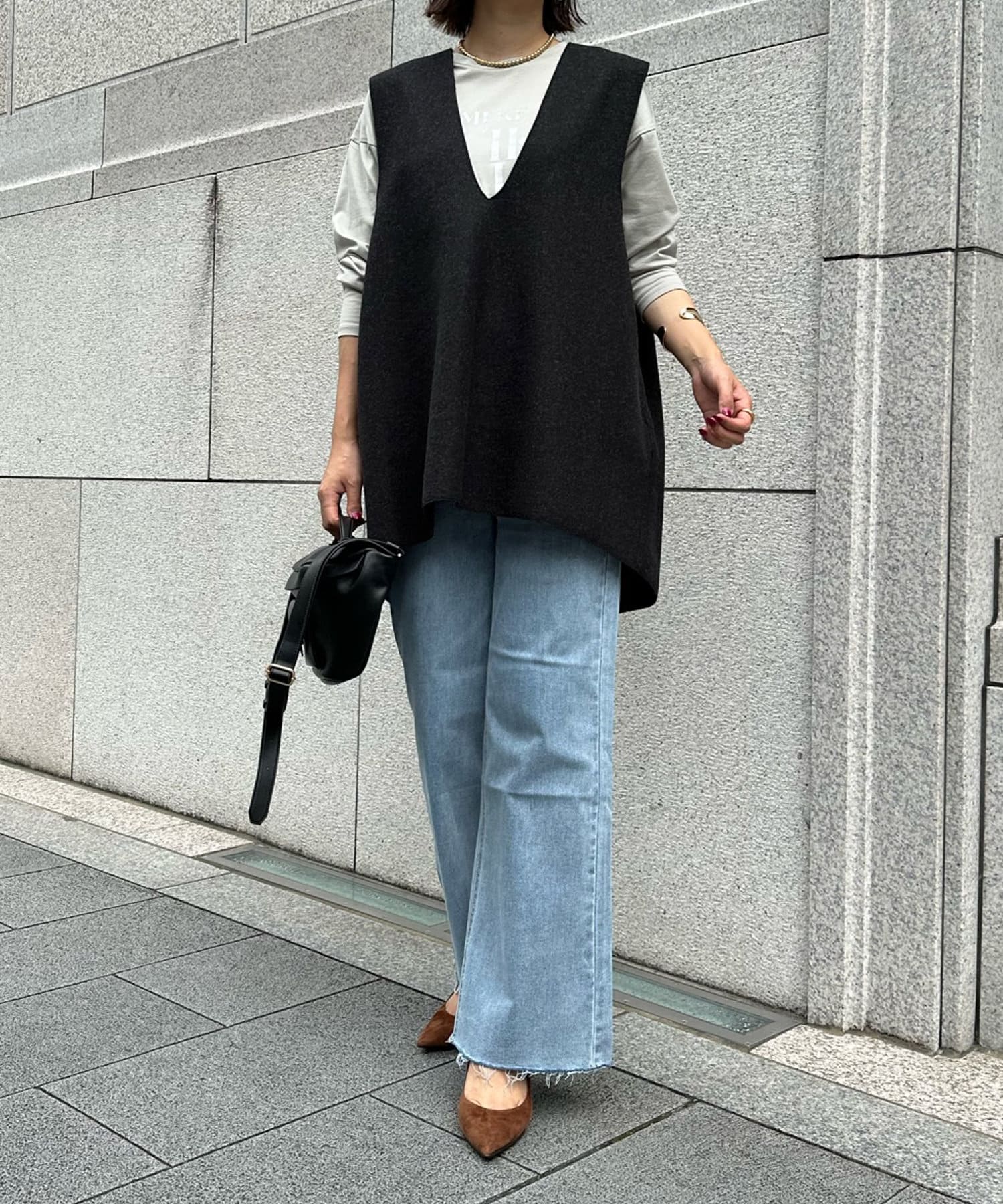 深めのVネックがレイヤードした時におしゃれに魅せてくれるポイント。カットソーやブラウスのレイヤードにはもちろん寒い時期にはアウターの下に忍ばせたりとロングシーズン活躍してくれます。