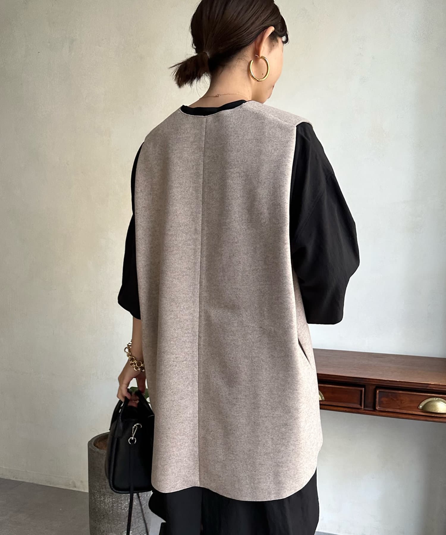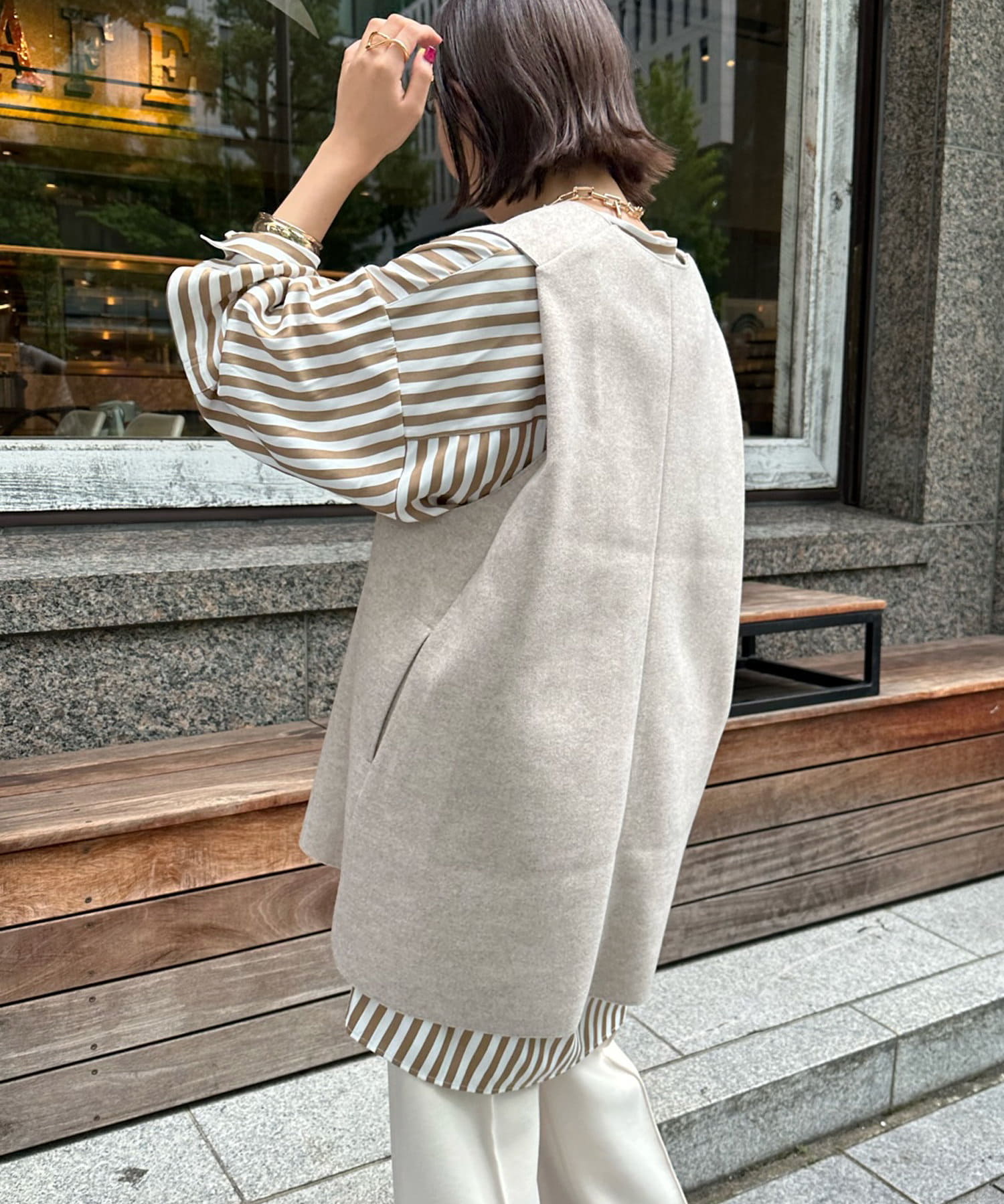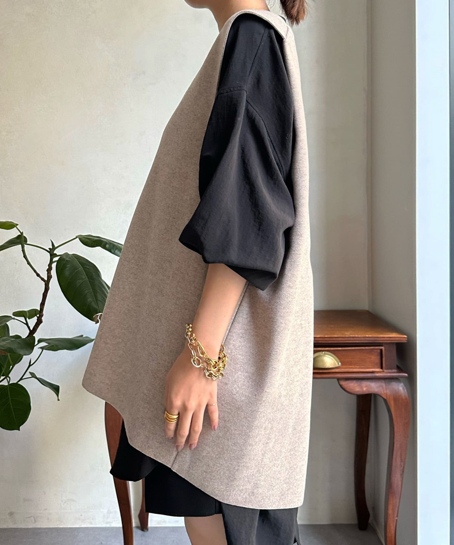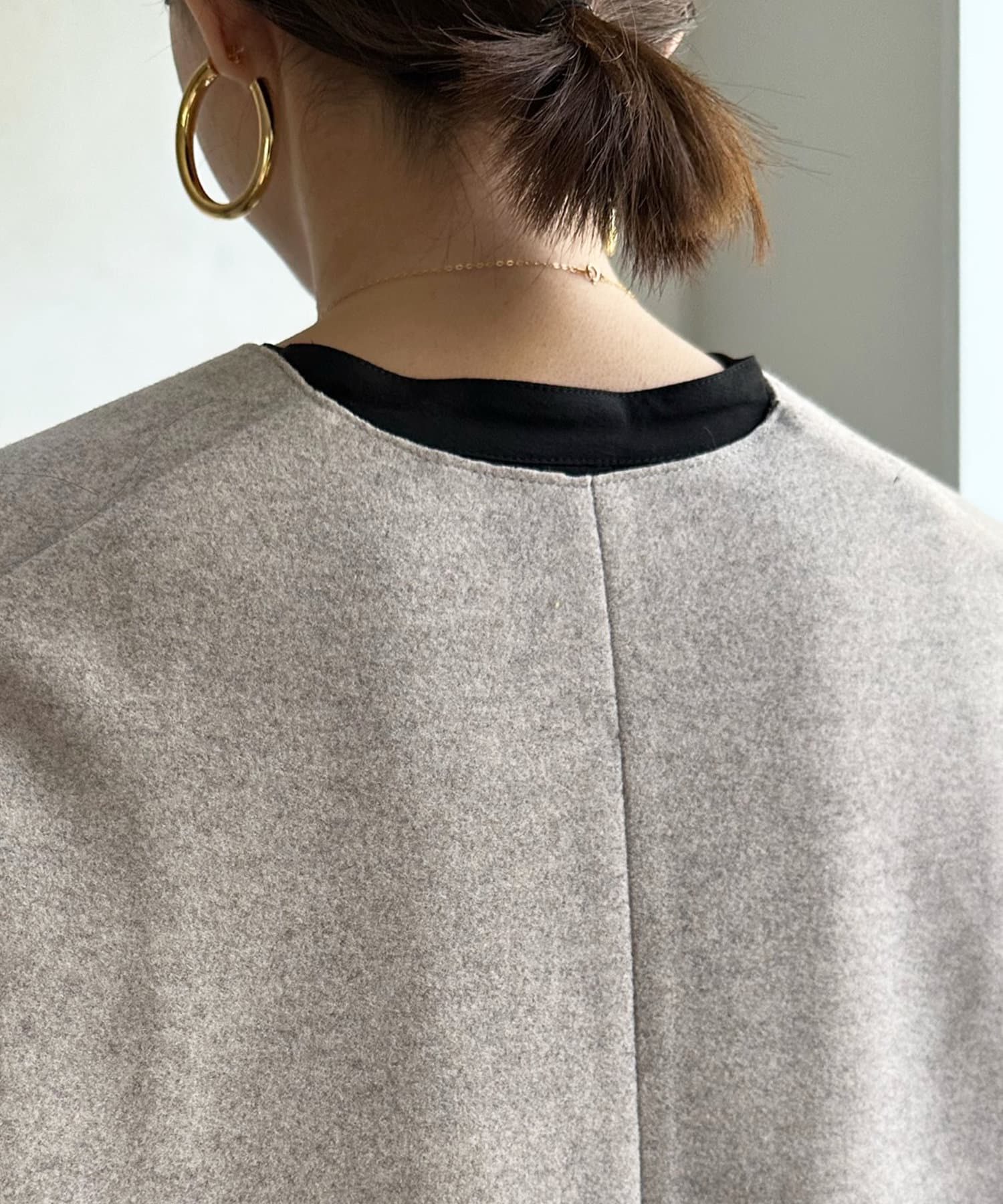 レイヤードで着用したい、おしゃれ感漂う1着。ウール調の素材を使用し、温かみのある印象に仕上げました。