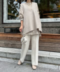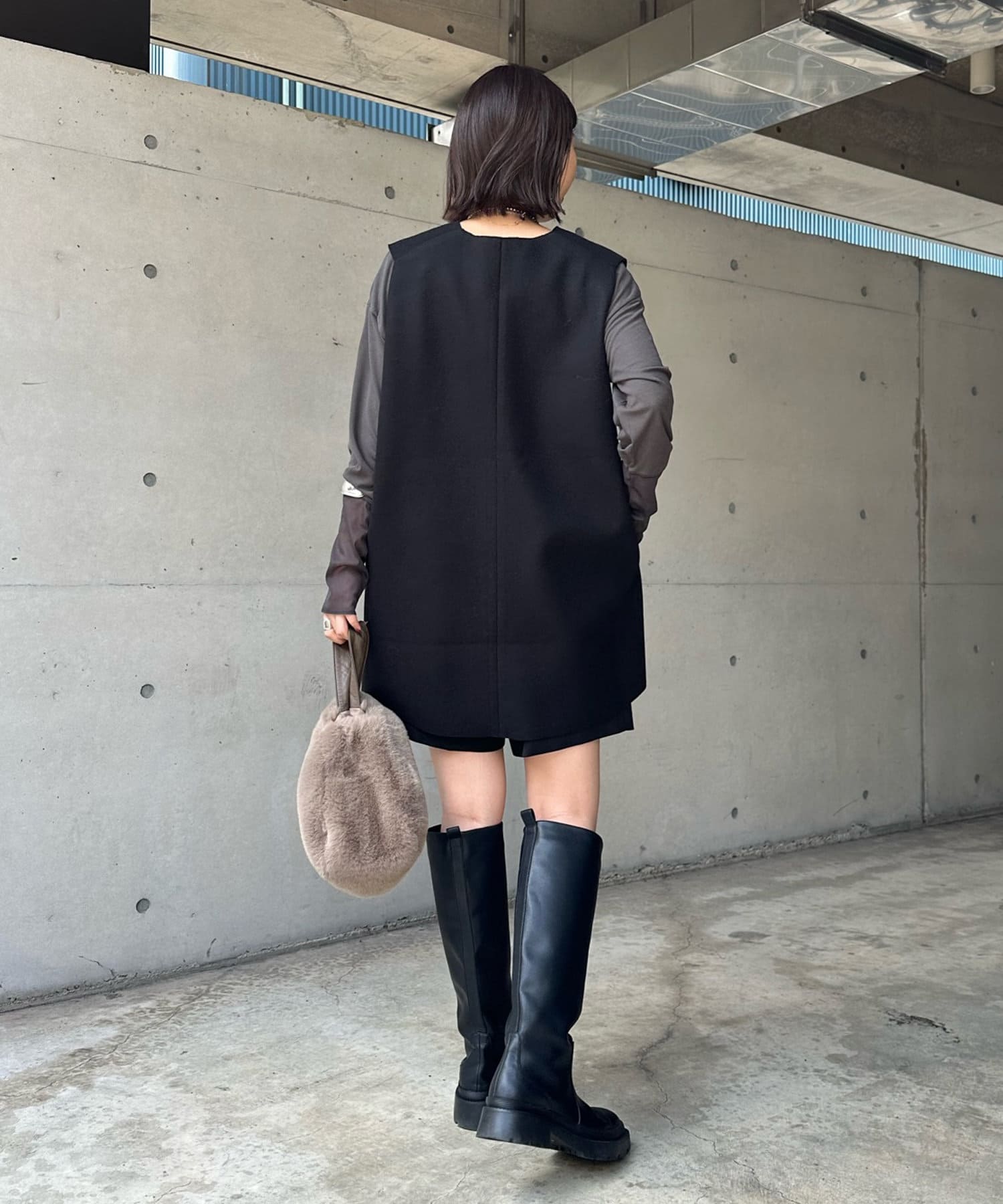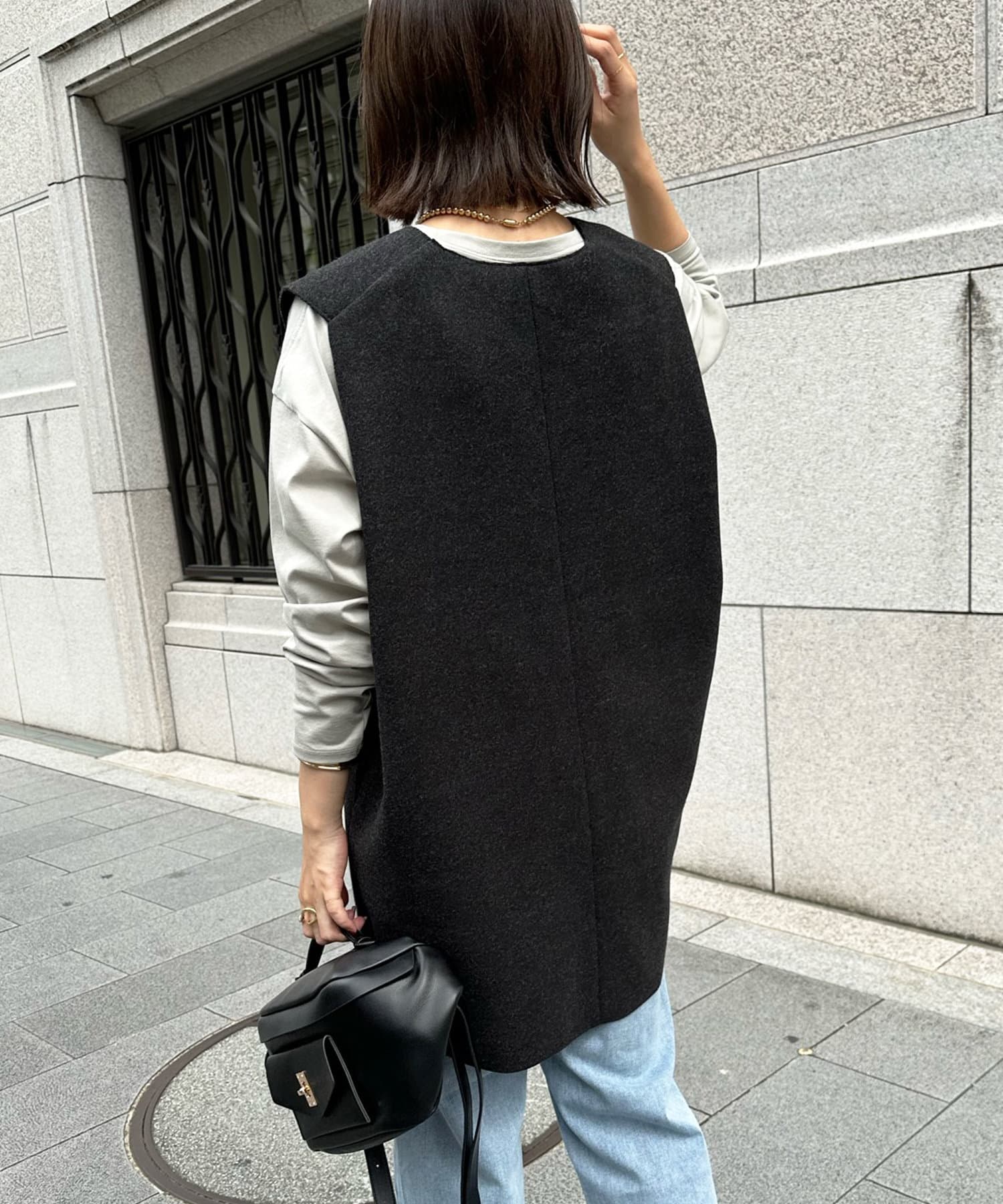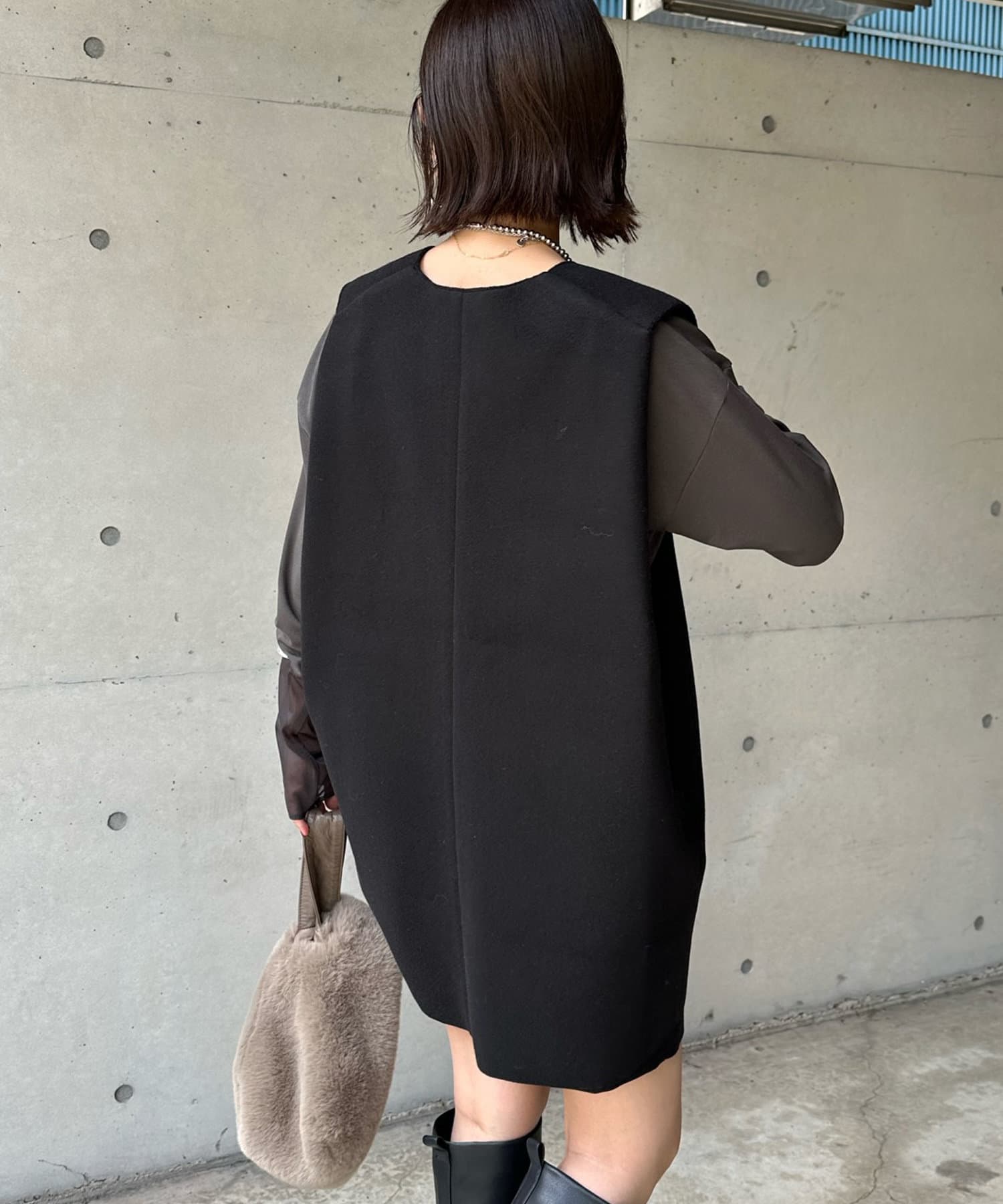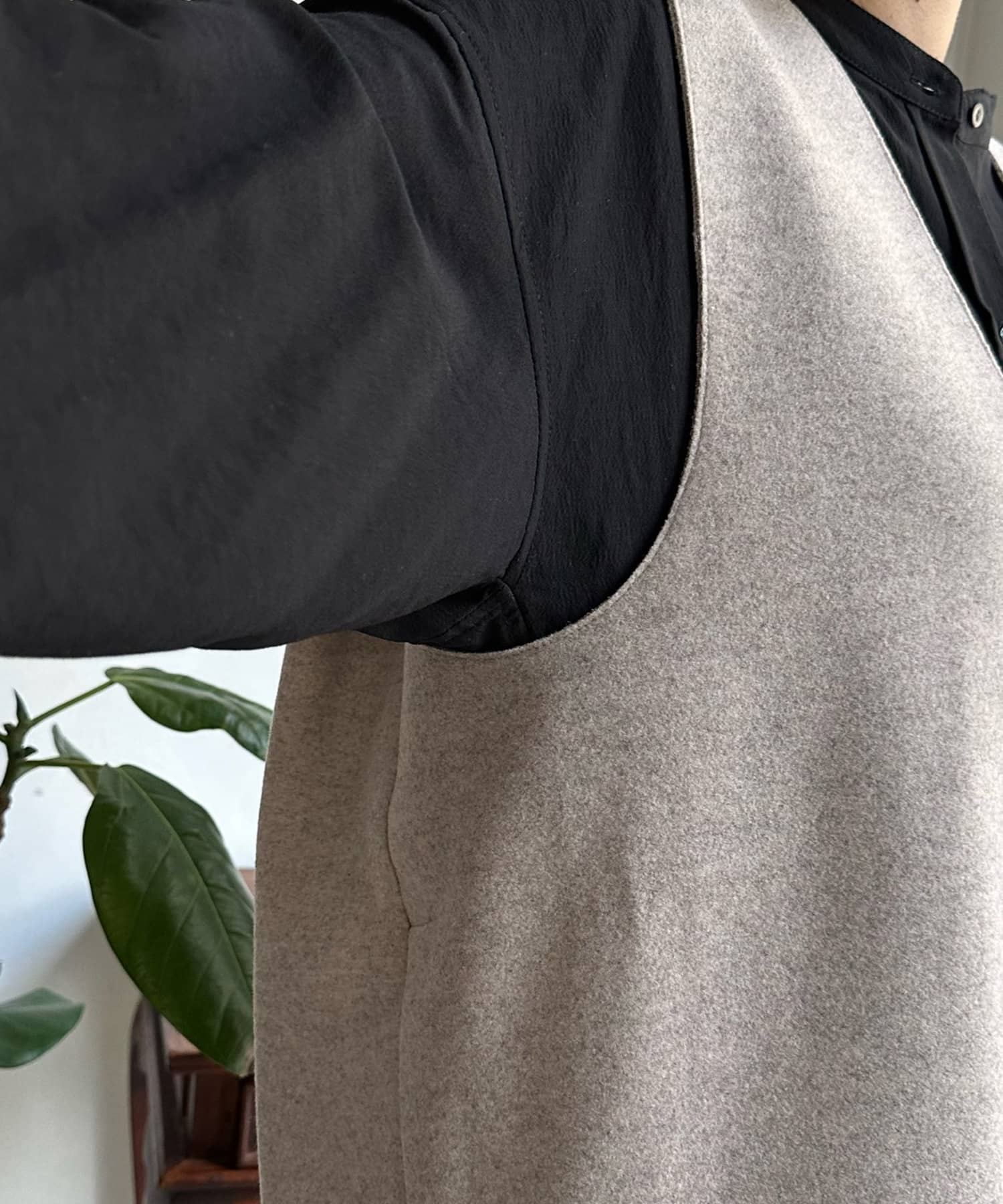 レイヤードで着用したい、おしゃれ感漂う1着。ウール調の素材を使用し、温かみのある印象に仕上げました。