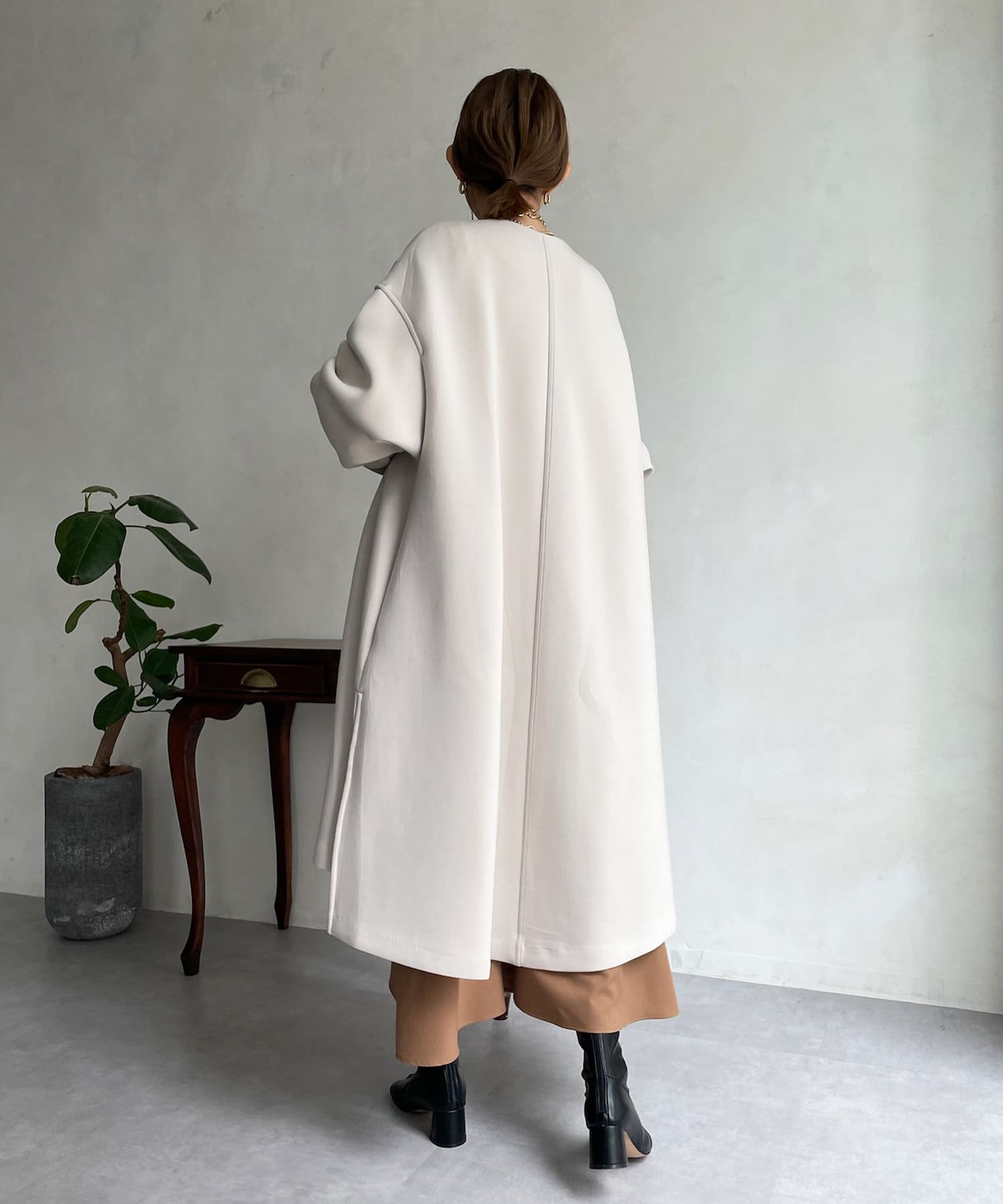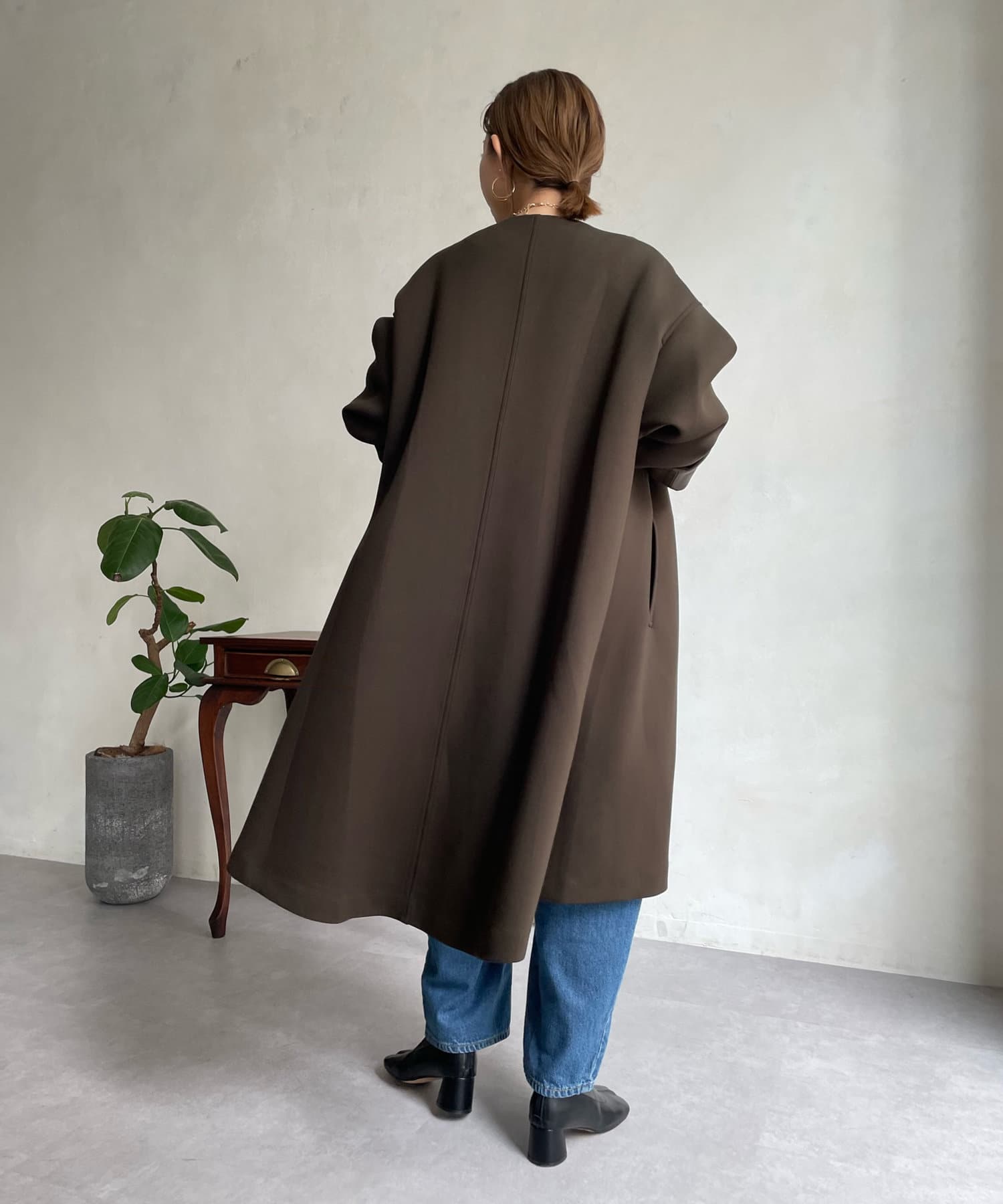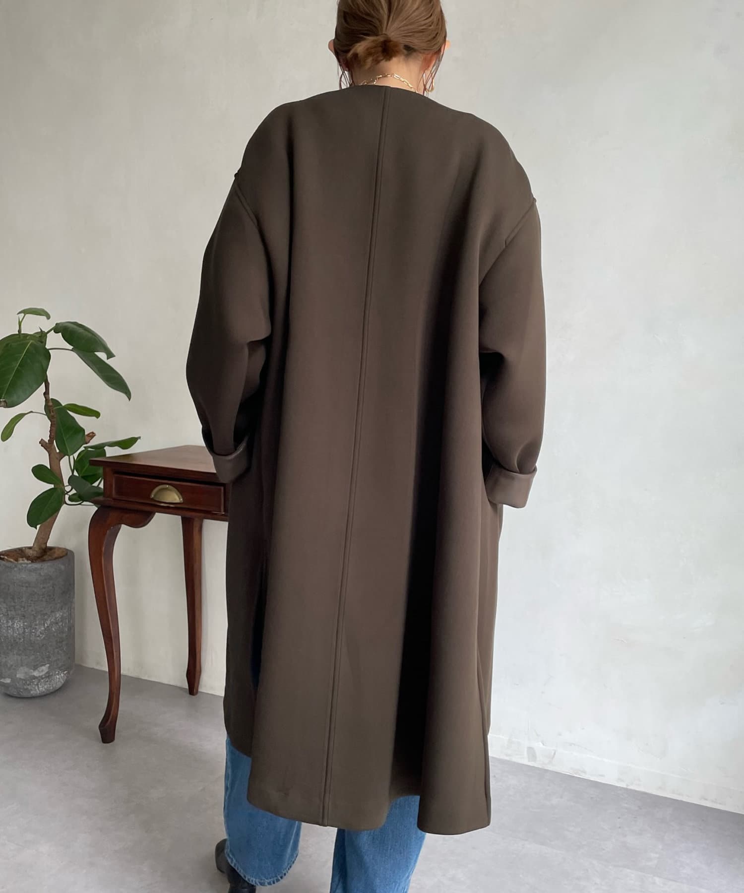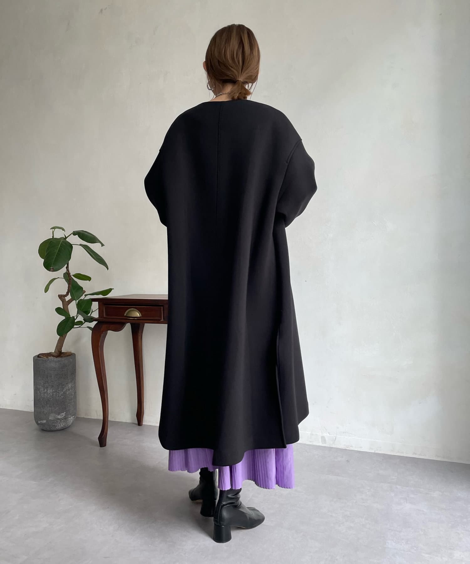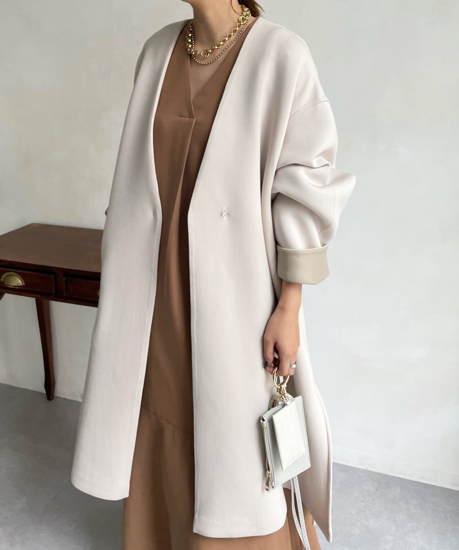 首元がすっきりと見えるノーカラーデザインに、裾にかけてAラインに広がるシルエットで、女性らしさをプラス。