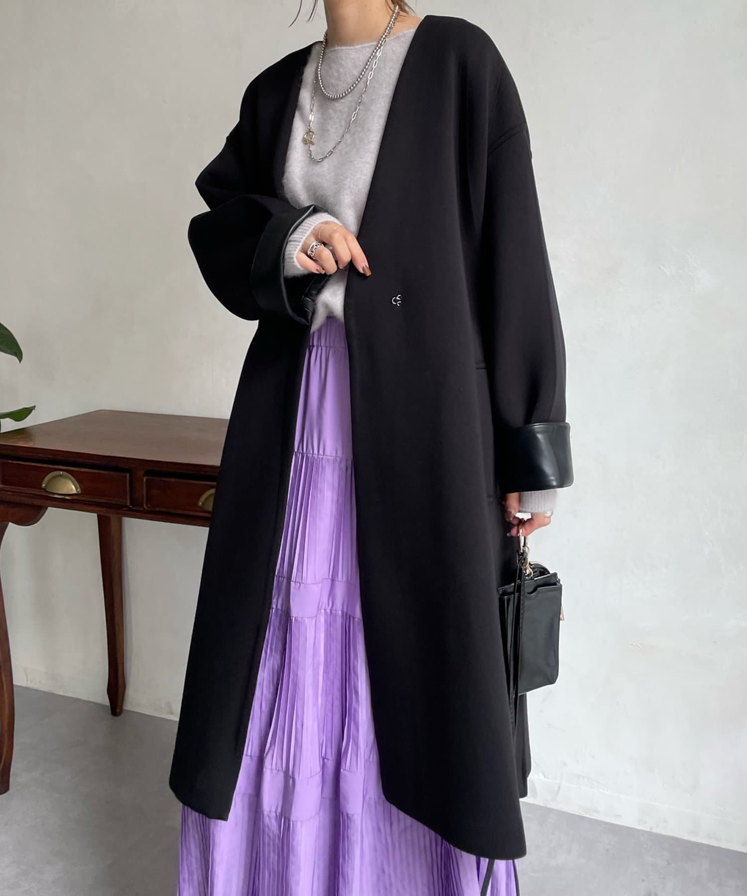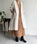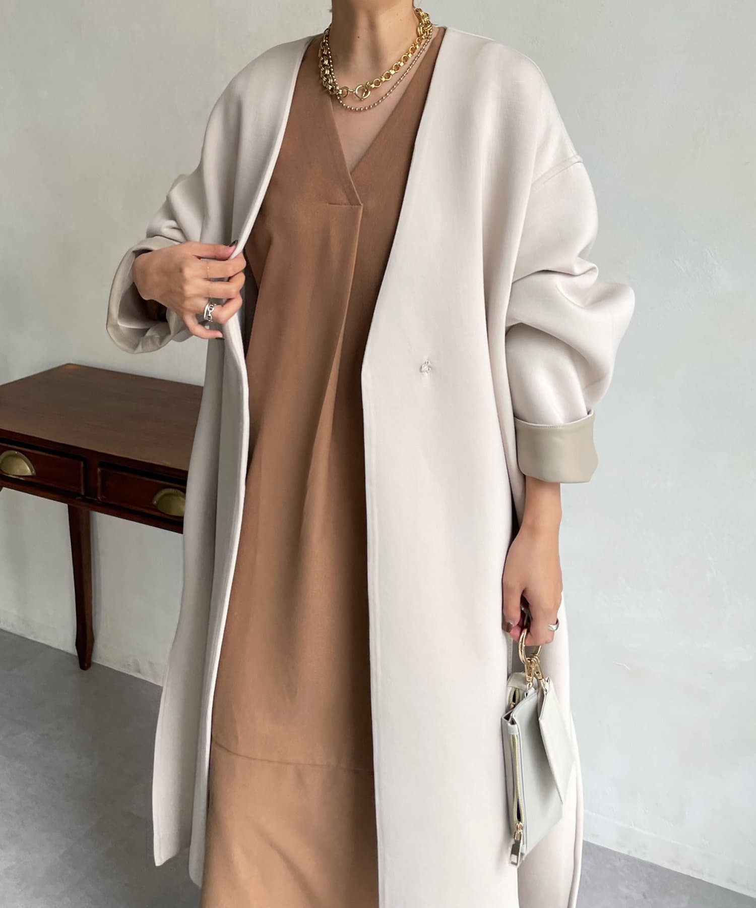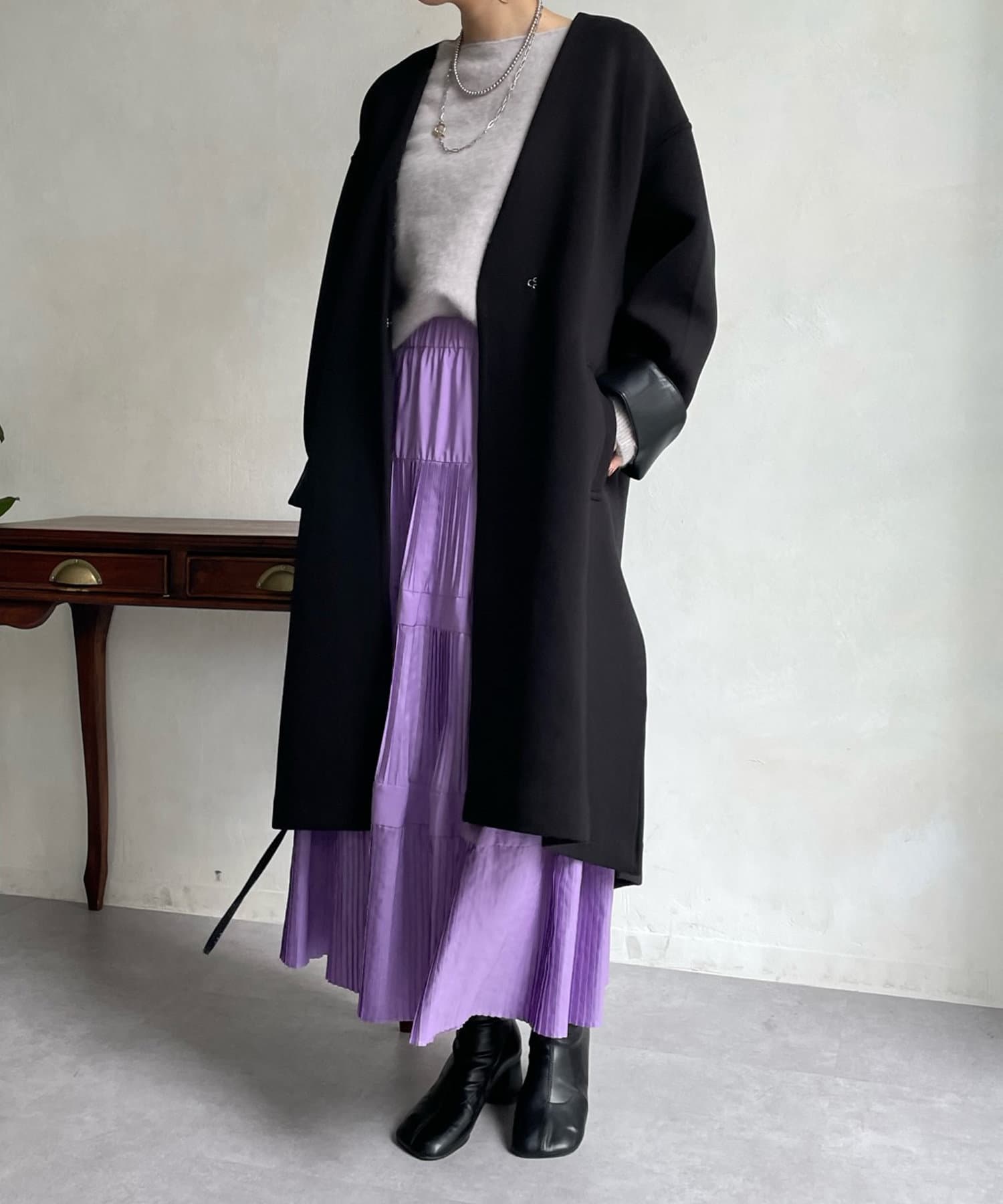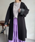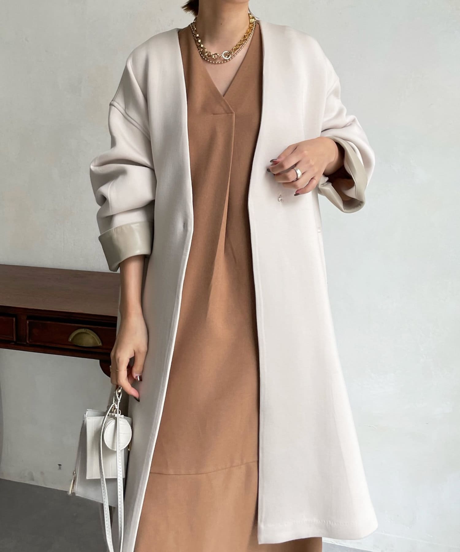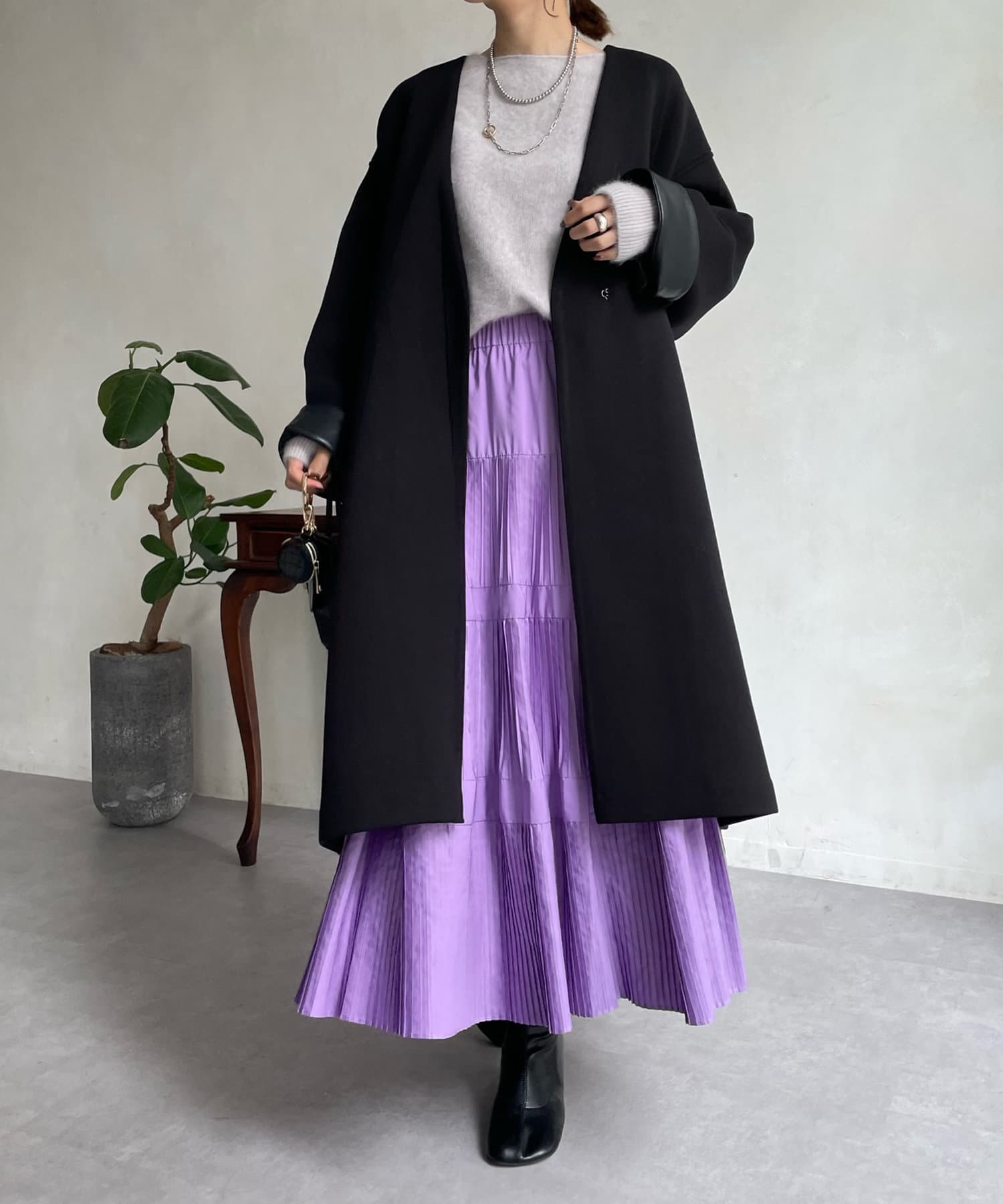 首元がすっきりと見えるノーカラーデザインに、裾にかけてAラインに広がるシルエットで、女性らしさをプラス。