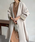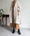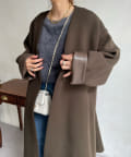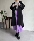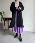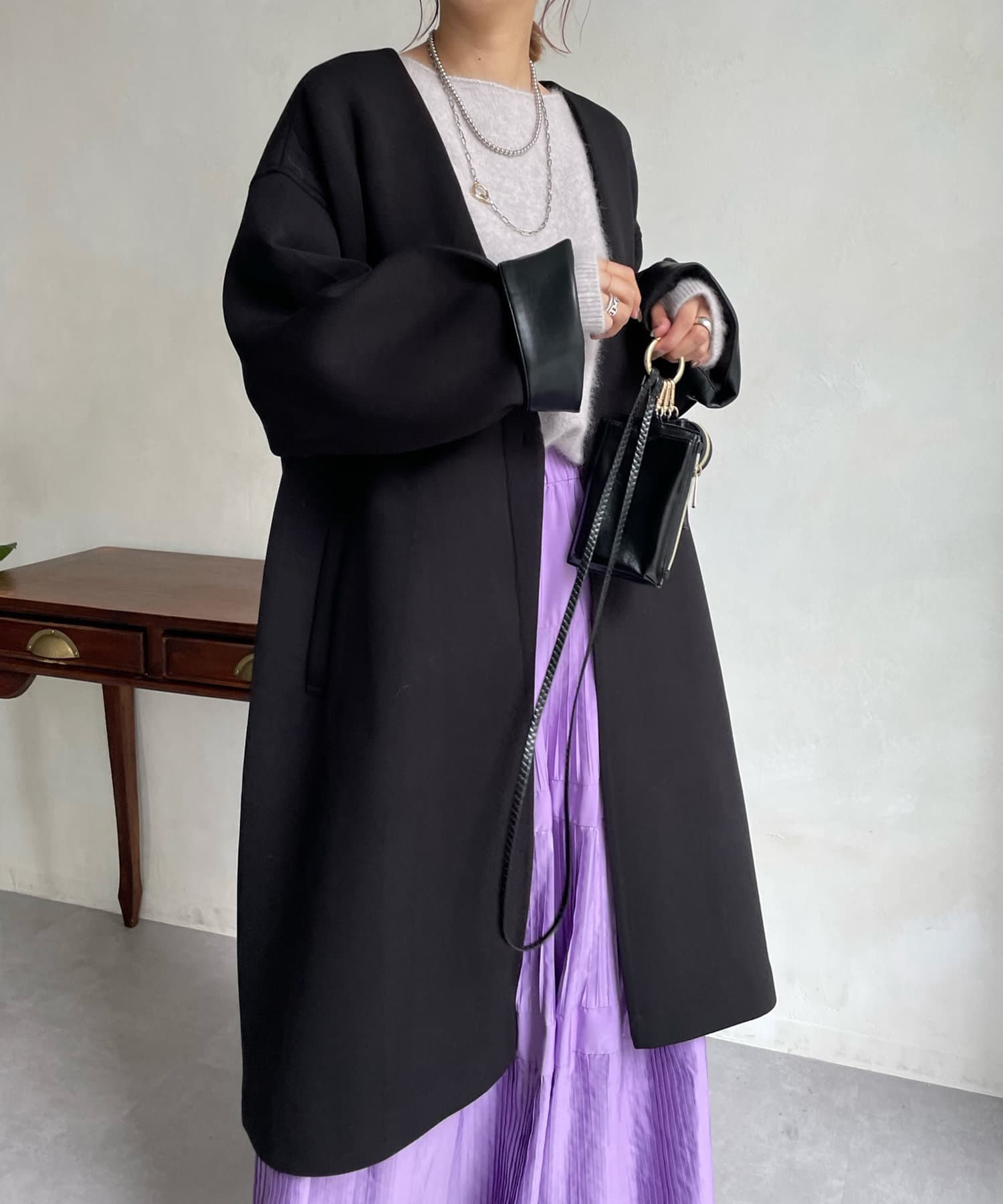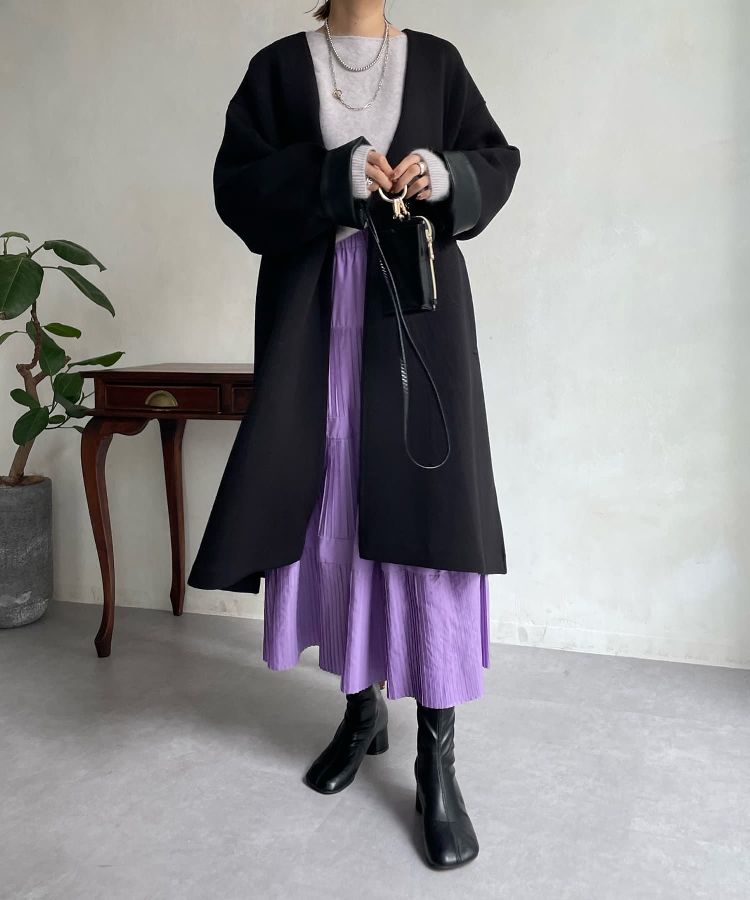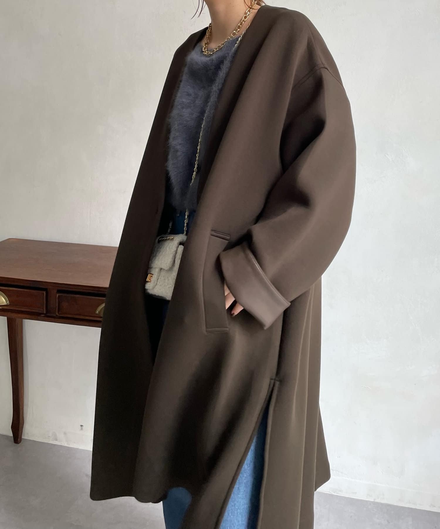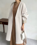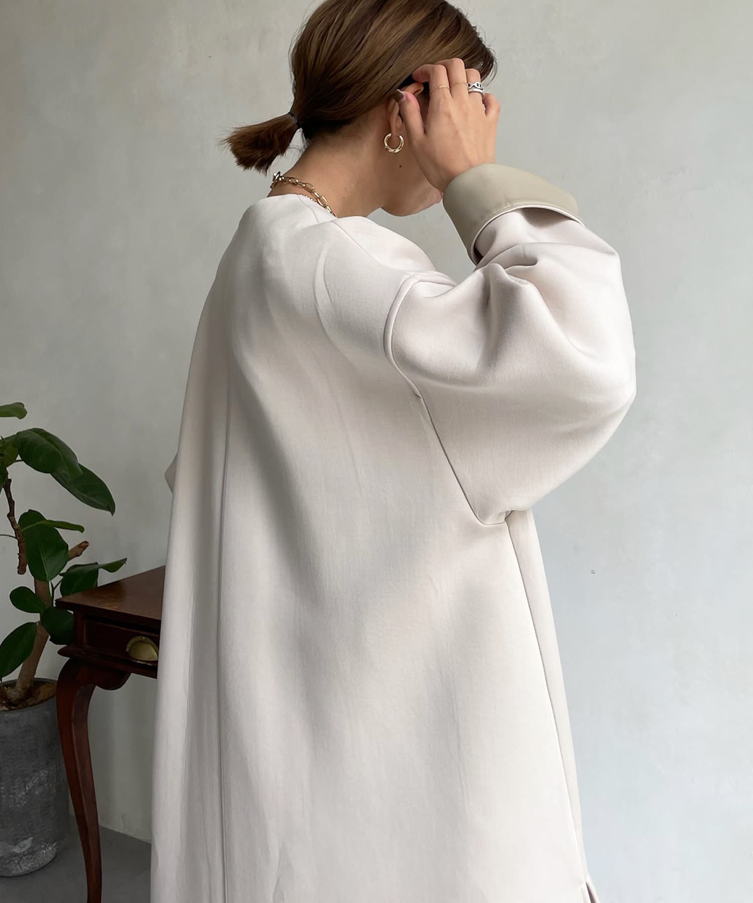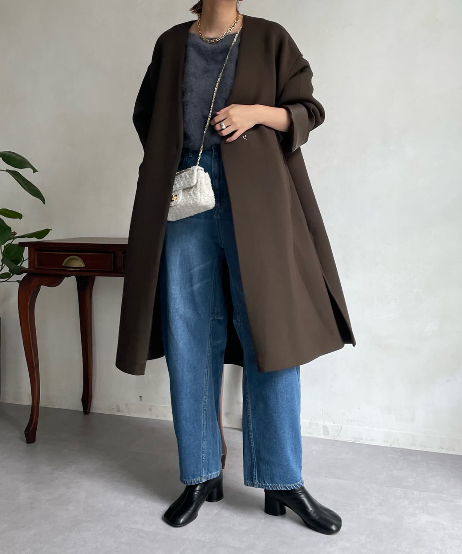 首元がすっきりと見えるノーカラーデザインに、裾にかけてAラインに広がるシルエットで、女性らしさをプラス。
