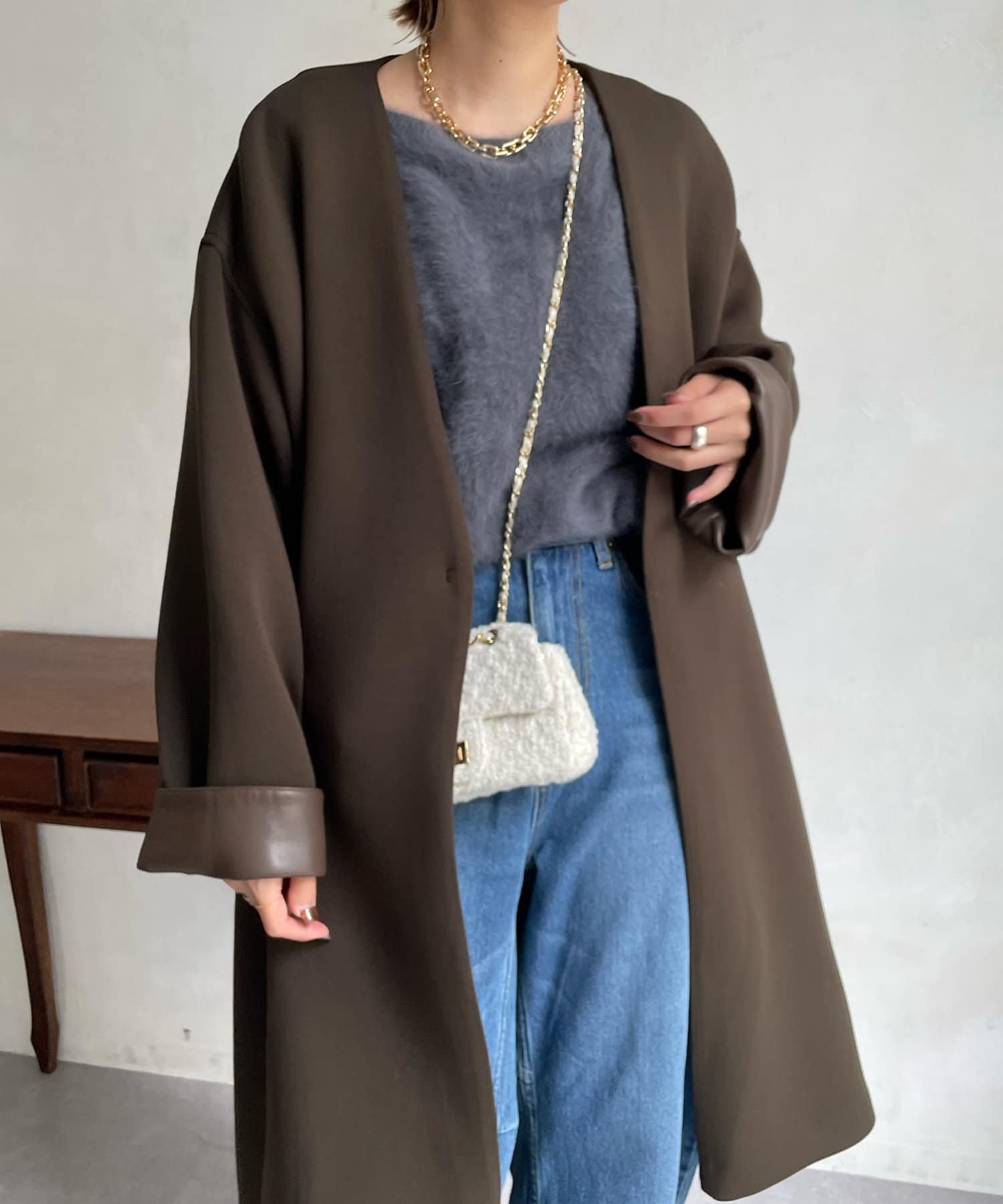袖口はフェイクレザーの素材に切り替えているので、折り返してアクセントをつけた着こなしがおすすめです。