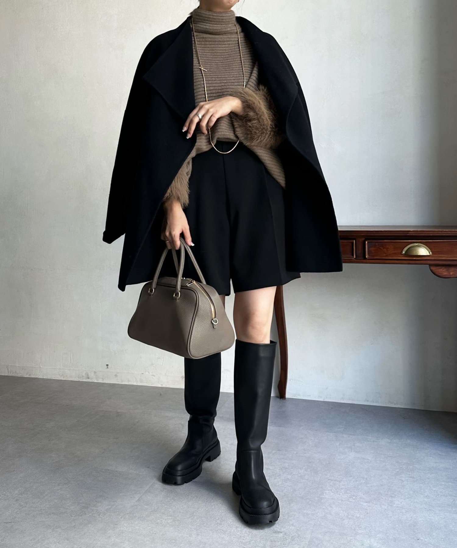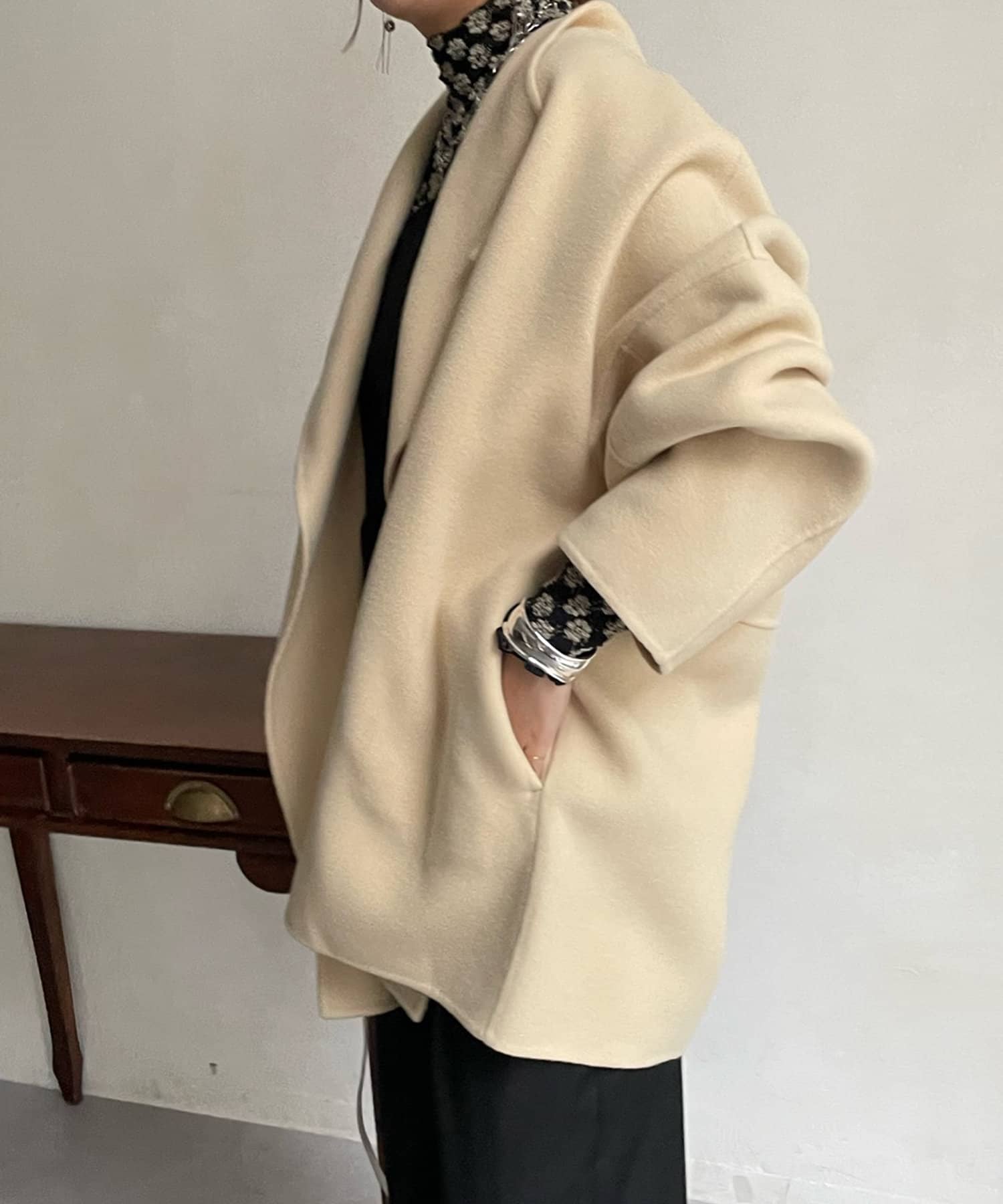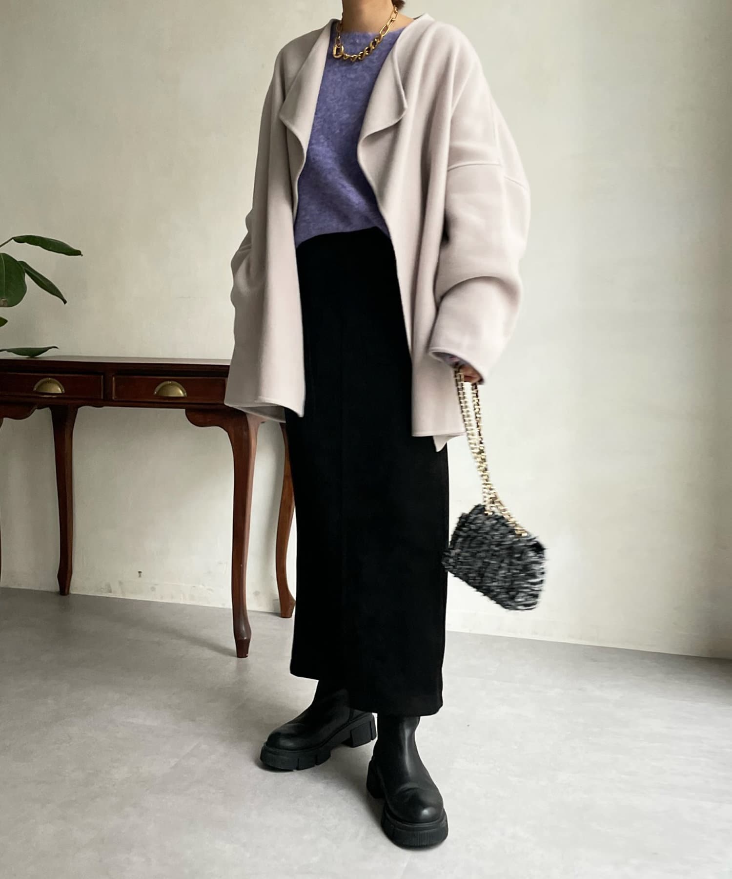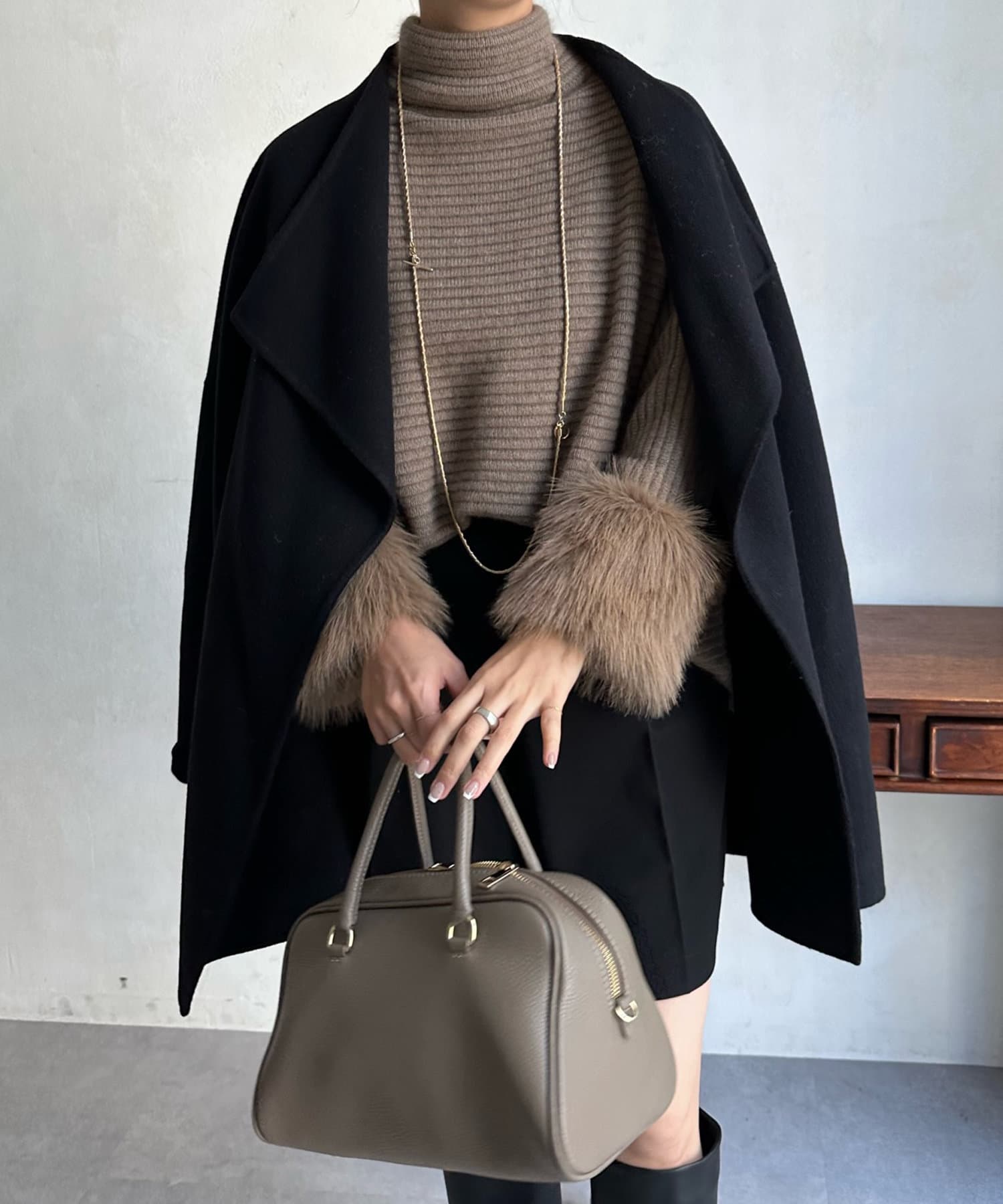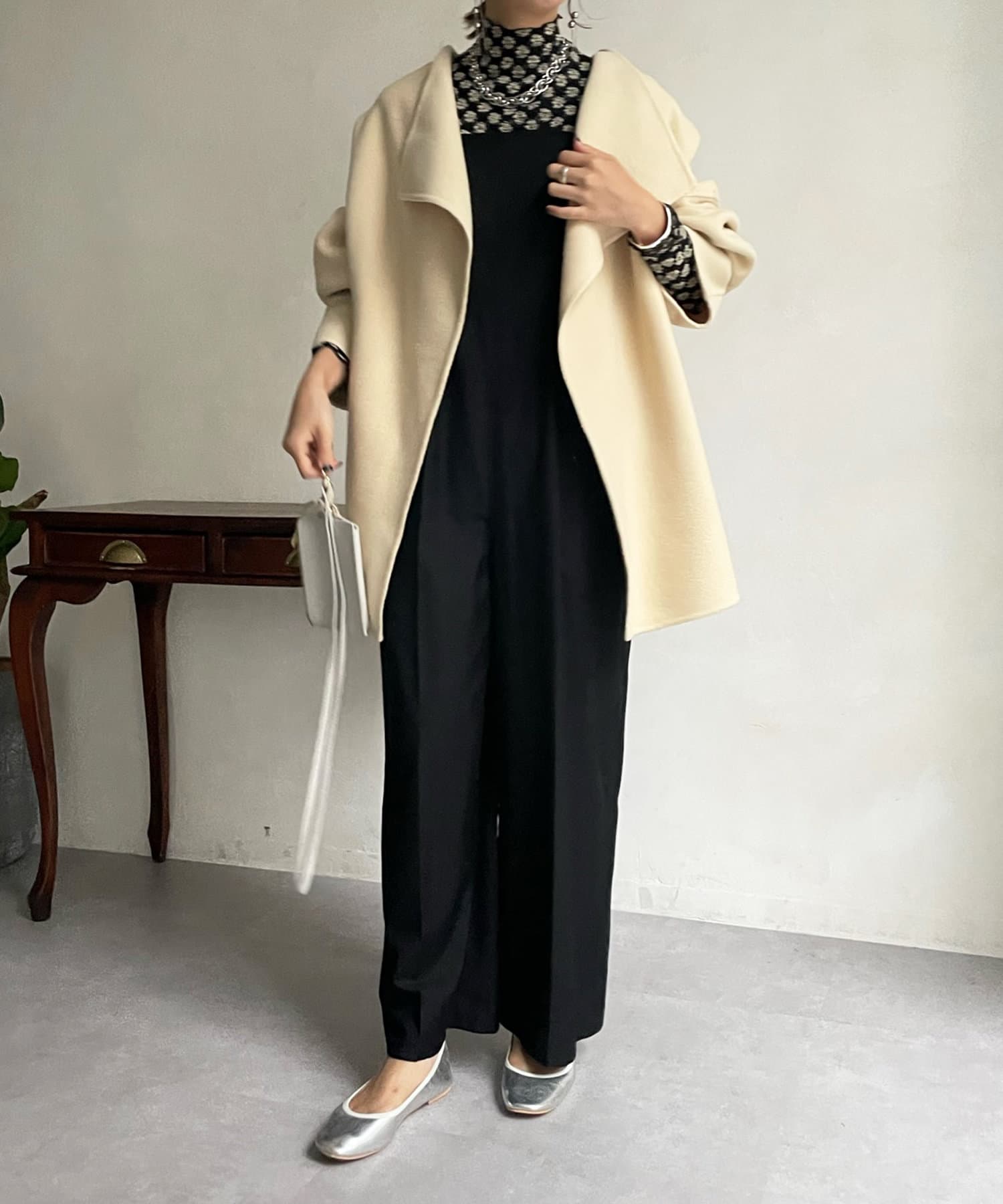 すっきりとした首回りのデザインの為、タートルネックをのぞかせたりストールやスヌードなどの冬小物も映えますよ!