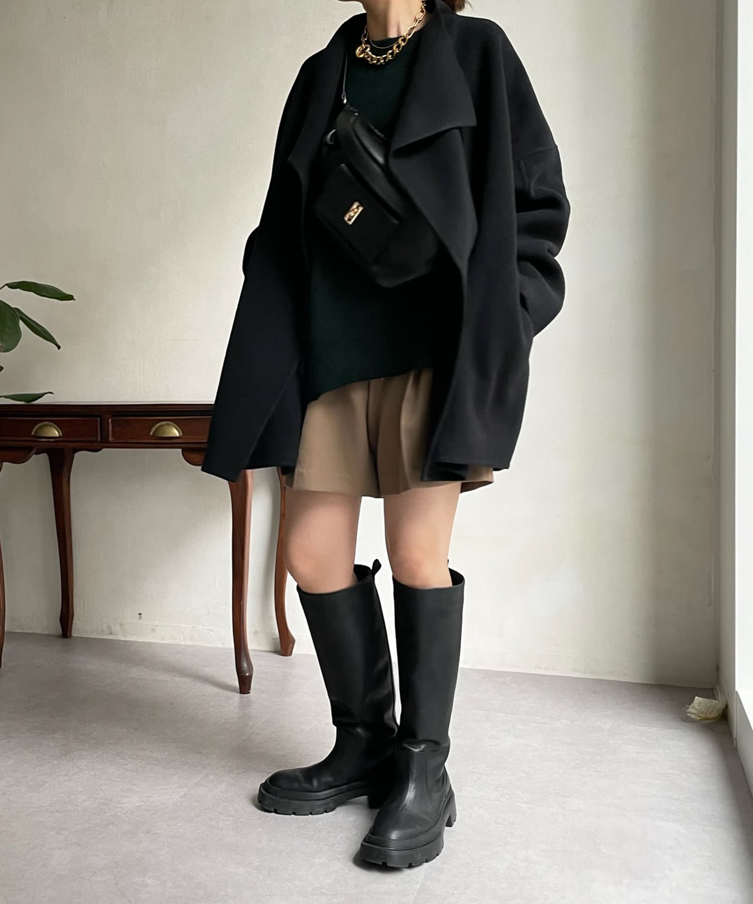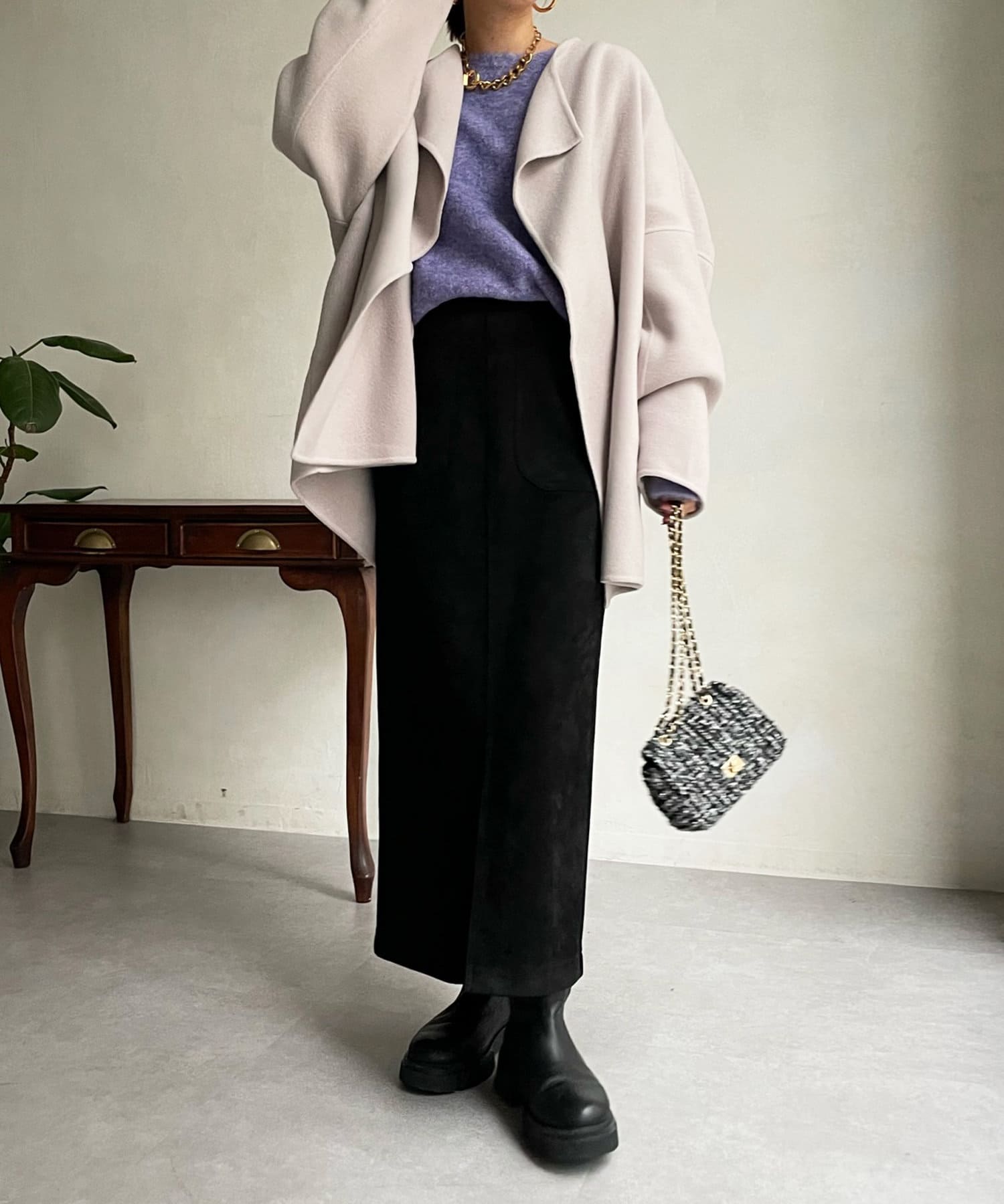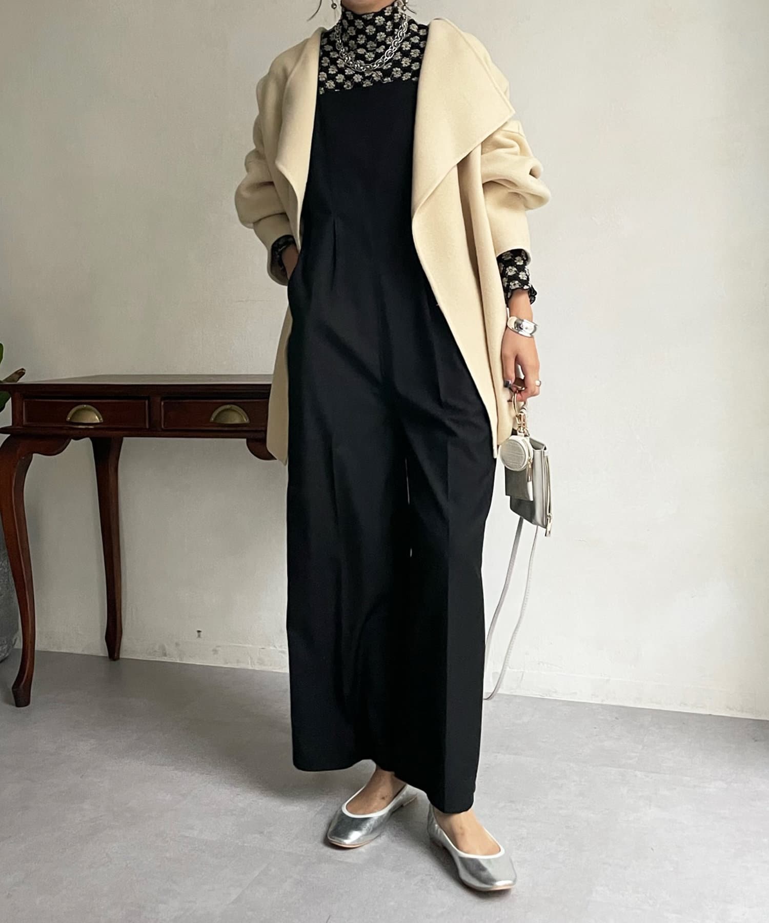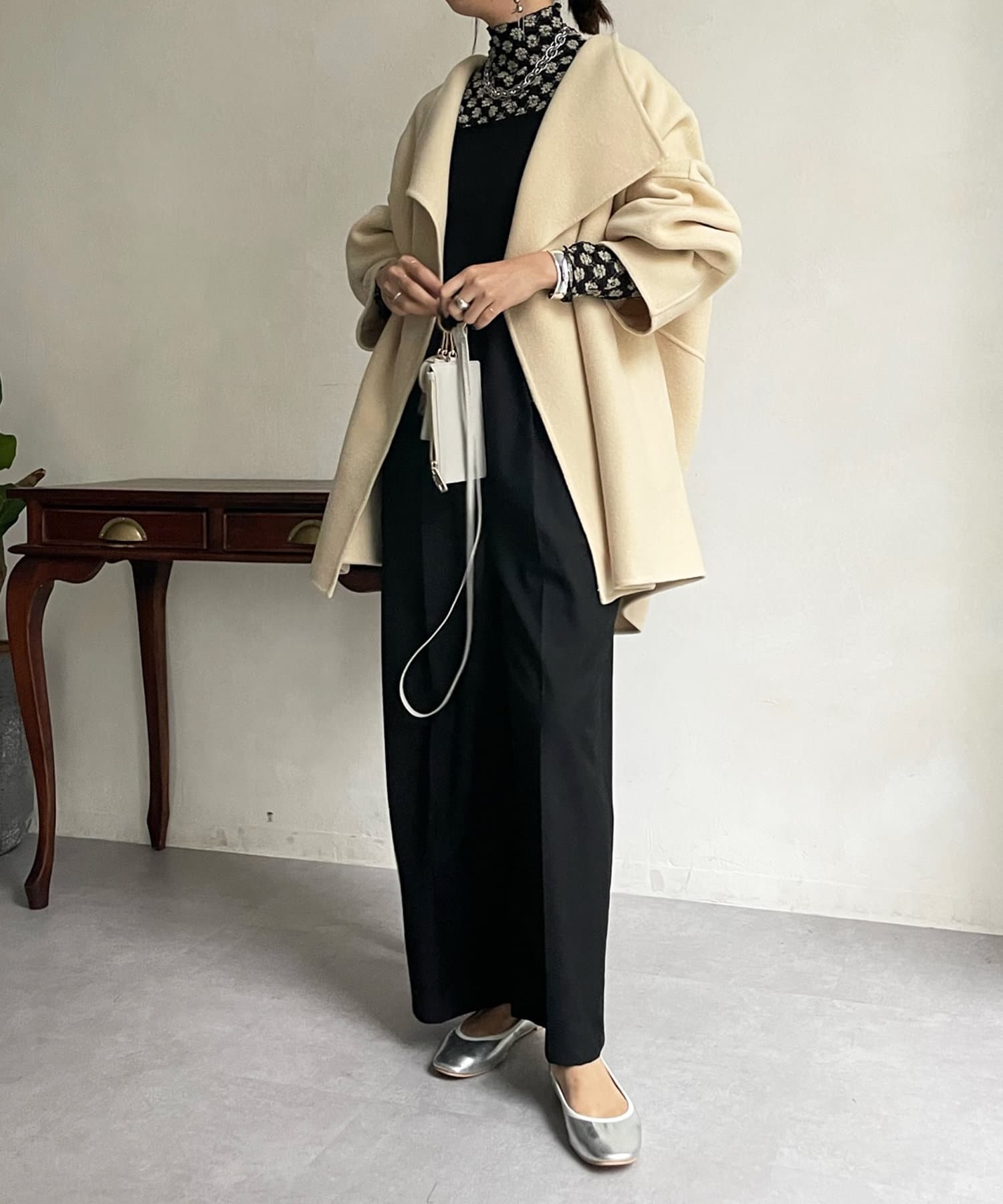 すっきりとした首回りのデザインの為、タートルネックをのぞかせたりストールやスヌードなどの冬小物も映えますよ!