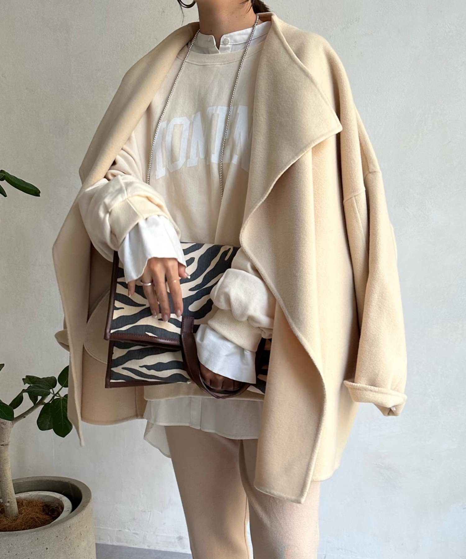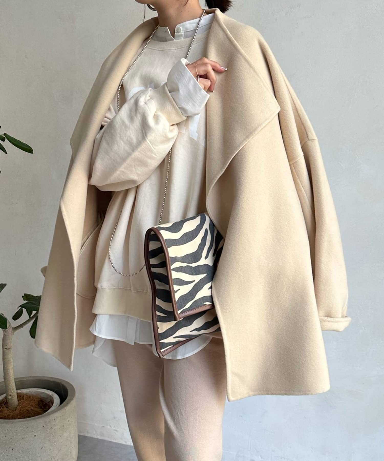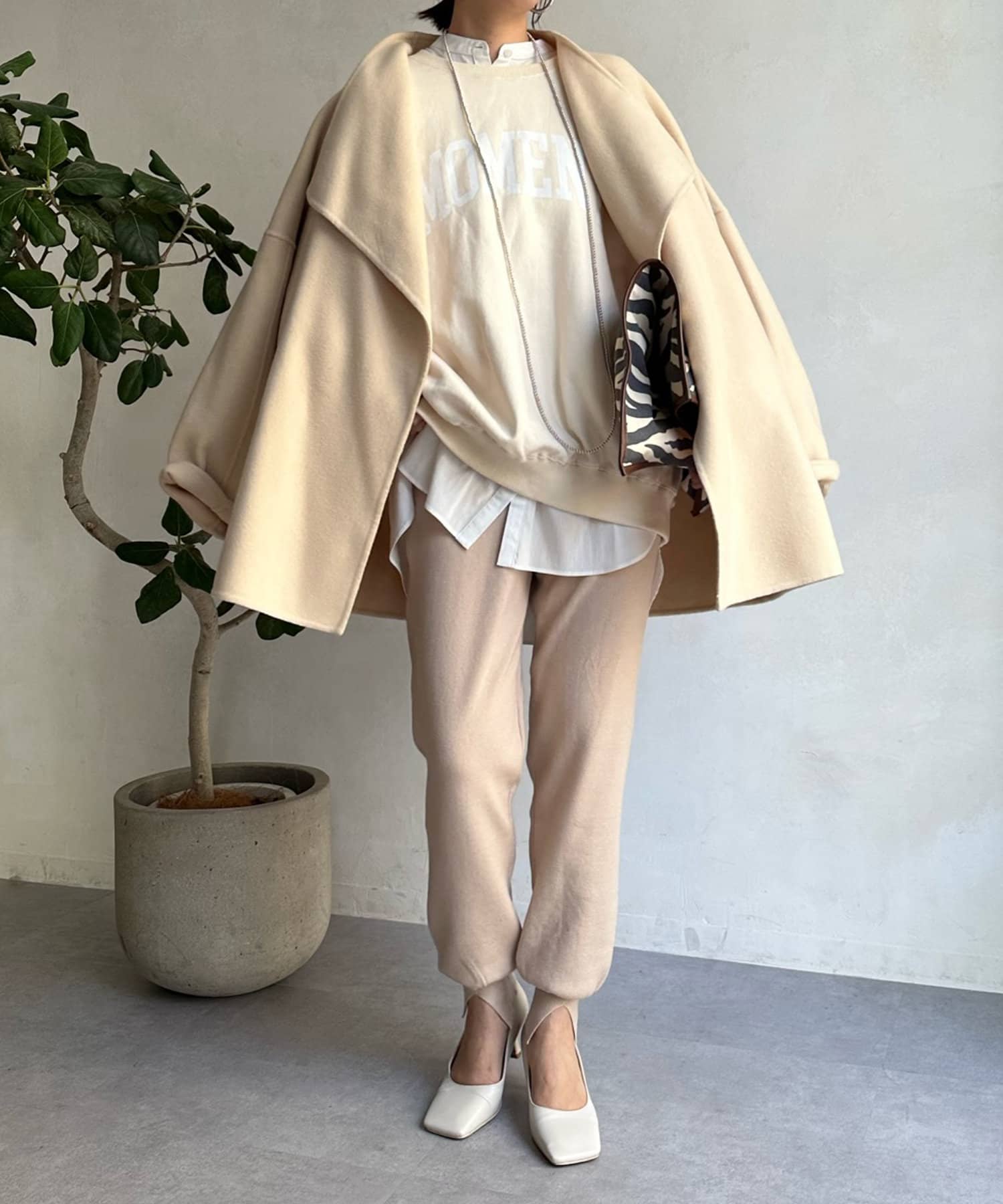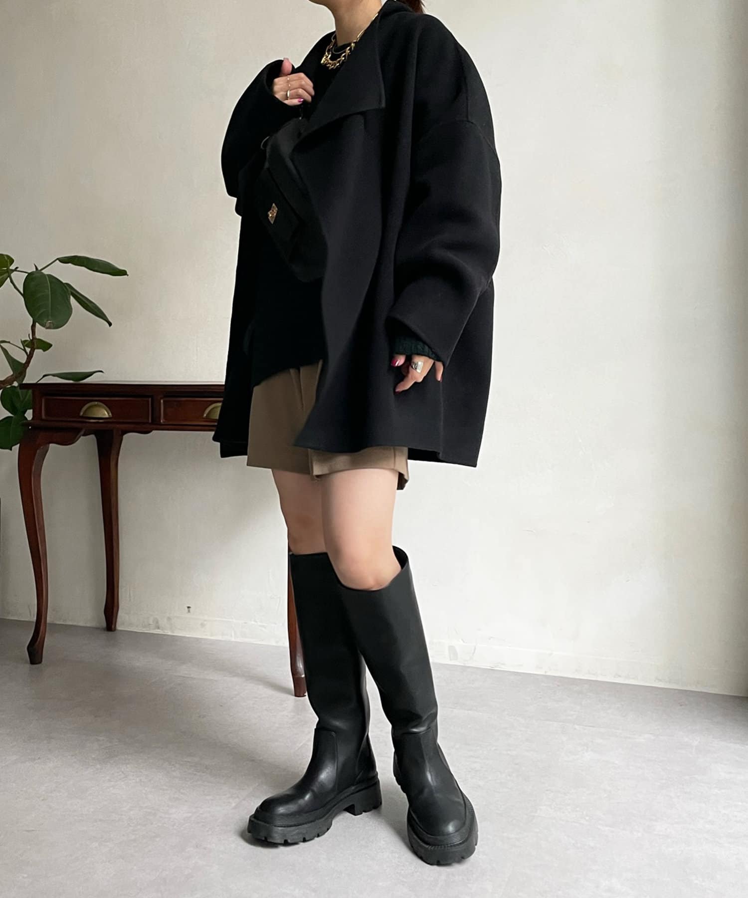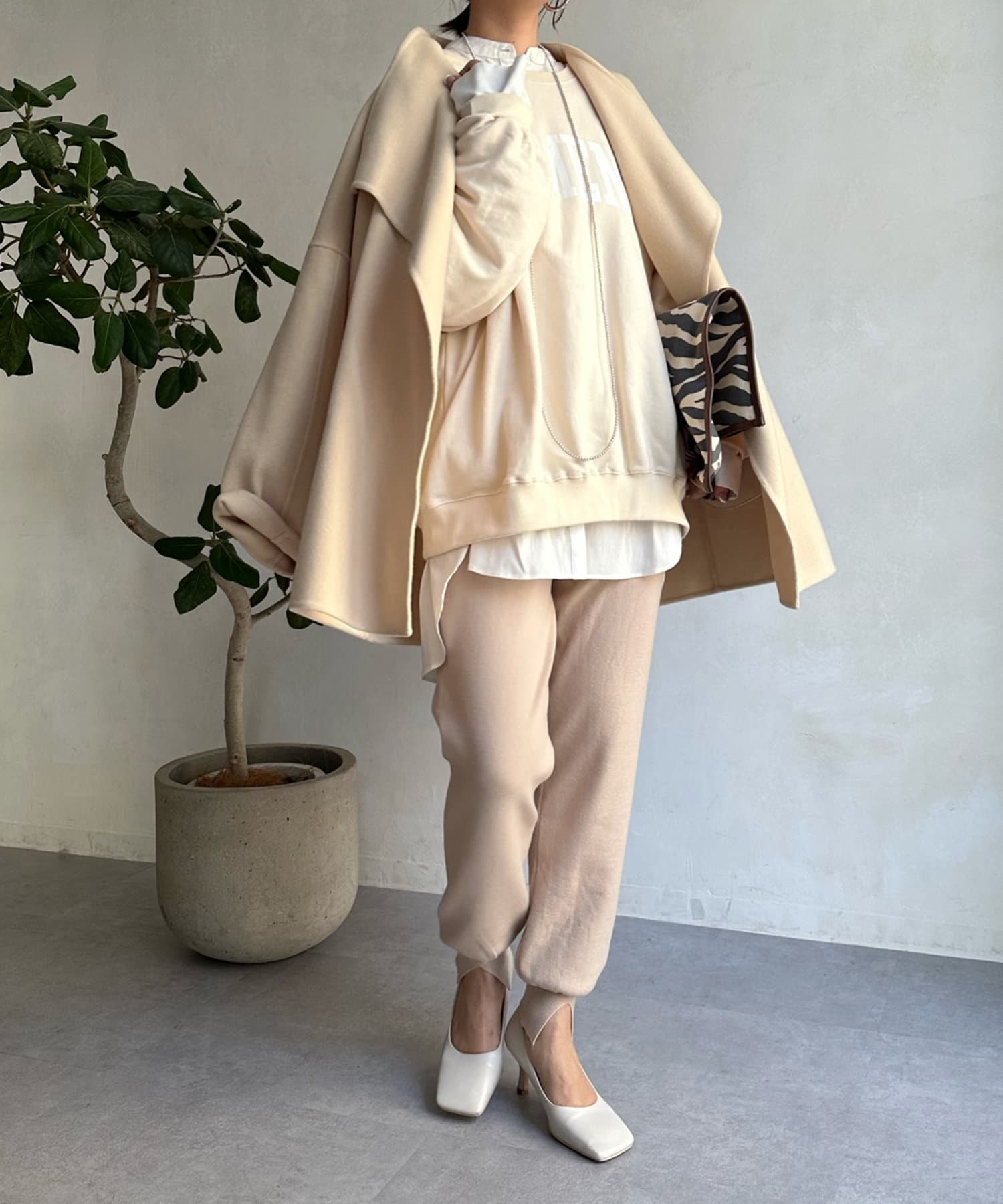 すっきりとした首回りのデザインの為、タートルネックをのぞかせたりストールやスヌードなどの冬小物も映えますよ!