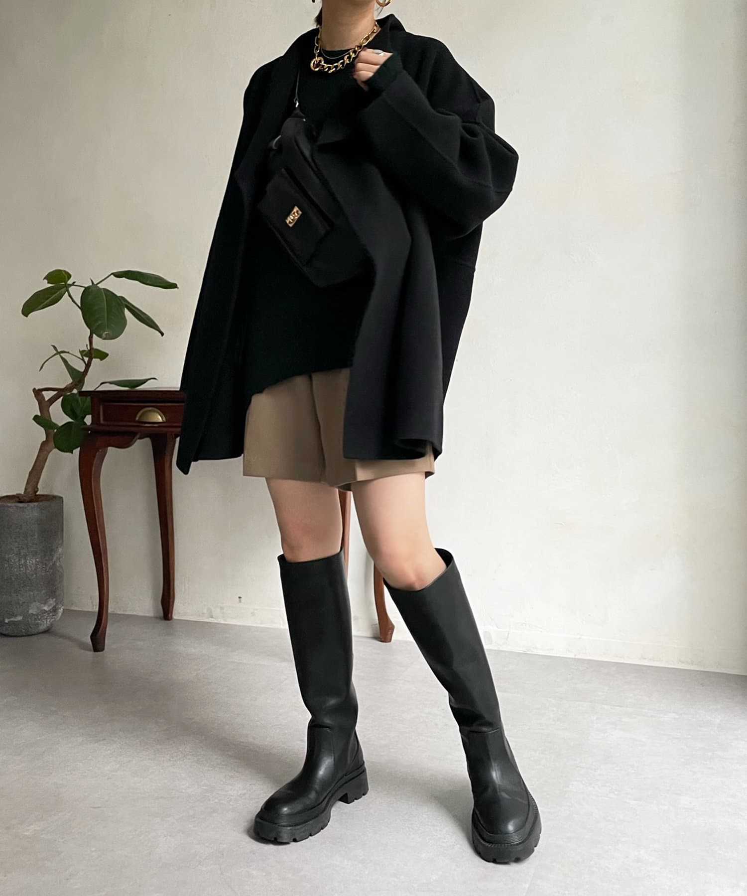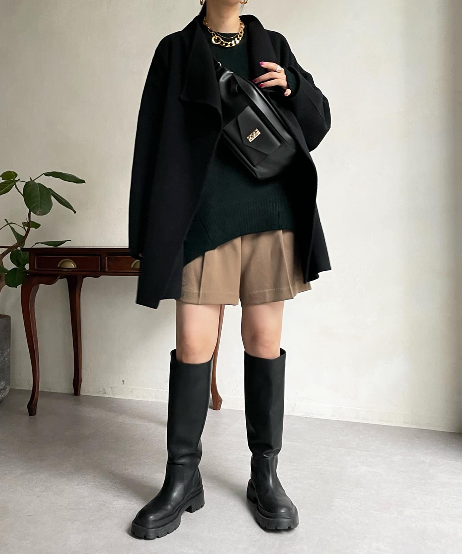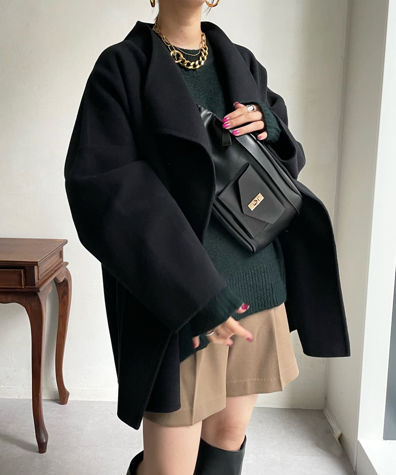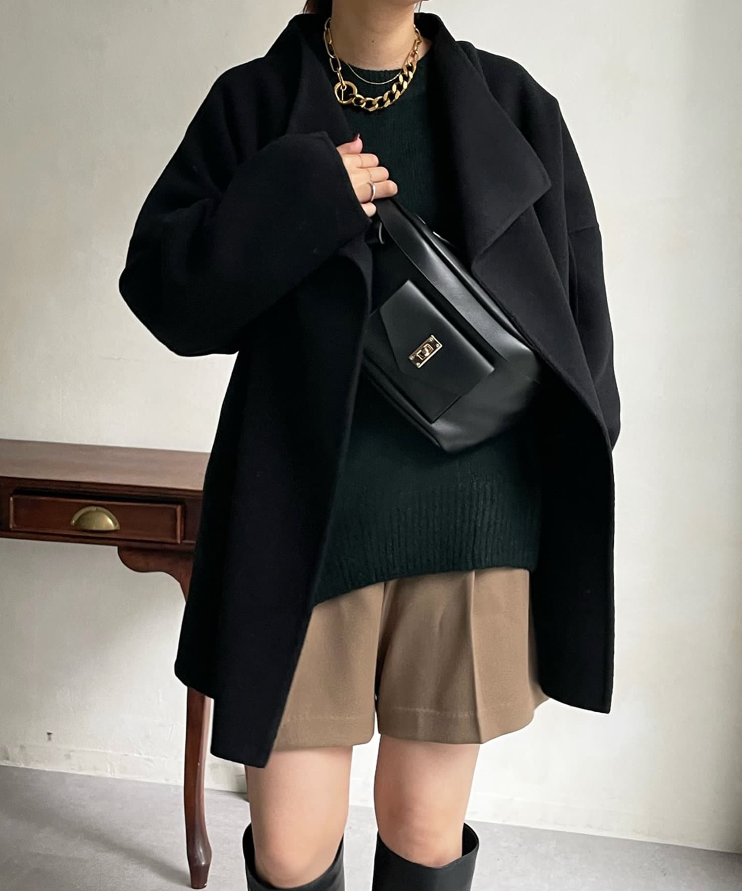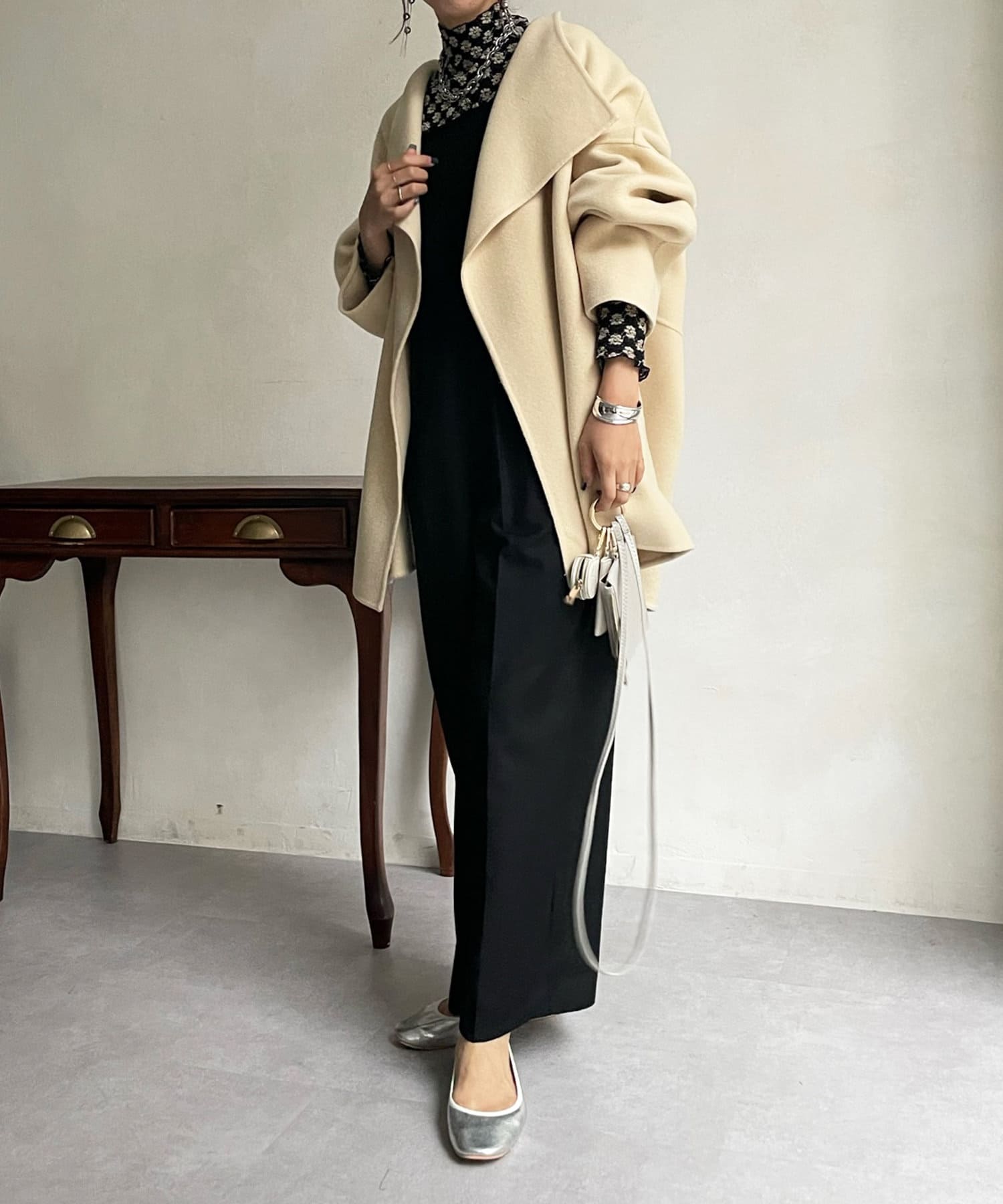 すっきりとした首回りのデザインの為、タートルネックをのぞかせたりストールやスヌードなどの冬小物も映えますよ!