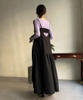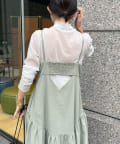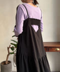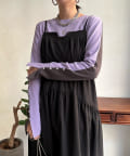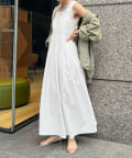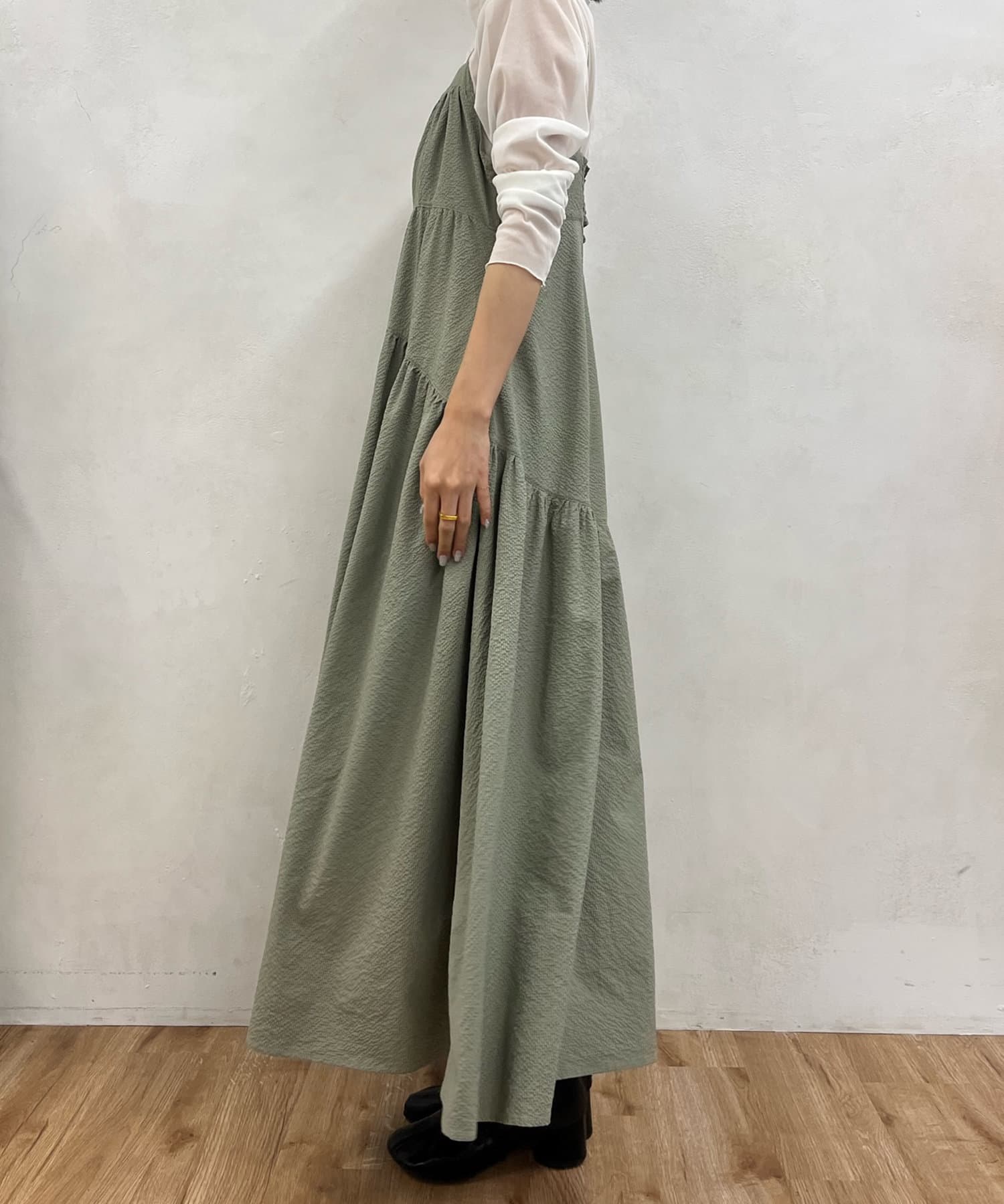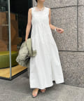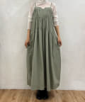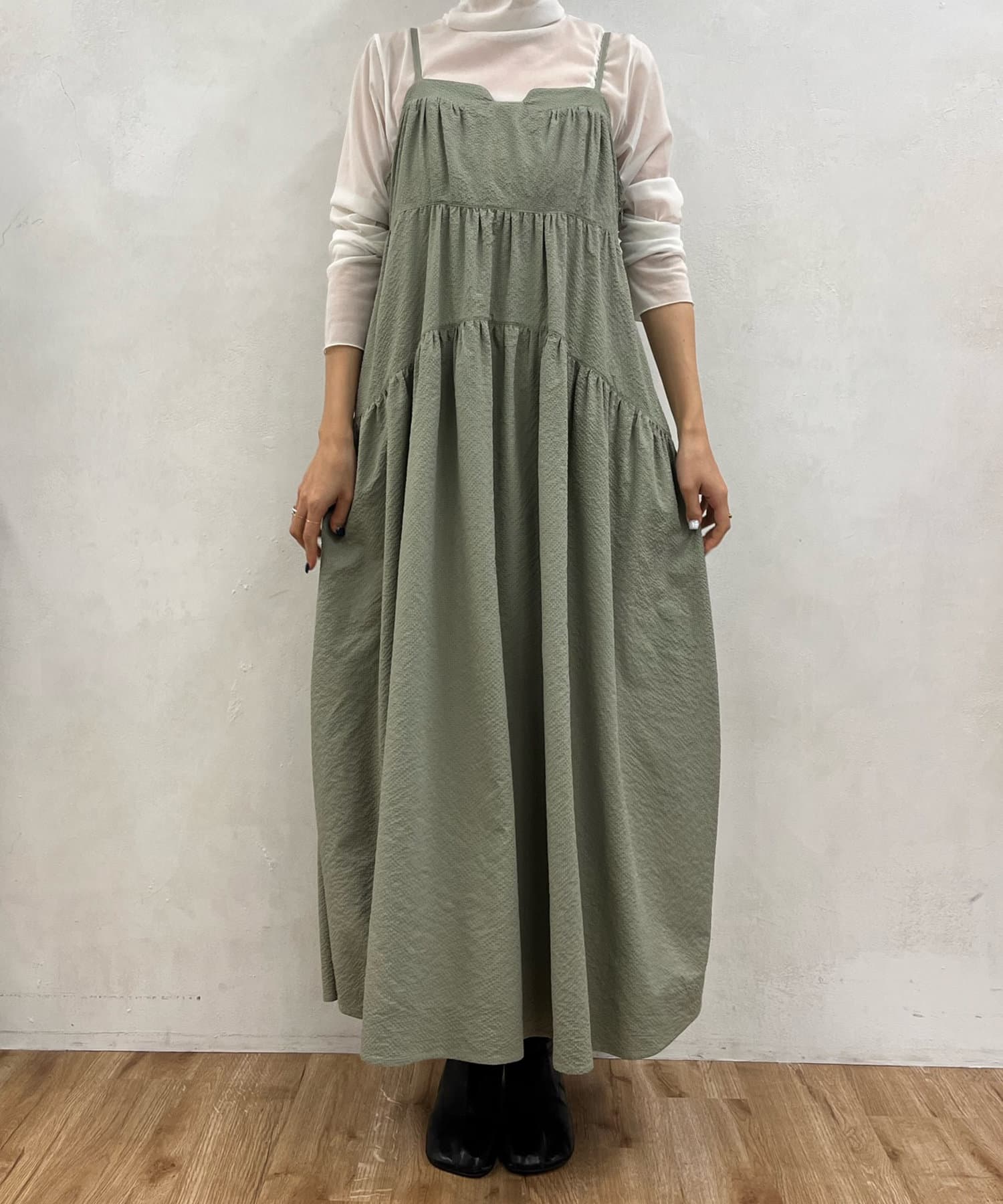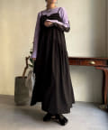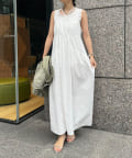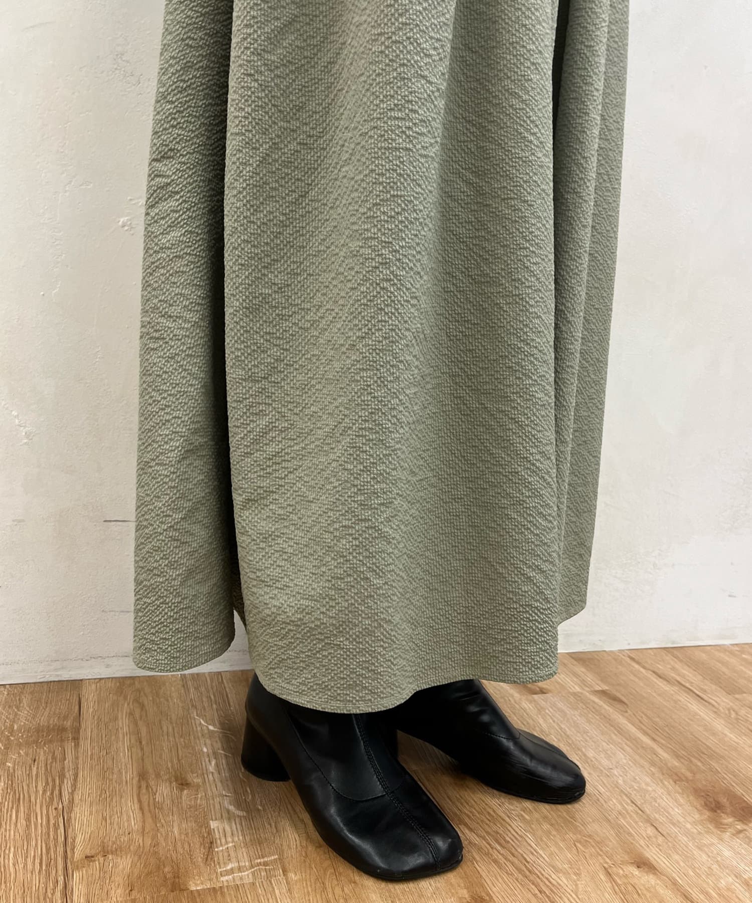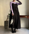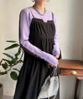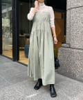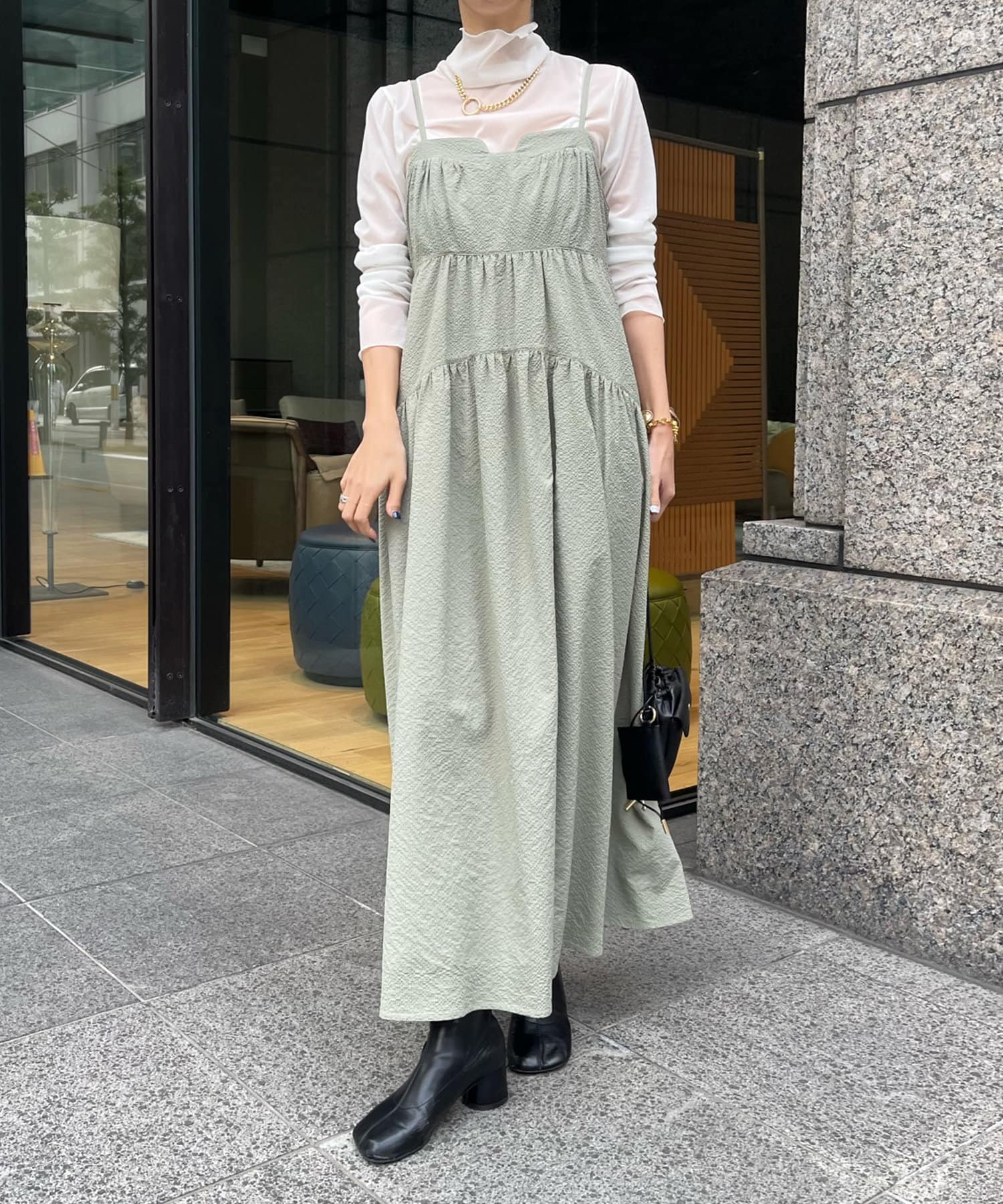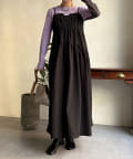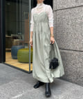 胸下のラインからギャザーを寄せ、裾に向かって広がるシルエットなため、高い位置に目線がいくことで、脚長効果があるのも嬉しいポイント。