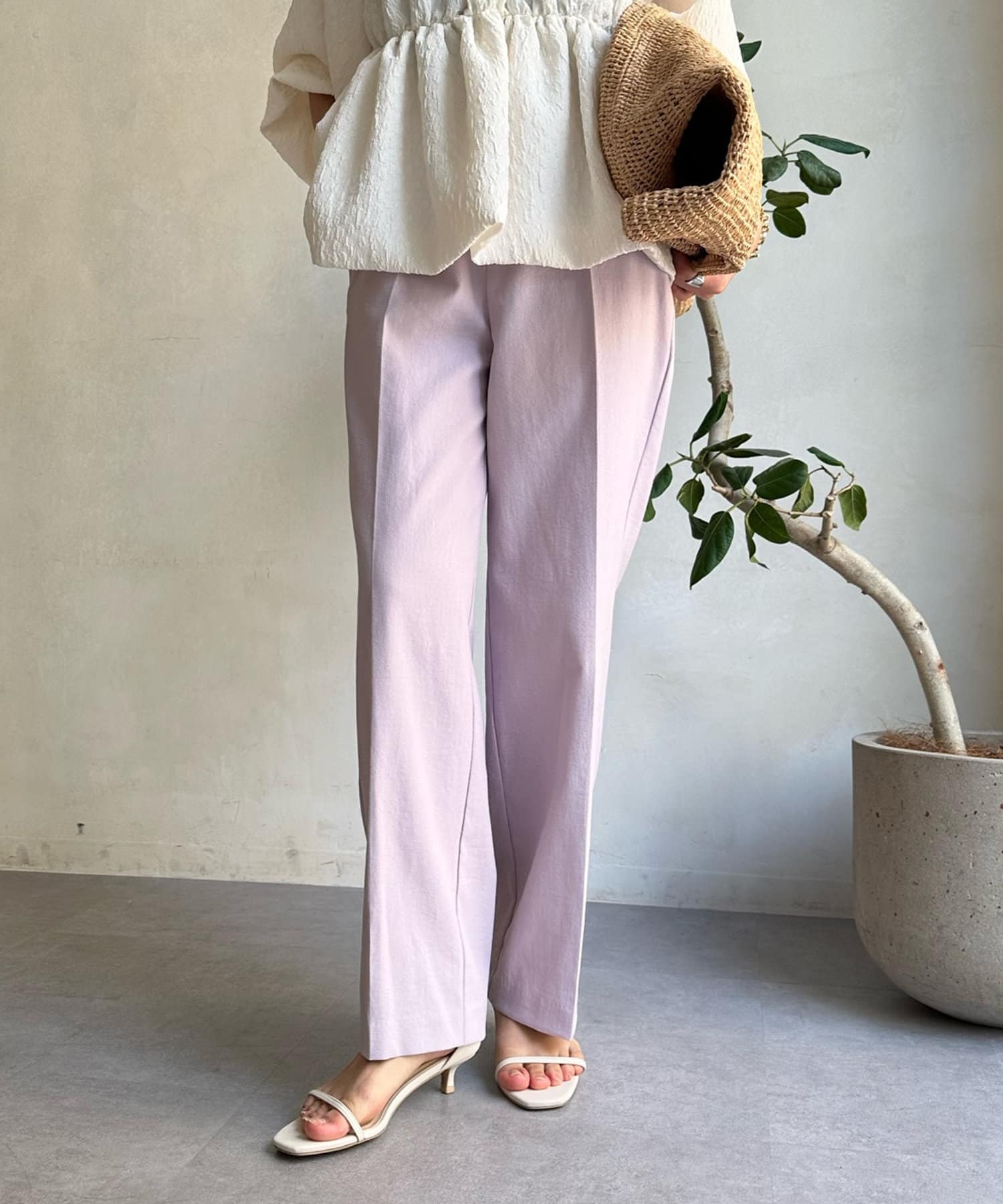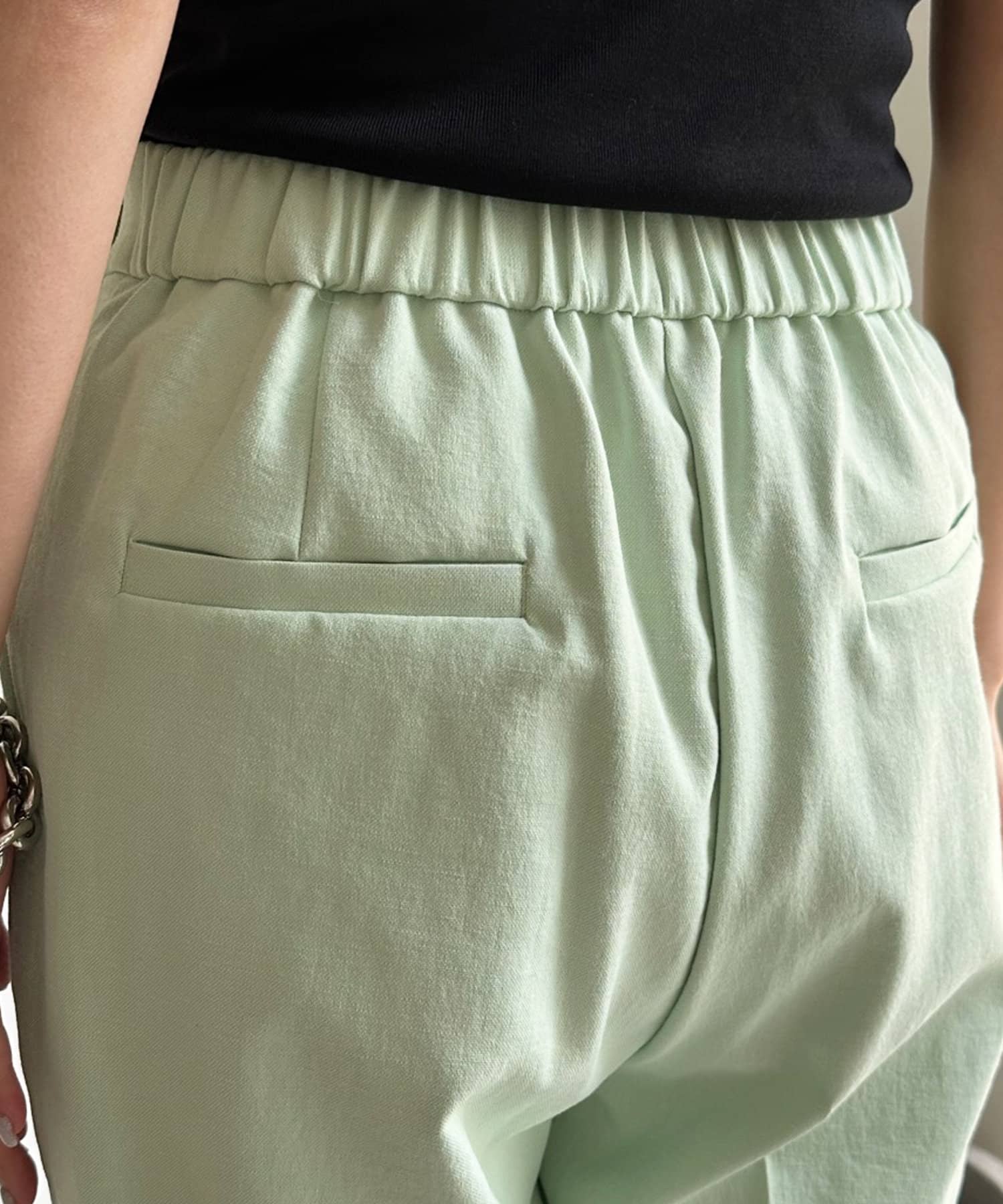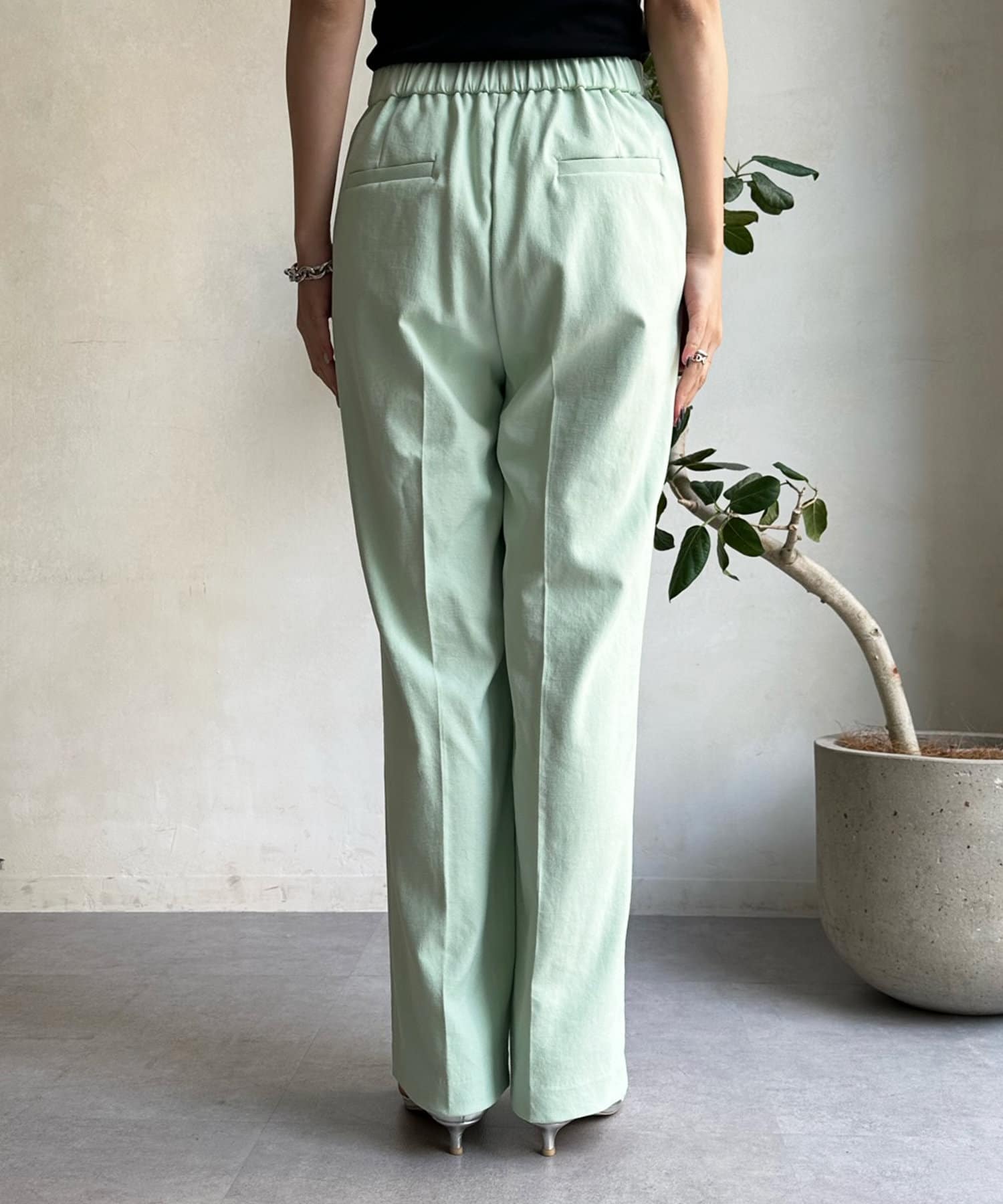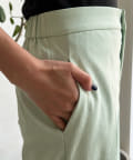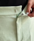 センタープレス入りできちんとした印象ながらも、後ろウエストにゴムを入れることで着心地の良さも実現しました。