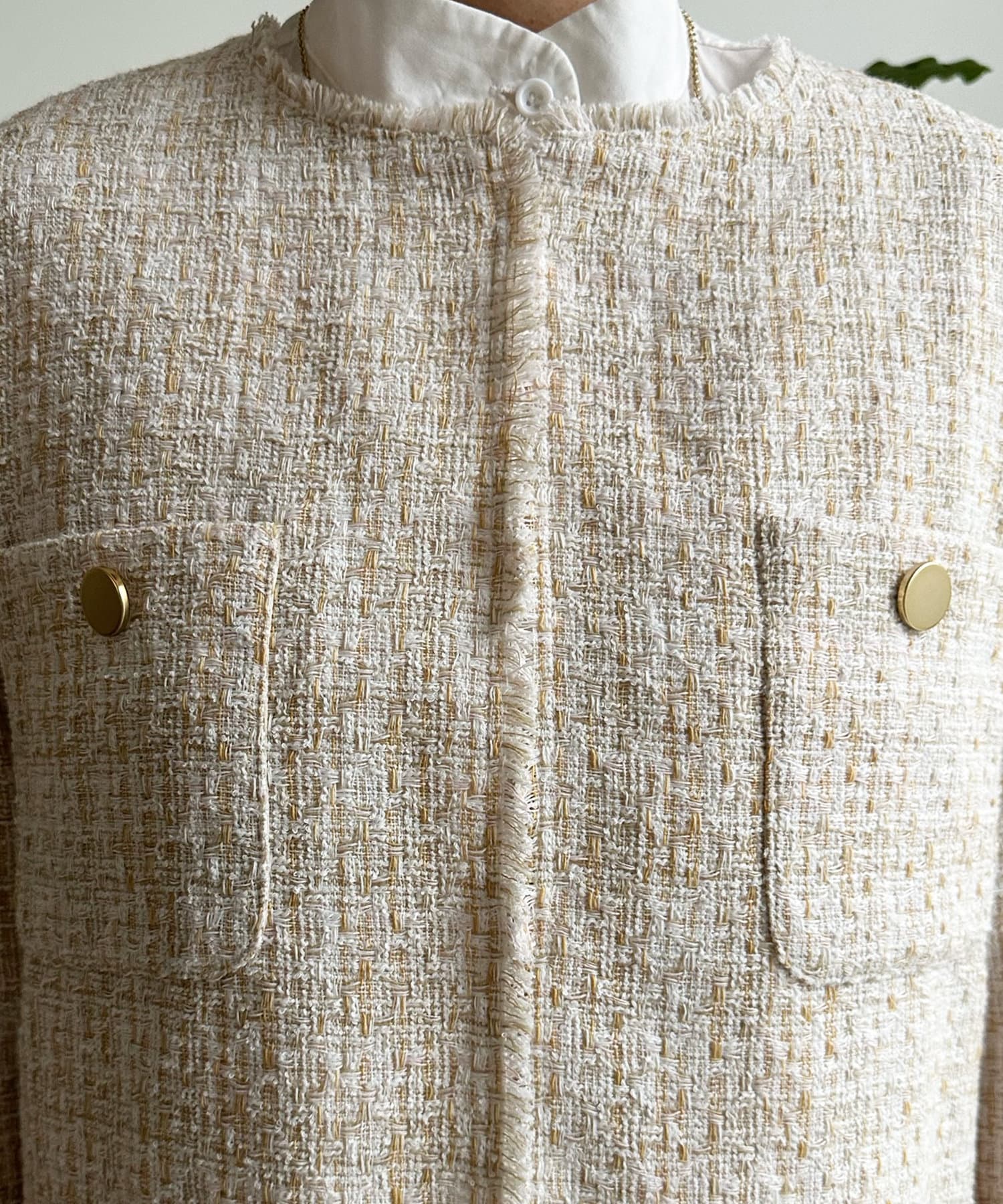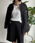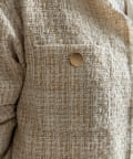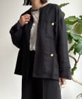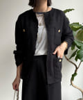 ノーカラーのデザインがお顔周りをすっきりとみせてくれ、4つのポケットとゴールドのボタンがクラシックなポイントに。