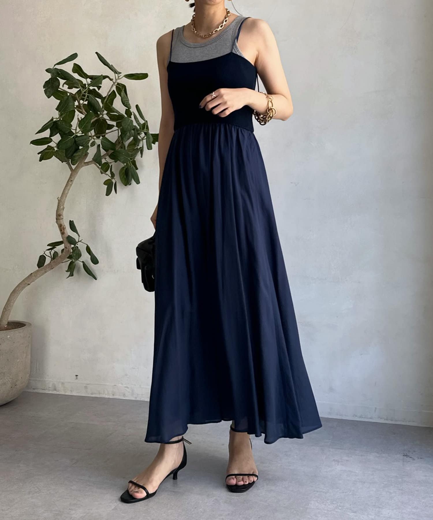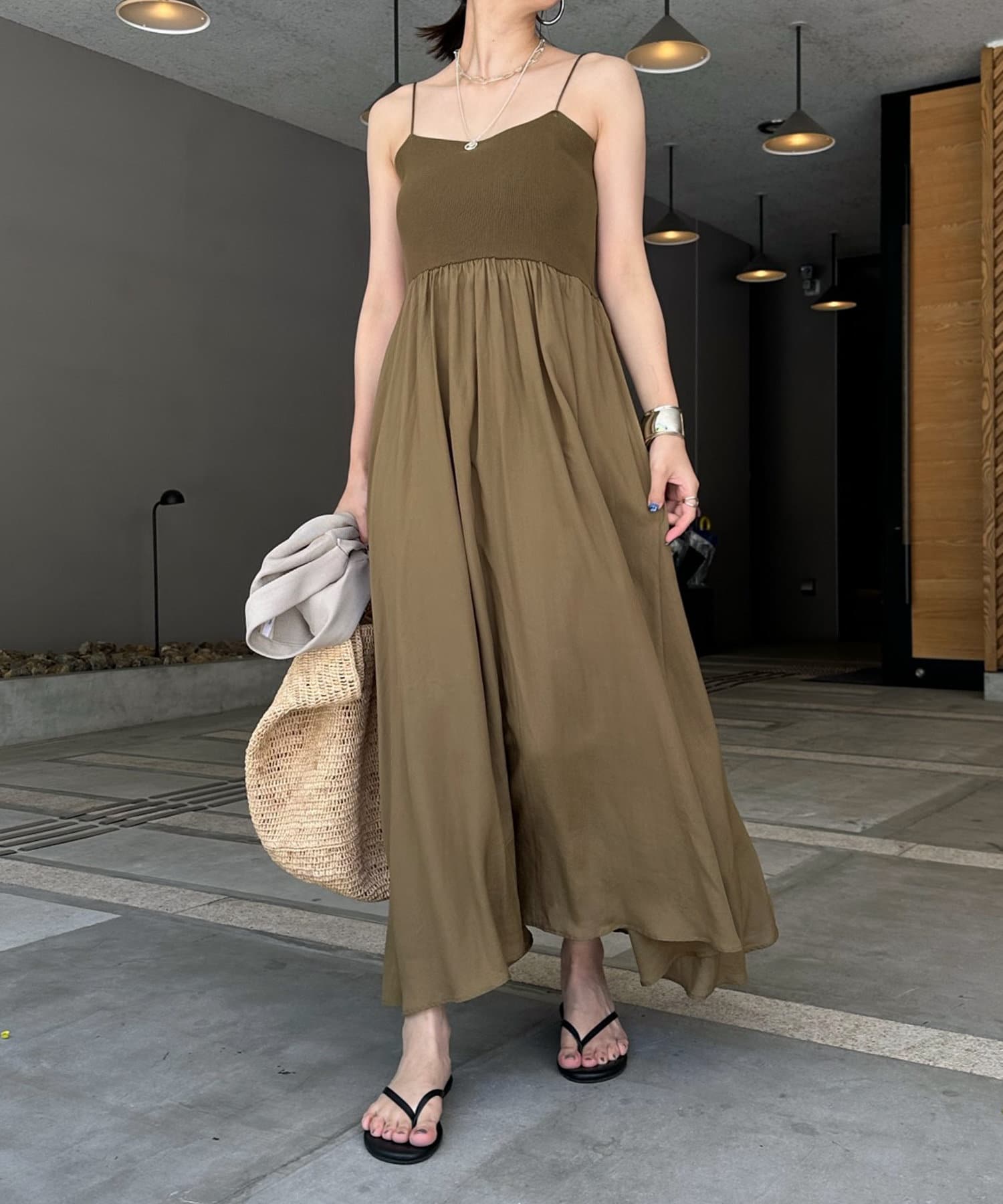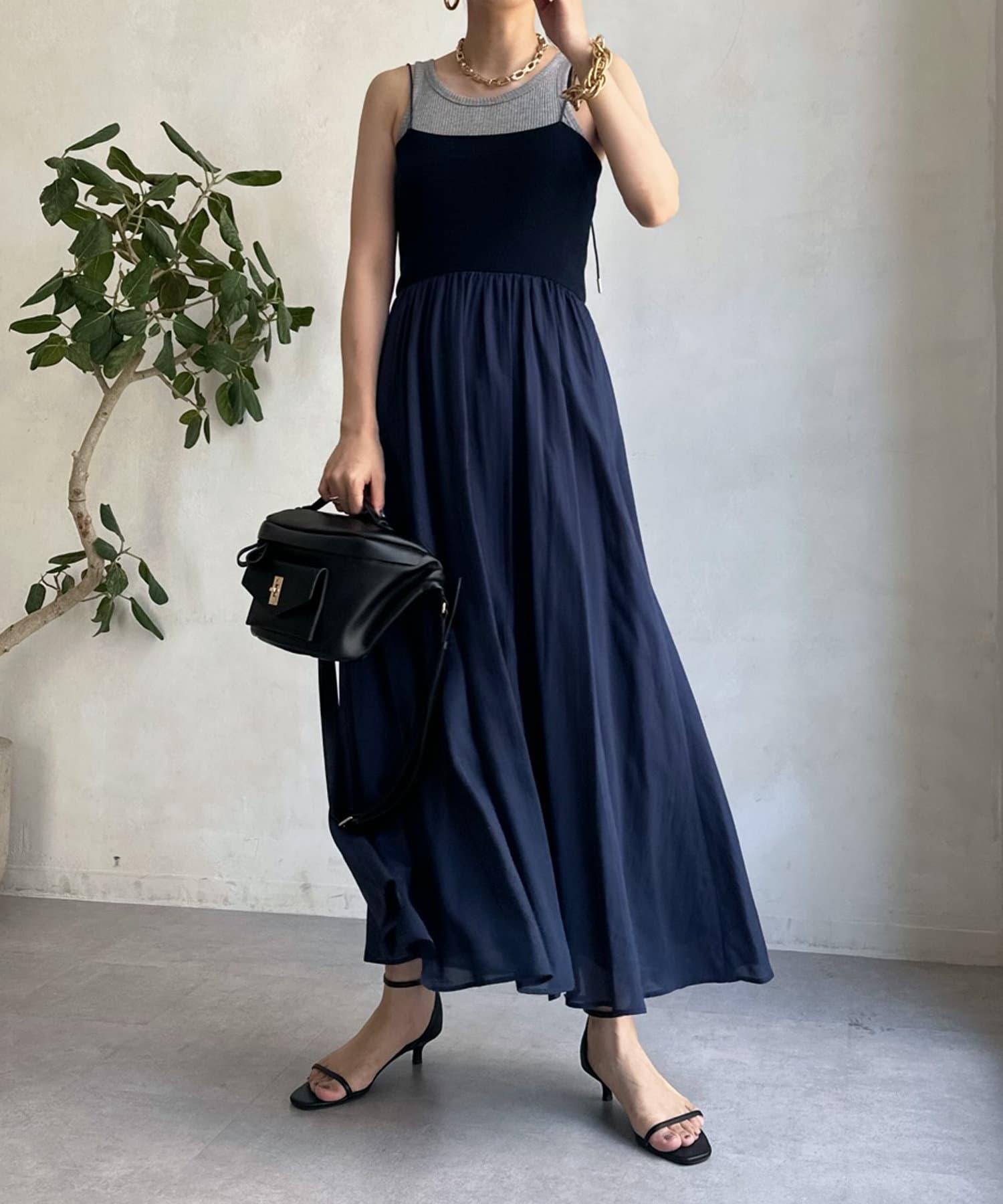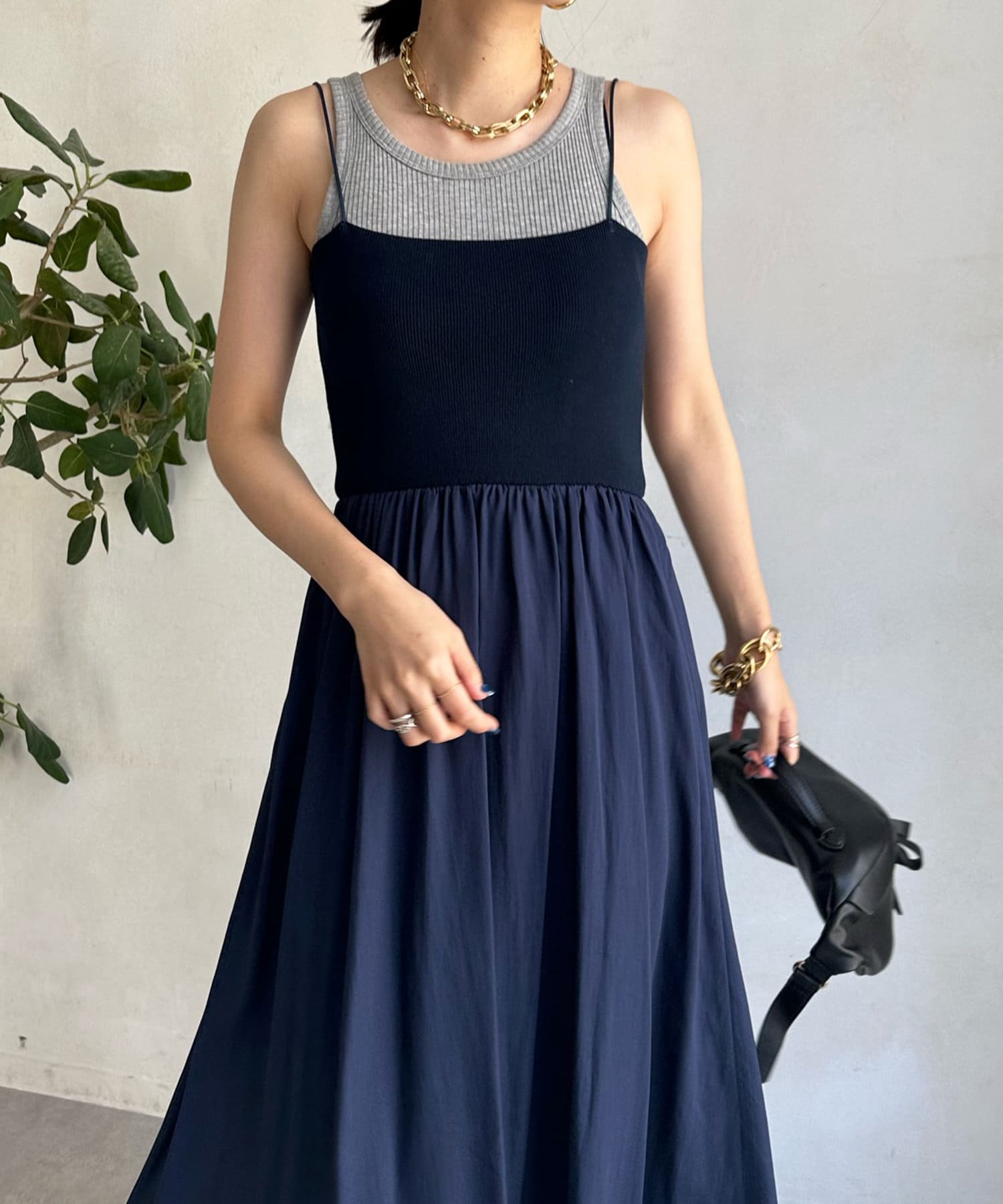 素材の切り替えデザインがポイントのキャミソールワンピース。