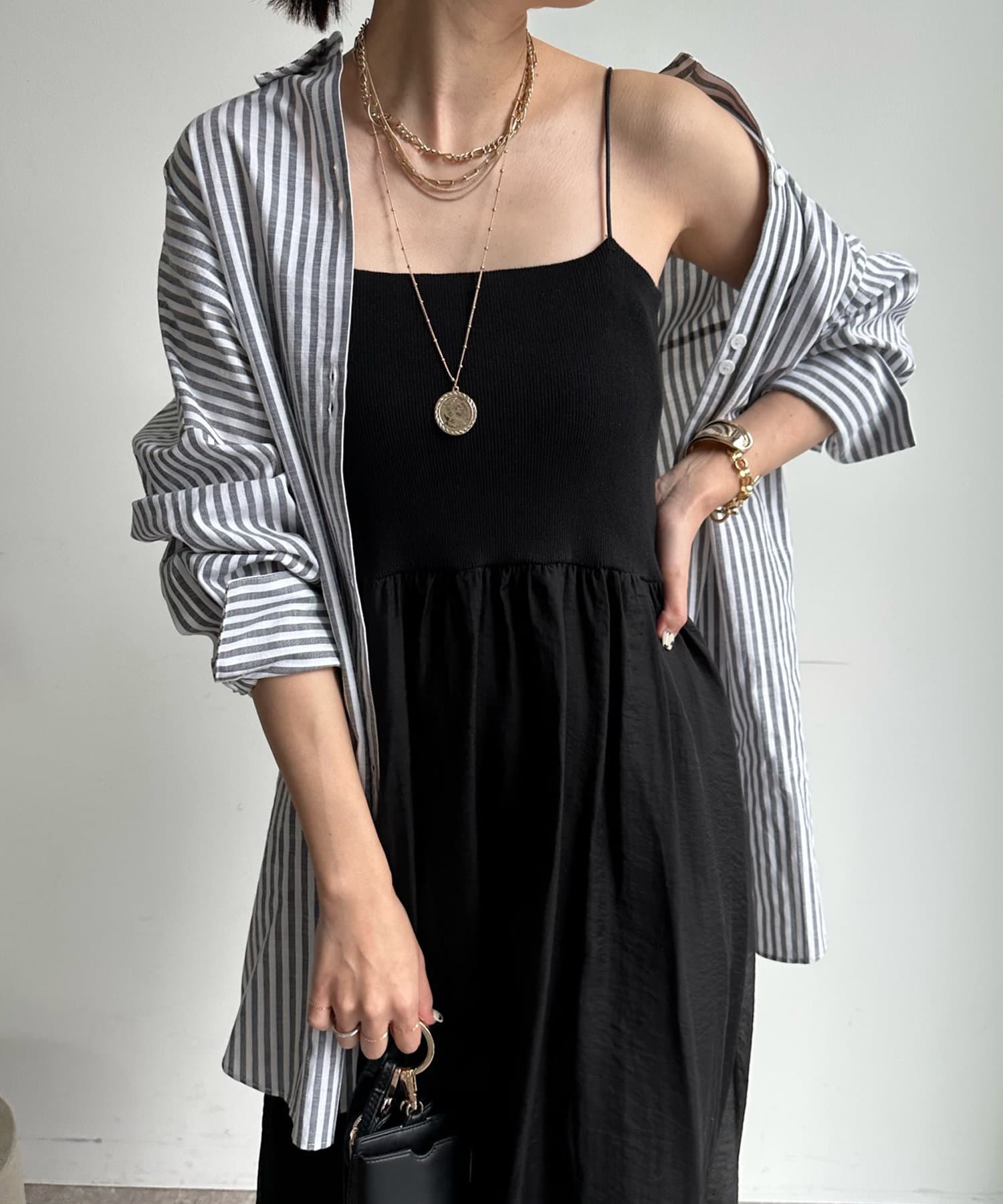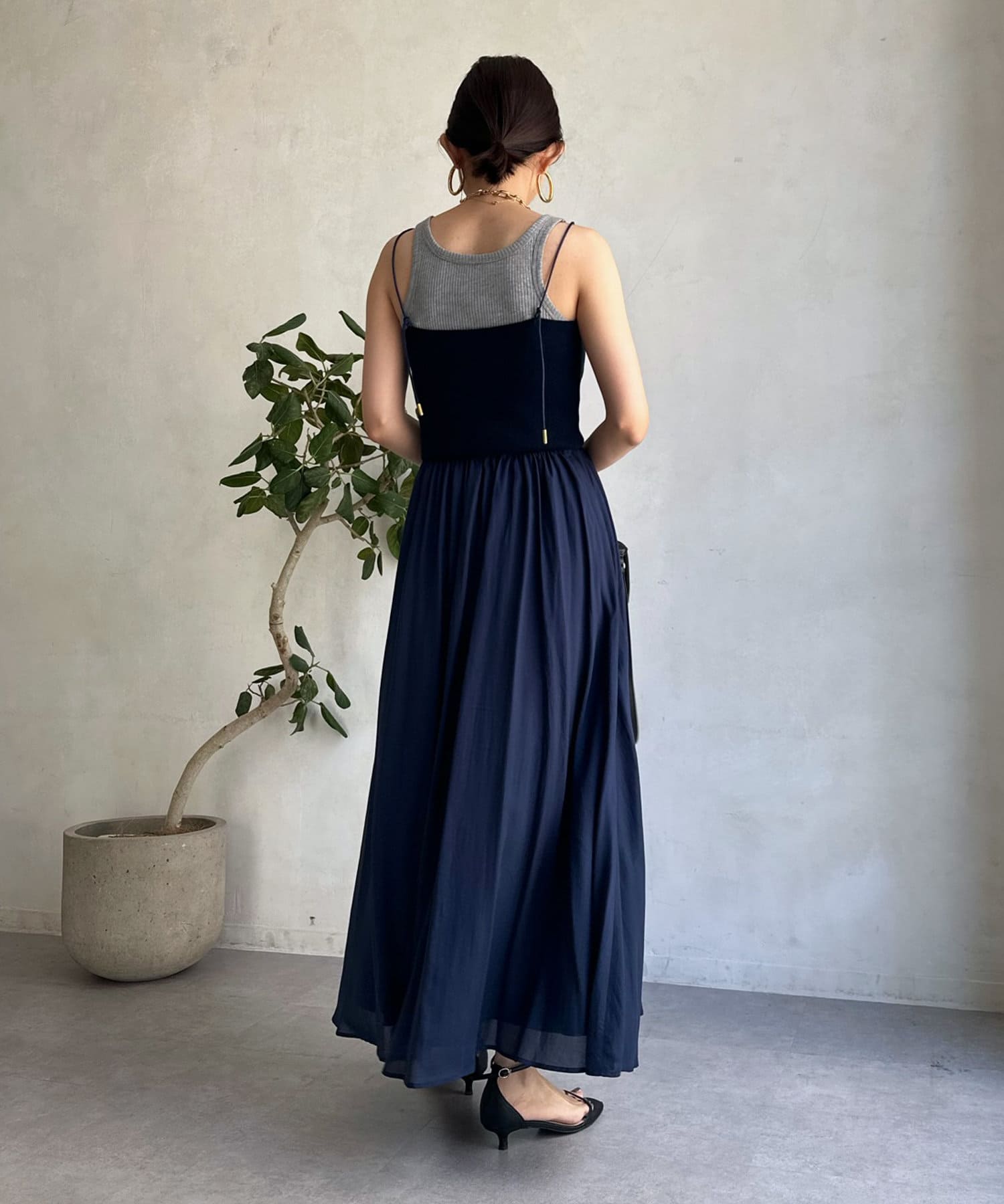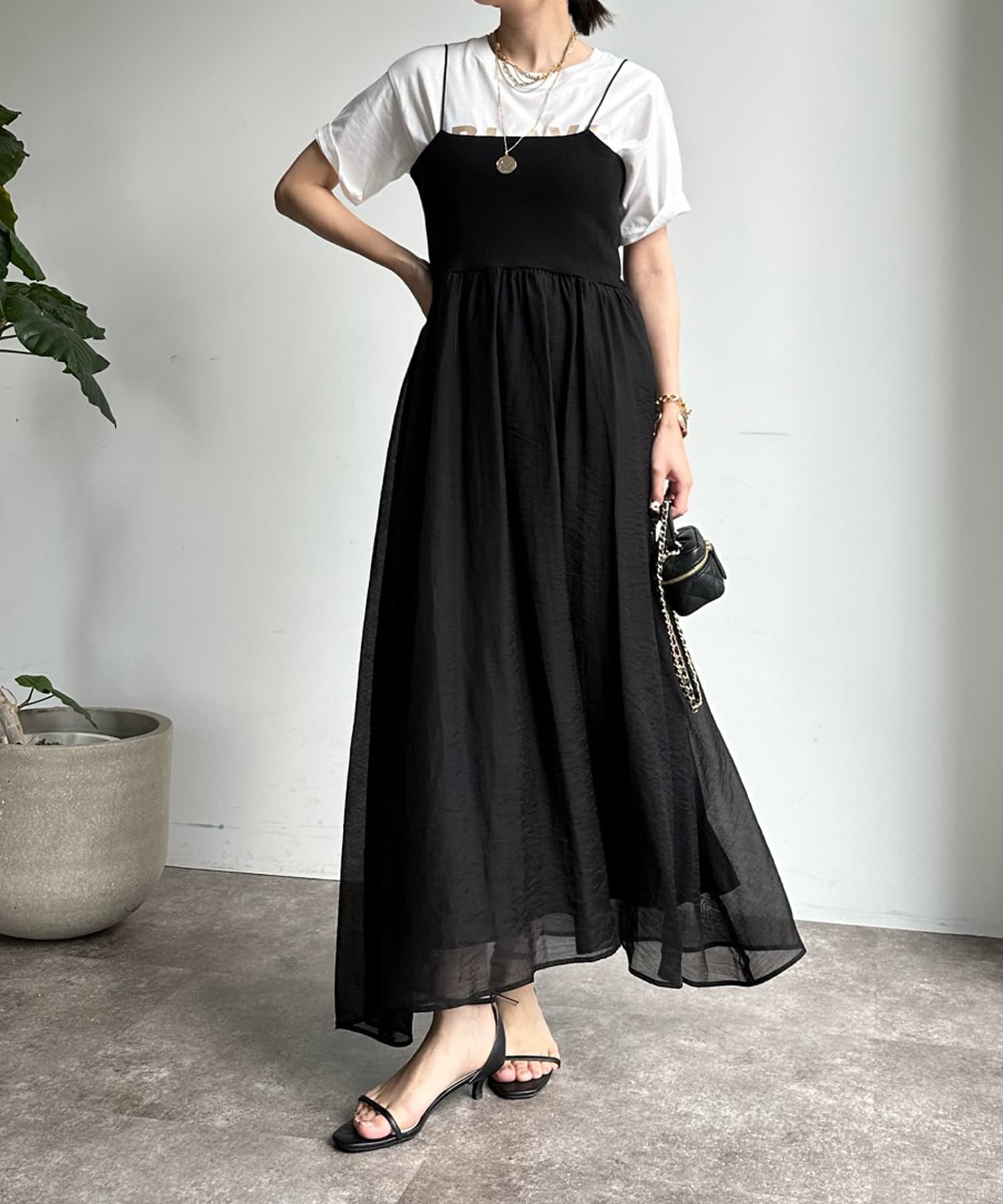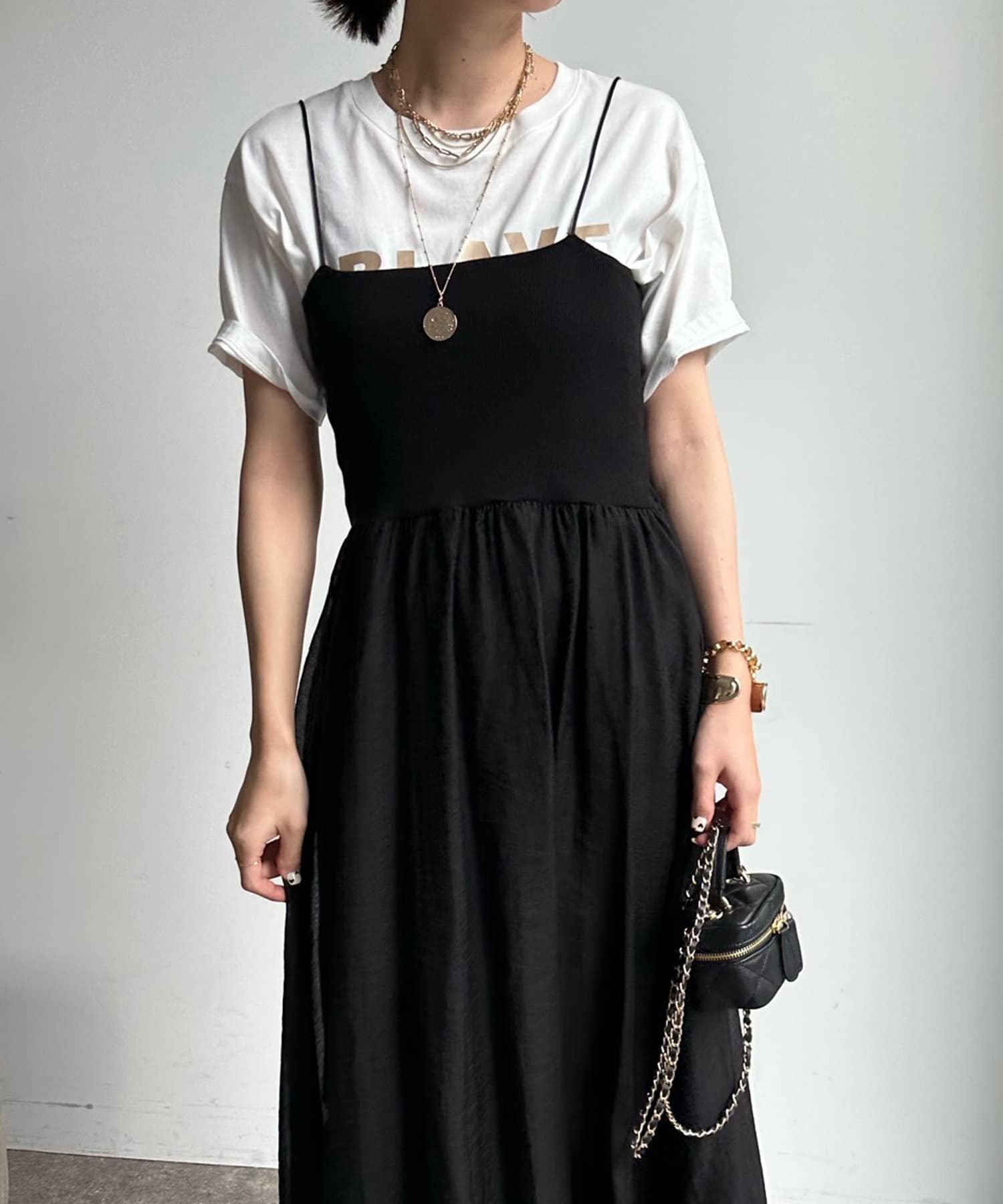 素材の切り替えデザインがポイントのキャミソールワンピース。