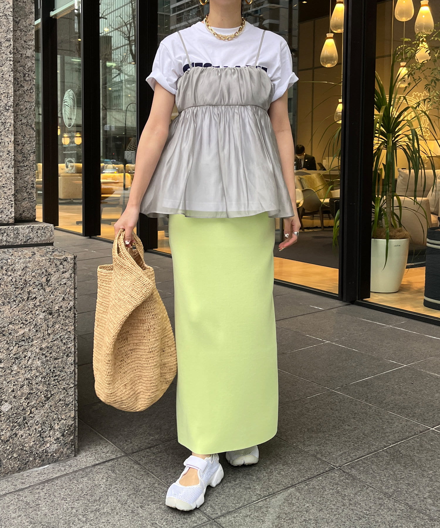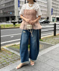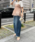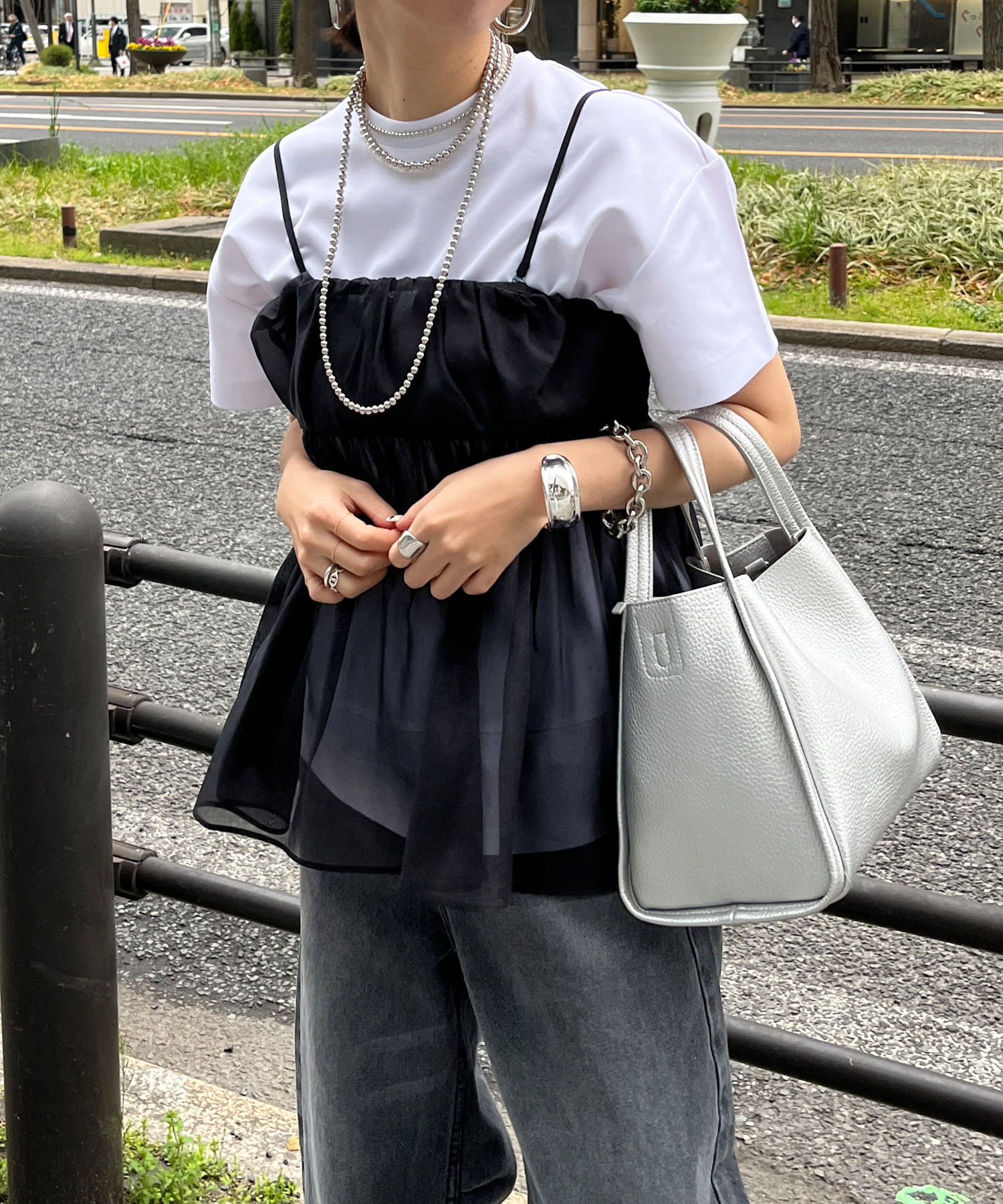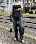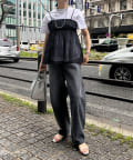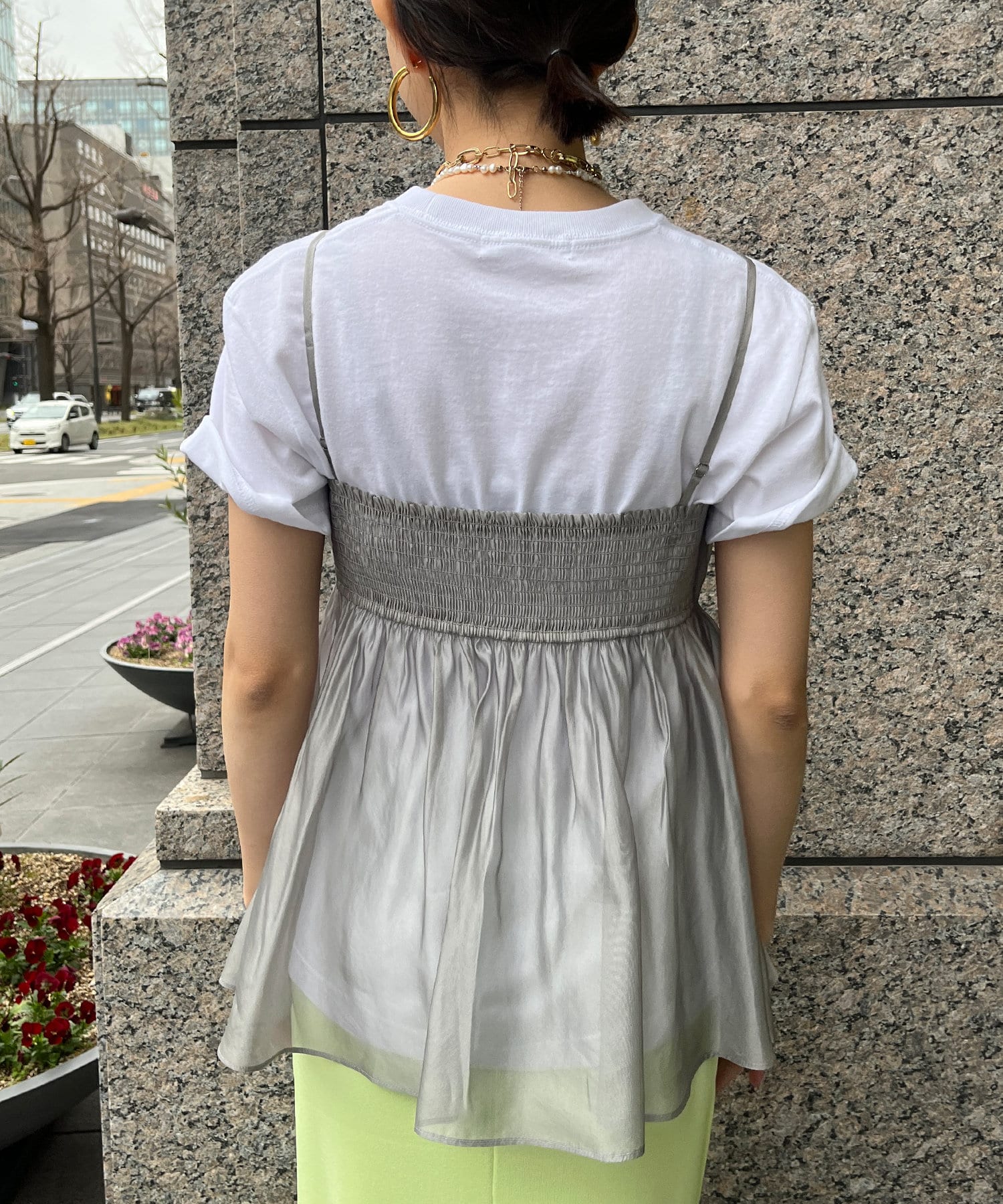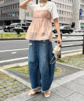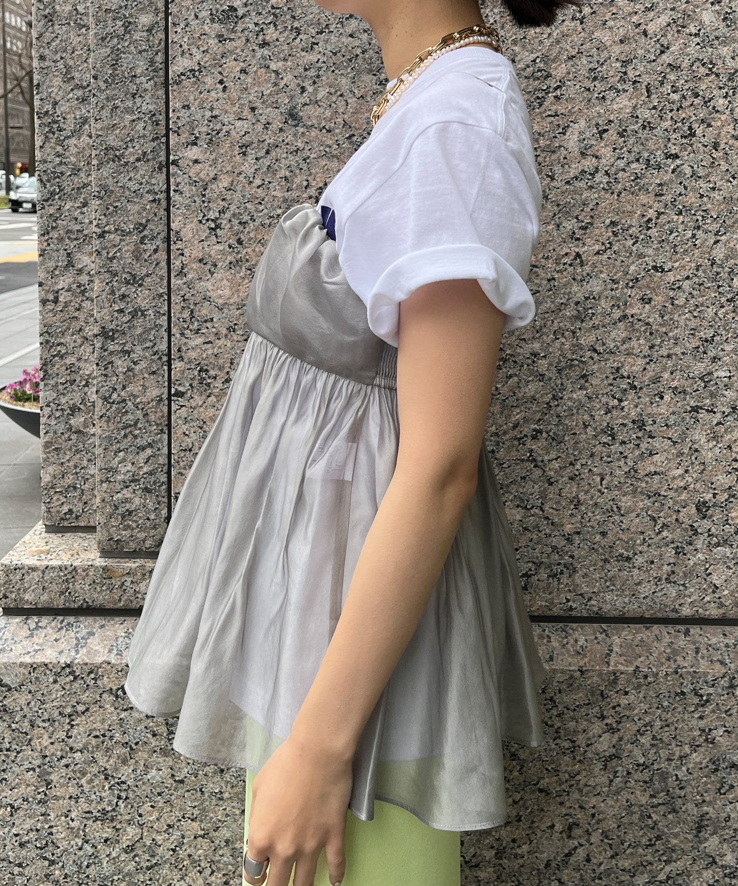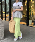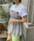 Tシャツとレイヤードするだけで甘くなりすぎず、簡単に今らしいスタイルが完成しますよ!