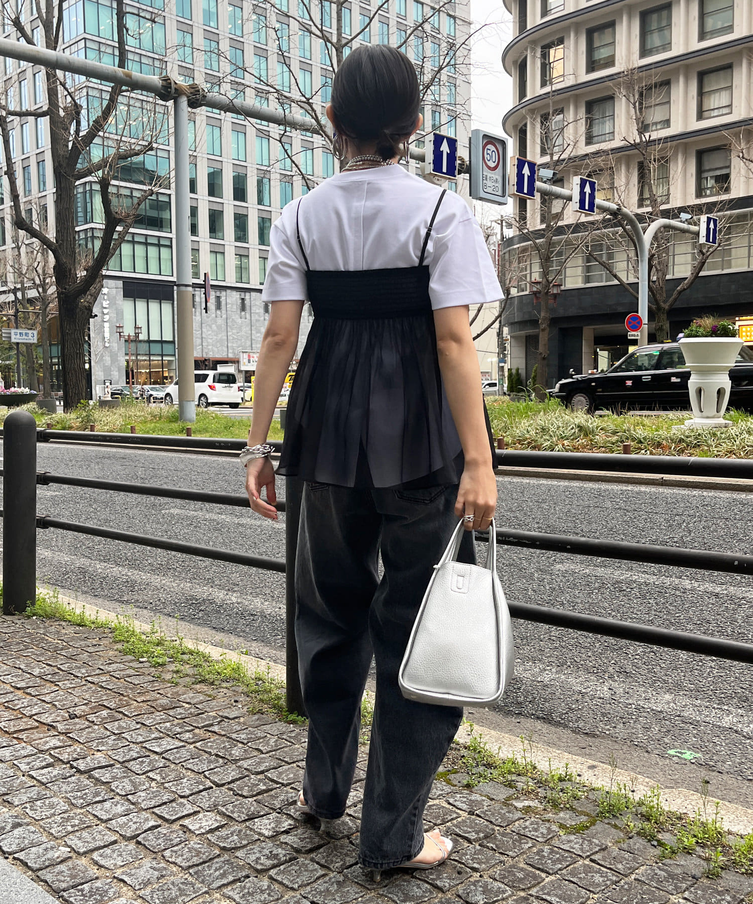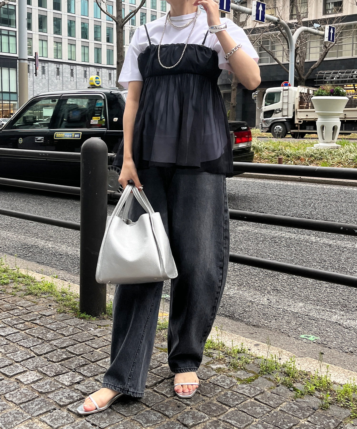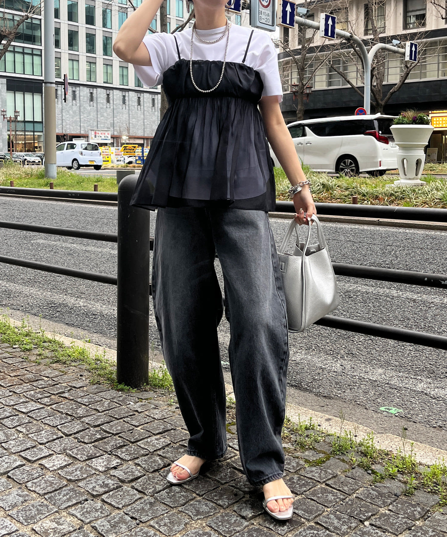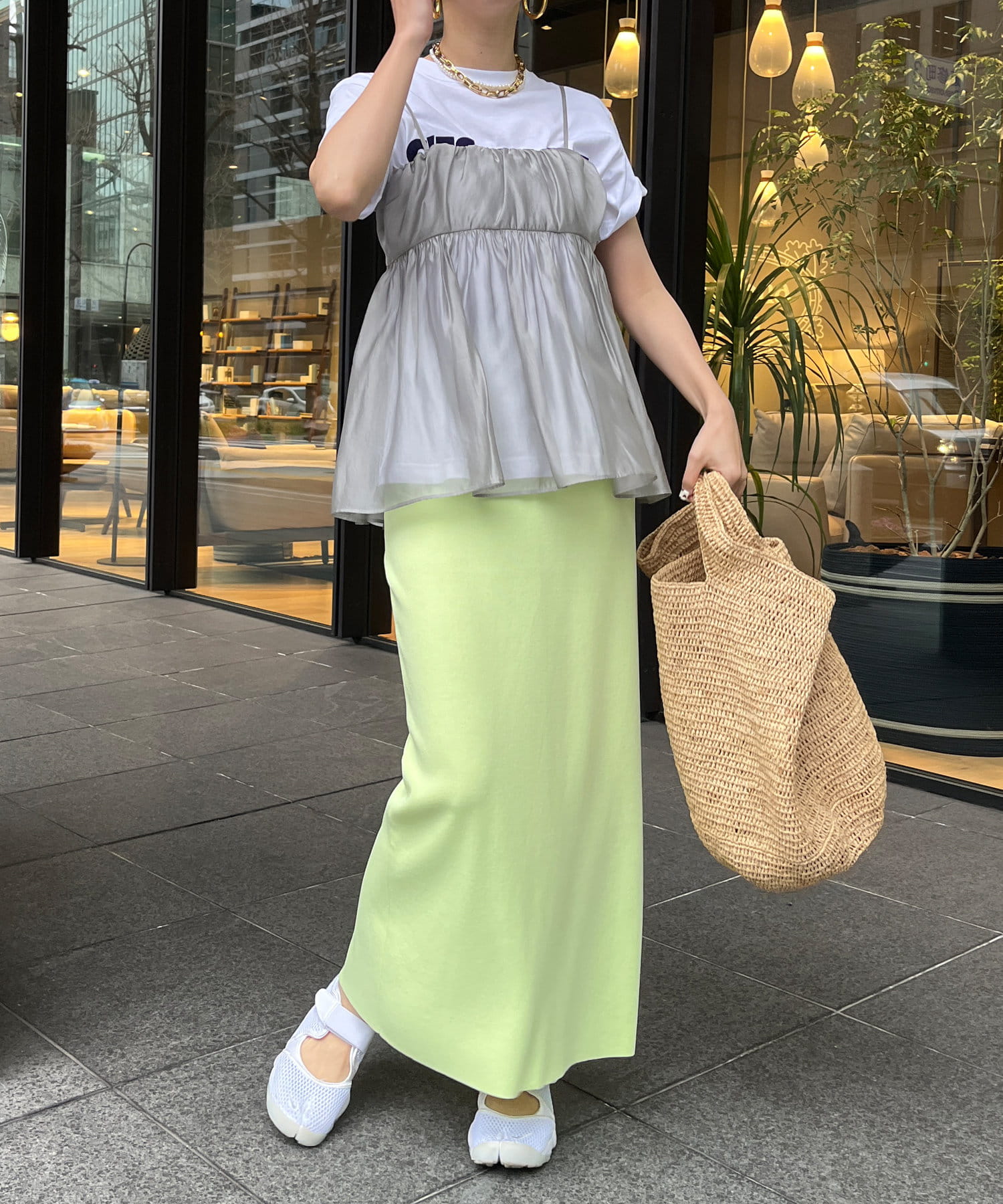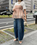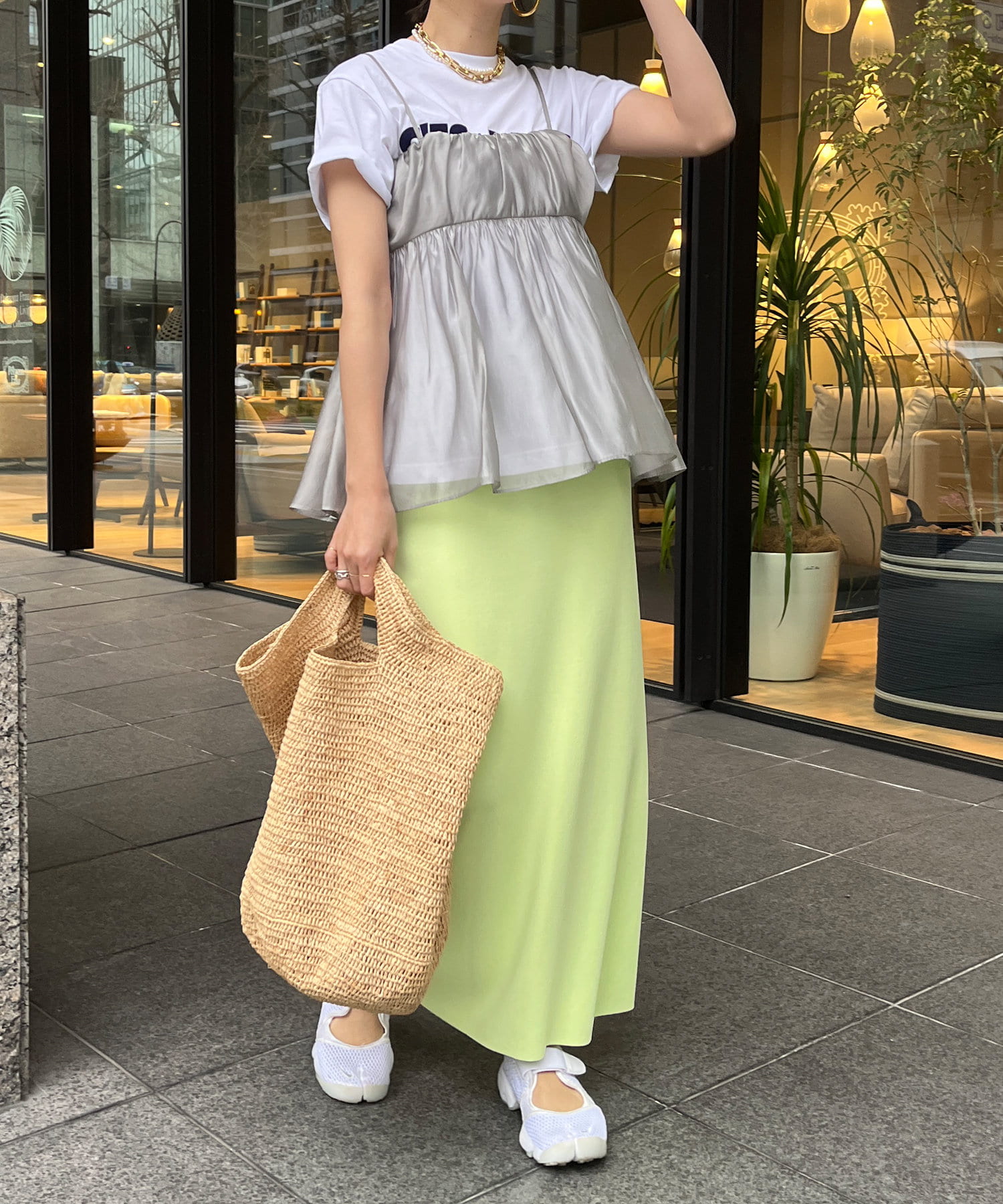 Tシャツとレイヤードするだけで甘くなりすぎず、簡単に今らしいスタイルが完成しますよ!