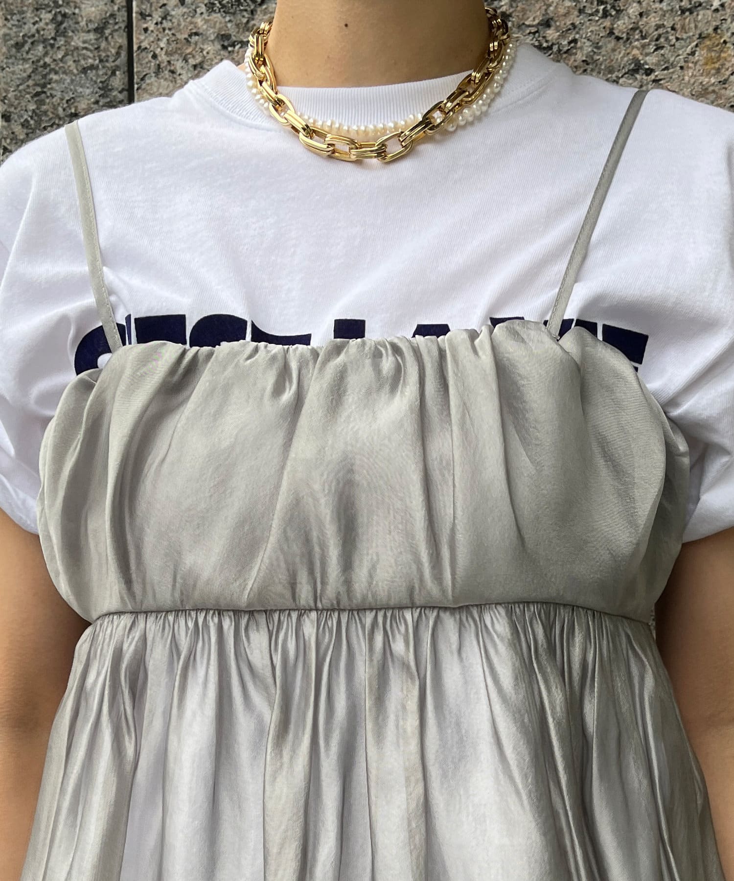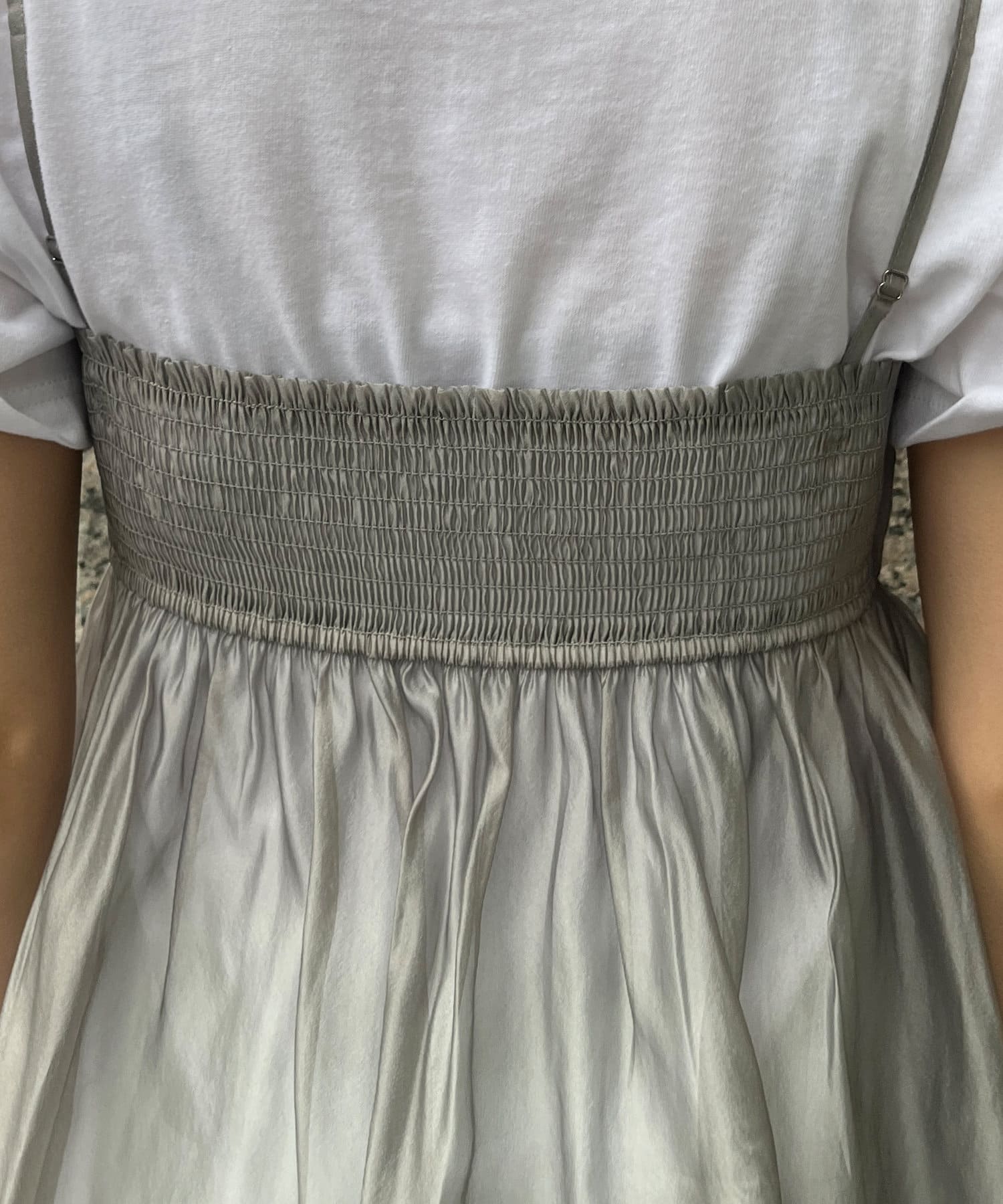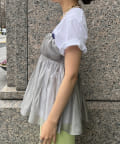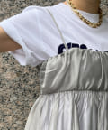 胸下からフレアに広がるシルエットに、華奢な肩紐が抜け感をプラス。