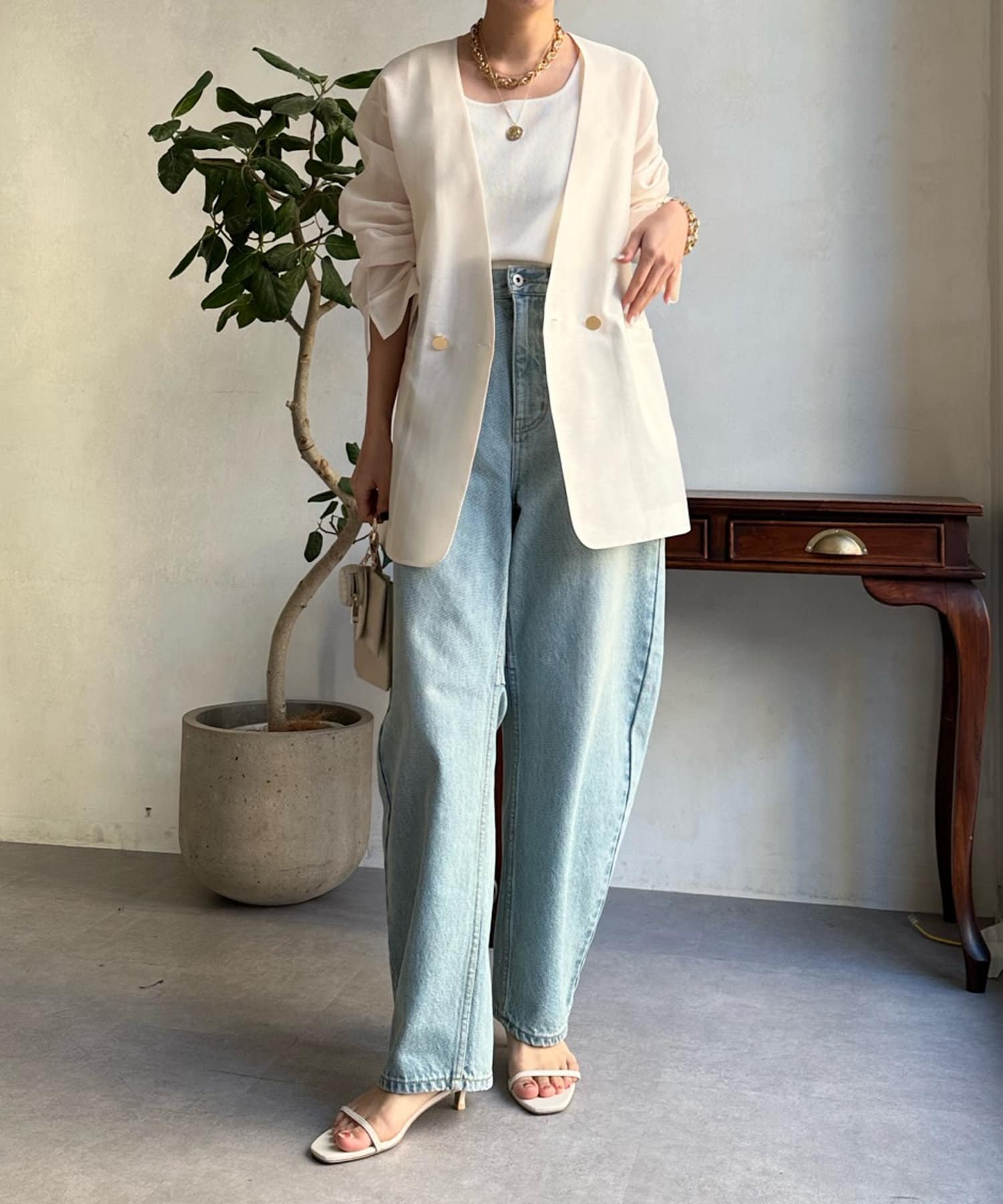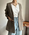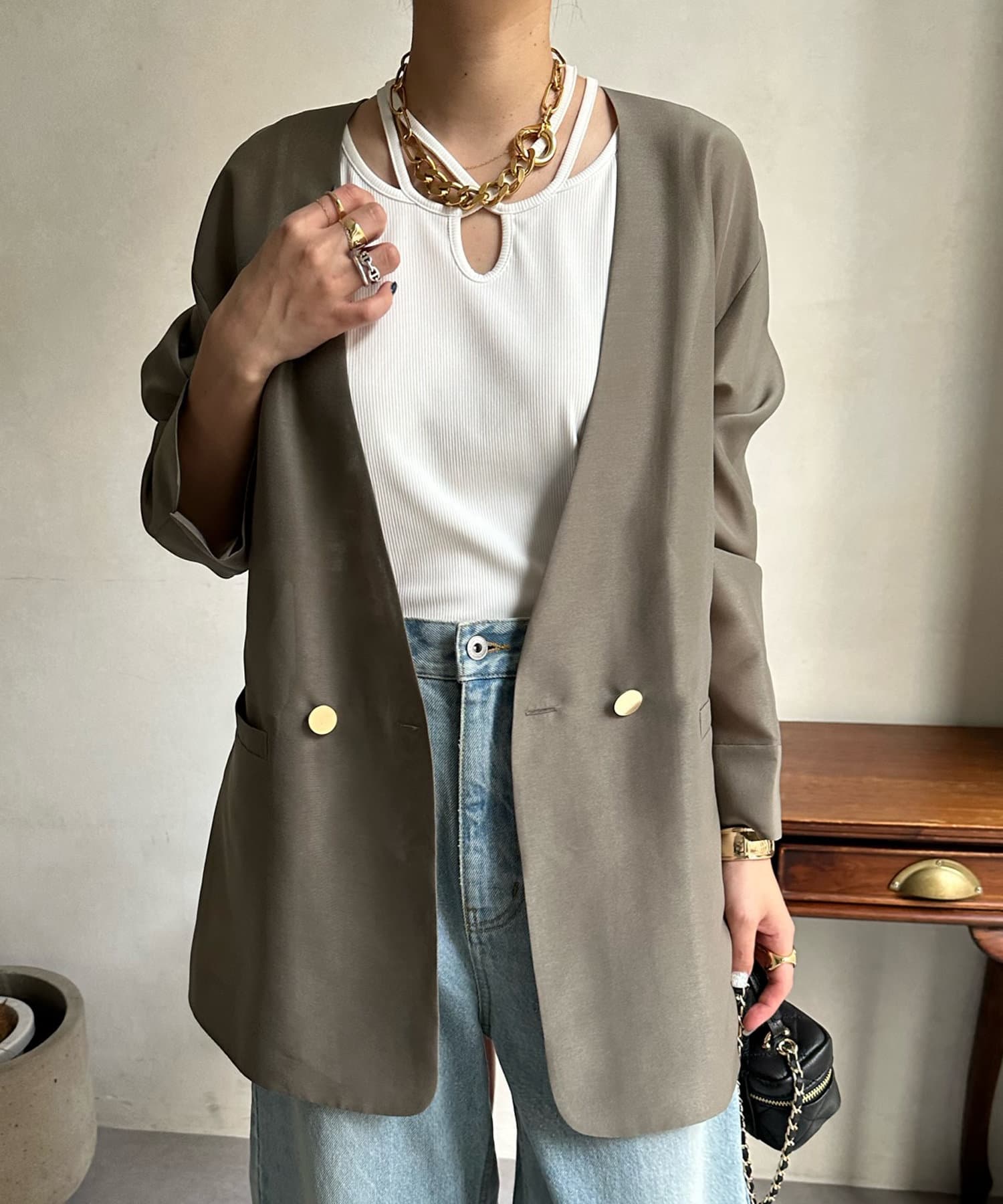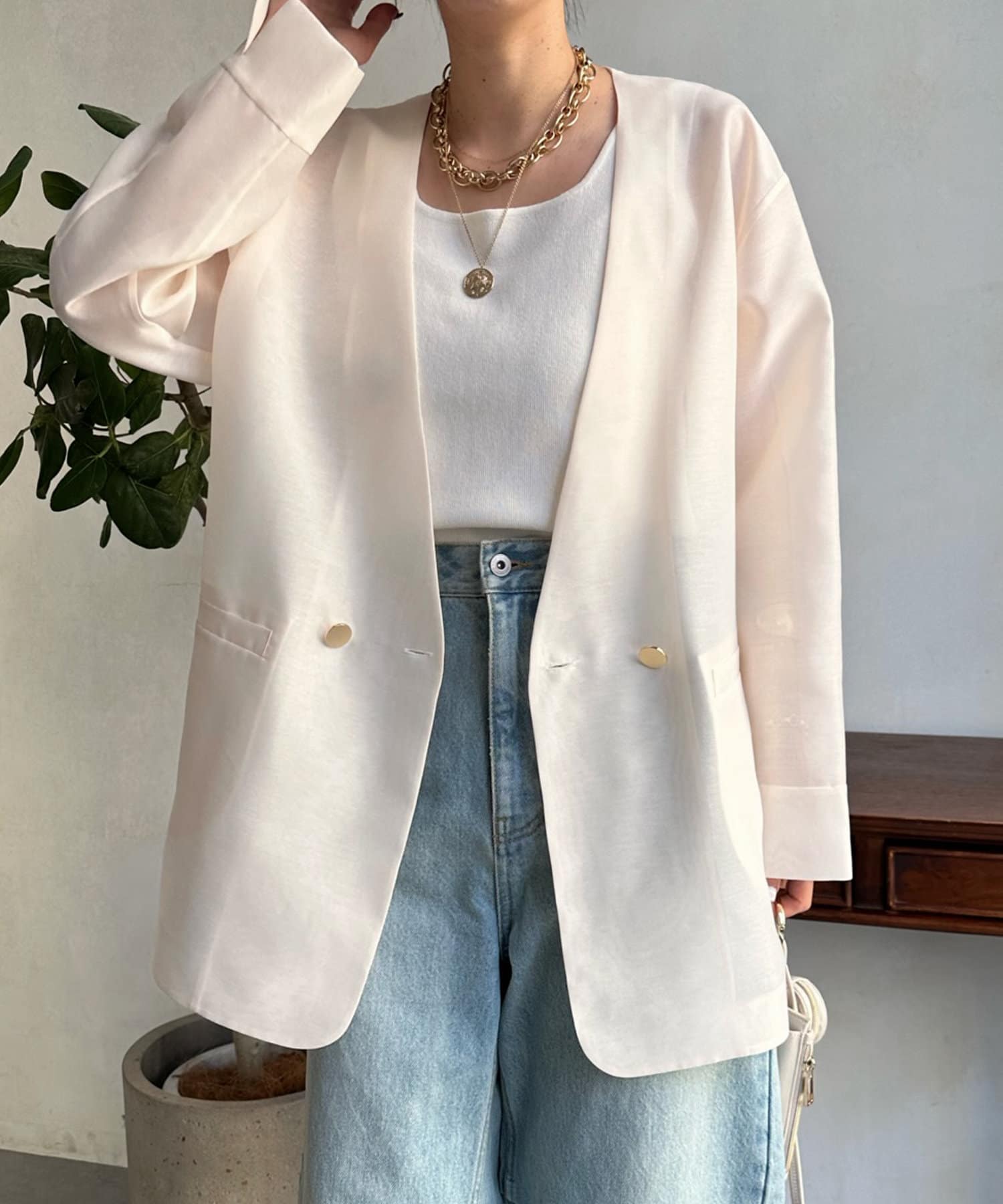 顔周りをすっきりと、季節感をぐっと上げてくれるノーカラージャケット。