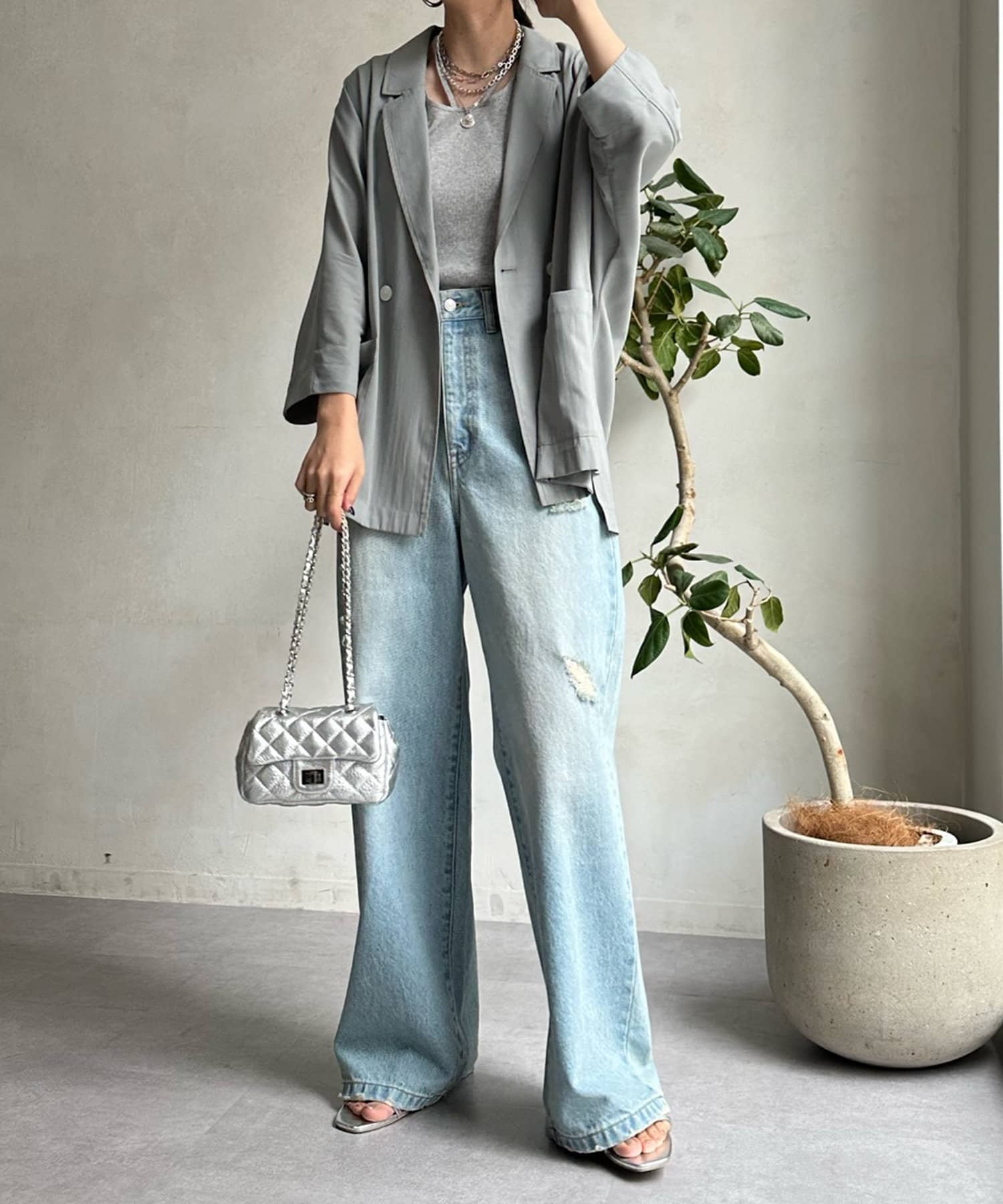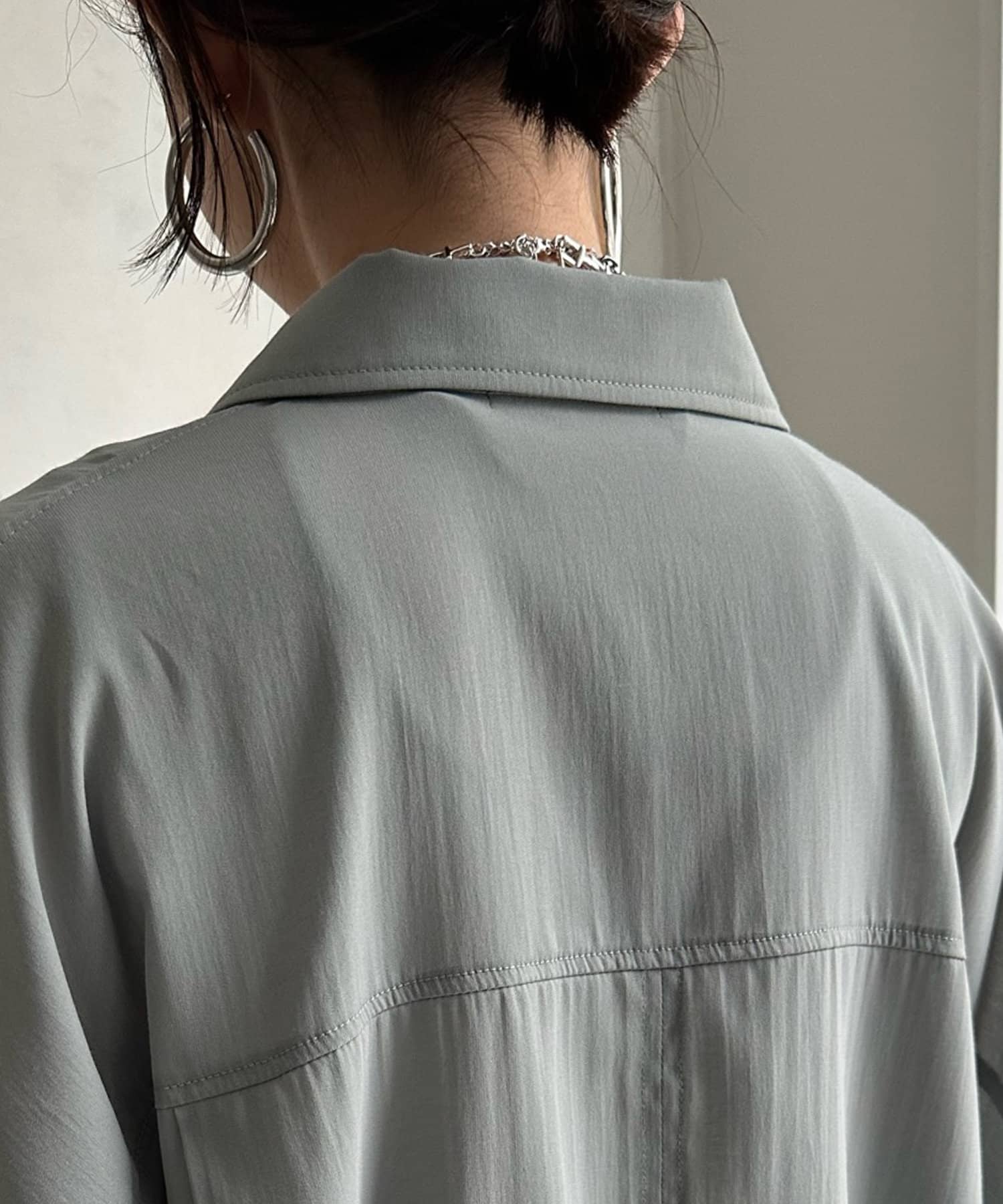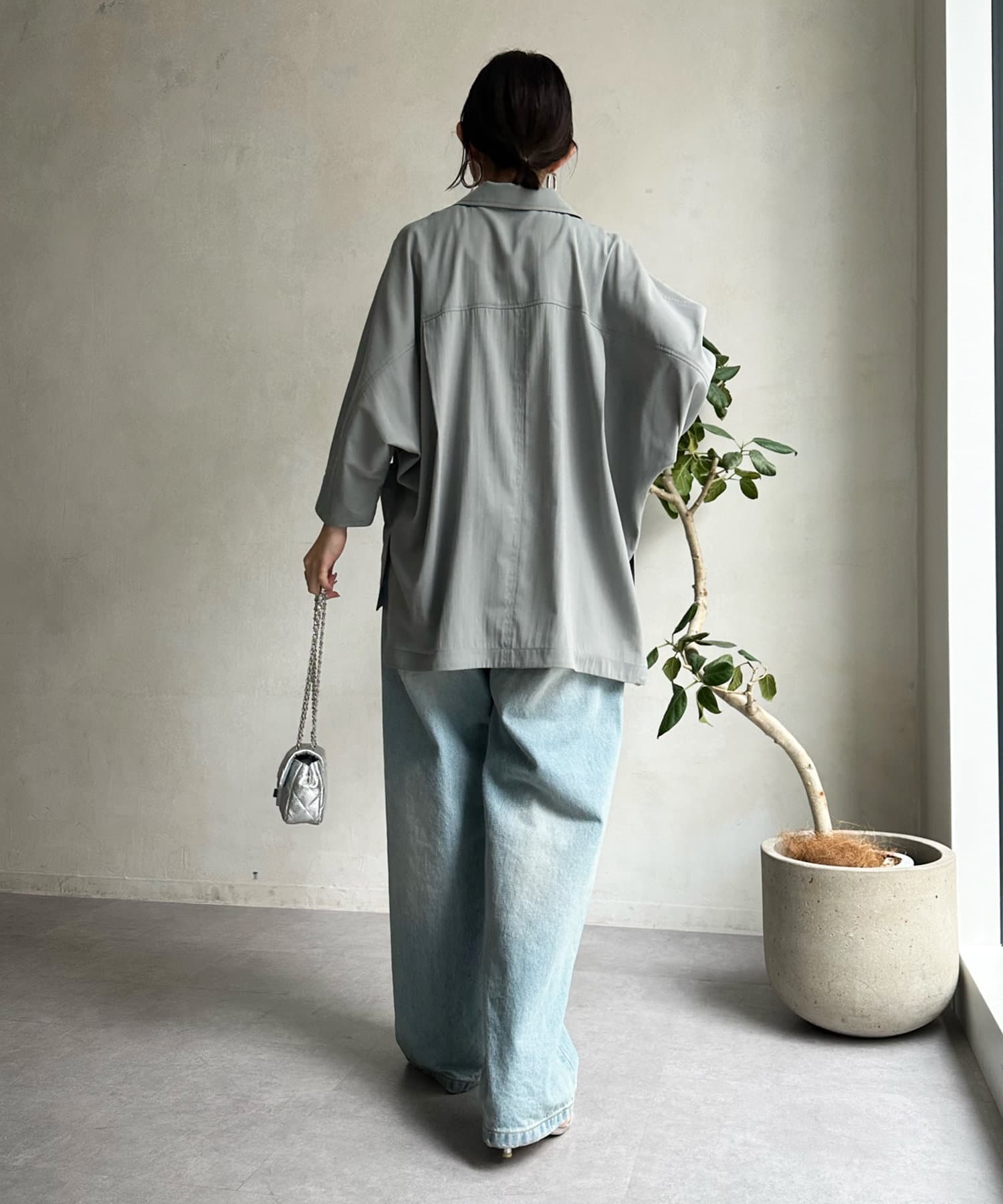 透けすぎない、品のあるシアー感が大人らしさを演出。そして、お袖のドルマンシルエットで抜け感をプラスしました。