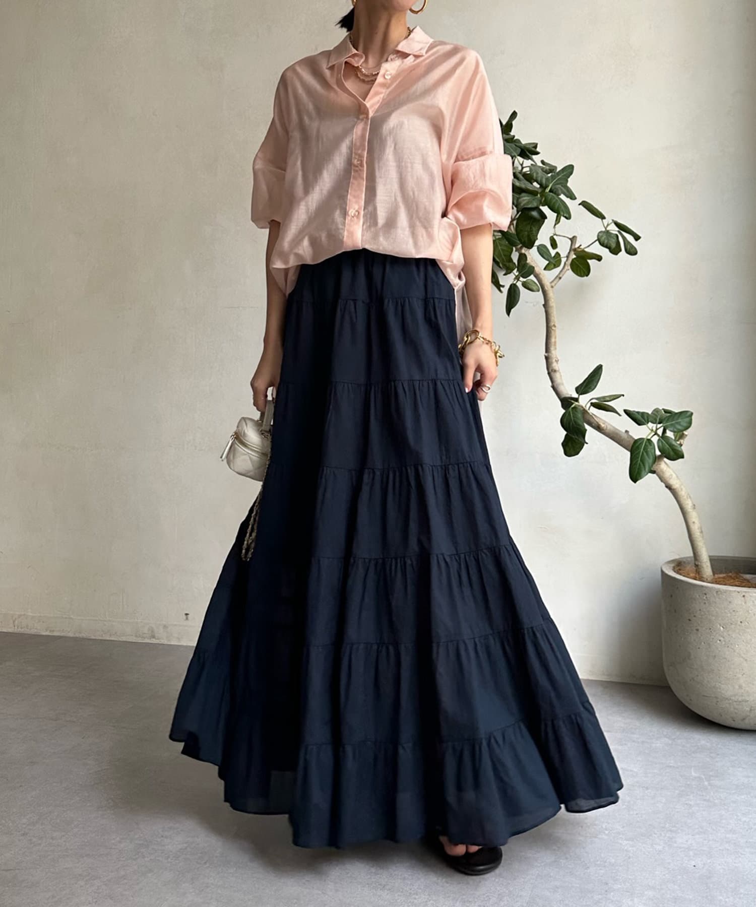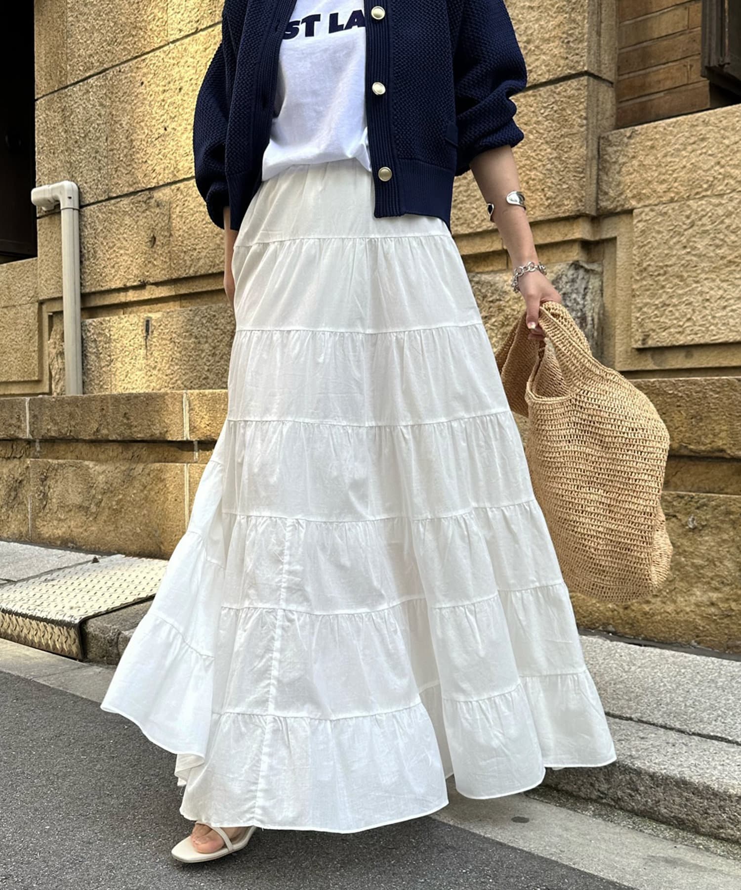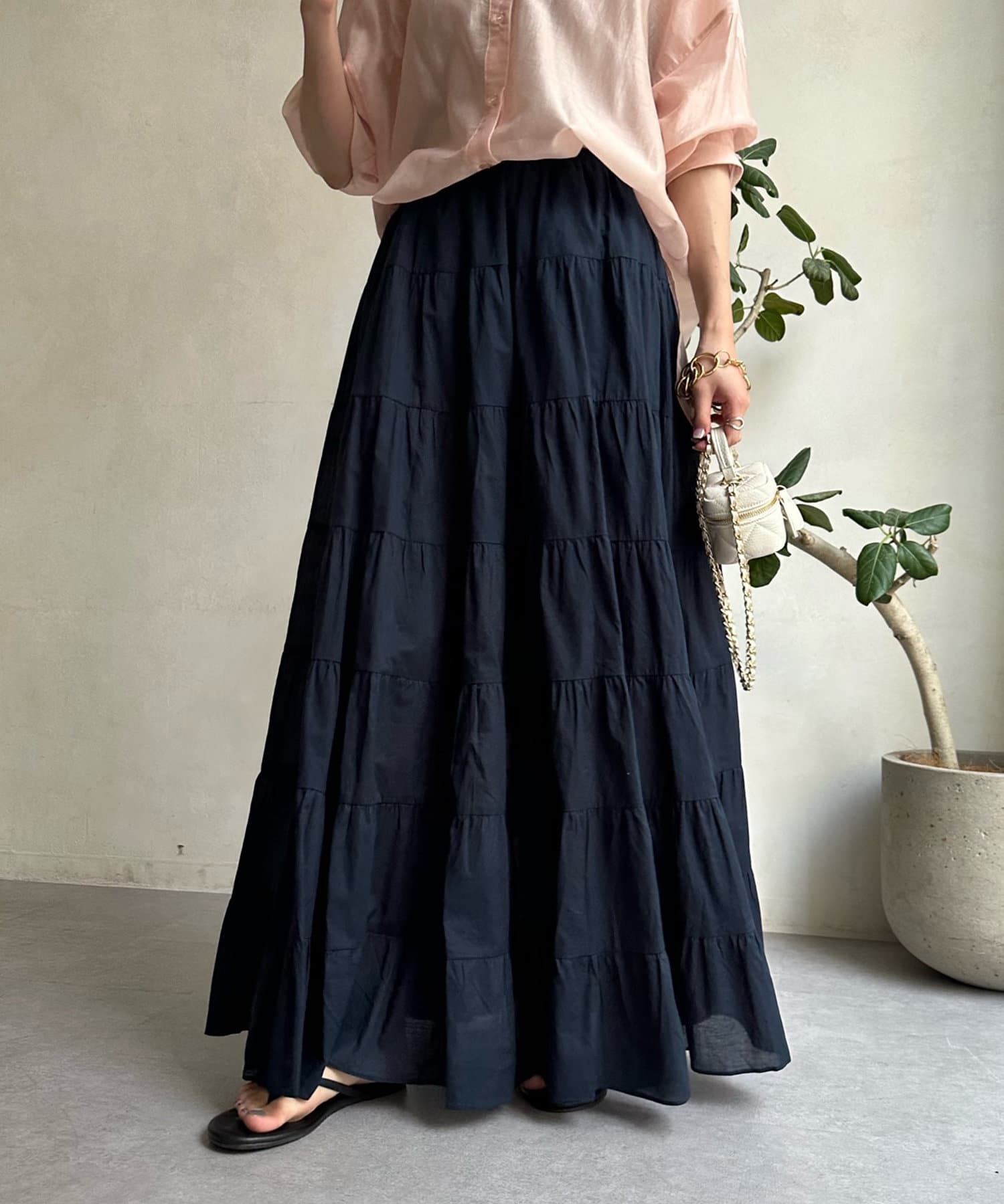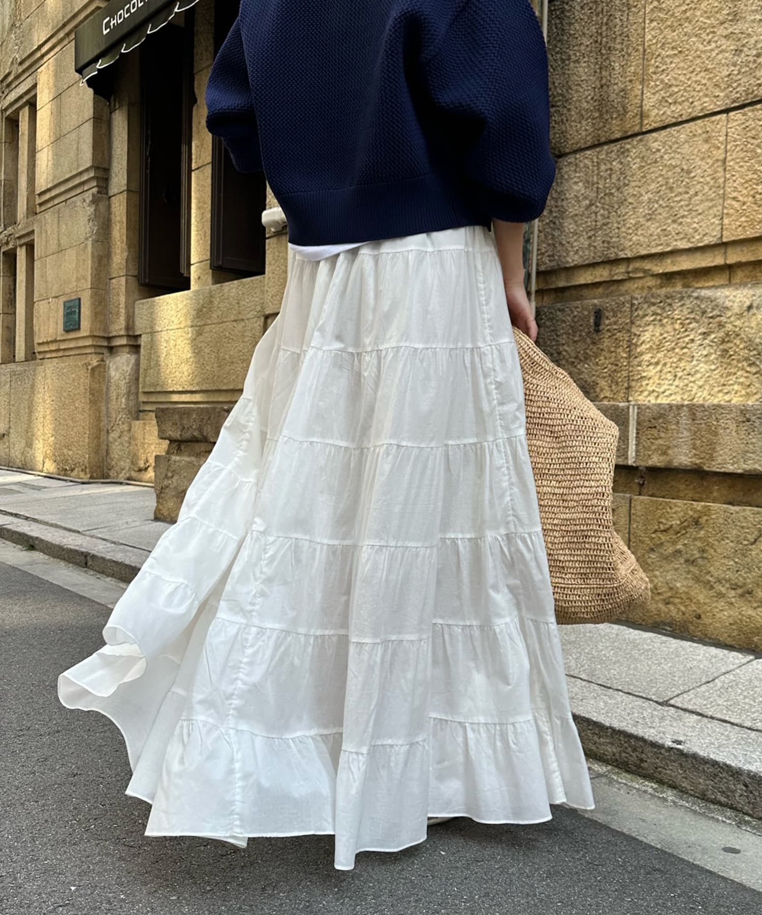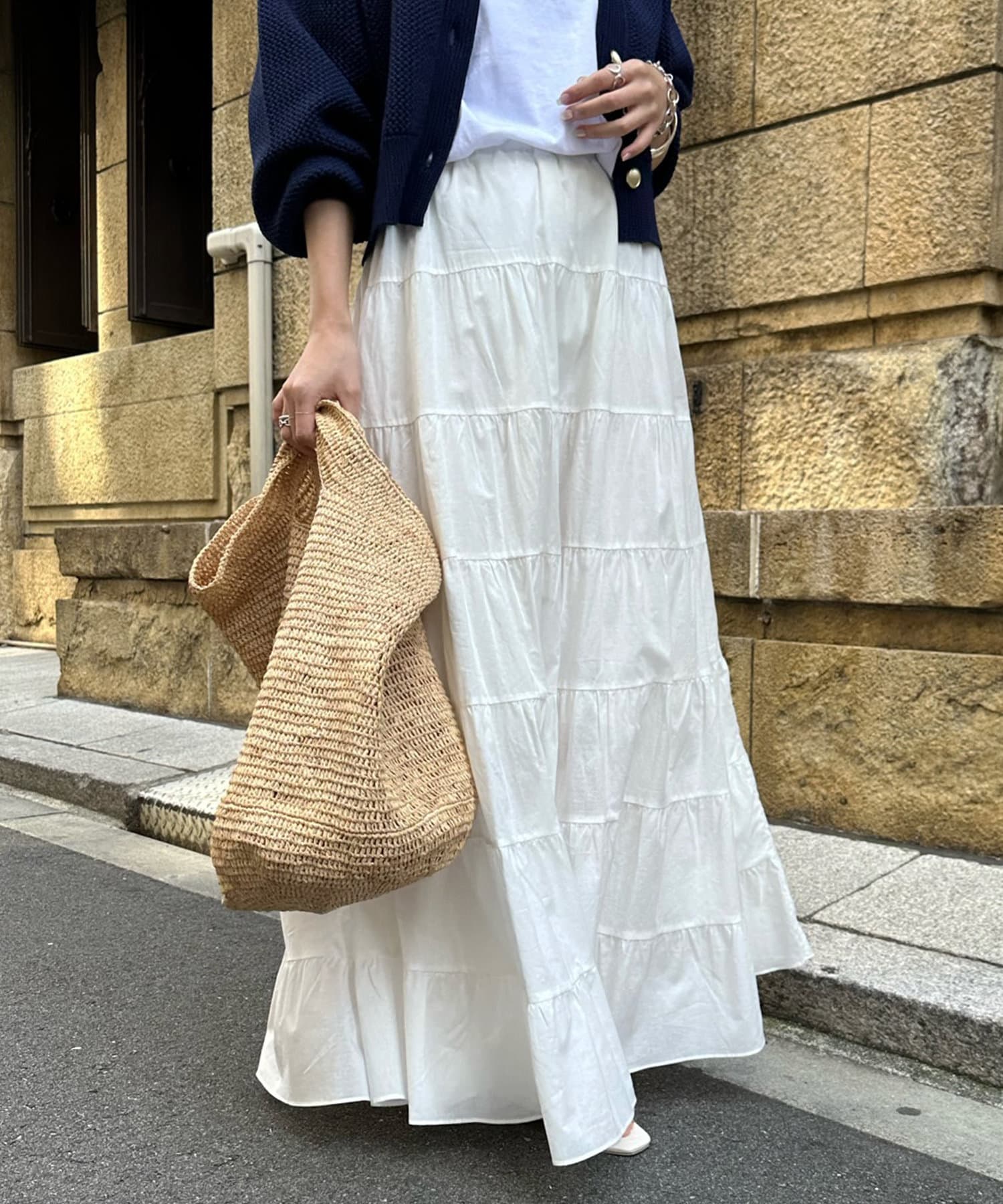 たっぷりのティアードが、歩くたびに揺れるシルエットを作ります。