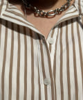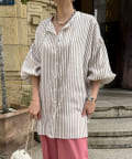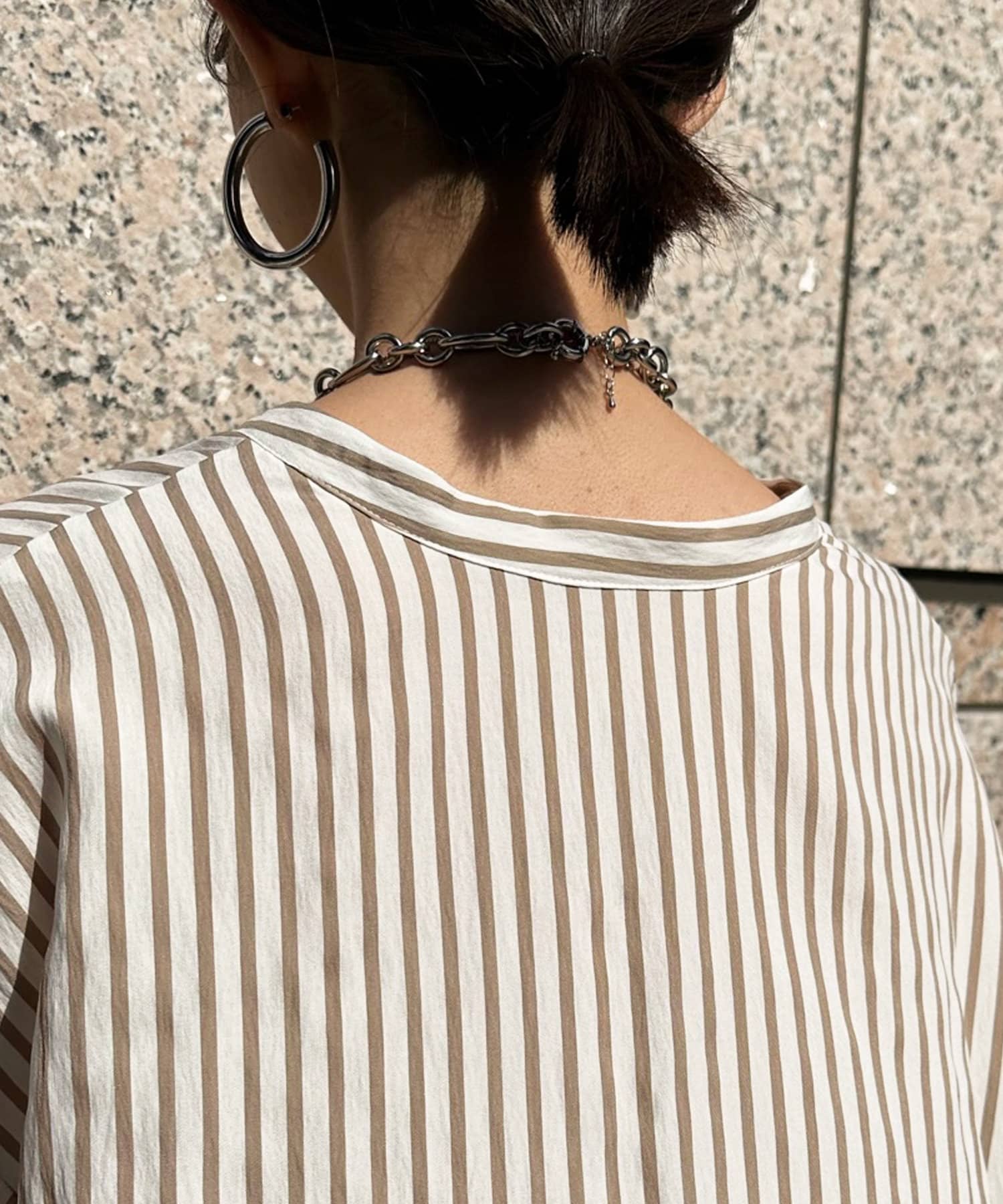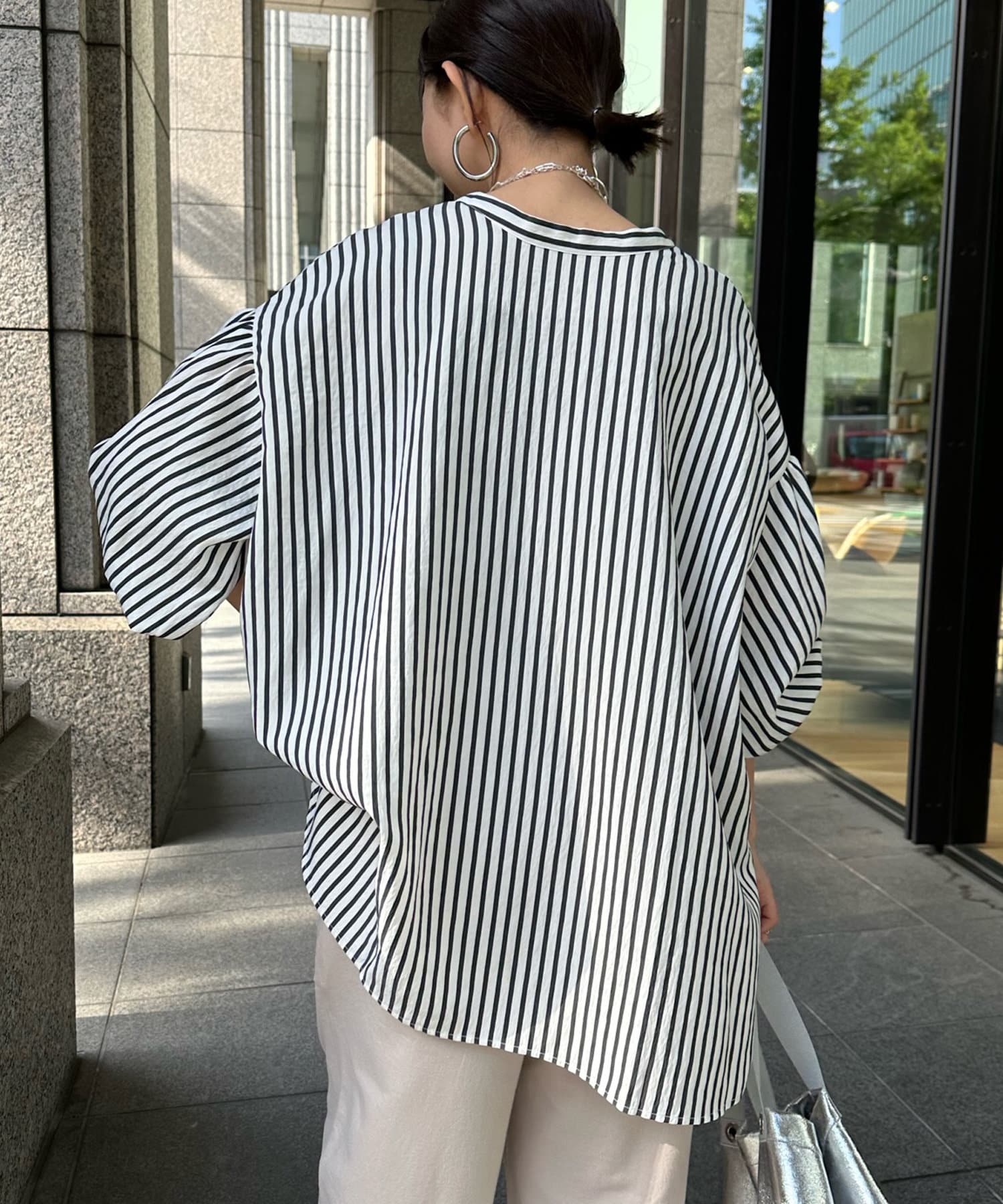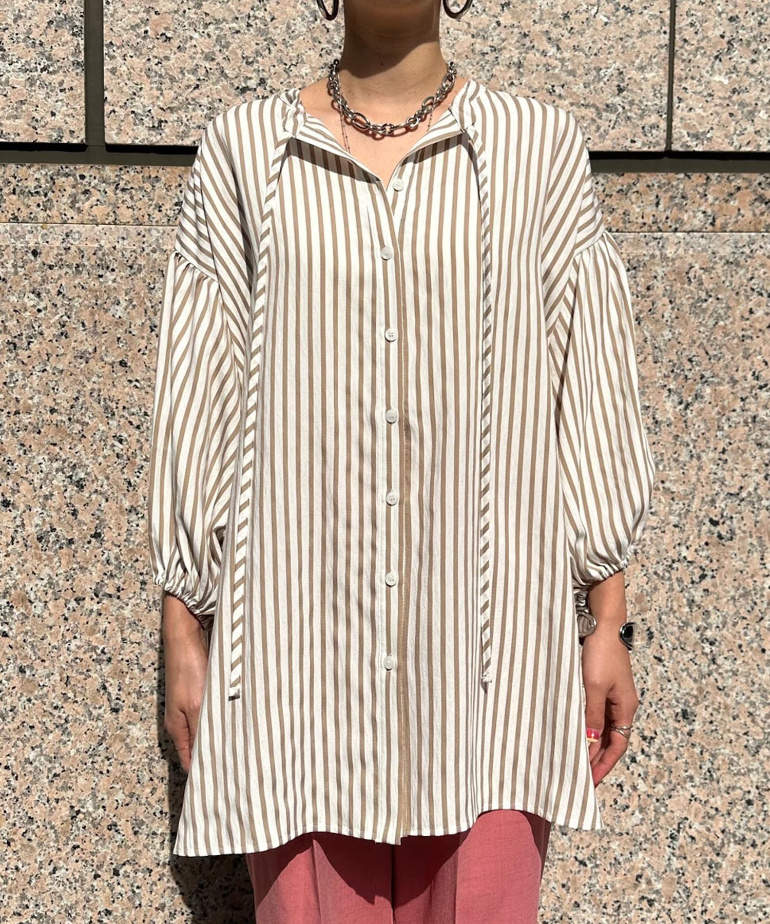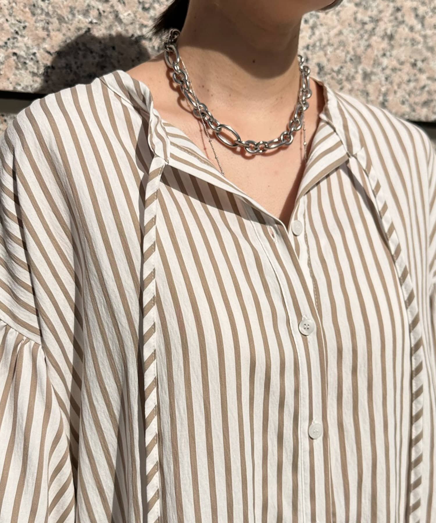 お顔周りがすっきりと見えるスキッパーデザインで、首元にはトレンド感のあるリボンをプラス。