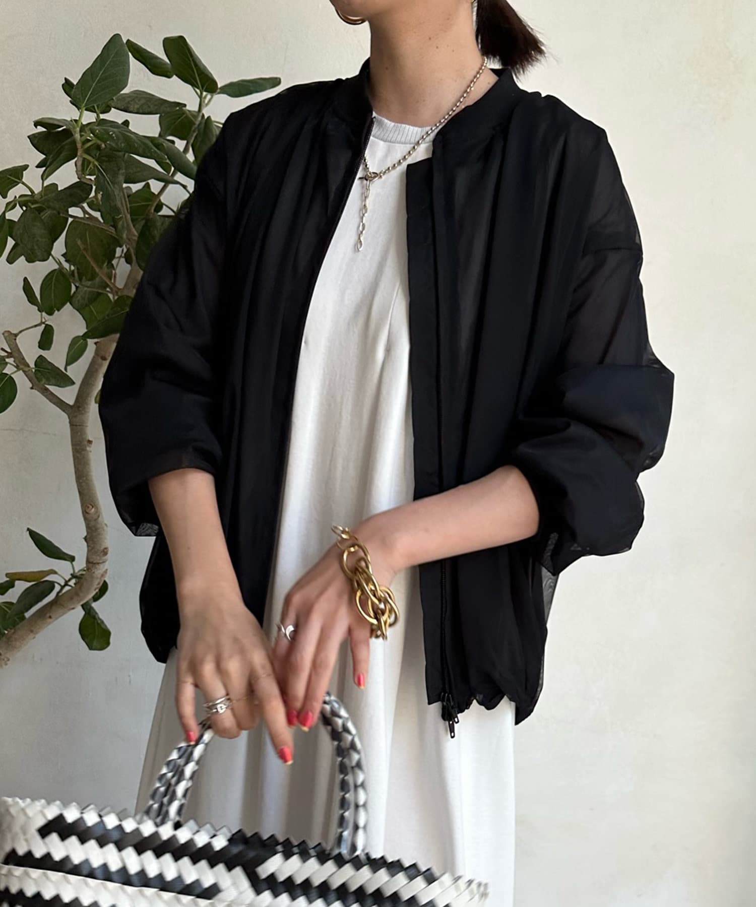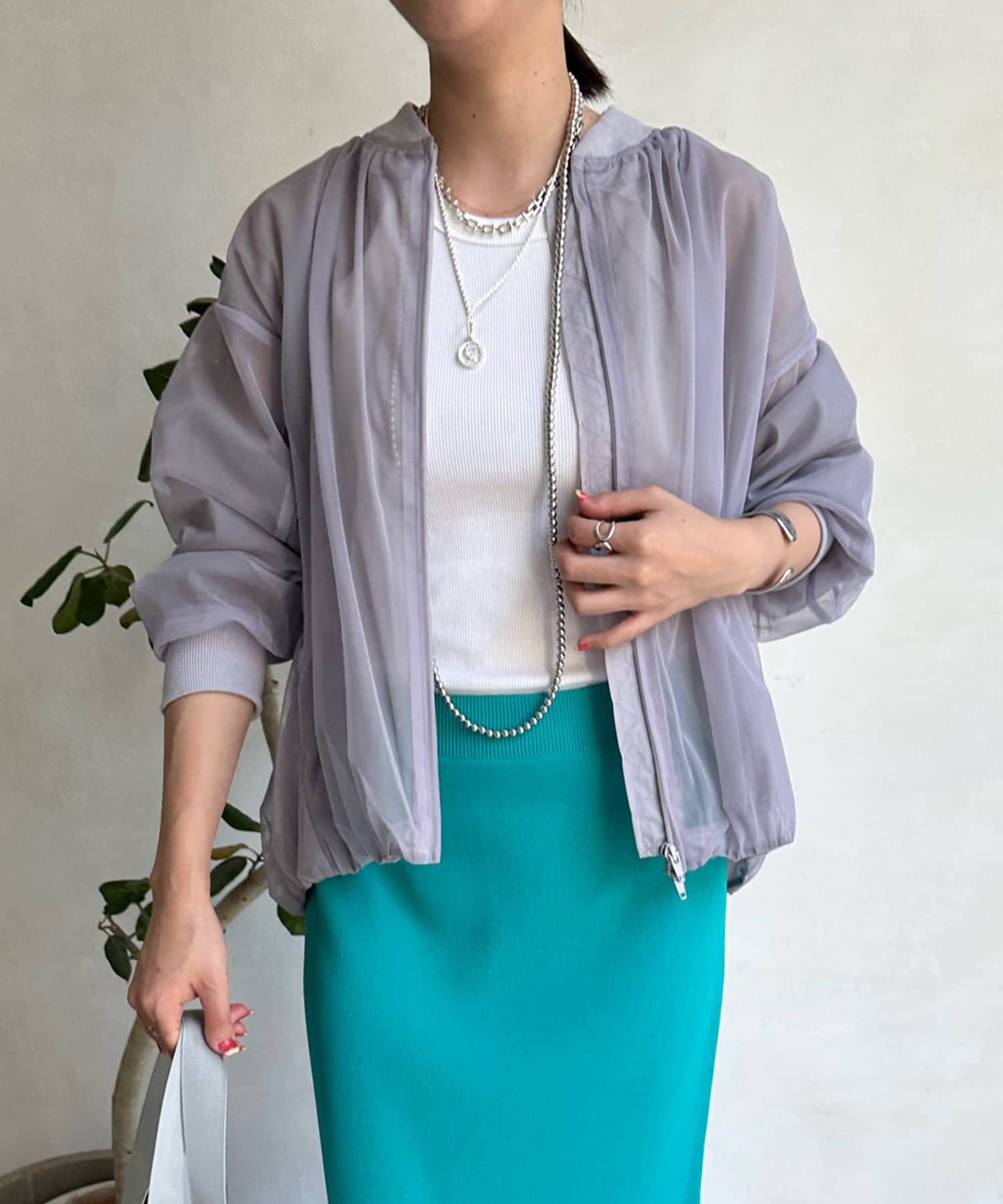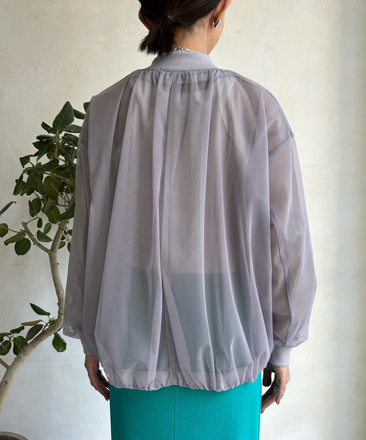 カジュアルアイテムとして活躍してくれるブルゾンですが、落ち着きのあるカラーリングとチュールギャザーが上品な女性らしさを演出。