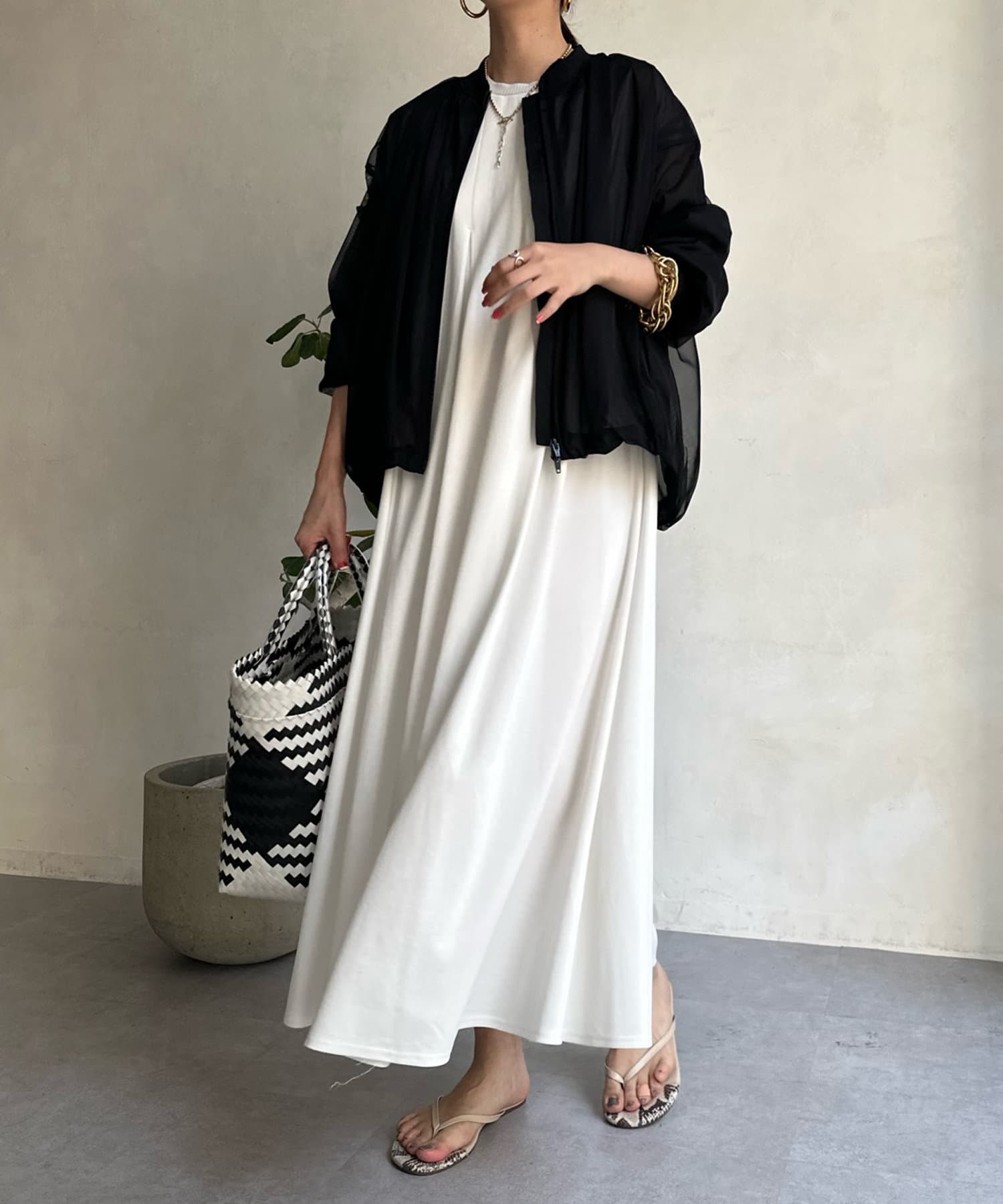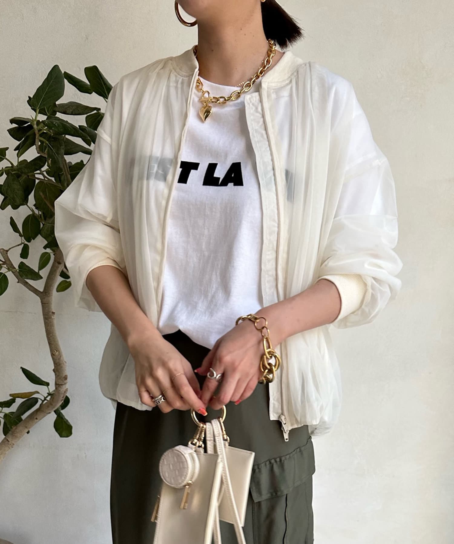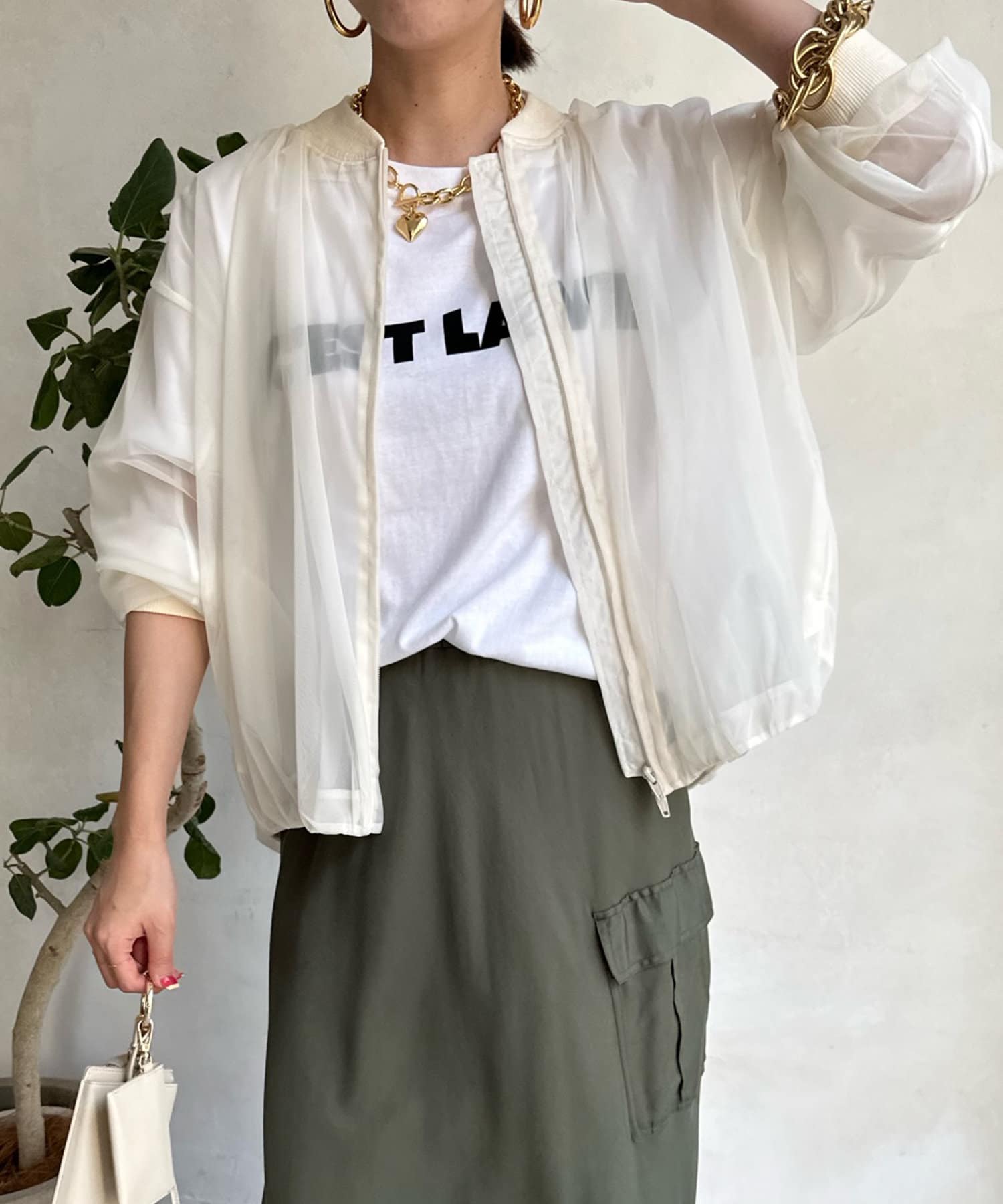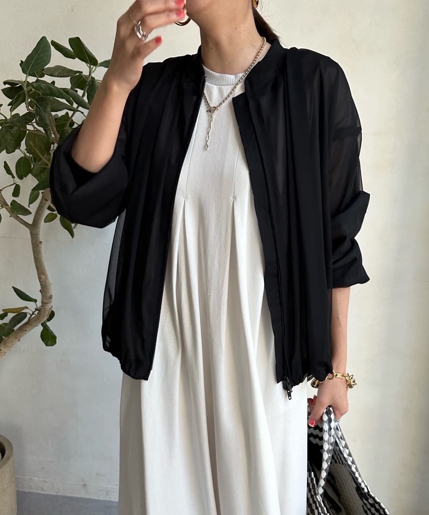 カジュアルアイテムとして活躍してくれるブルゾンですが、落ち着きのあるカラーリングとチュールギャザーが上品な女性らしさを演出。