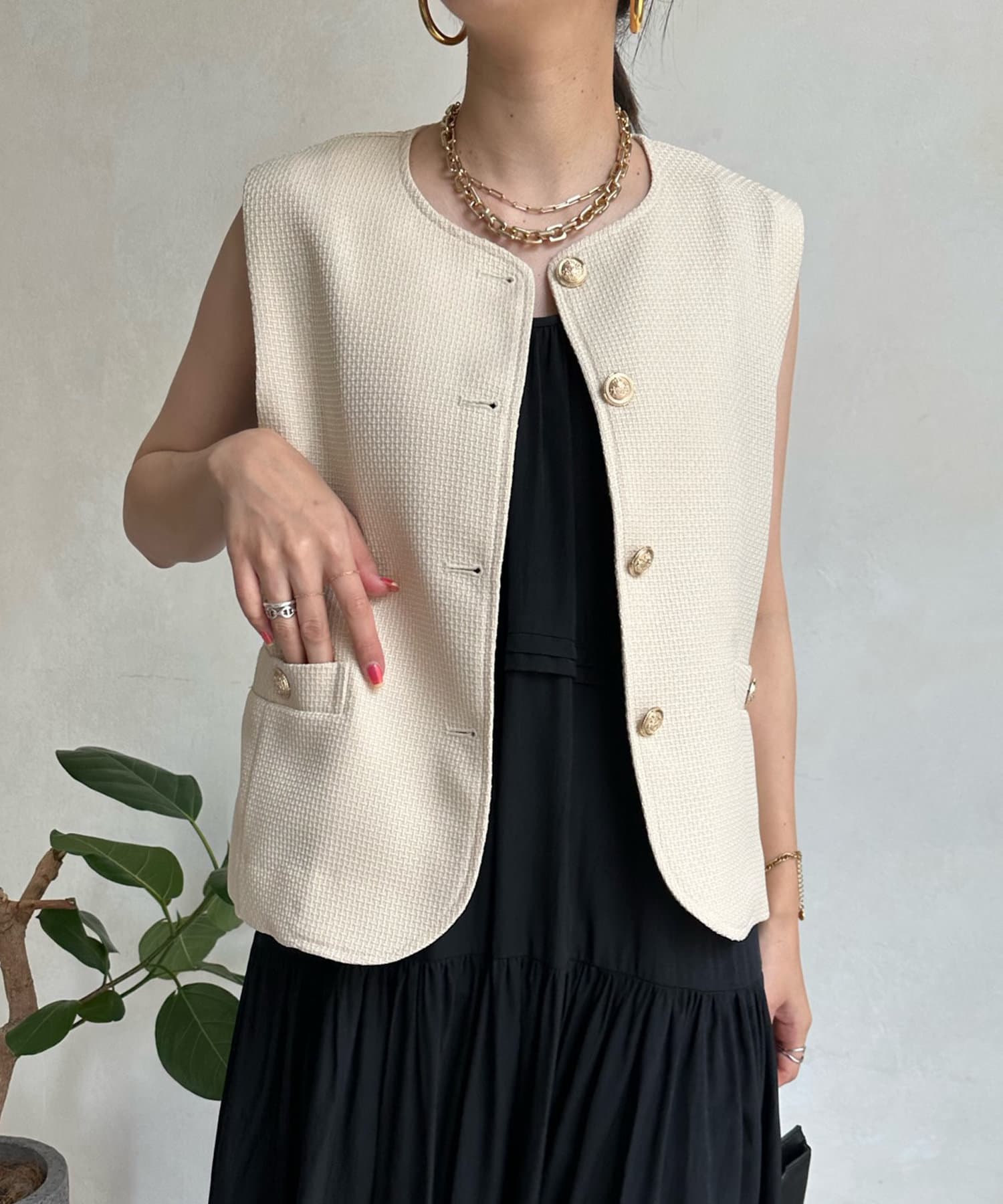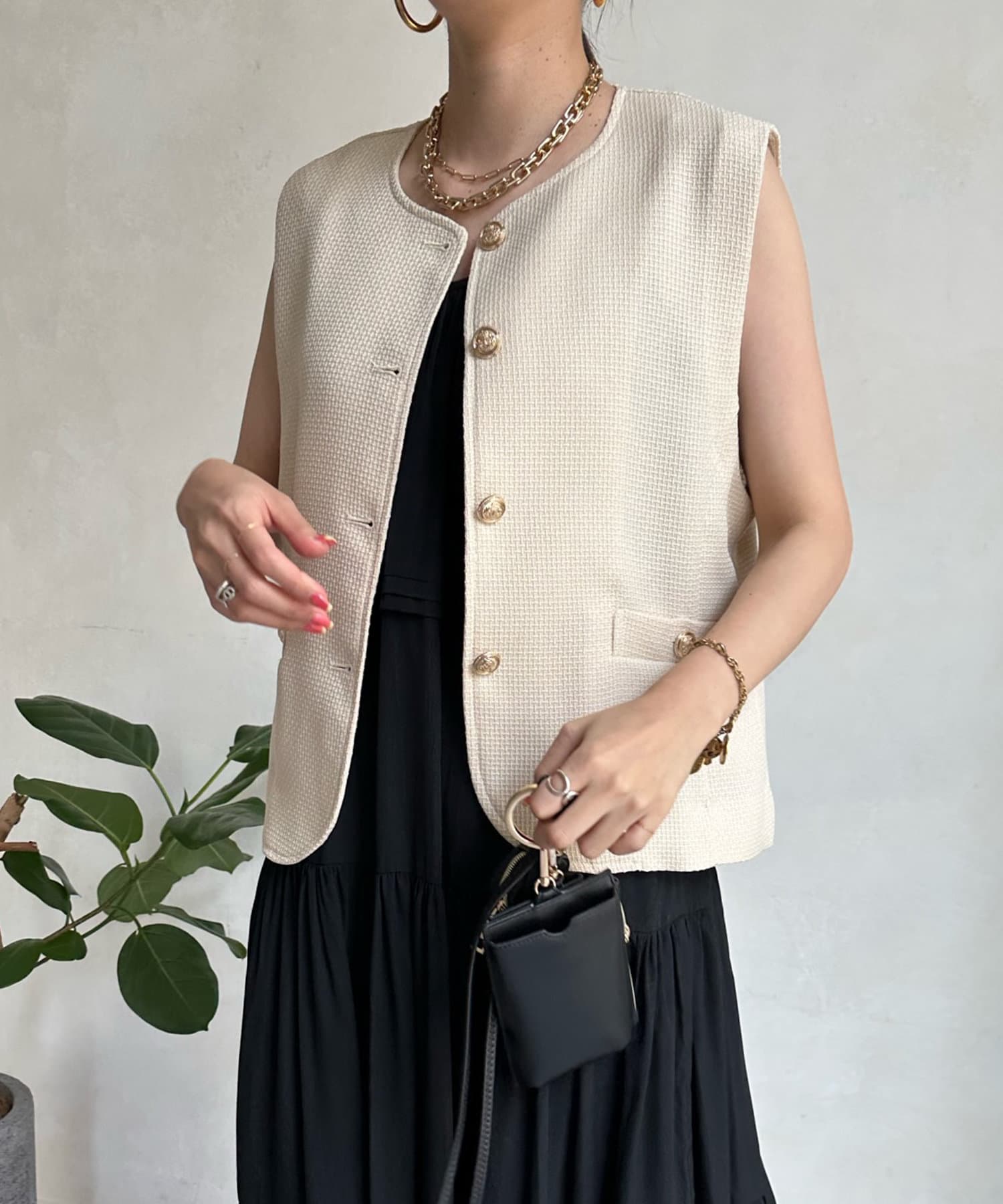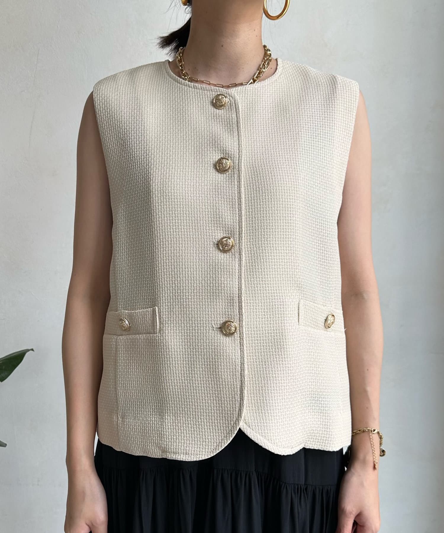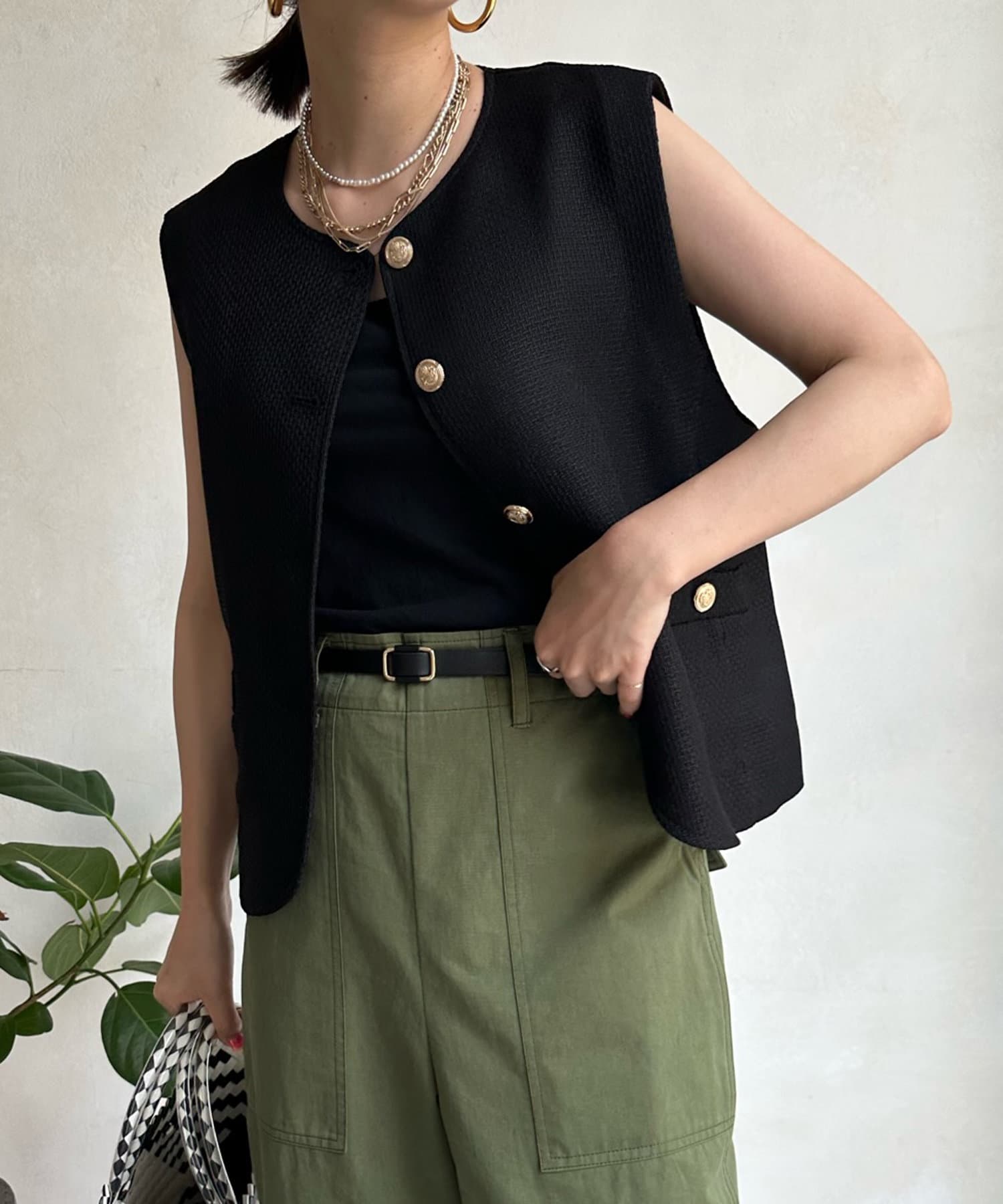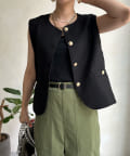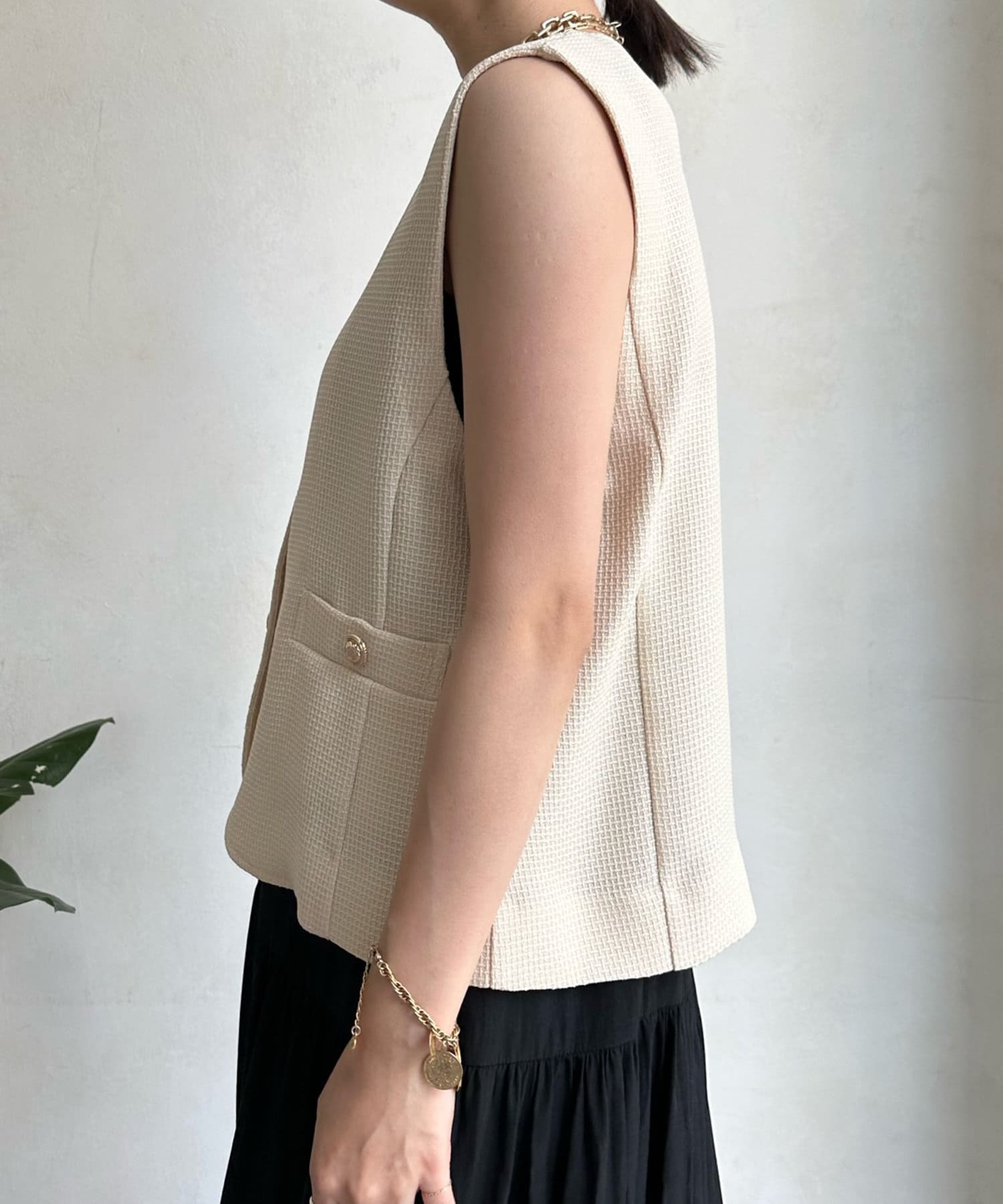 トレンドのツイード素材を使ったショート丈ベスト。