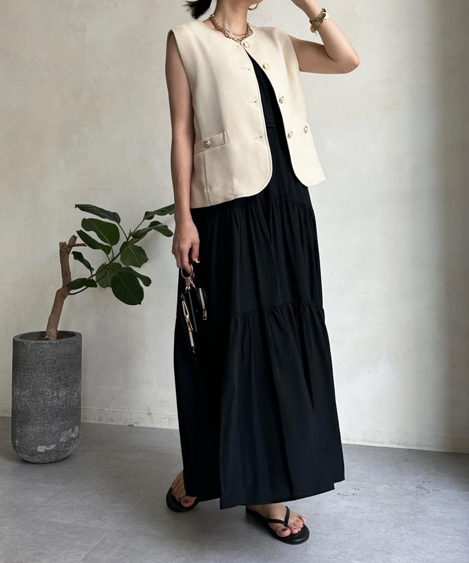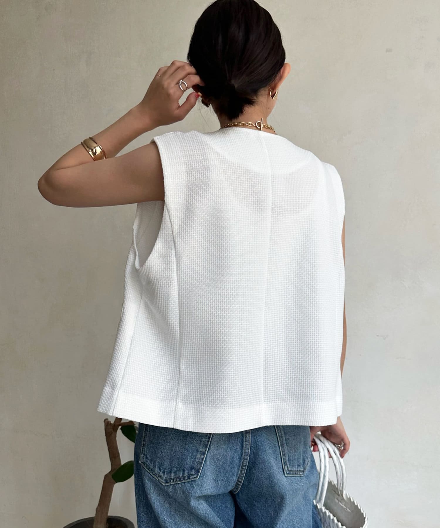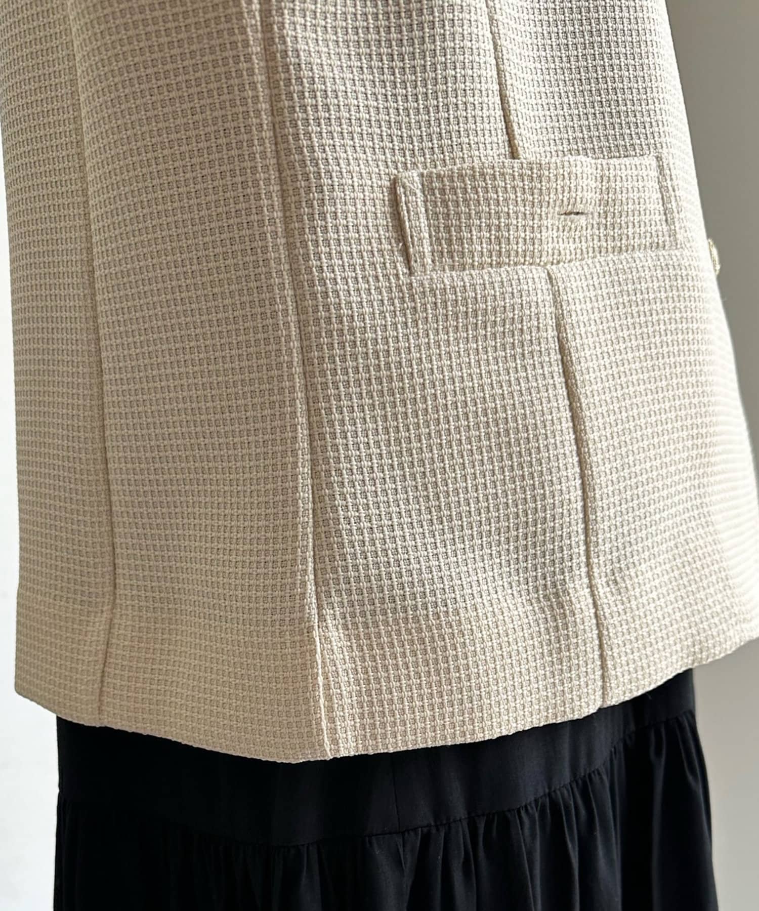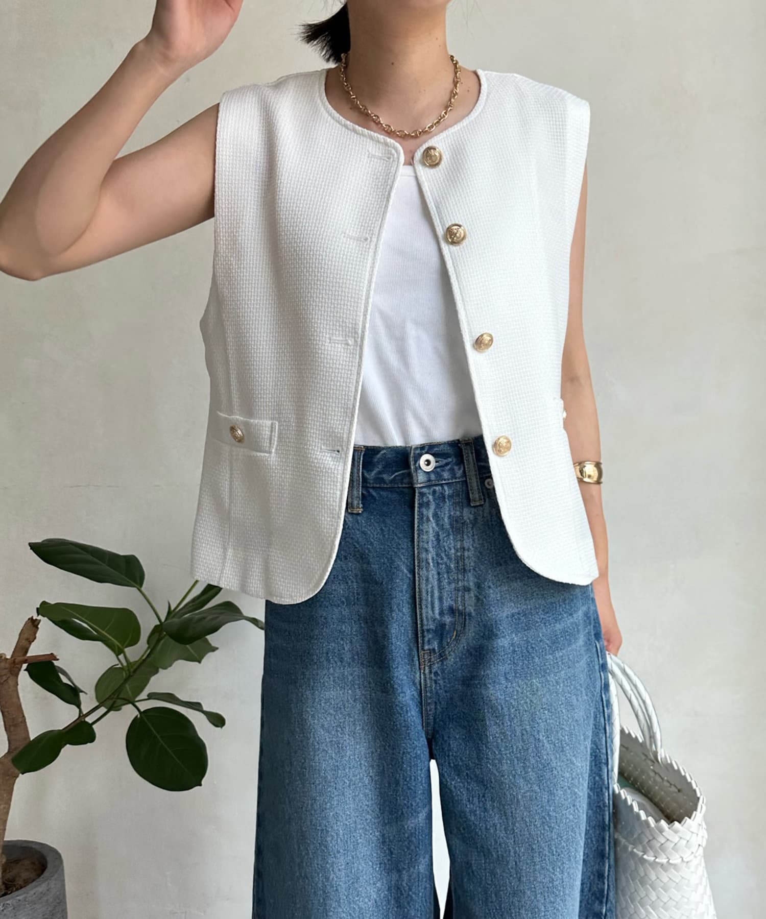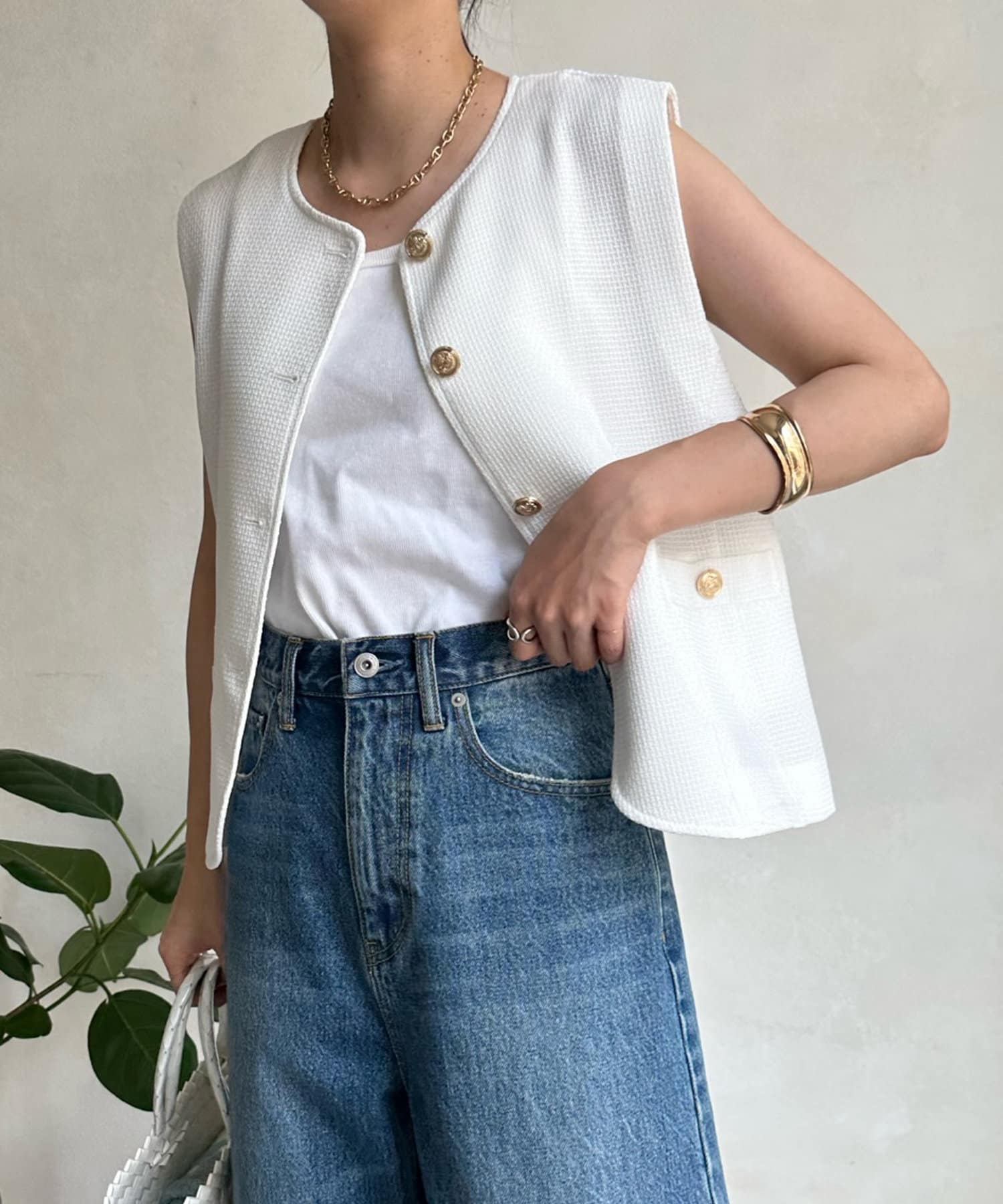 トレンドのツイード素材を使ったショート丈ベスト。