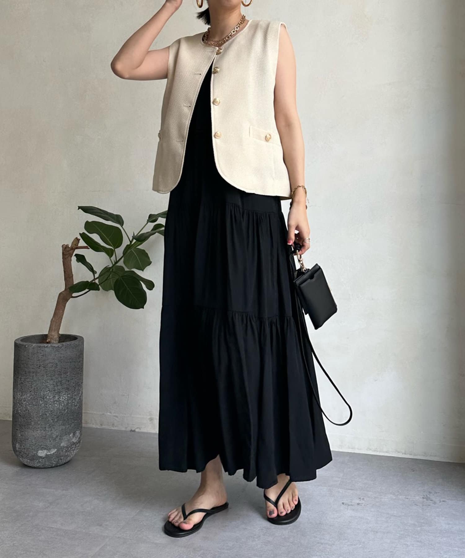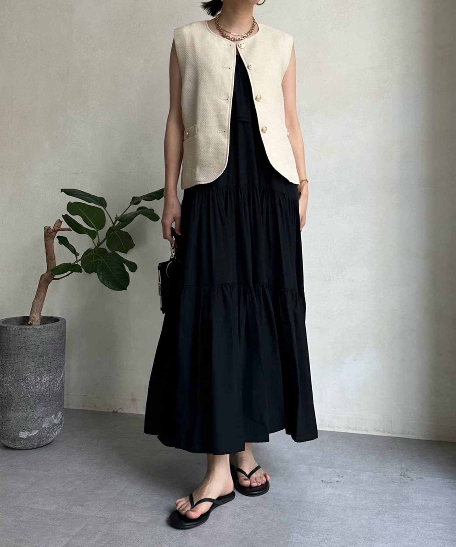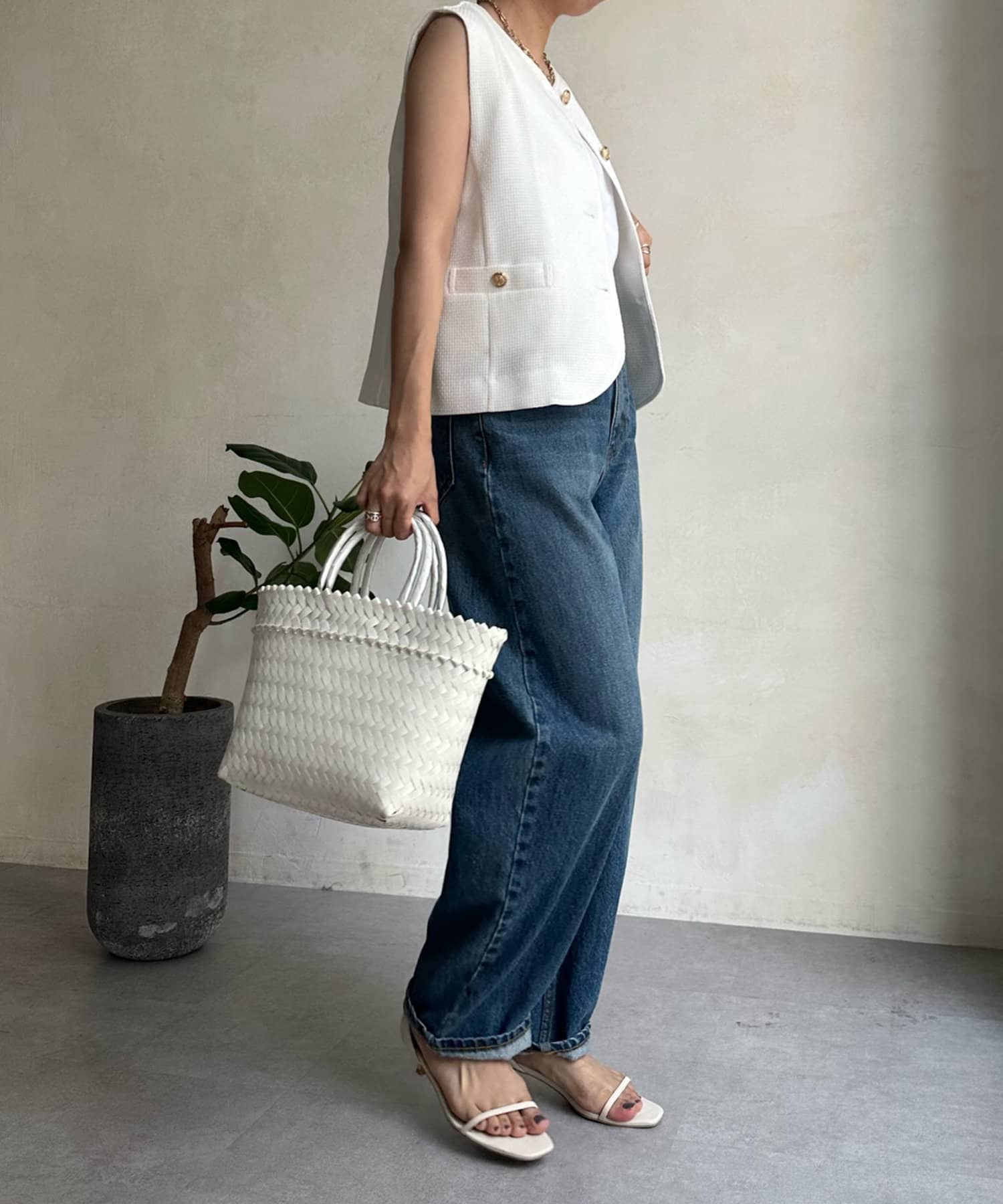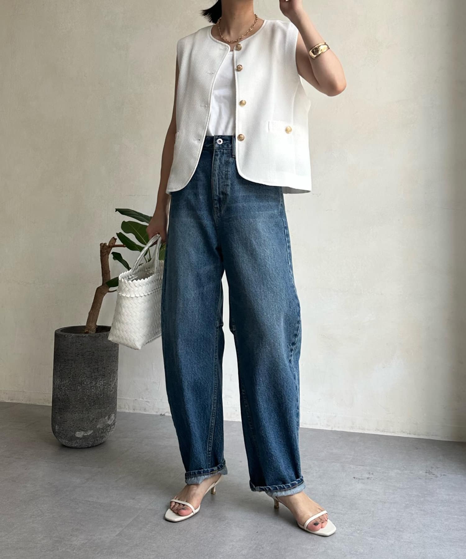 トレンドのツイード素材を使ったショート丈ベスト。