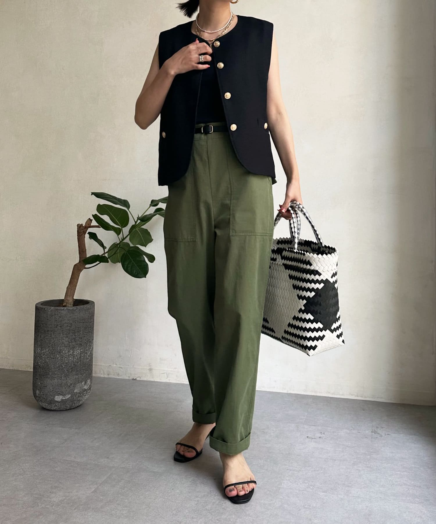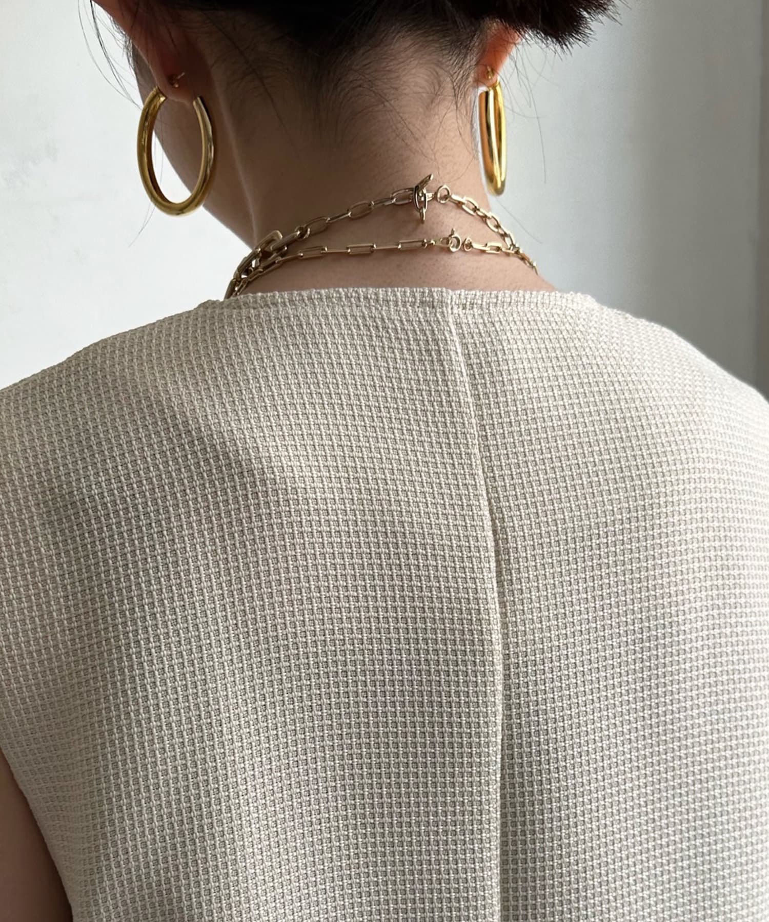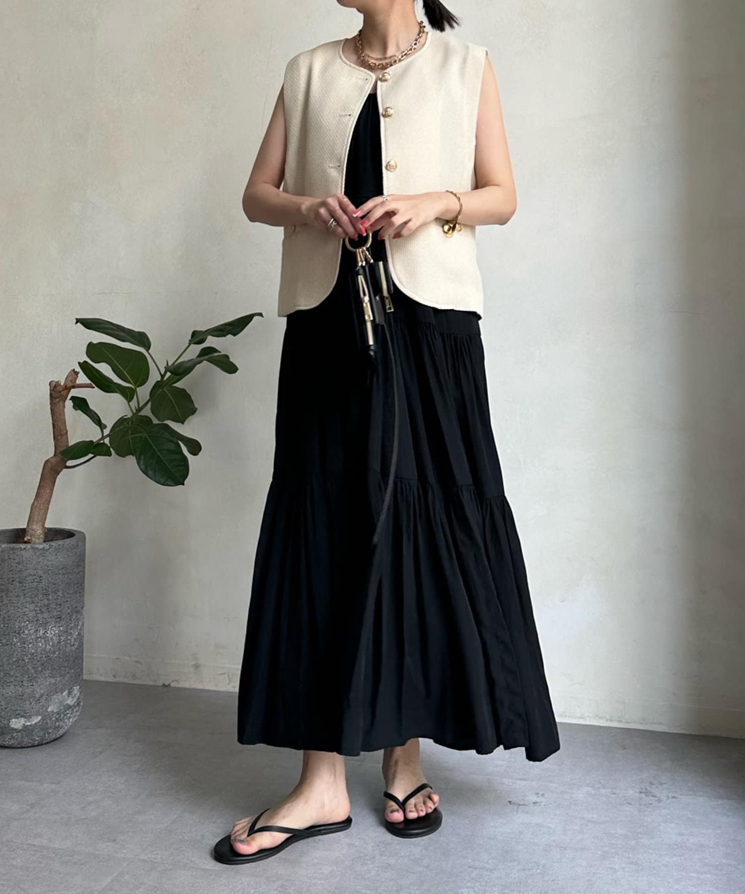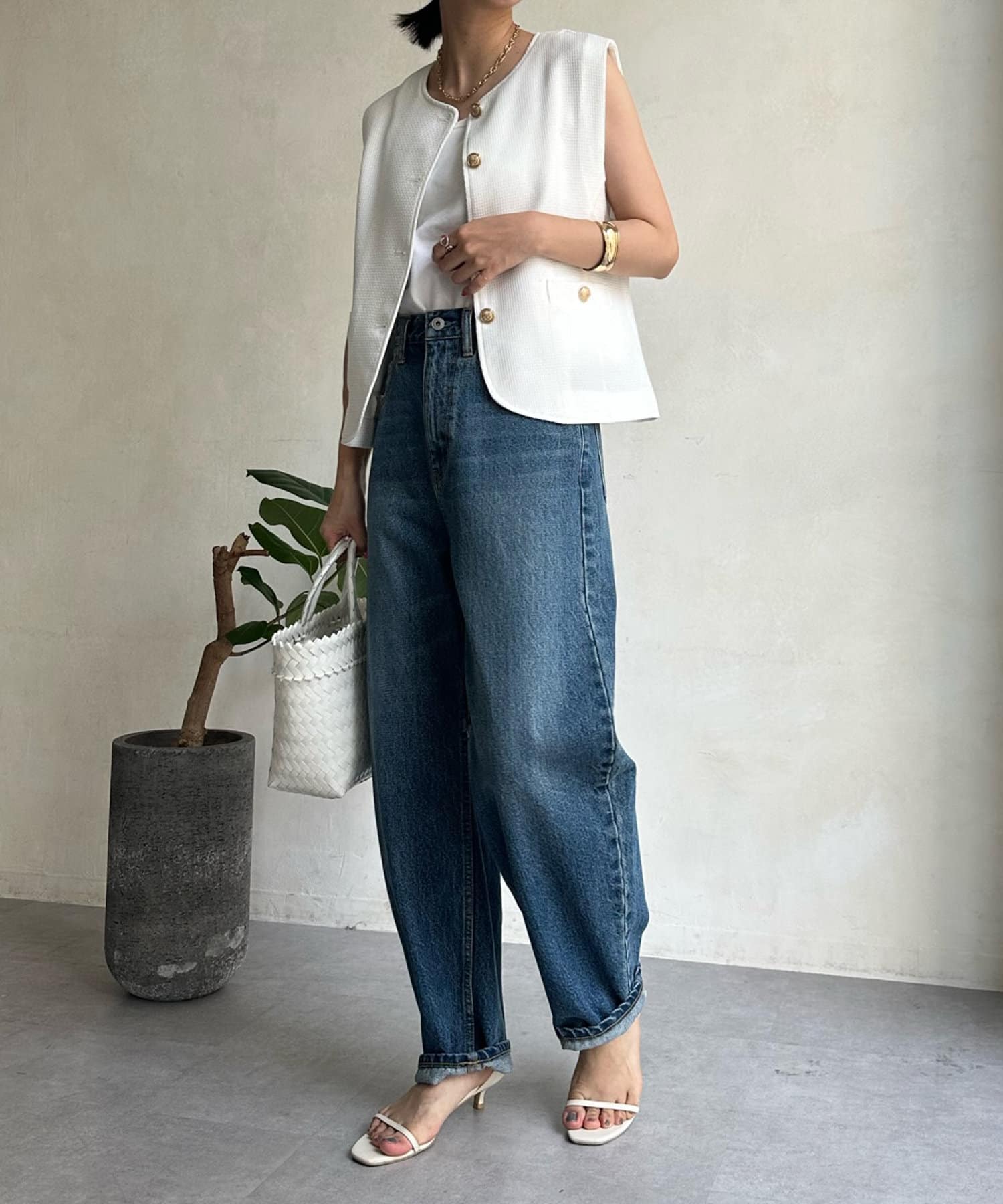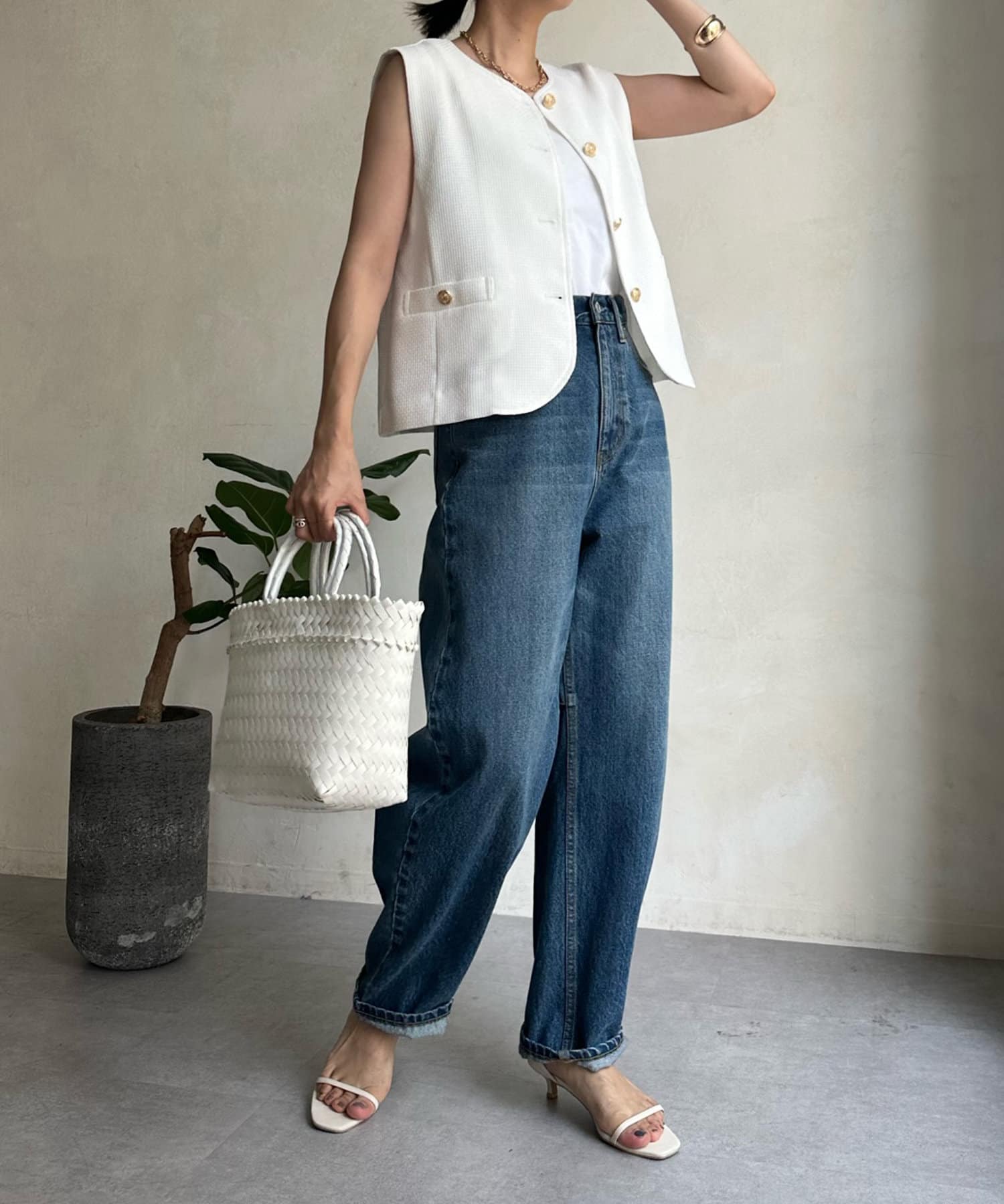 トレンドのツイード素材を使ったショート丈ベスト。