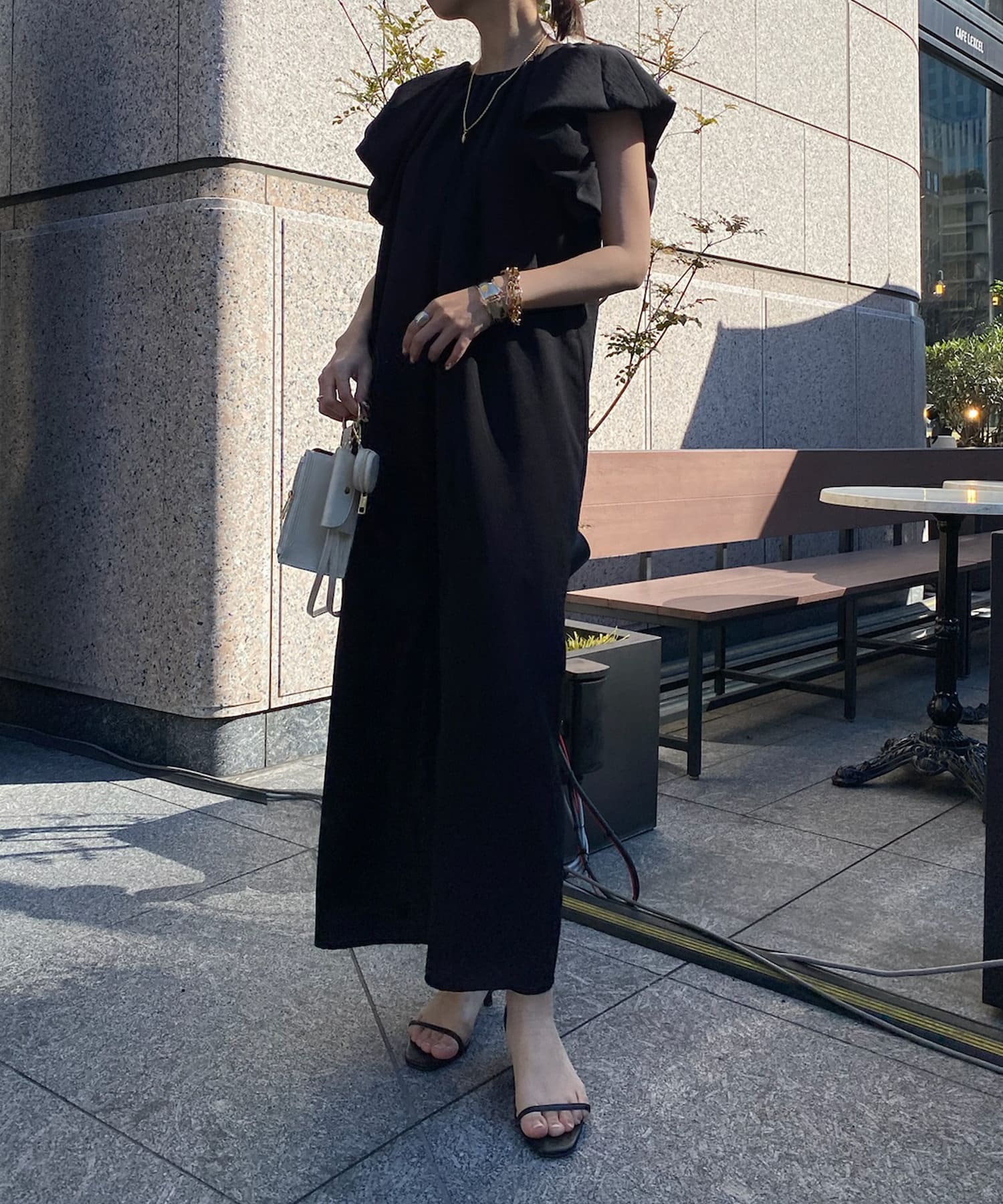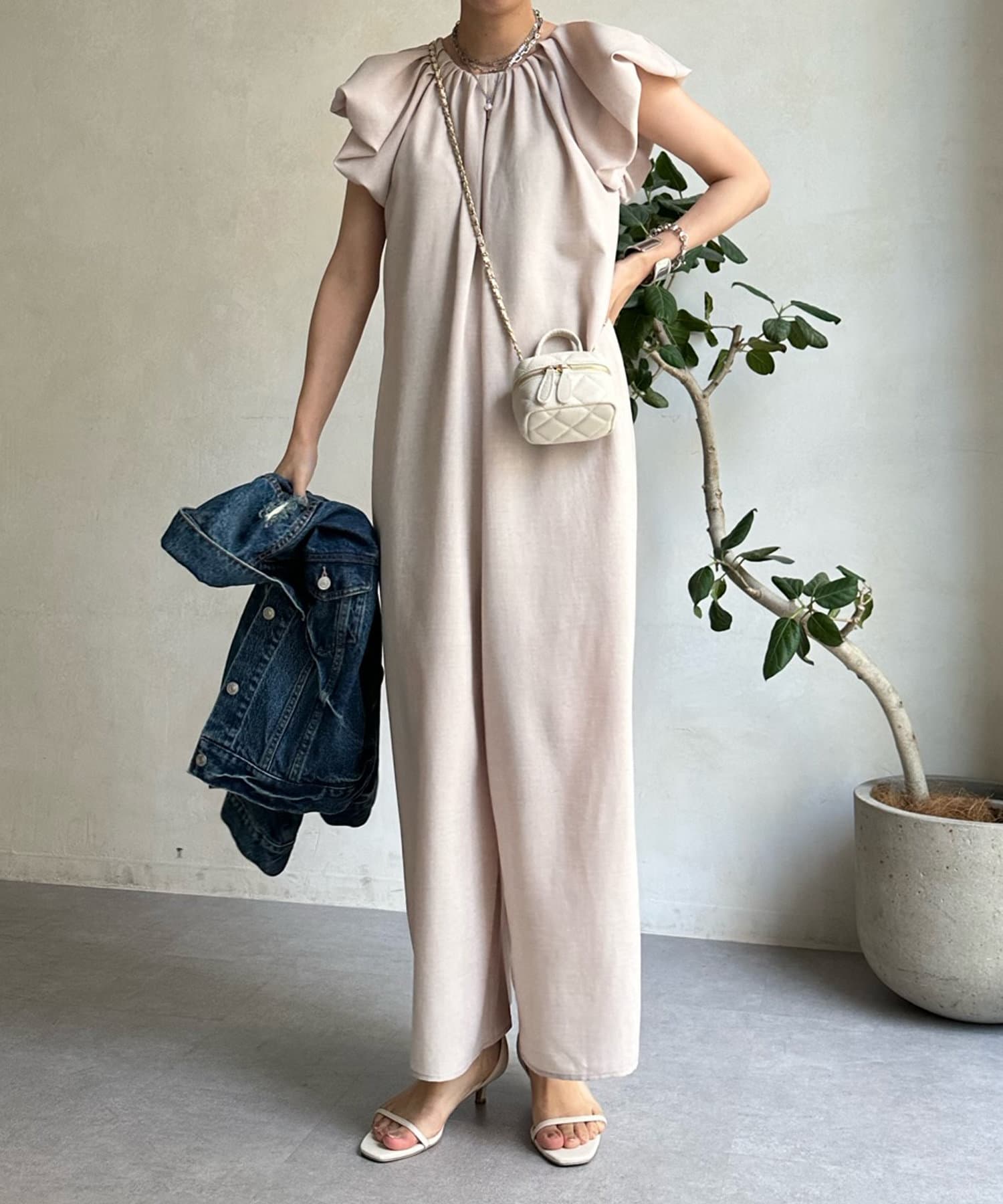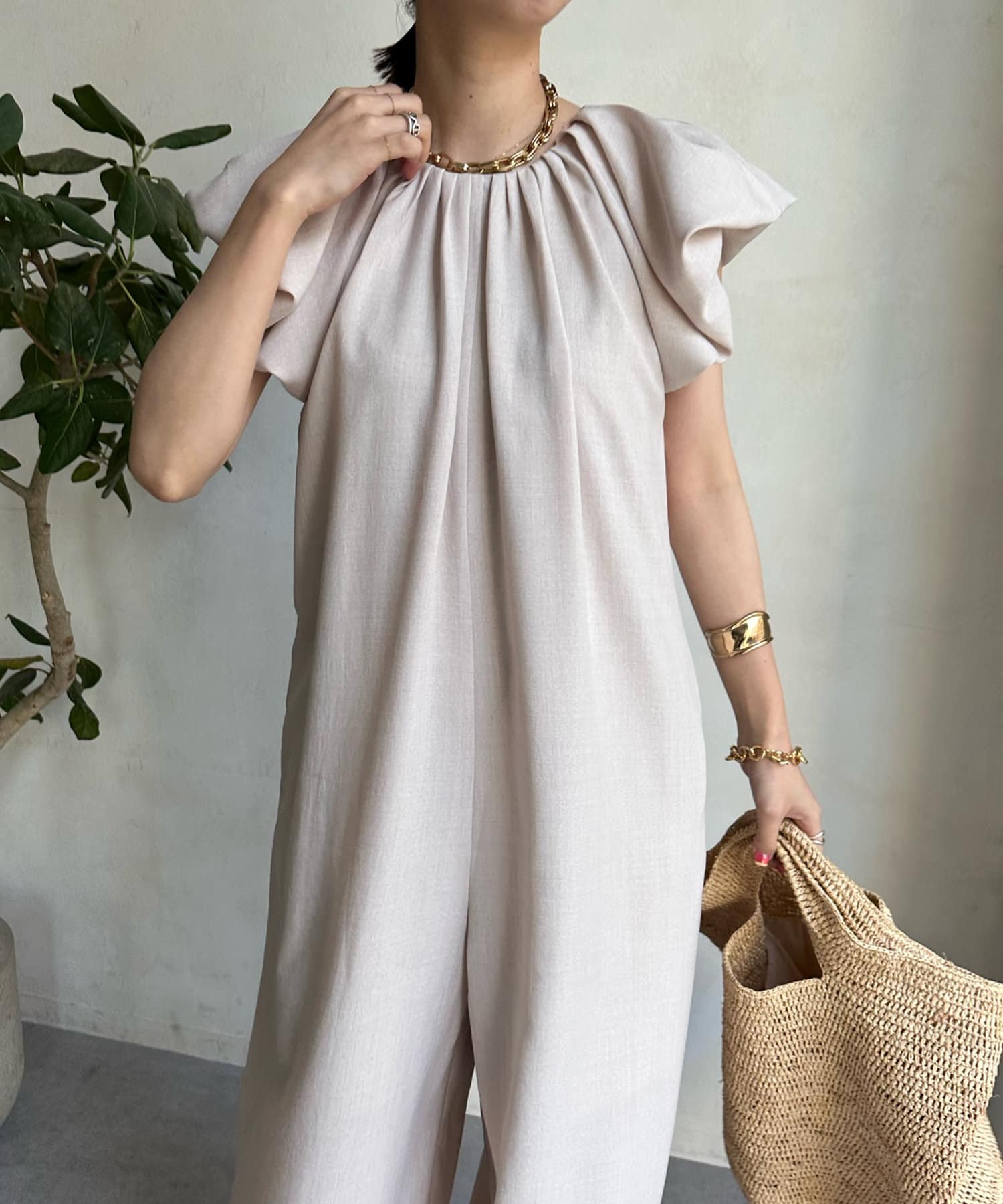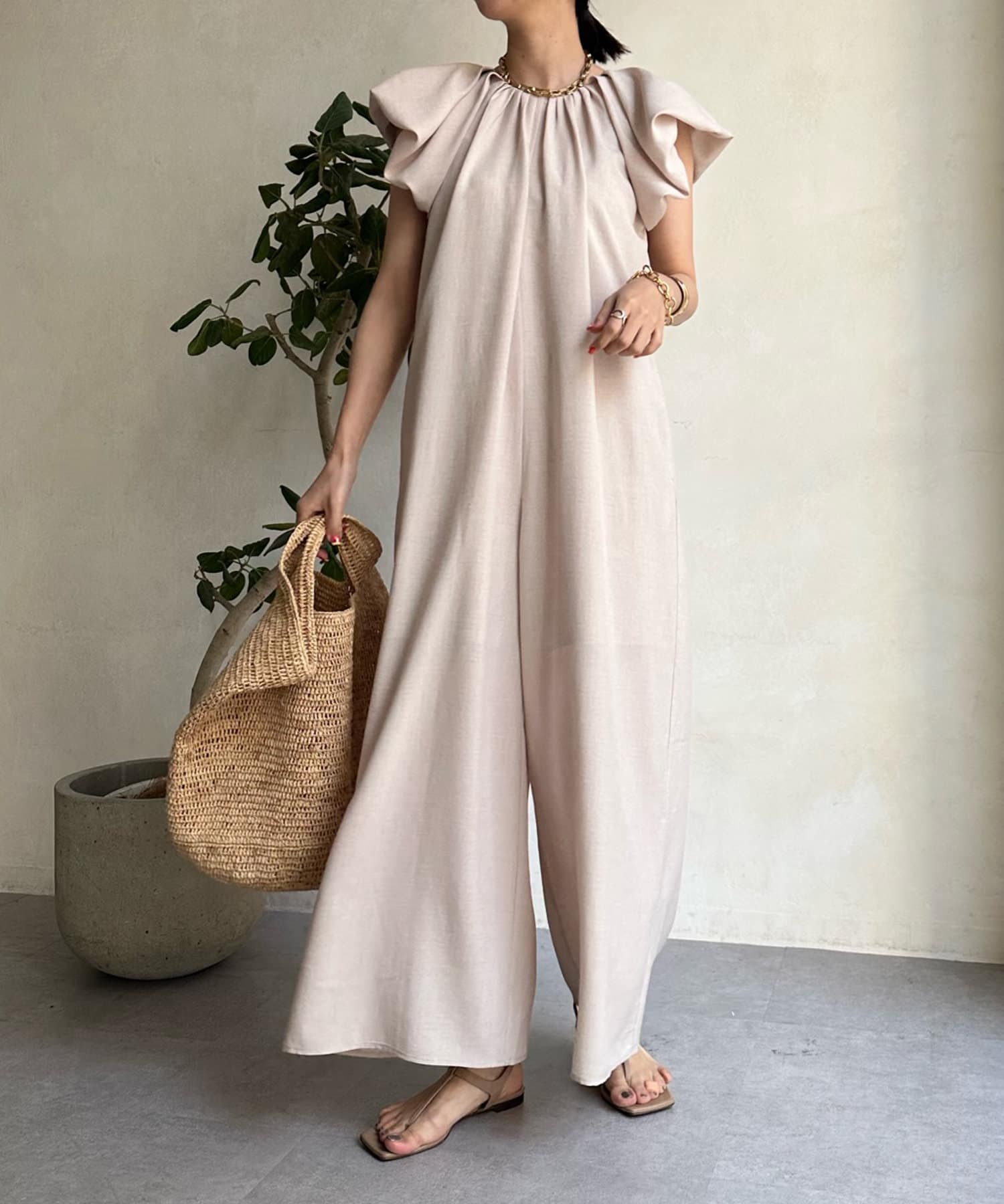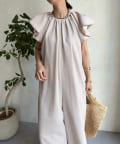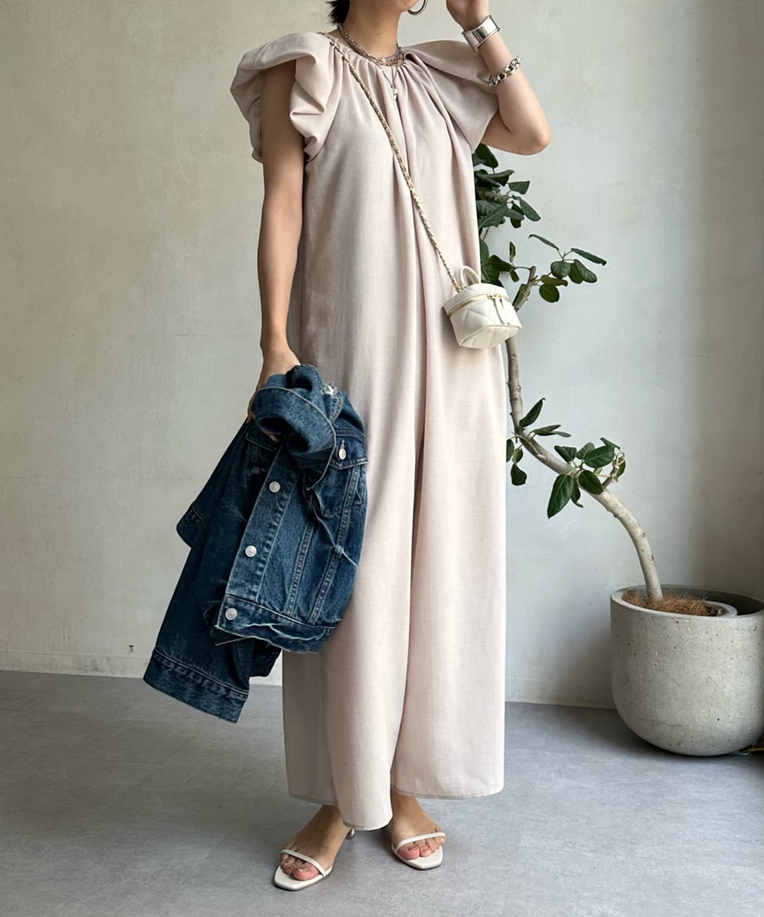 パンツ部分をたっぷりと分量を持たせたワイドシルエットにしており、メリハリのあるバランスが叶う1着です。