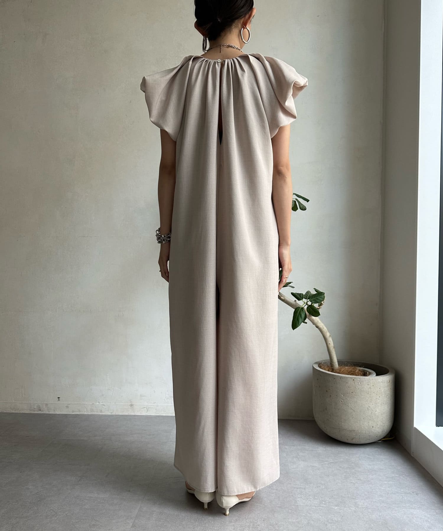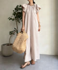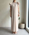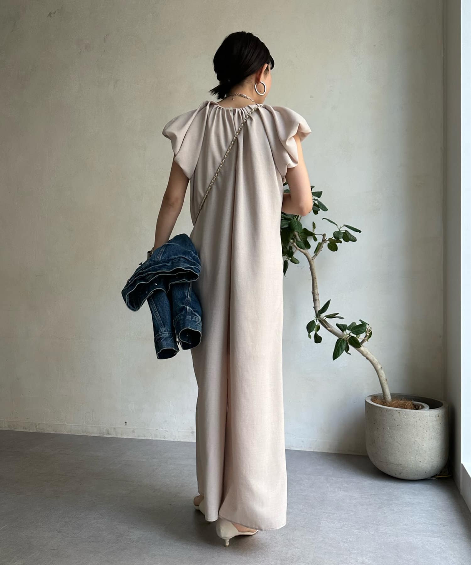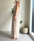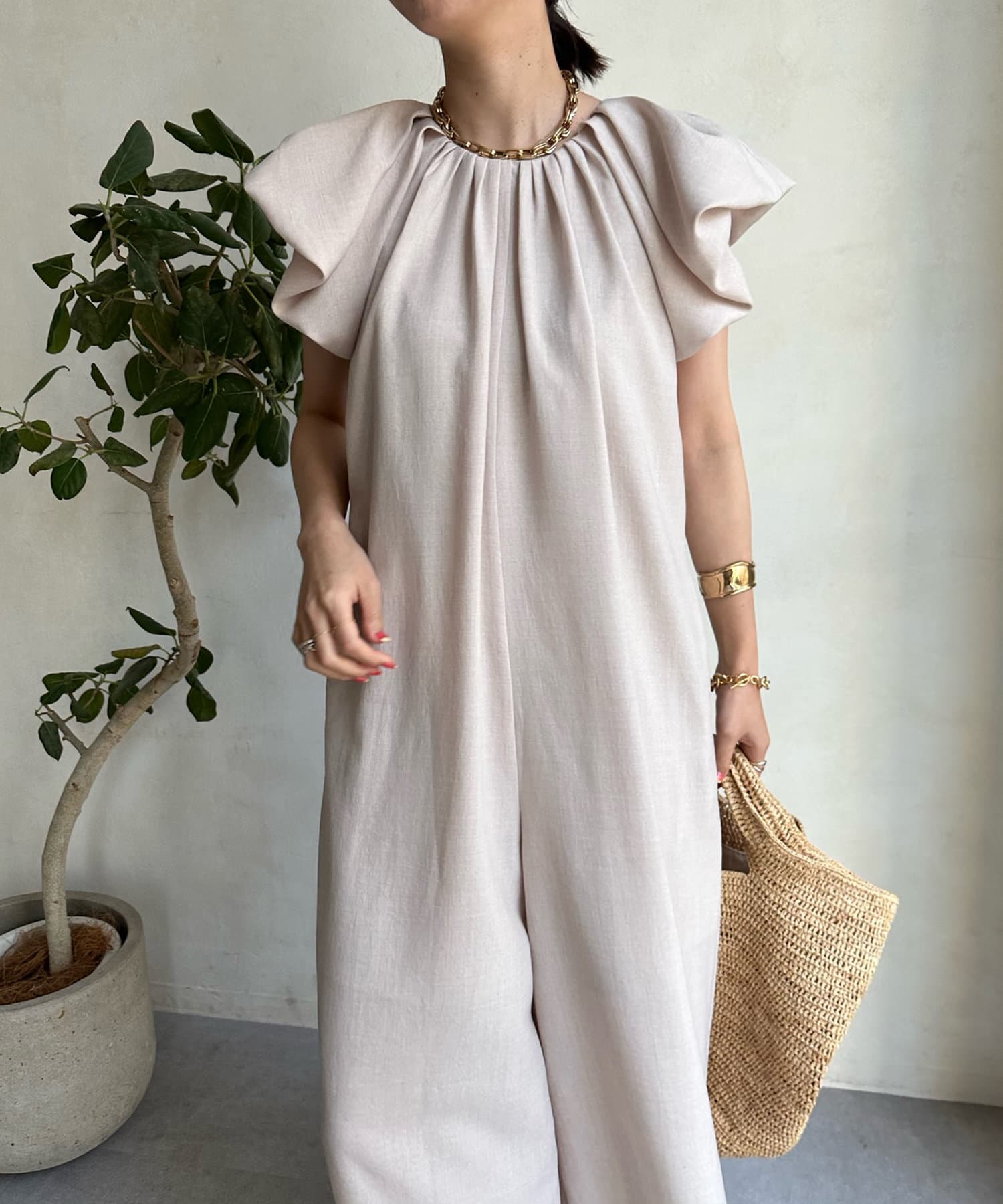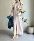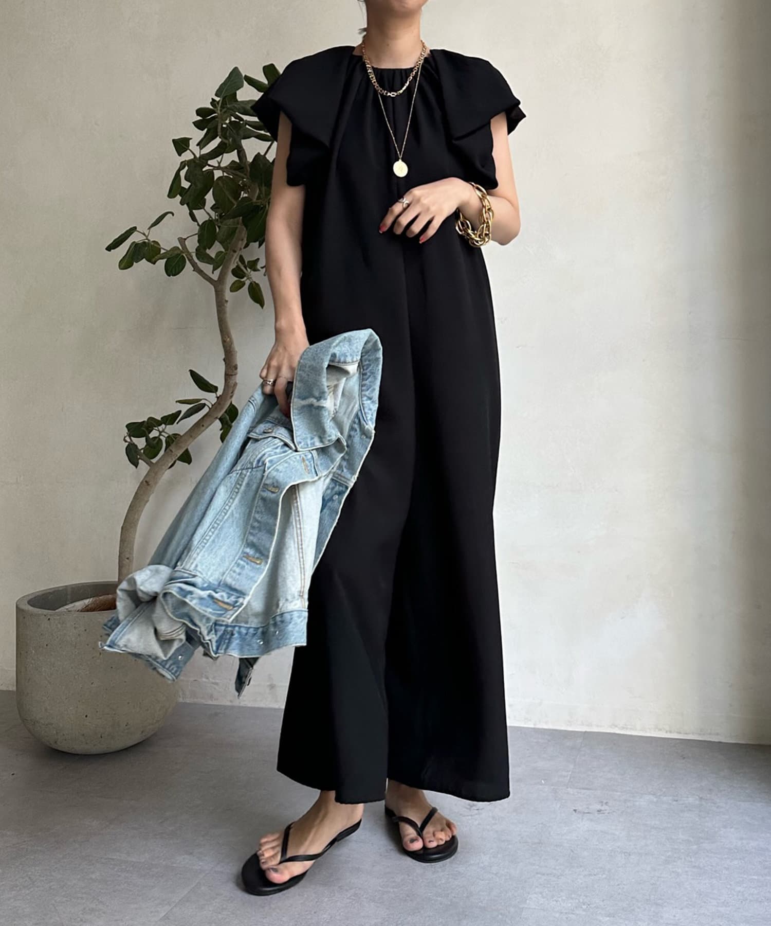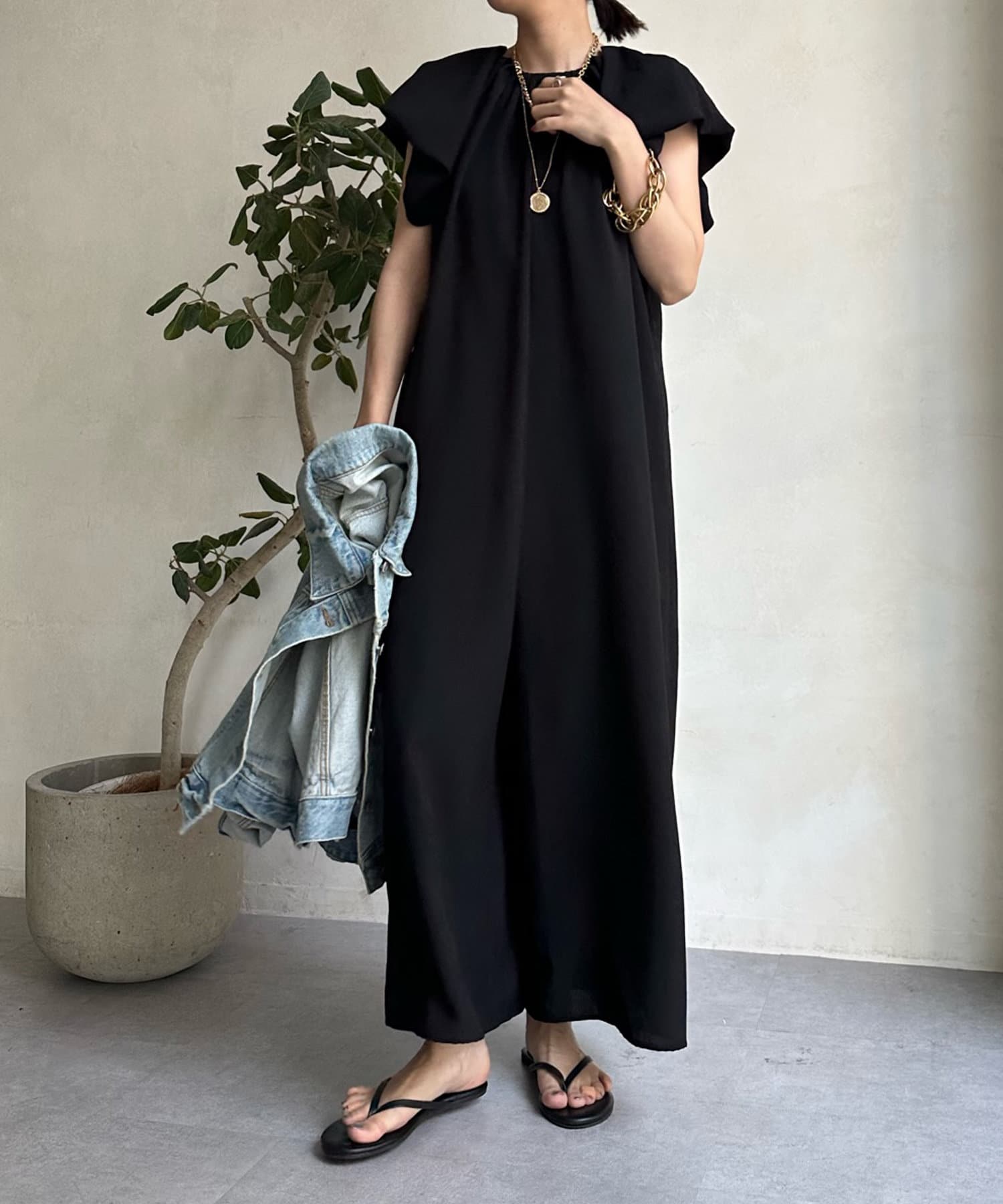 パンツ部分をたっぷりと分量を持たせたワイドシルエットにしており、メリハリのあるバランスが叶う1着です。