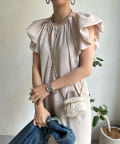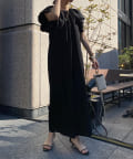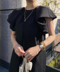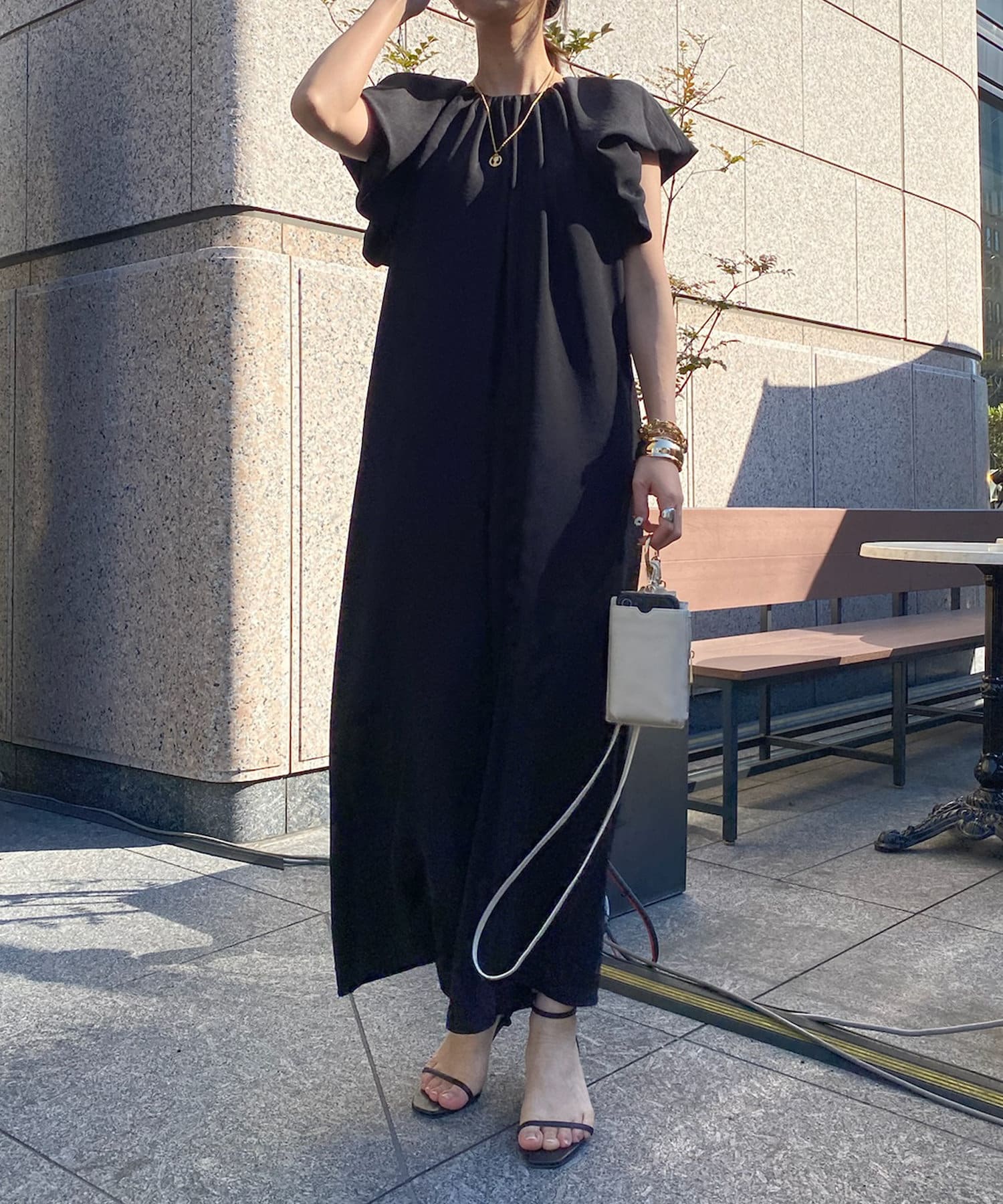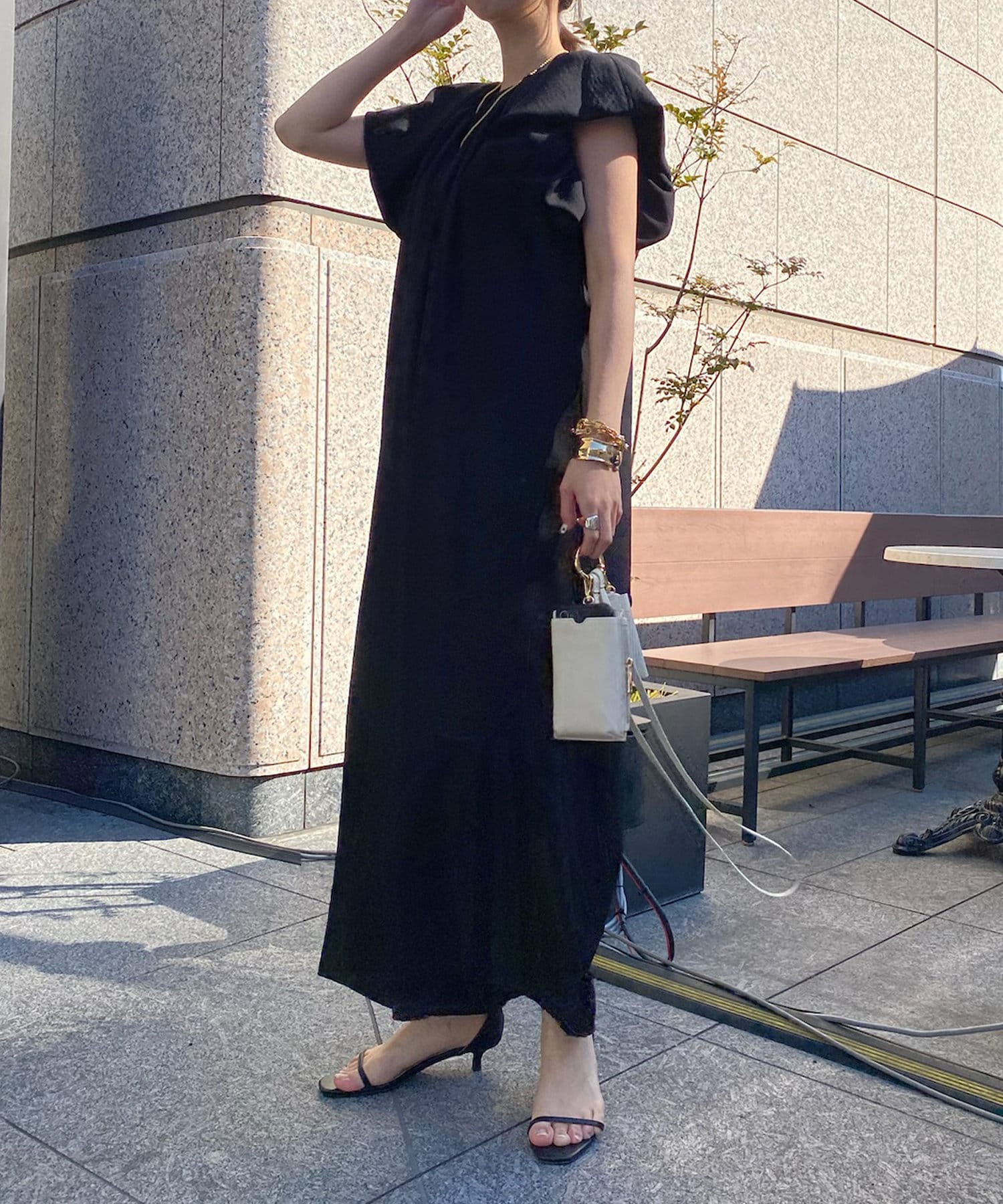 モードな印象になりがちなオールインワンに、ふわっとしたバルーンスリーブをプラスすることでフェミニンなニュアンスをトッピング。