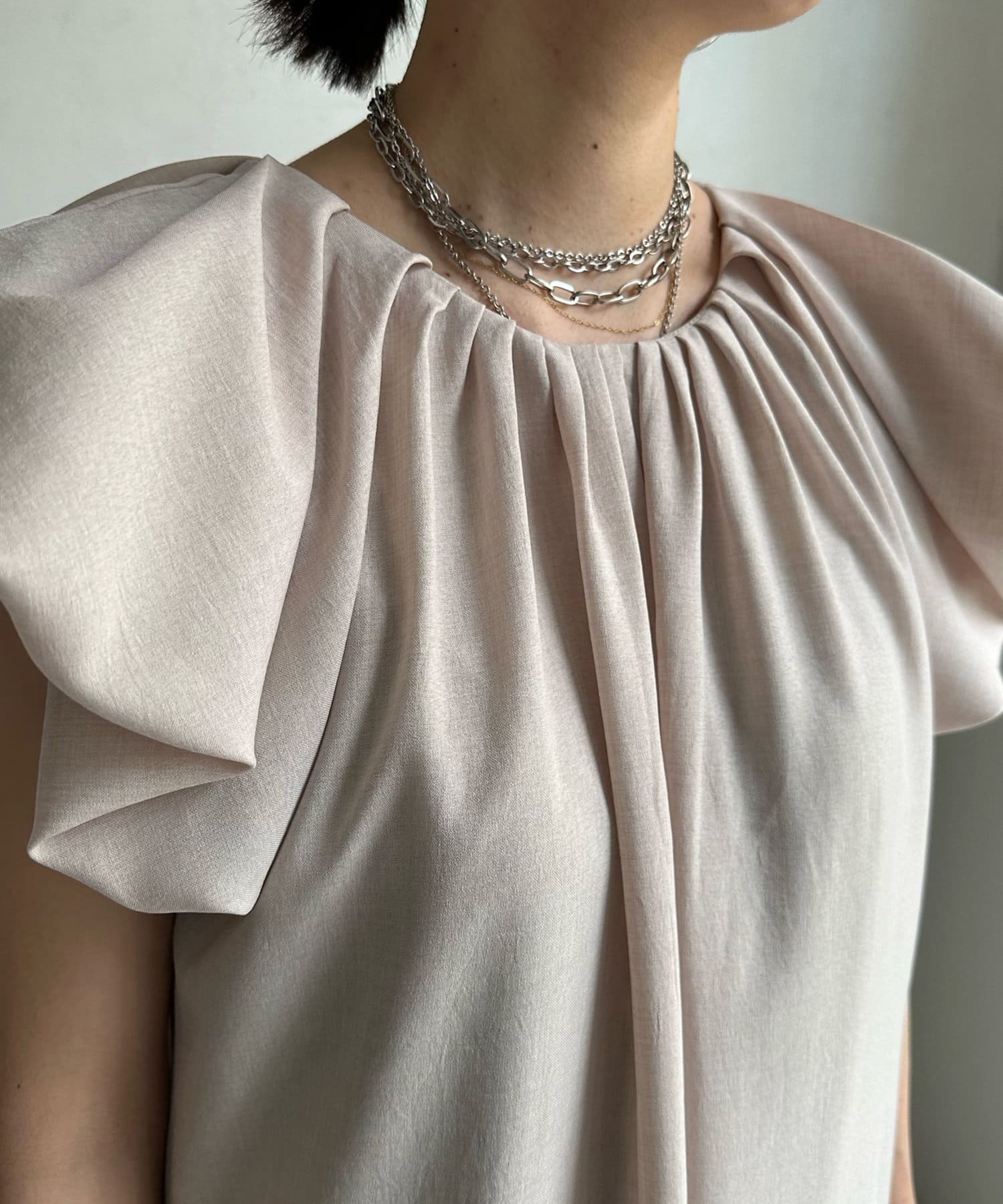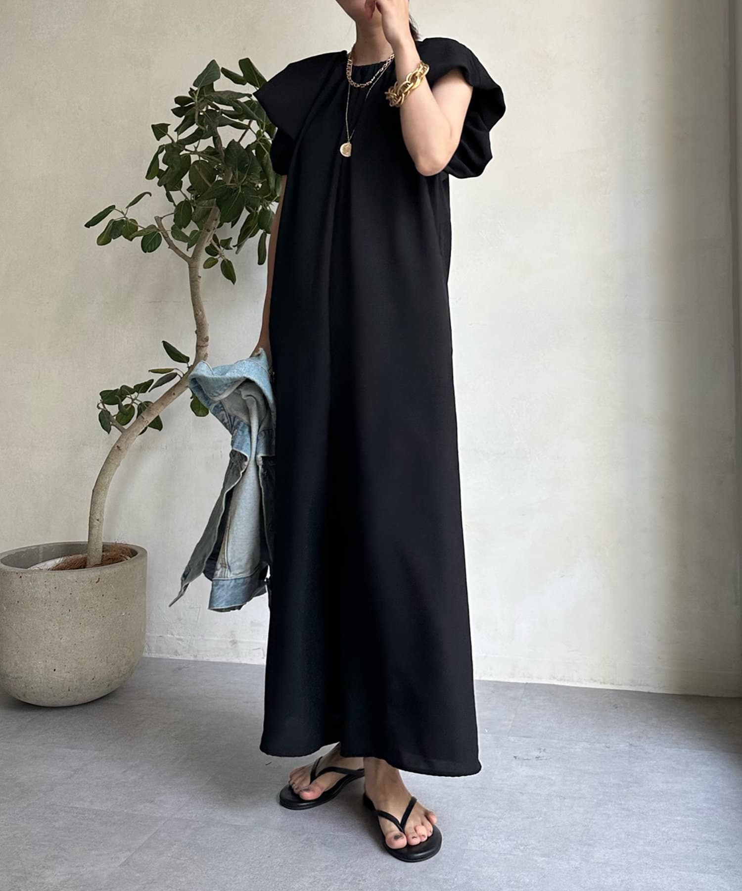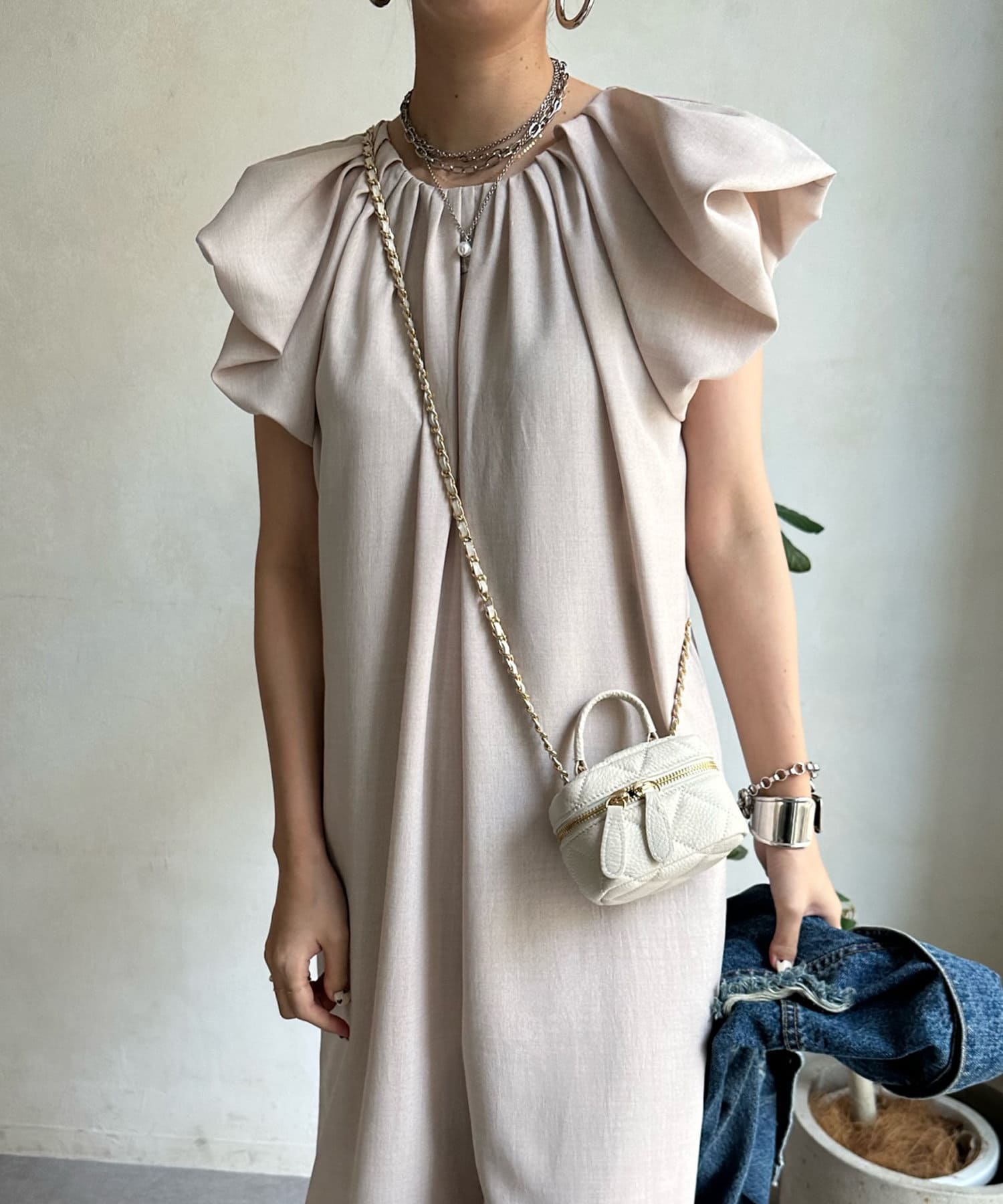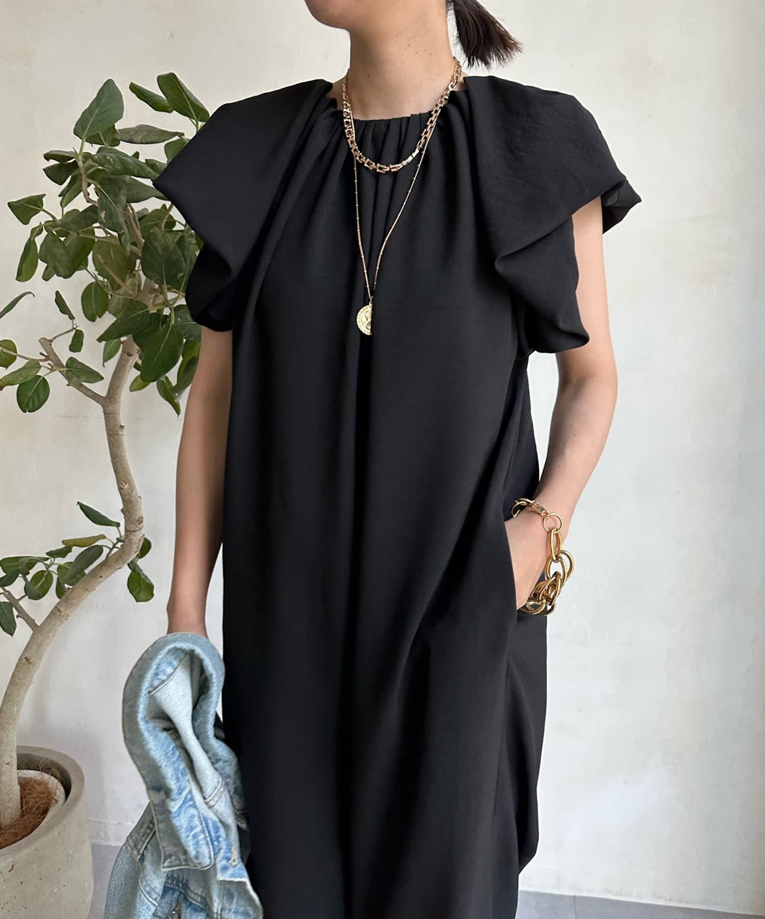 バストまでは華奢に見せつつ、ボディラインには適度にゆとりを持たせ、タックを活かしたIラインシルエットが魅力のポイント!