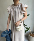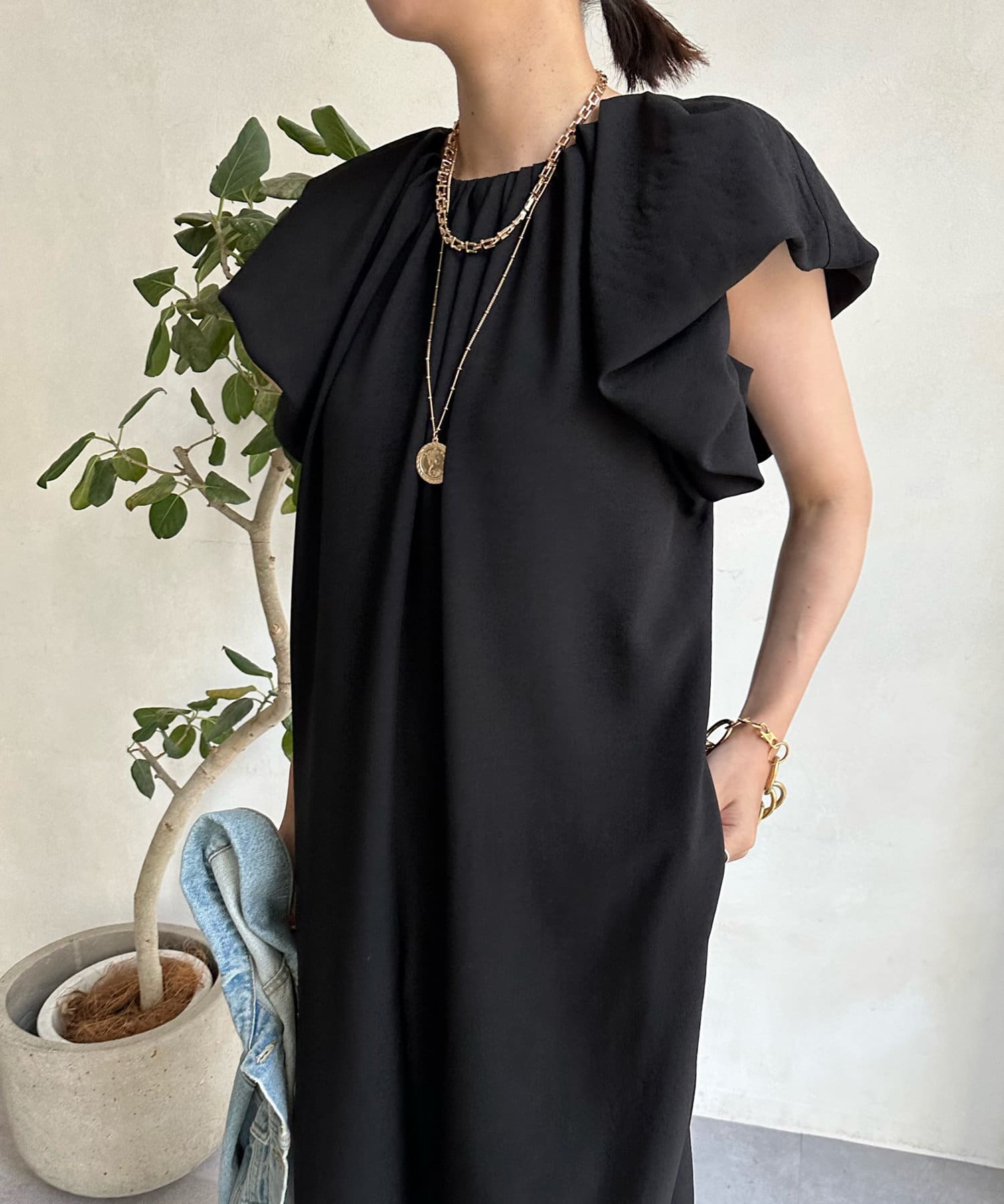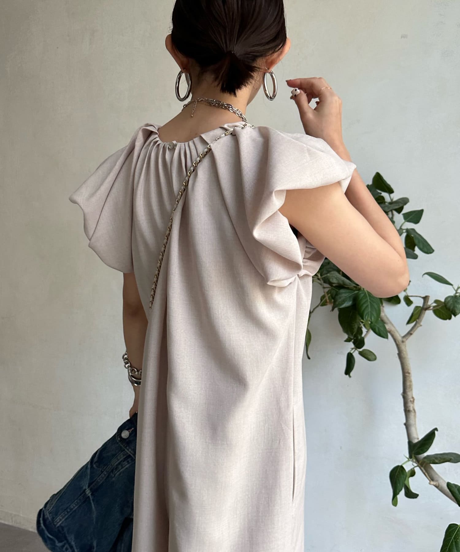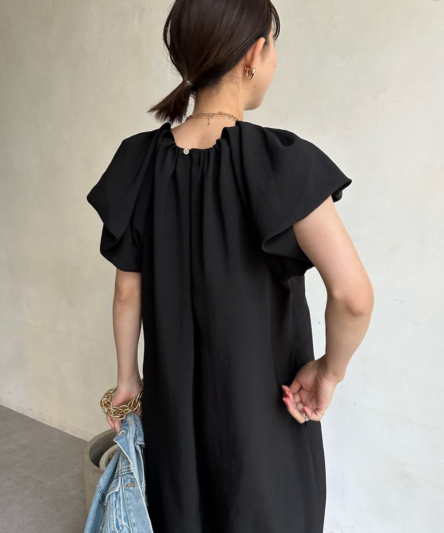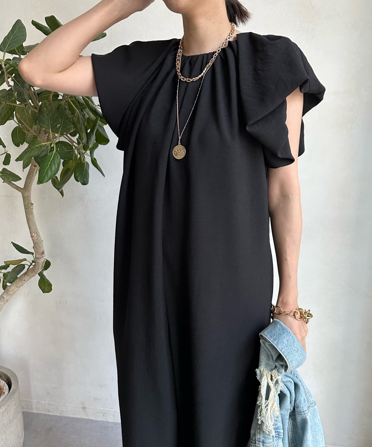 バストまでは華奢に見せつつ、ボディラインには適度にゆとりを持たせ、タックを活かしたIラインシルエットが魅力のポイント!