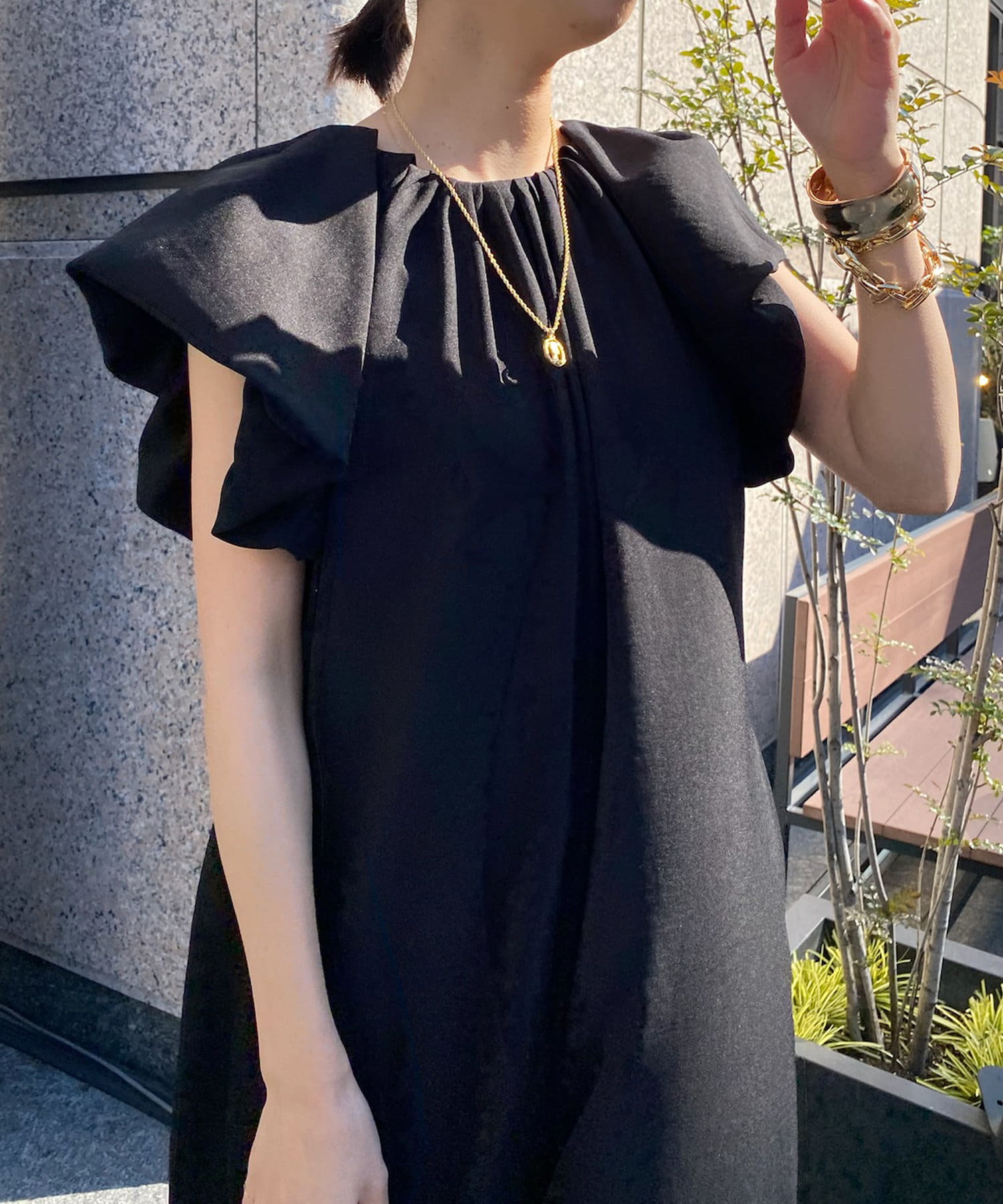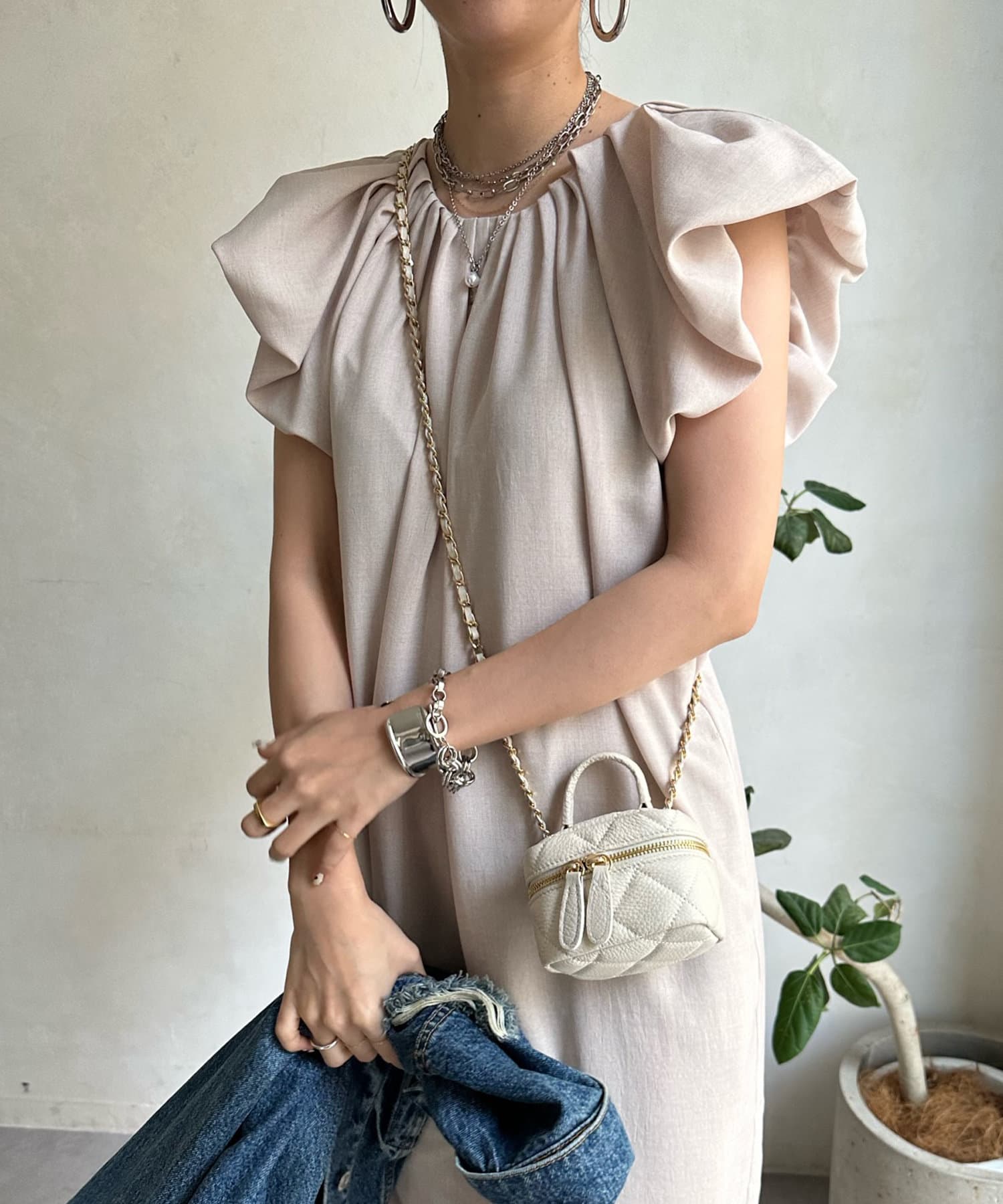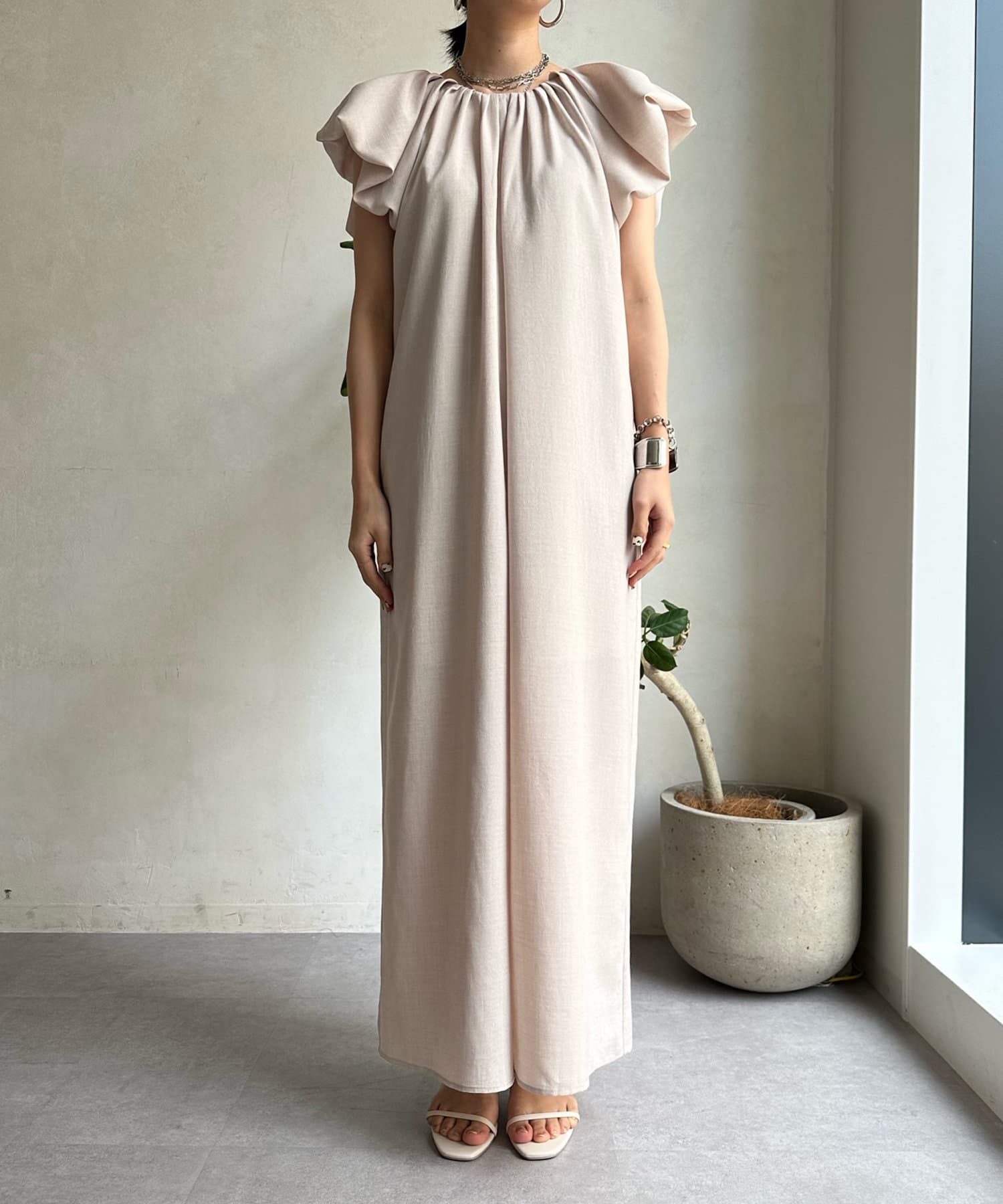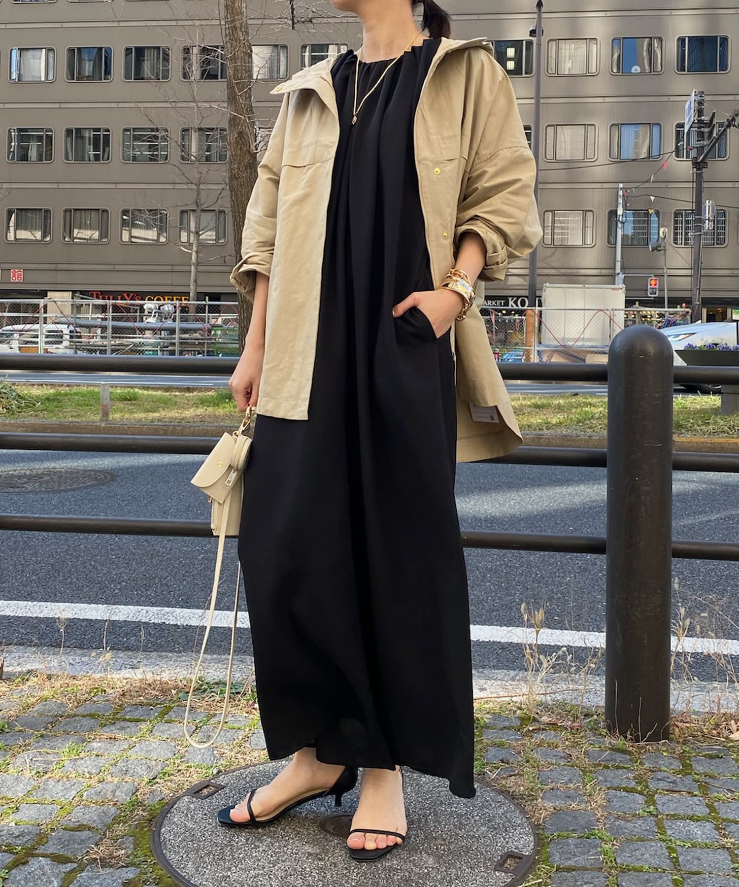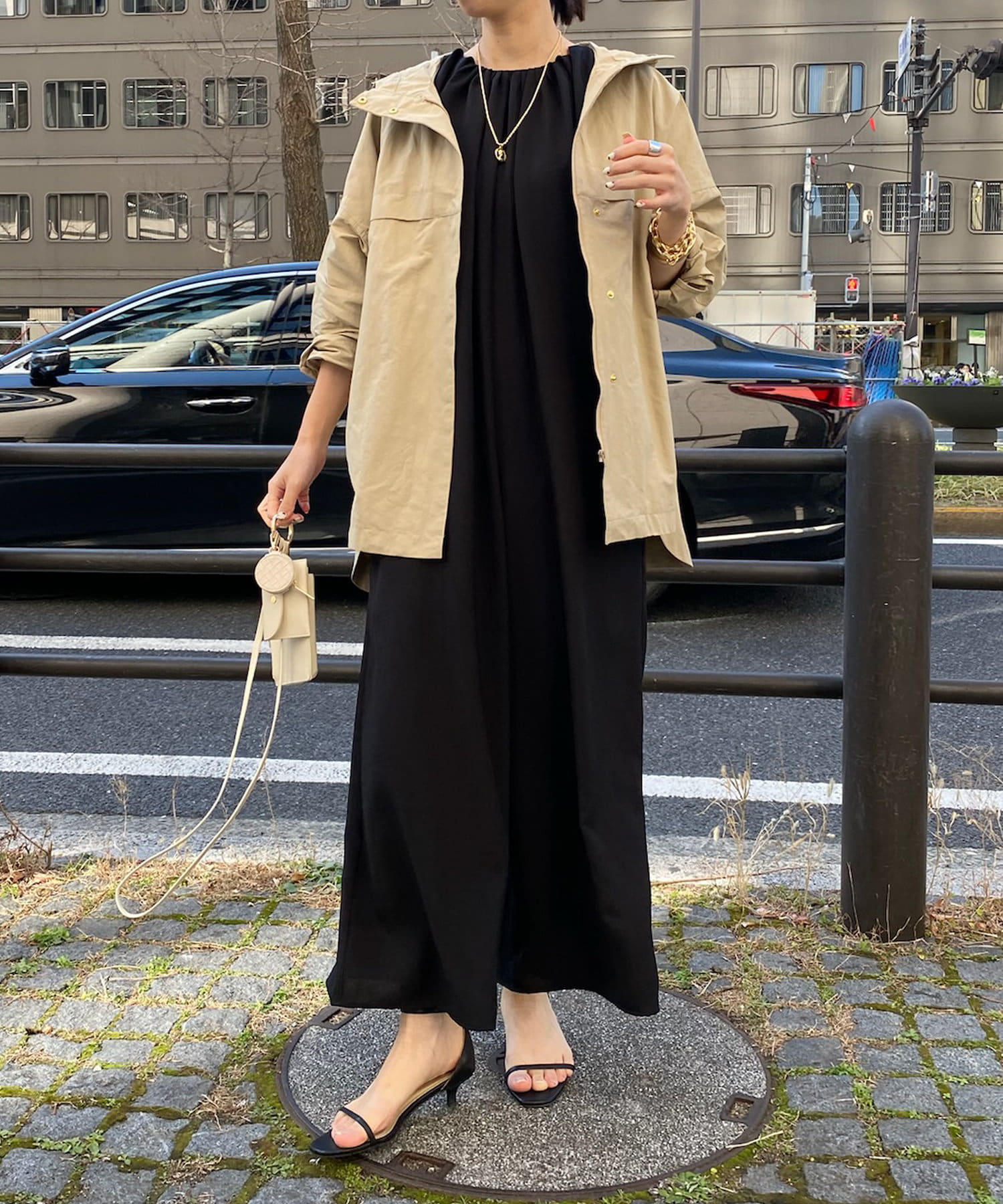 バストまでは華奢に見せつつ、ボディラインには適度にゆとりを持たせ、タックを活かしたIラインシルエットが魅力のポイント!